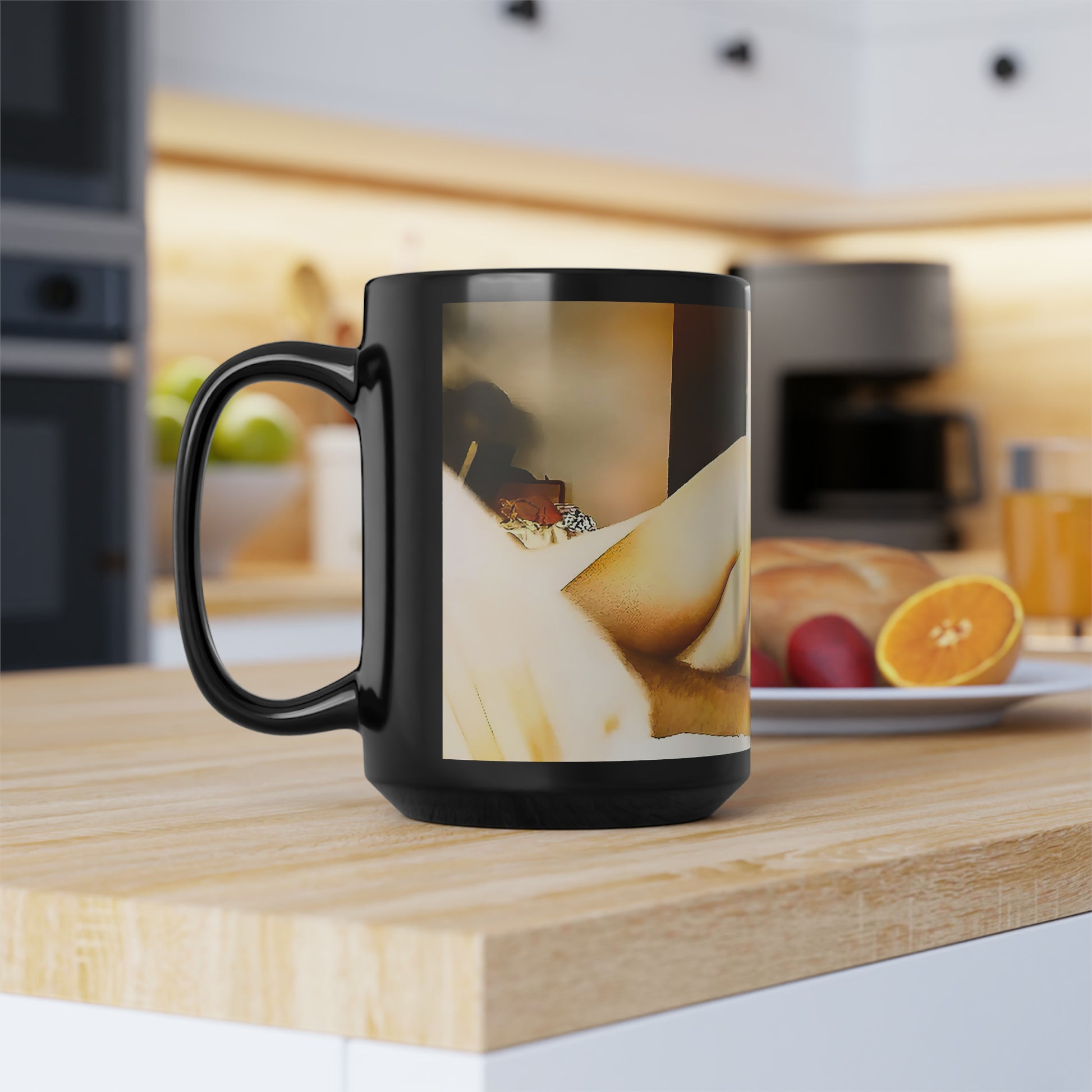 These black mugs come in one size – 15oz (0.44l) – plenty for morning caffeine boosts and hot cups of tea on a rainy day. They're easy to grip and feel sturdy thanks to the C-shaped handle. They are printed on black ceramic material in picture-perfect quality with a glossy finish.