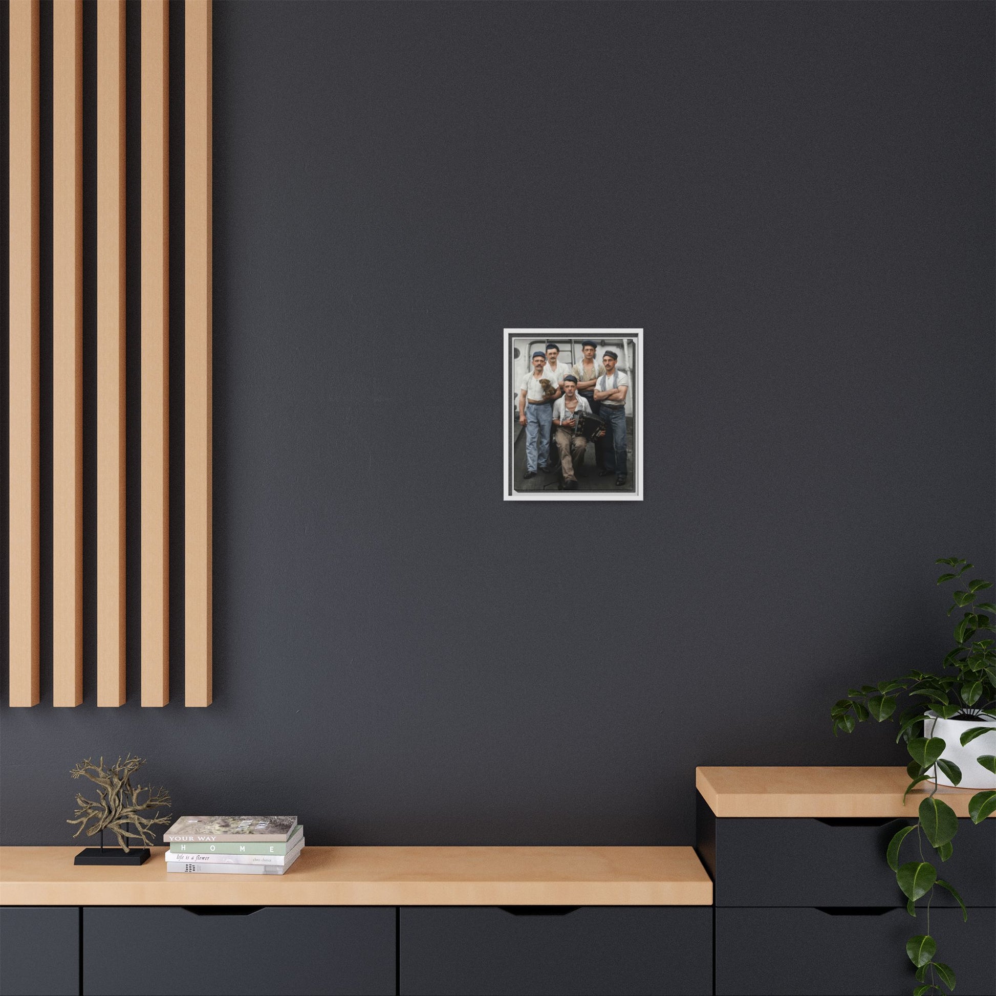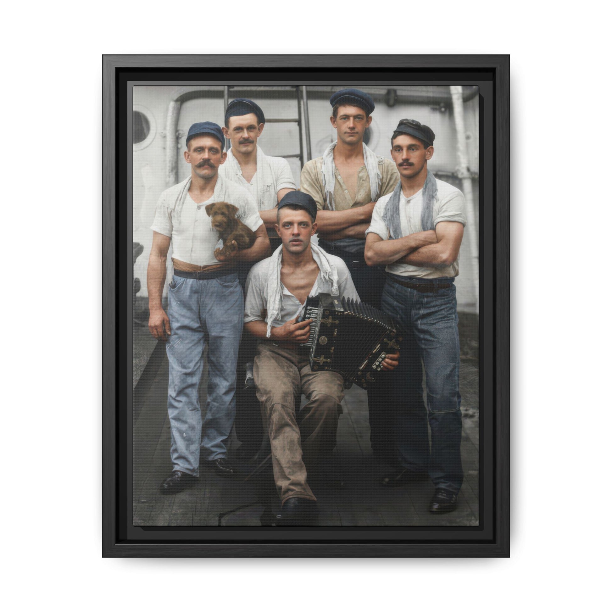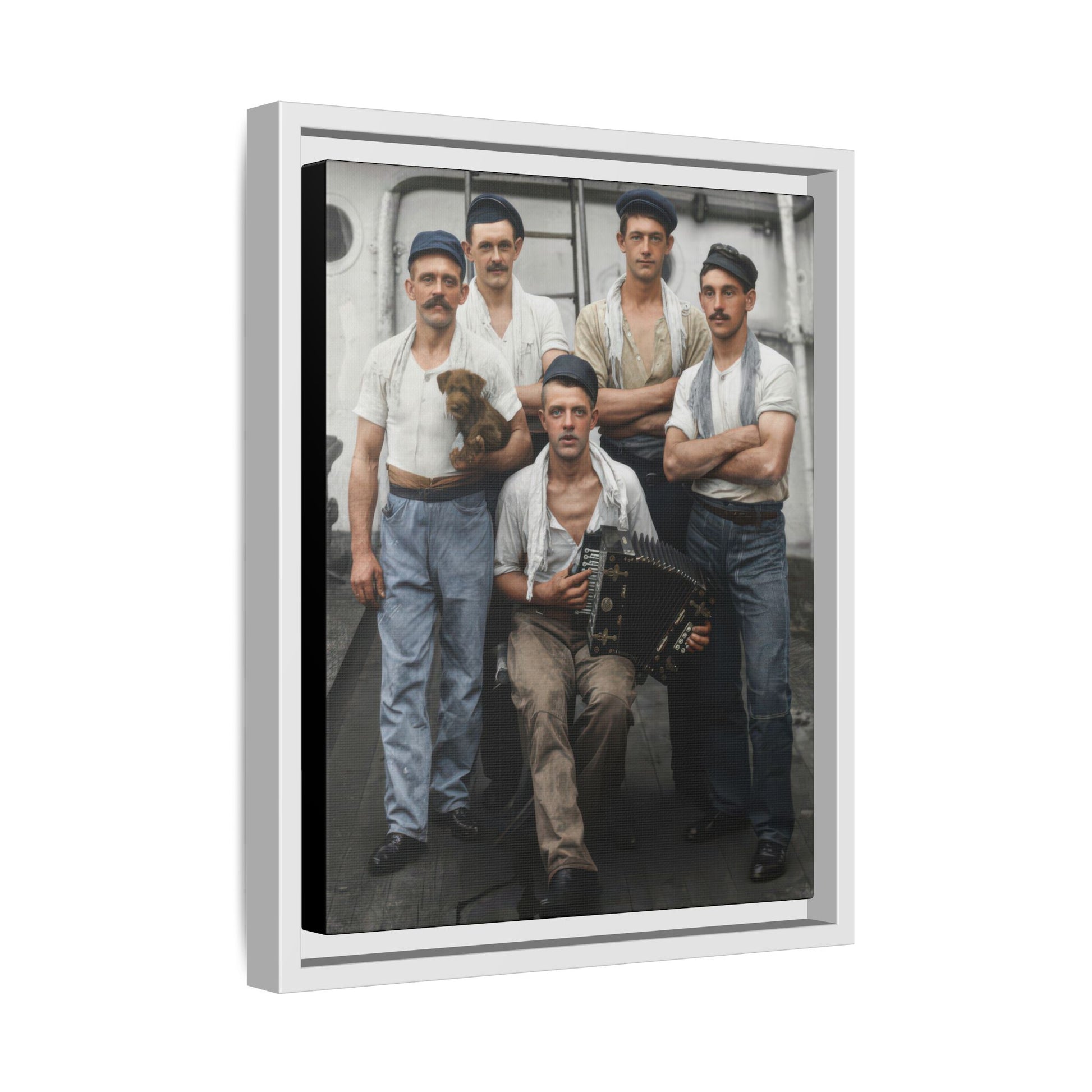 The neutral grayscale tonal range, moderate contrast, and likely fiber-based paper suggest a gelatin silver process, which became dominant after 1900 due to its stability and ease of production. The informal yet composed group arrangement aligns with the democratization of photography in the early twentieth century, when personal cameras and small commercial studios enabled vernacular maritime portraiture. The absence of studio markings or mounts limits precise attribution. Provenance is unknown.