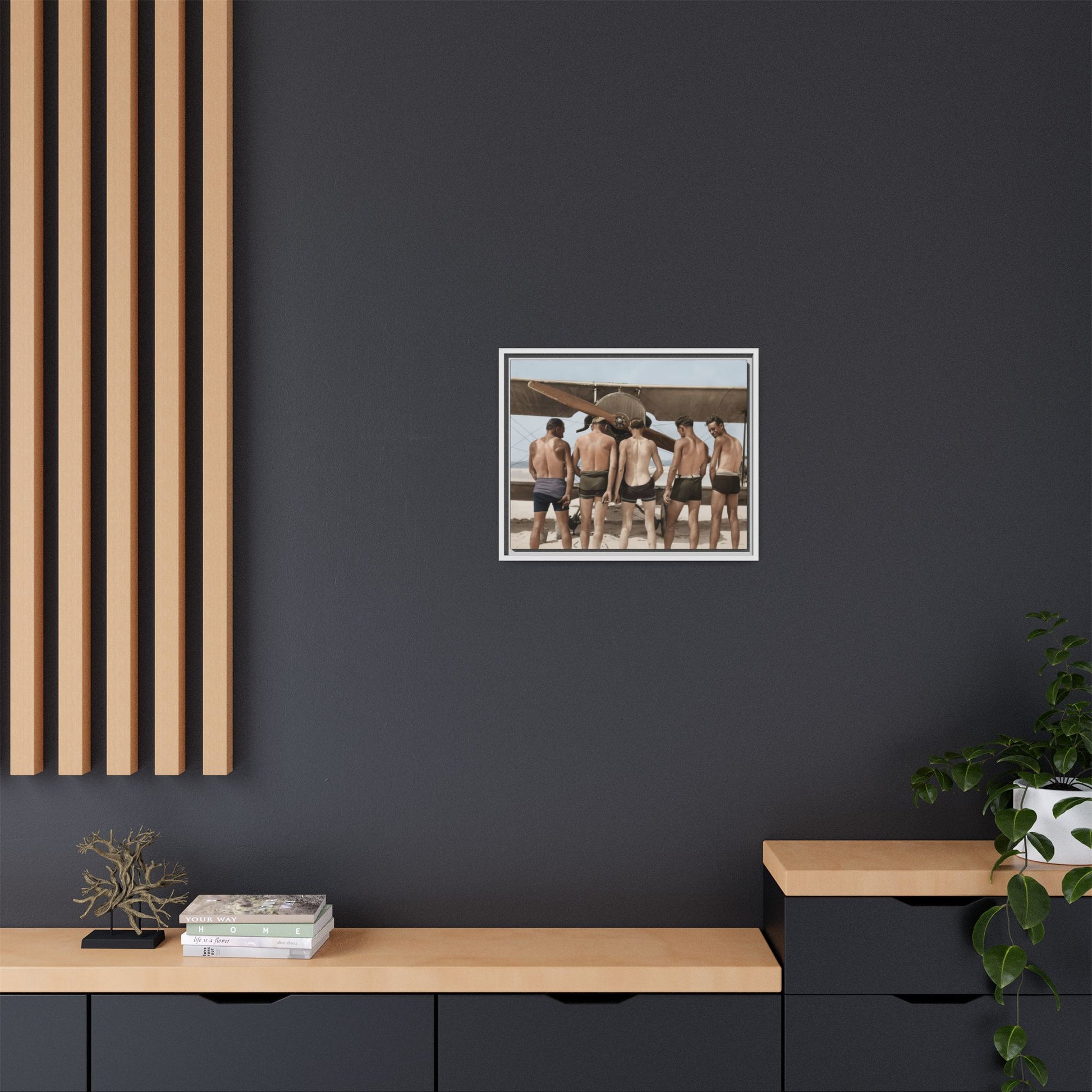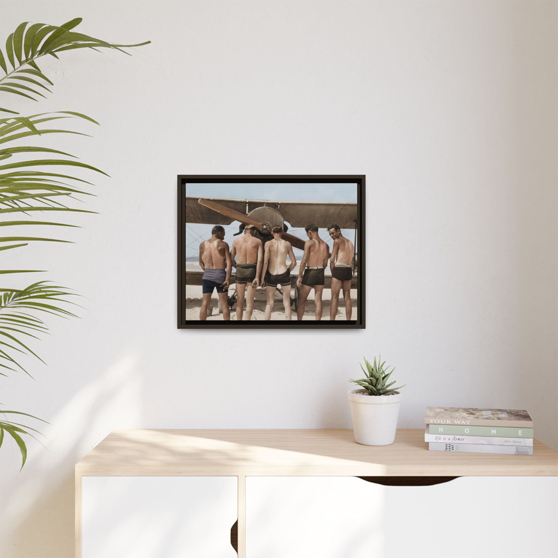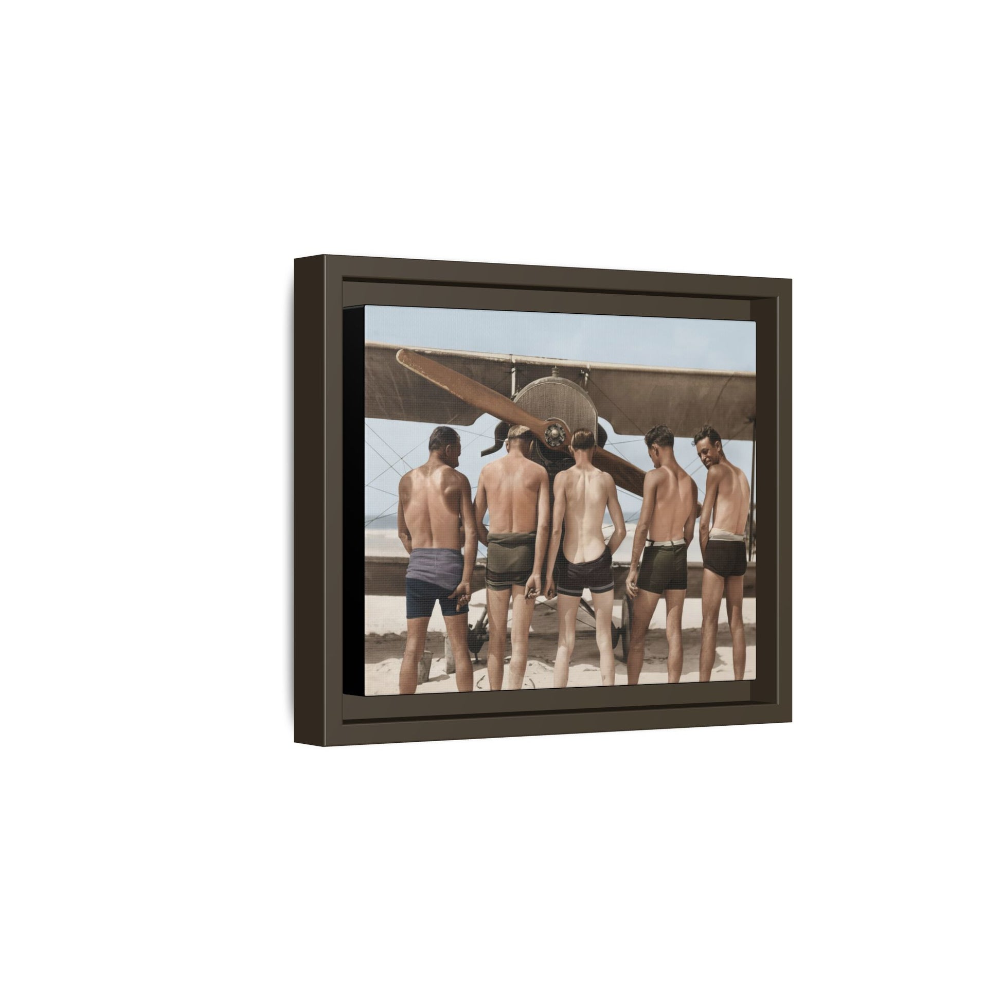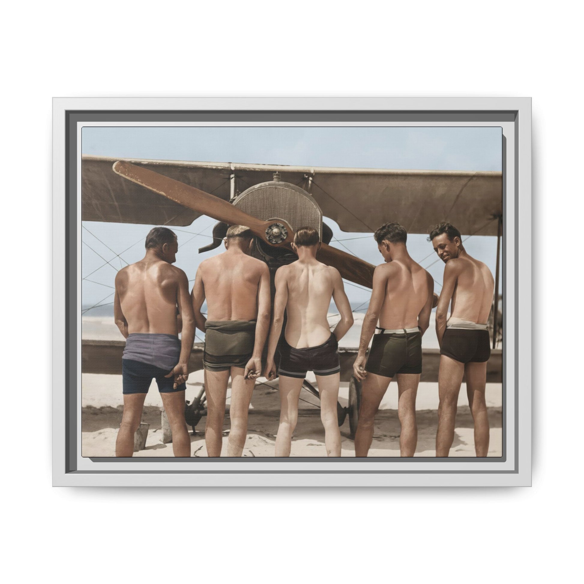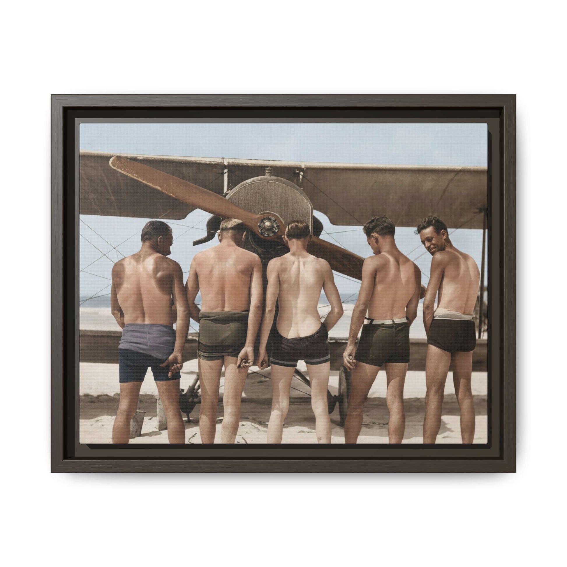 The aircraft visible behind the figures is a fabric-covered biplane with a two-blade propeller and an open cockpit configuration characteristic of early aviation. Such aircraft were widely used during and immediately after the First World War. The men wear short trunks consistent with early twentieth-century athletic or bathing attire, and their haircuts align with 1910s–1920s styles. The photographic paper and bordered snapshot format further support a 1920s timeframe.