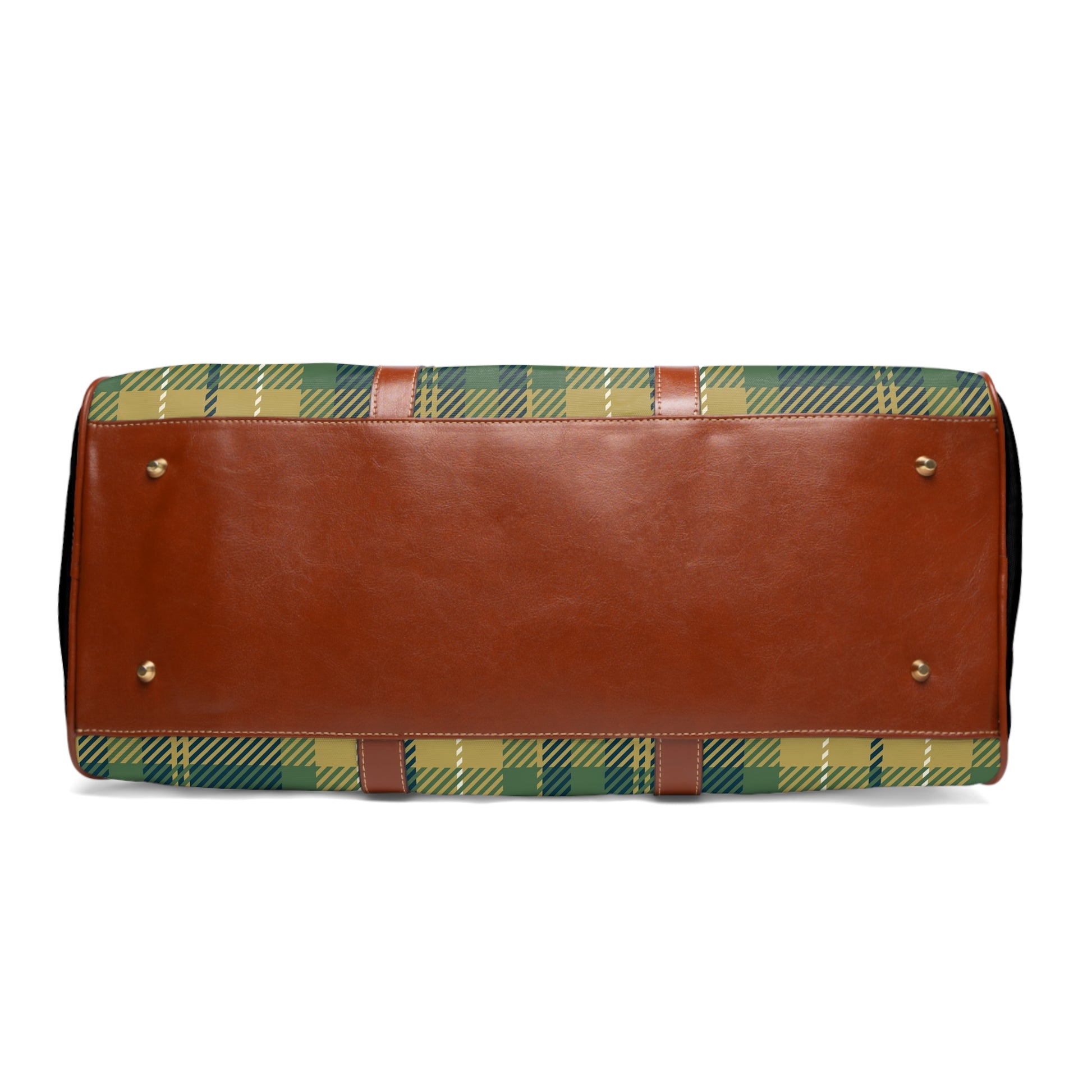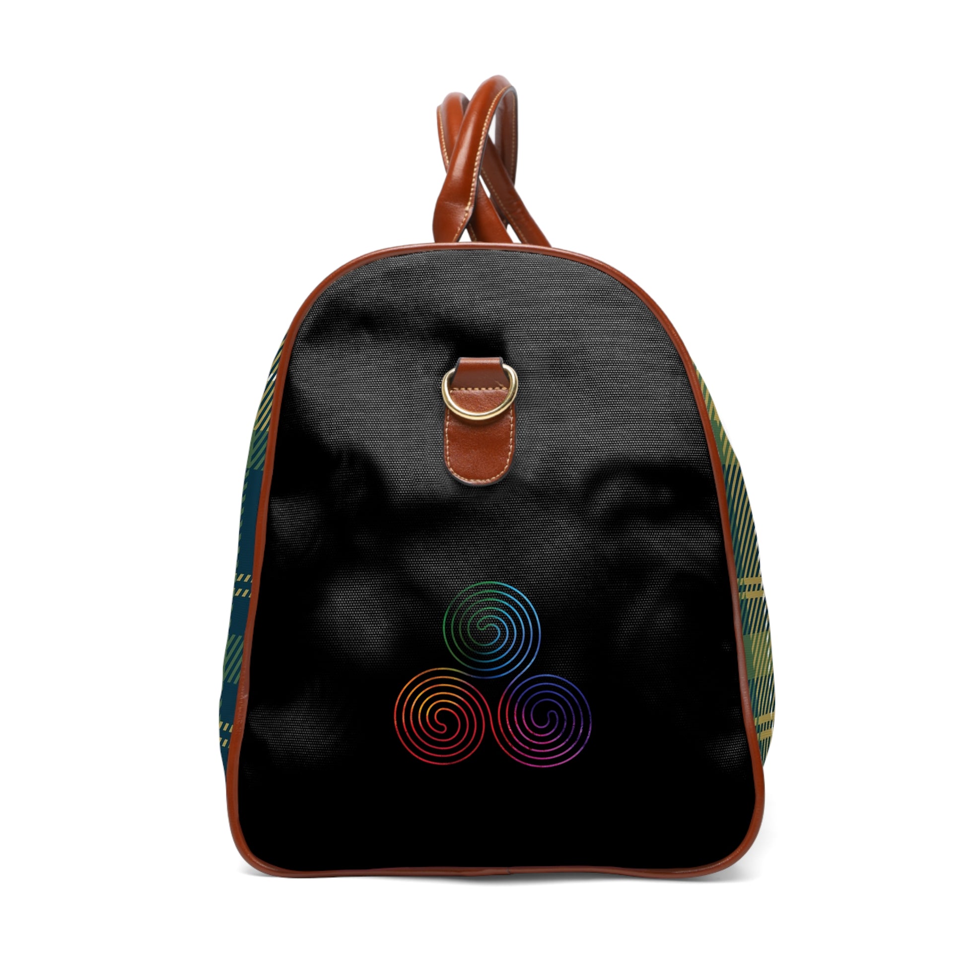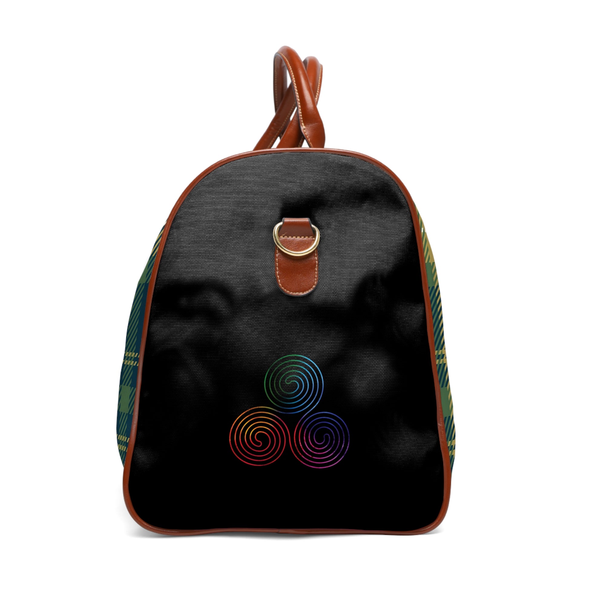 Step into the refined world of travel with the Wicklow Irish Tartan Expeditionary Travel Satchel, where sophistication meets utility. Crafted from premium waterproof fabric in a distinguished forest and olive tartan pattern, this travel companion embodies timeless masculine elegance. It exbits a Irish tartan elegance with a rainbow-themed druid Celtic Spiral knot showcased on the endcaps.