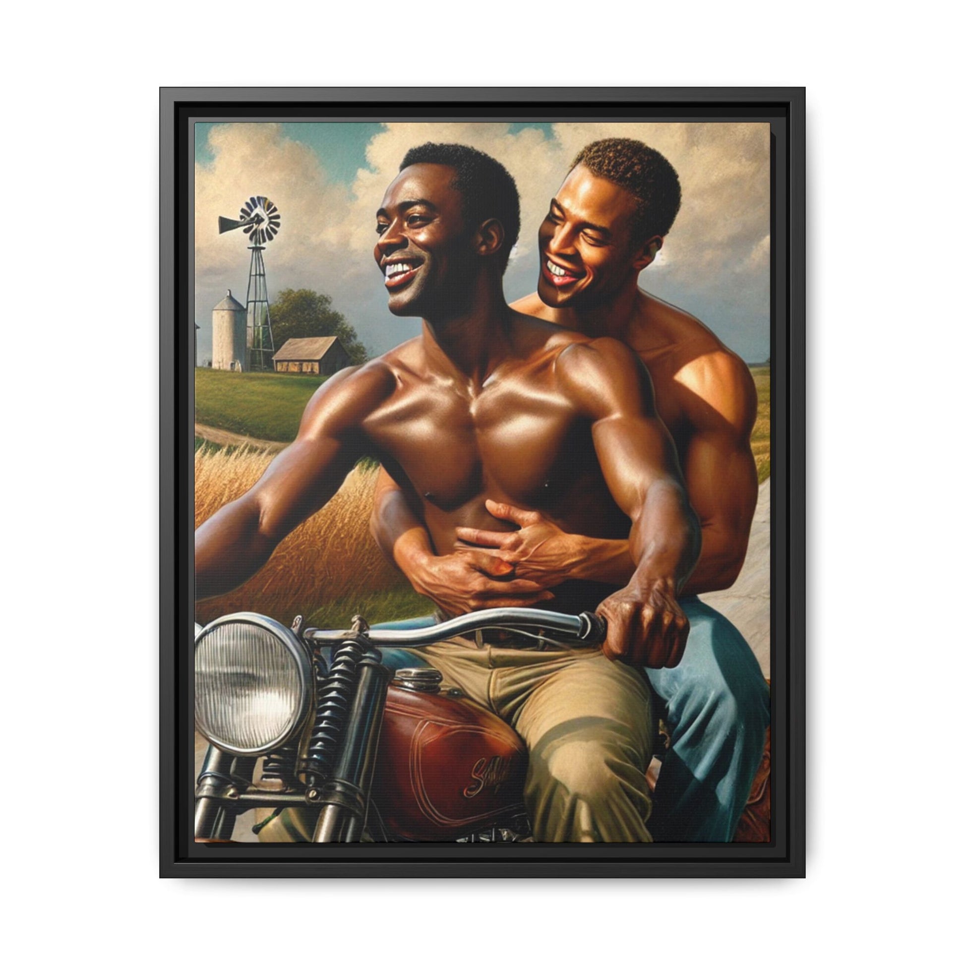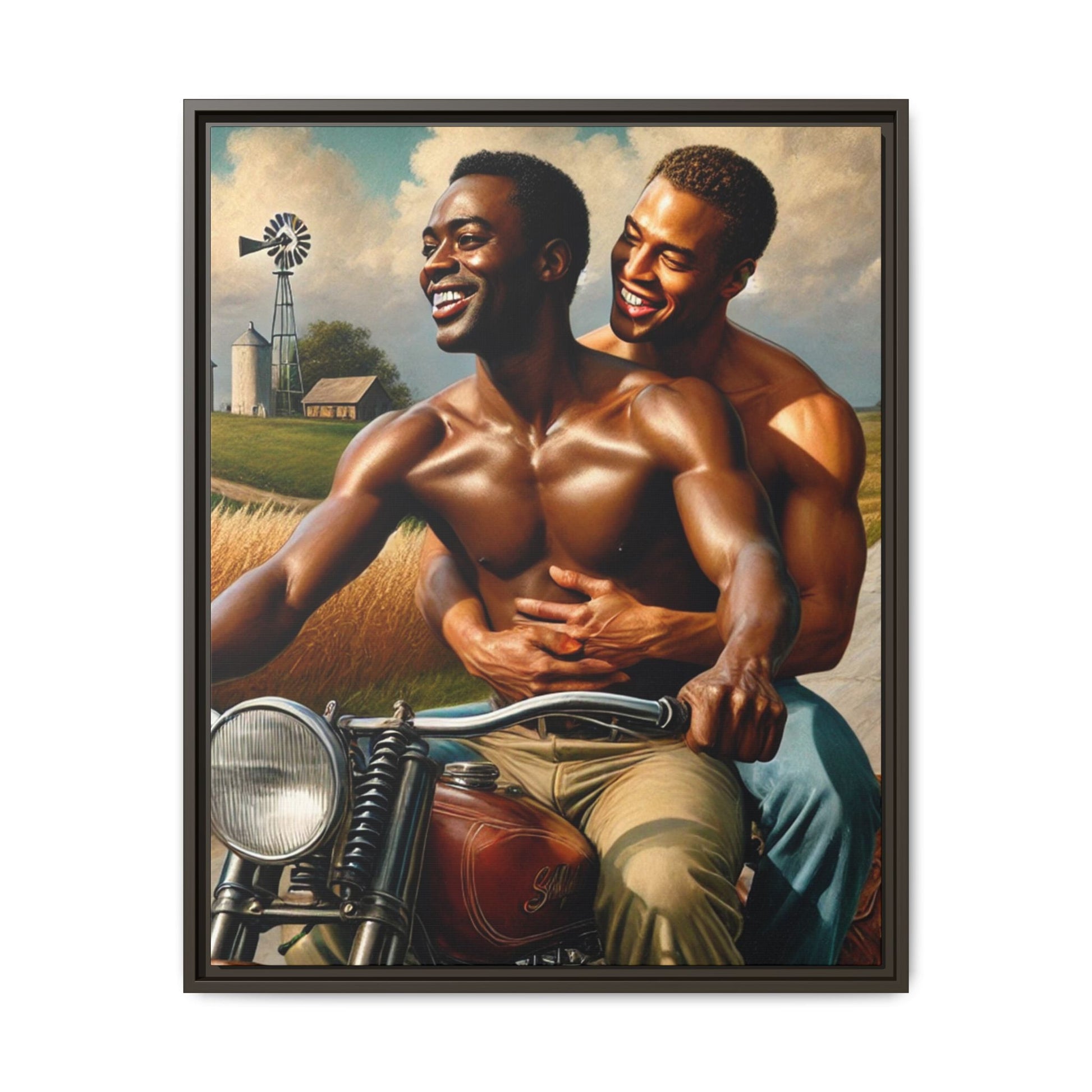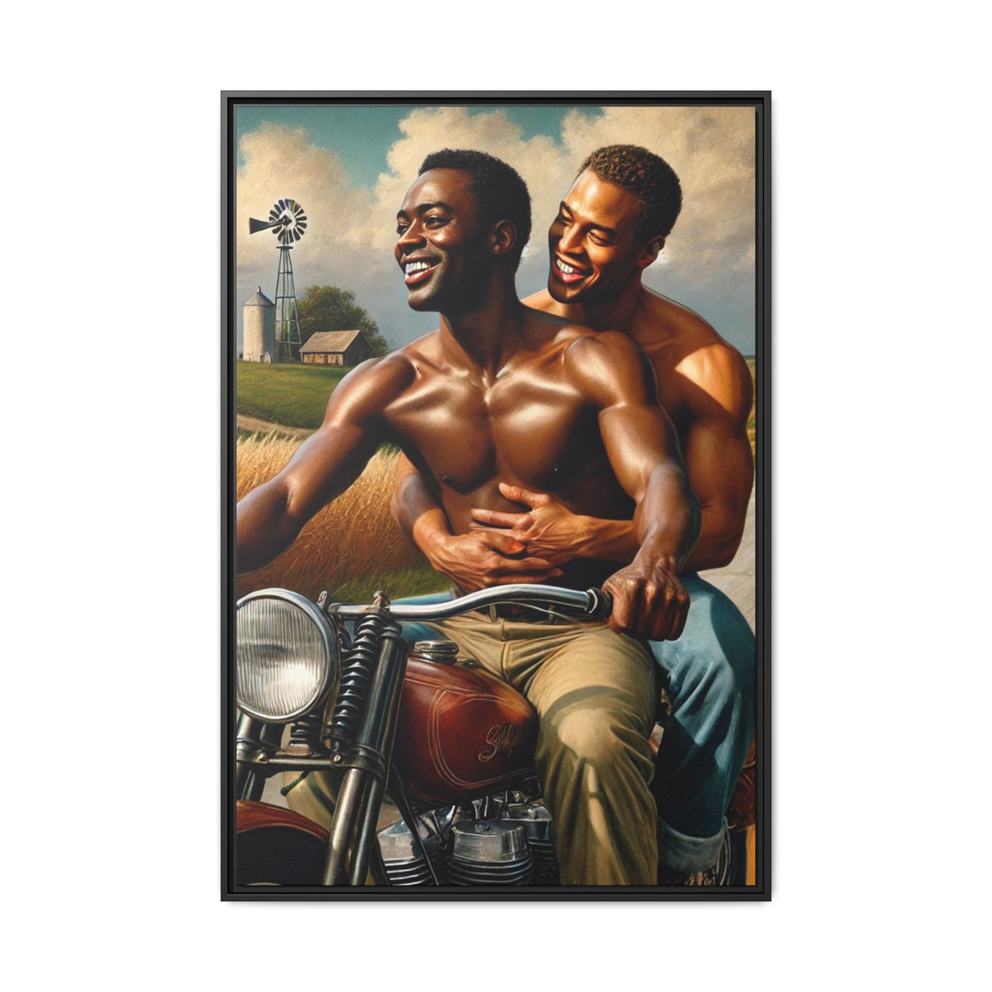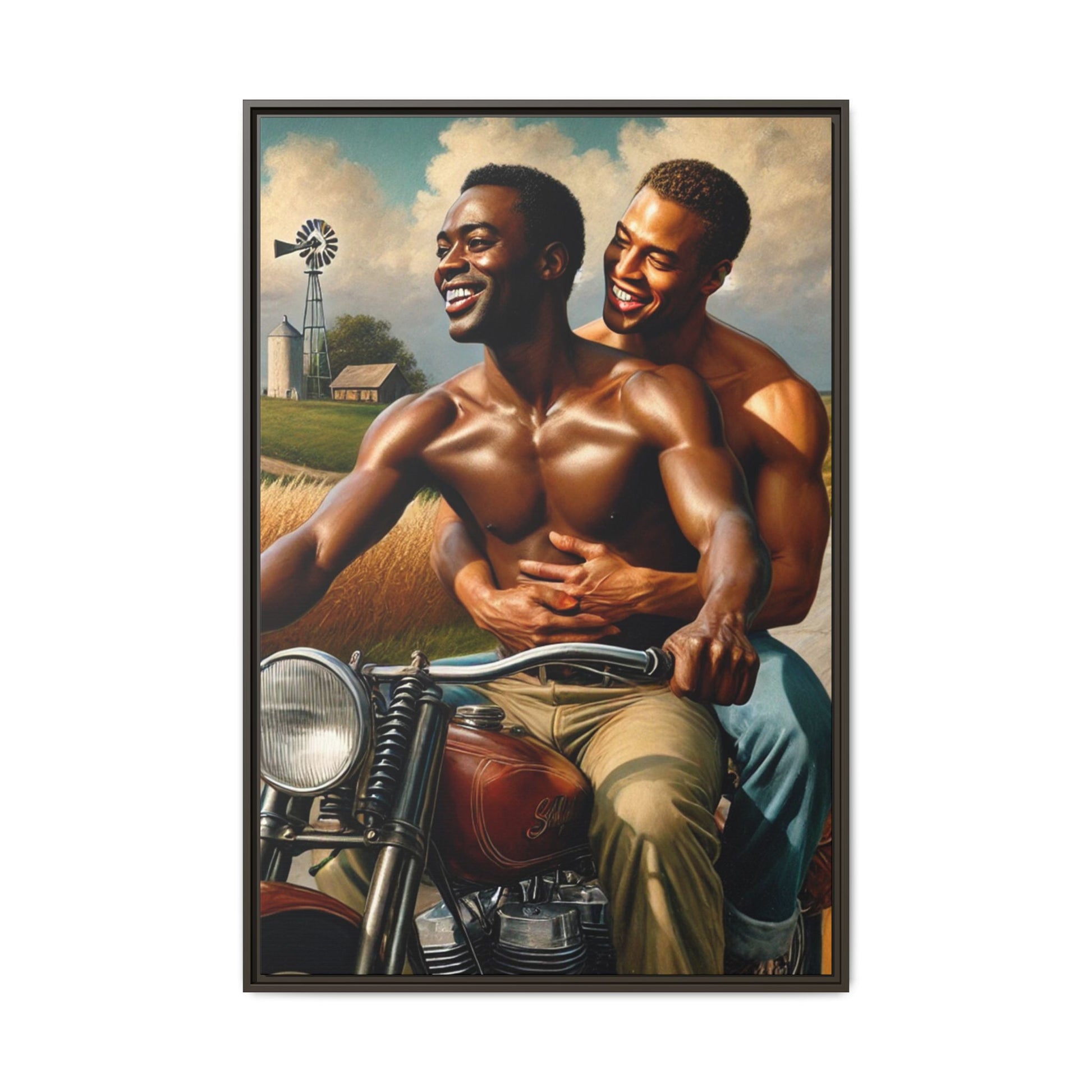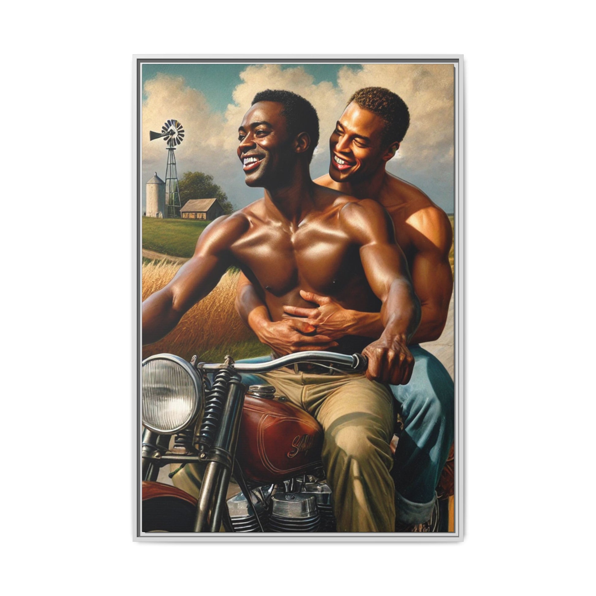 The framed artwork portrays an African-American gay couple sharing a tender moment on a porch at night under the light of a full moon. The setting, reminiscent of Grant Wood's Americana style, exudes rural charm and tranquility.