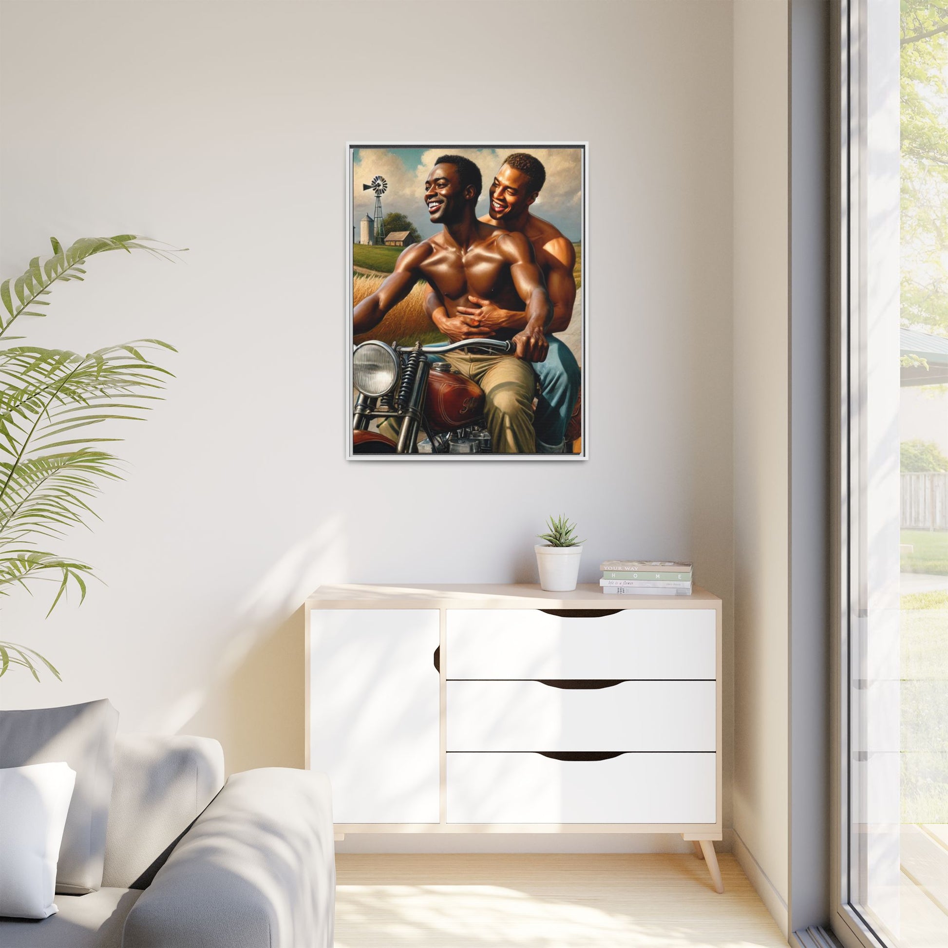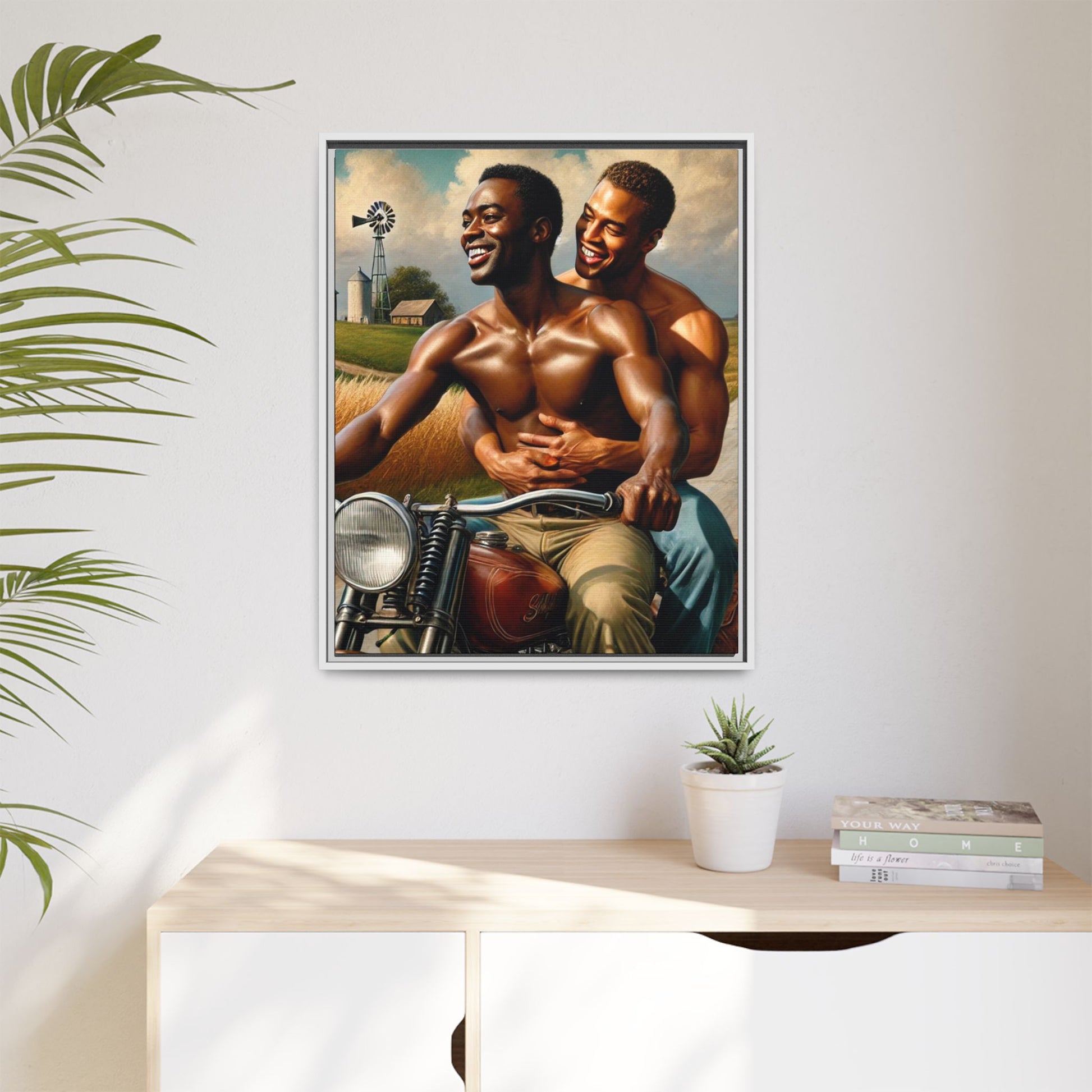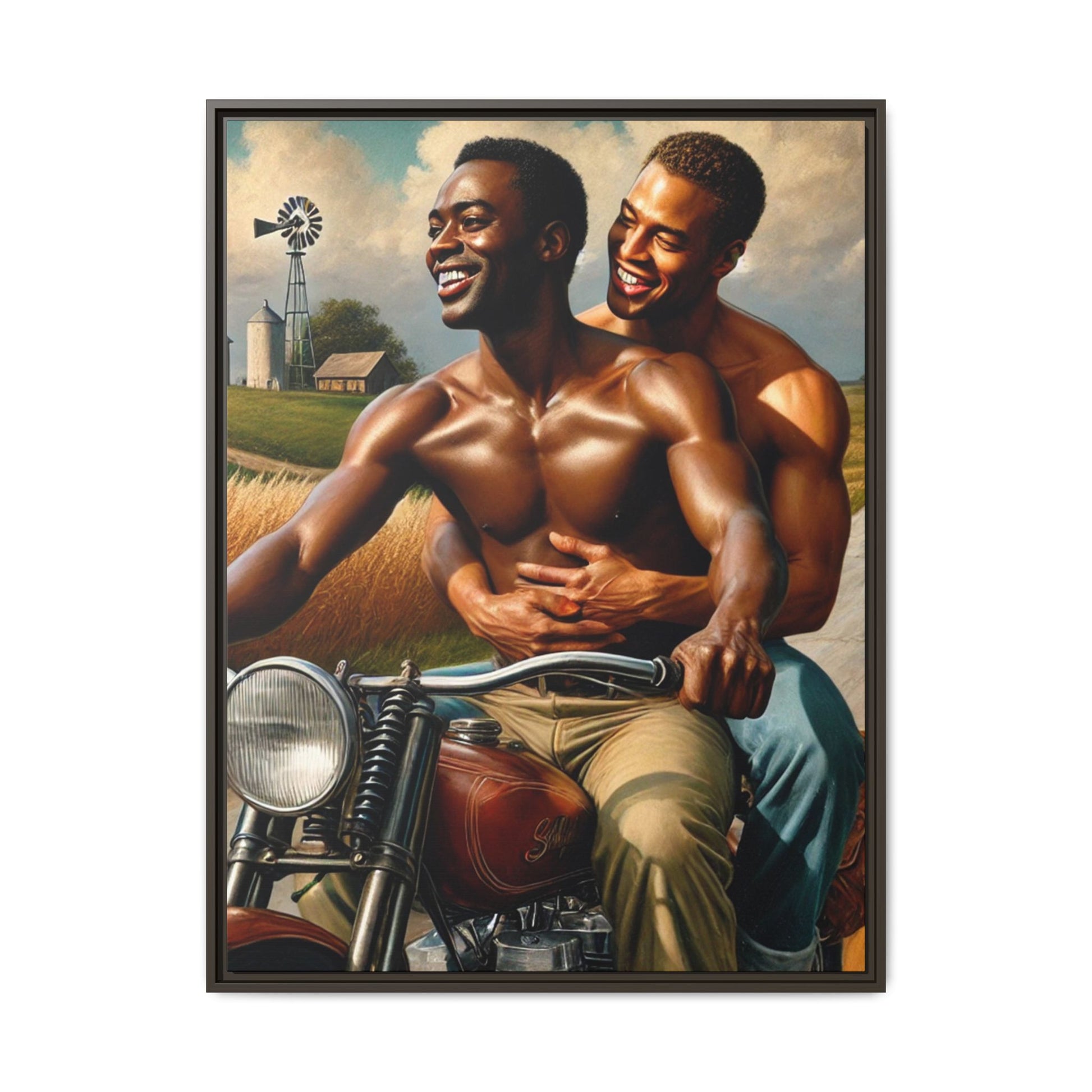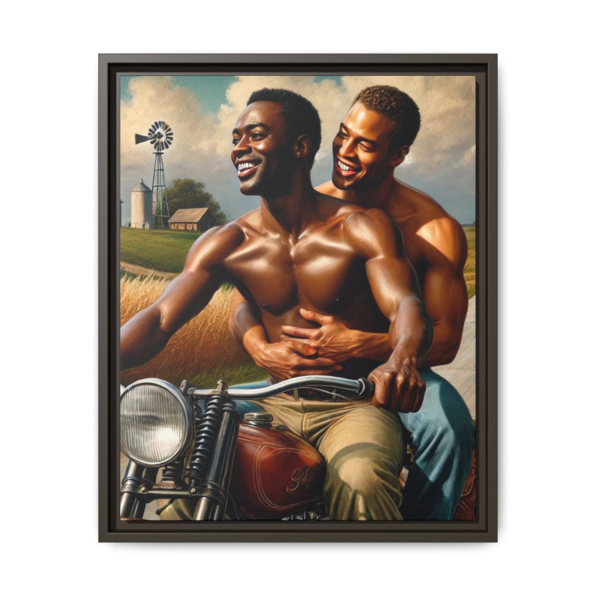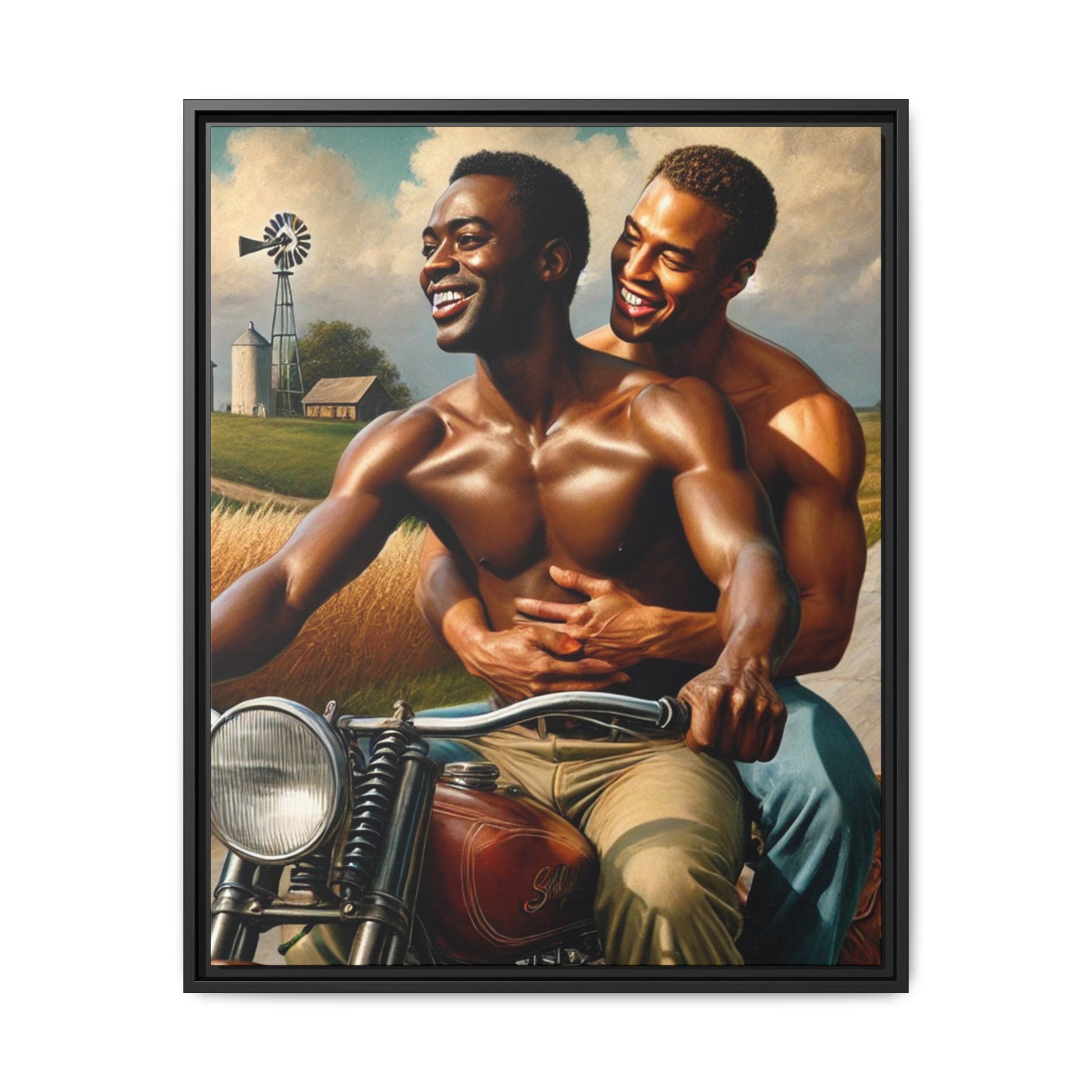 The framed artwork portrays an African-American gay couple sharing a tender moment on a porch at night under the light of a full moon. The setting, reminiscent of Grant Wood's Americana style, exudes rural charm and tranquility.
