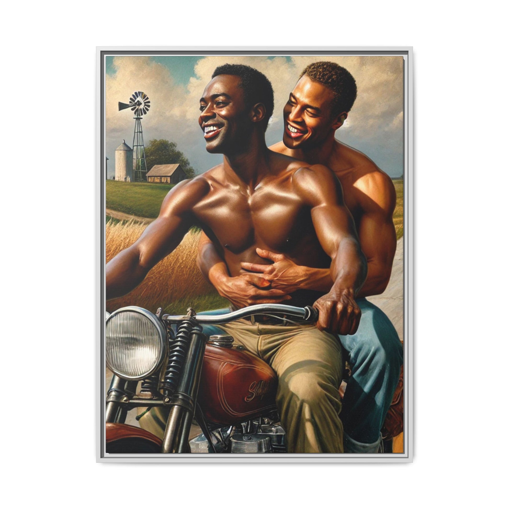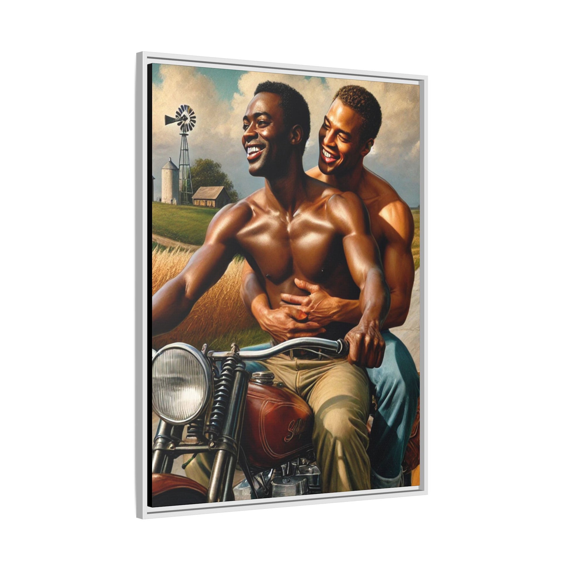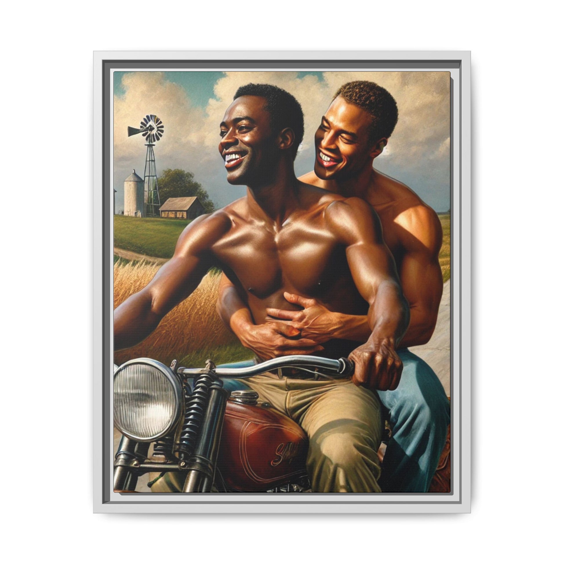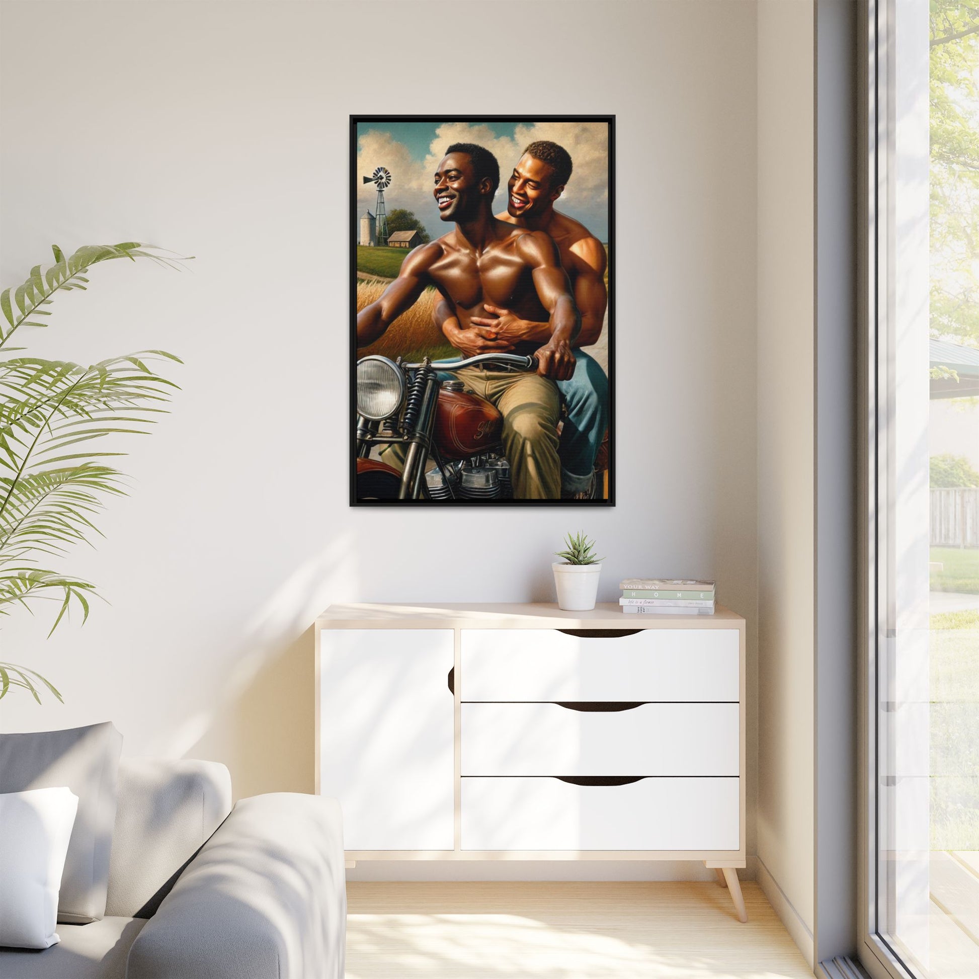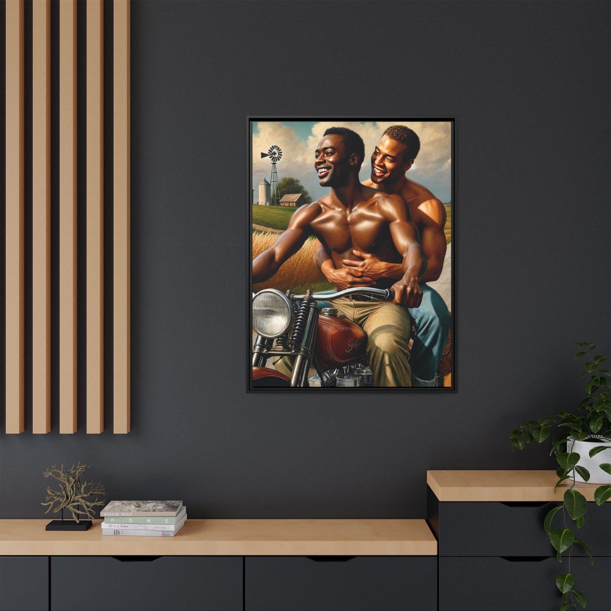 The framed artwork portrays an African-American gay couple sharing a tender moment on a porch at night under the light of a full moon. The setting, reminiscent of Grant Wood's Americana style, exudes rural charm and tranquility.