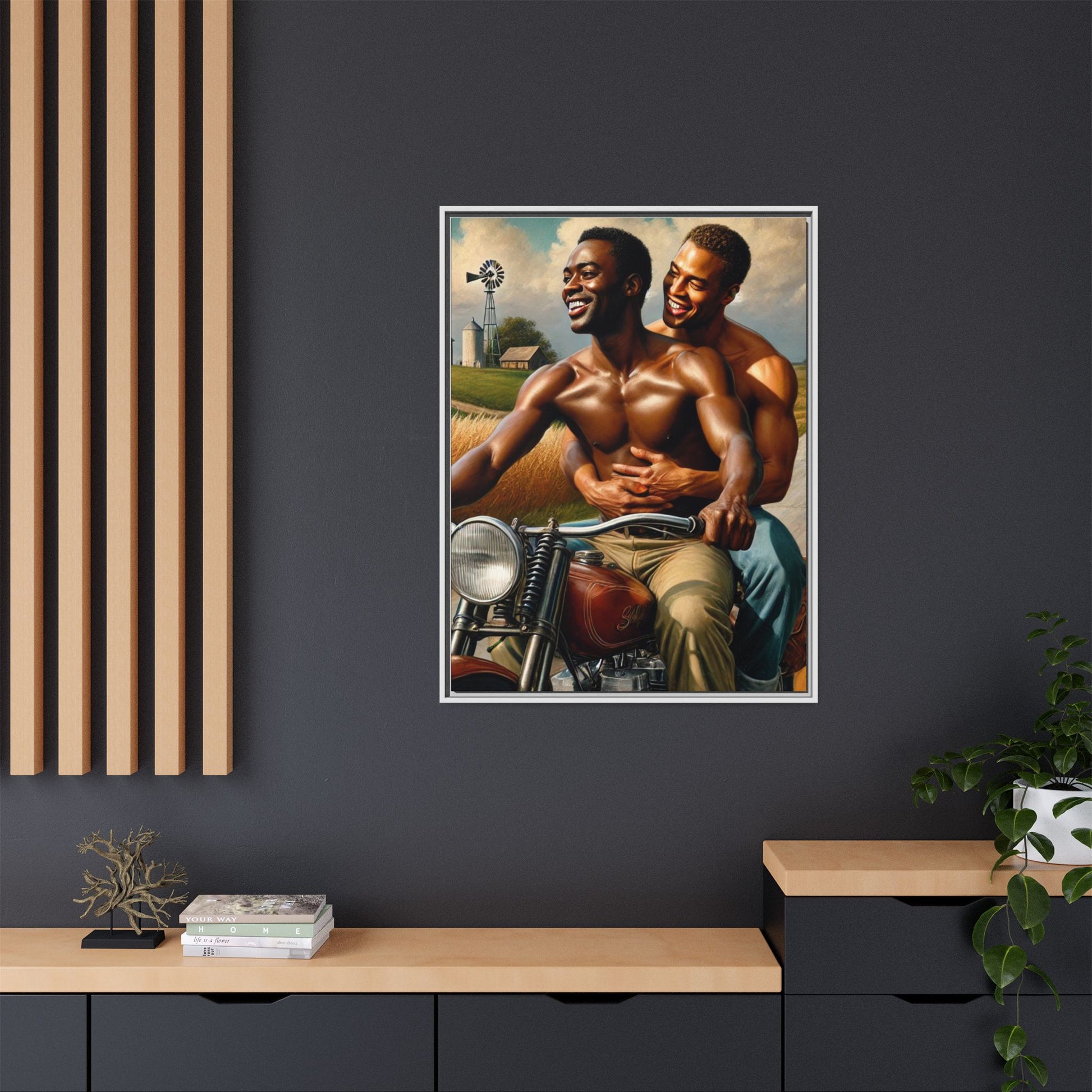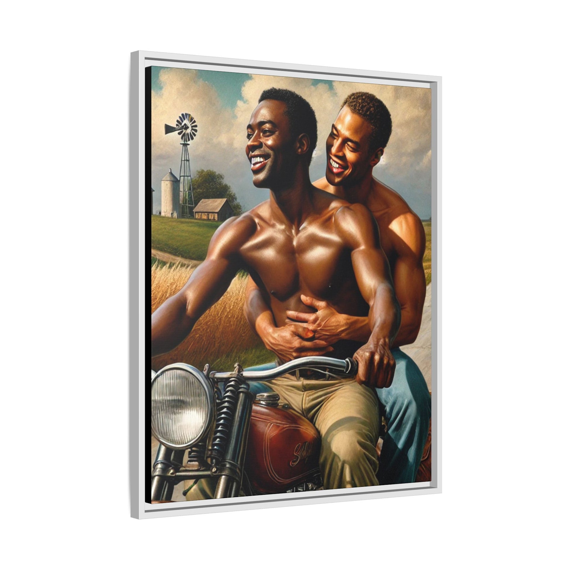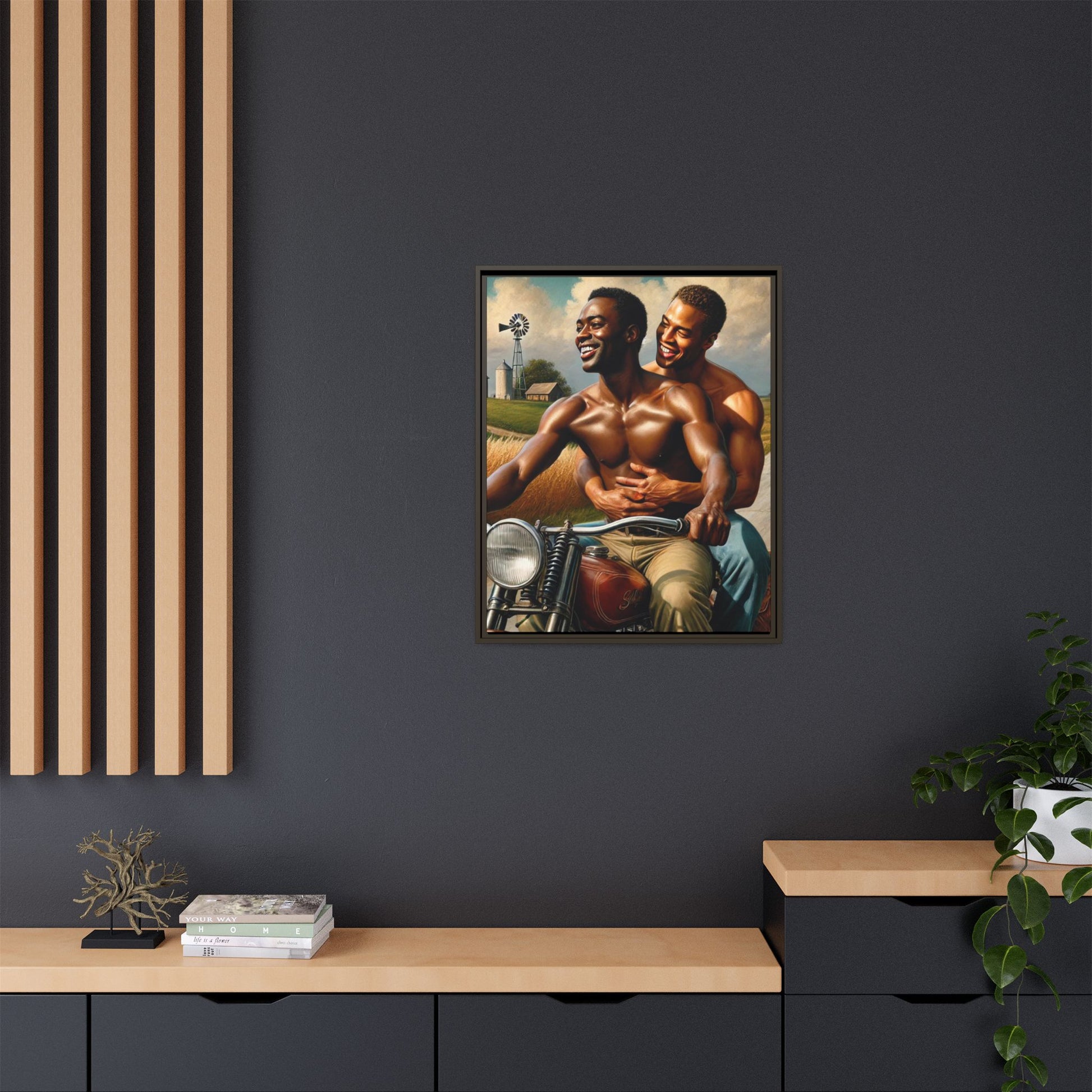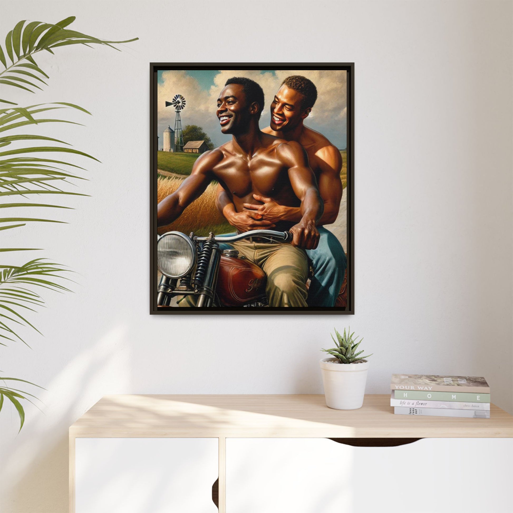 The framed artwork portrays an African-American gay couple sharing a tender moment on a porch at night under the light of a full moon. The setting, reminiscent of Grant Wood's Americana style, exudes rural charm and tranquility.