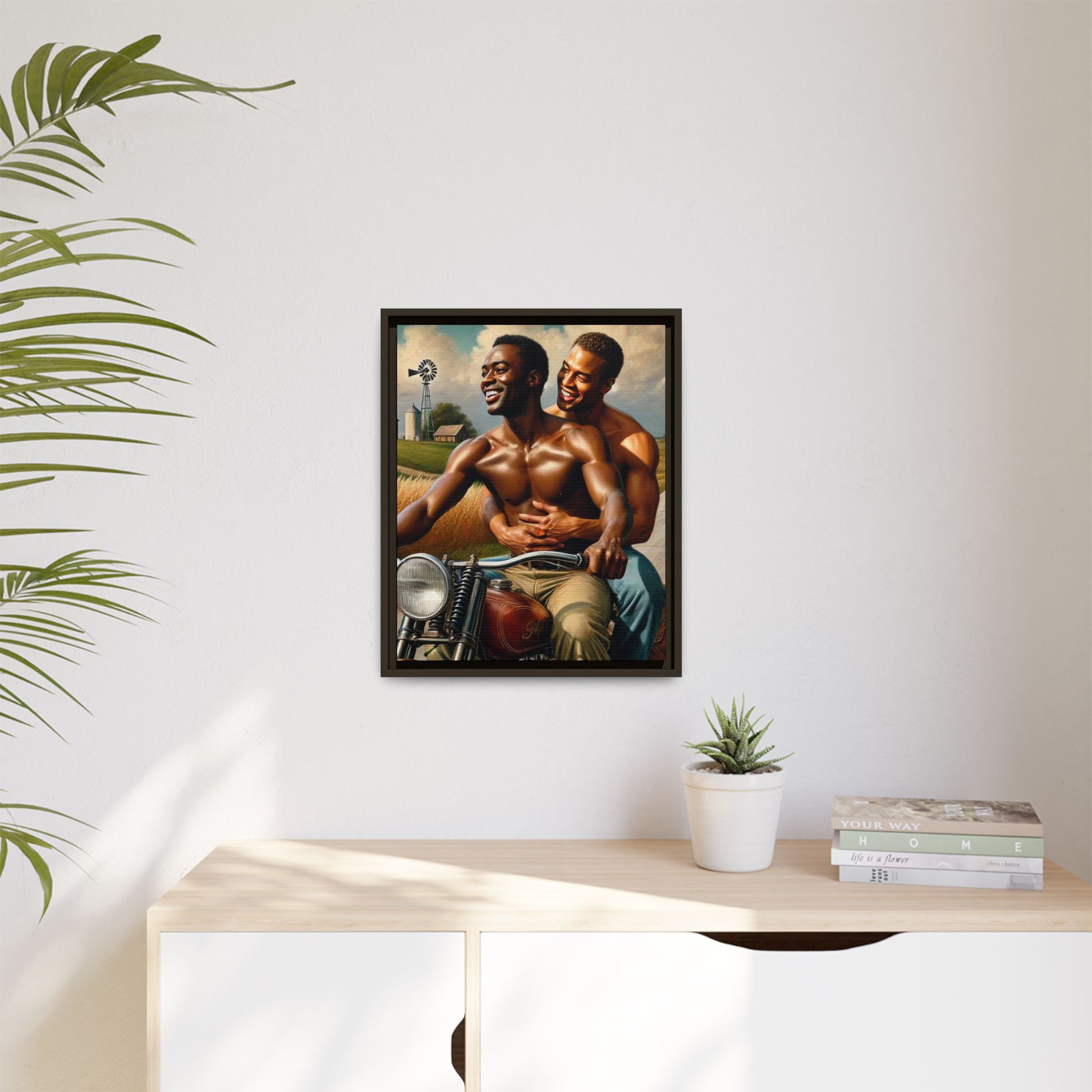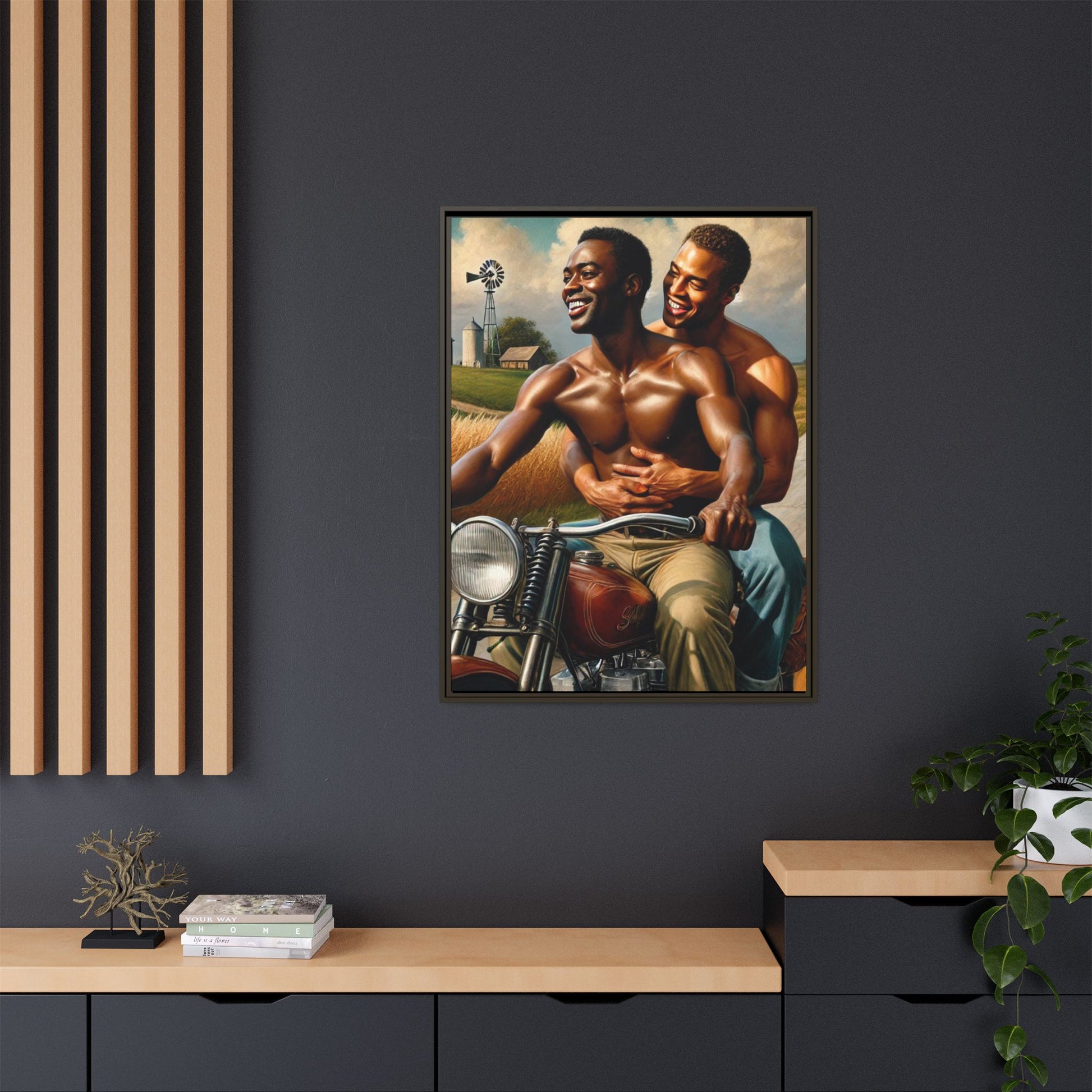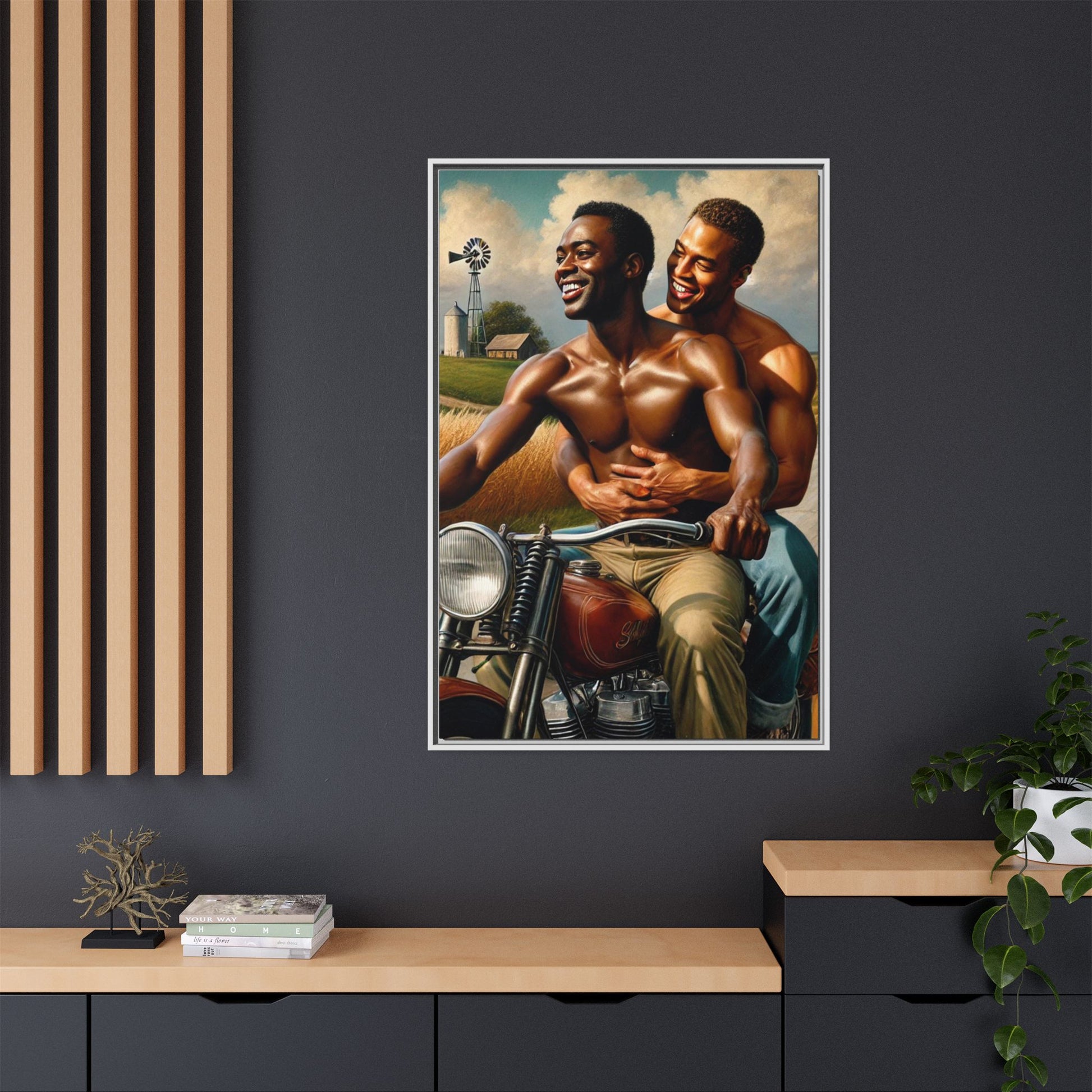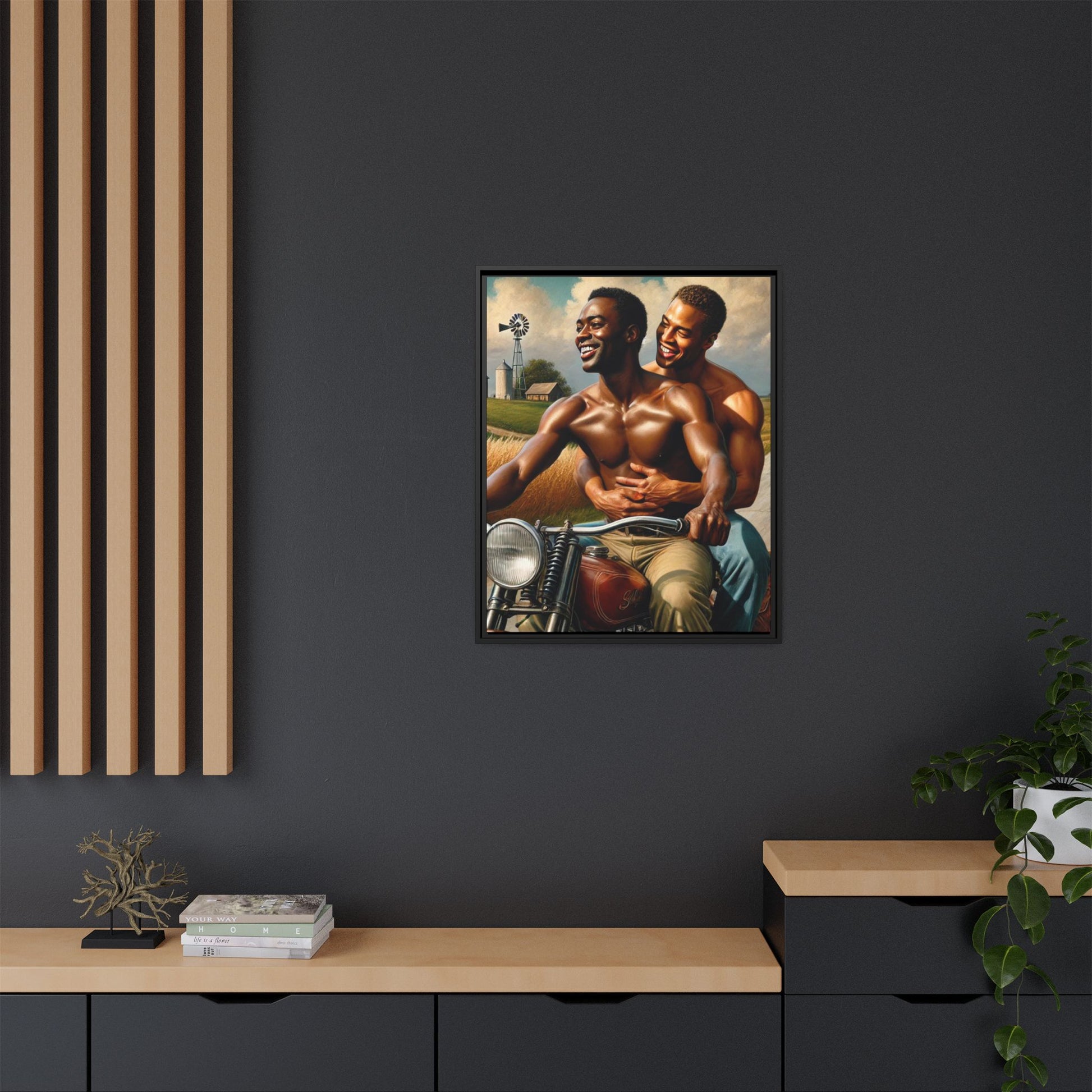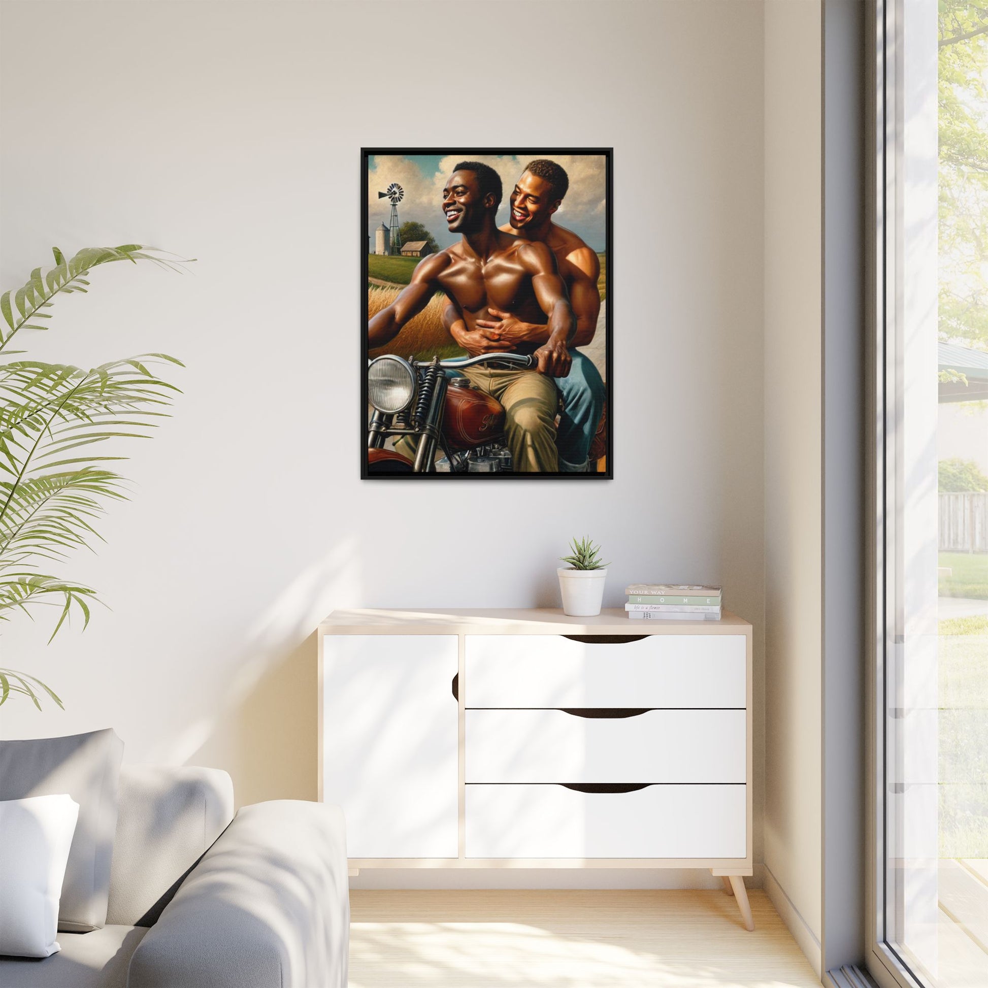The framed artwork portrays an African-American gay couple sharing a tender moment on a porch at night under the light of a full moon. The setting, reminiscent of Grant Wood's Americana style, exudes rural charm and tranquility.