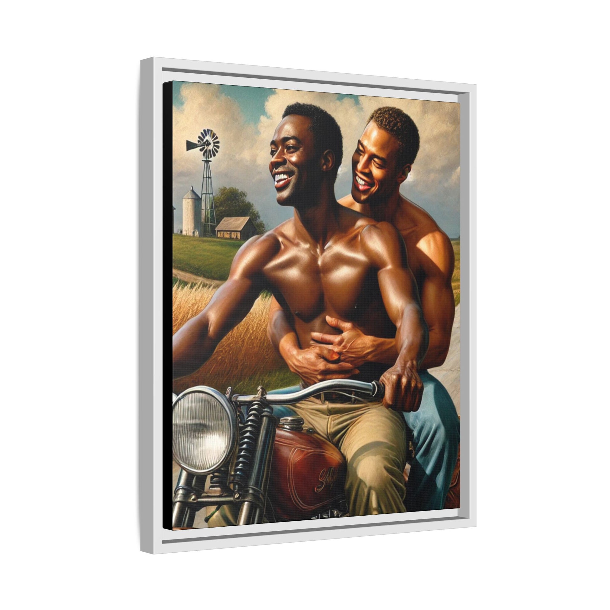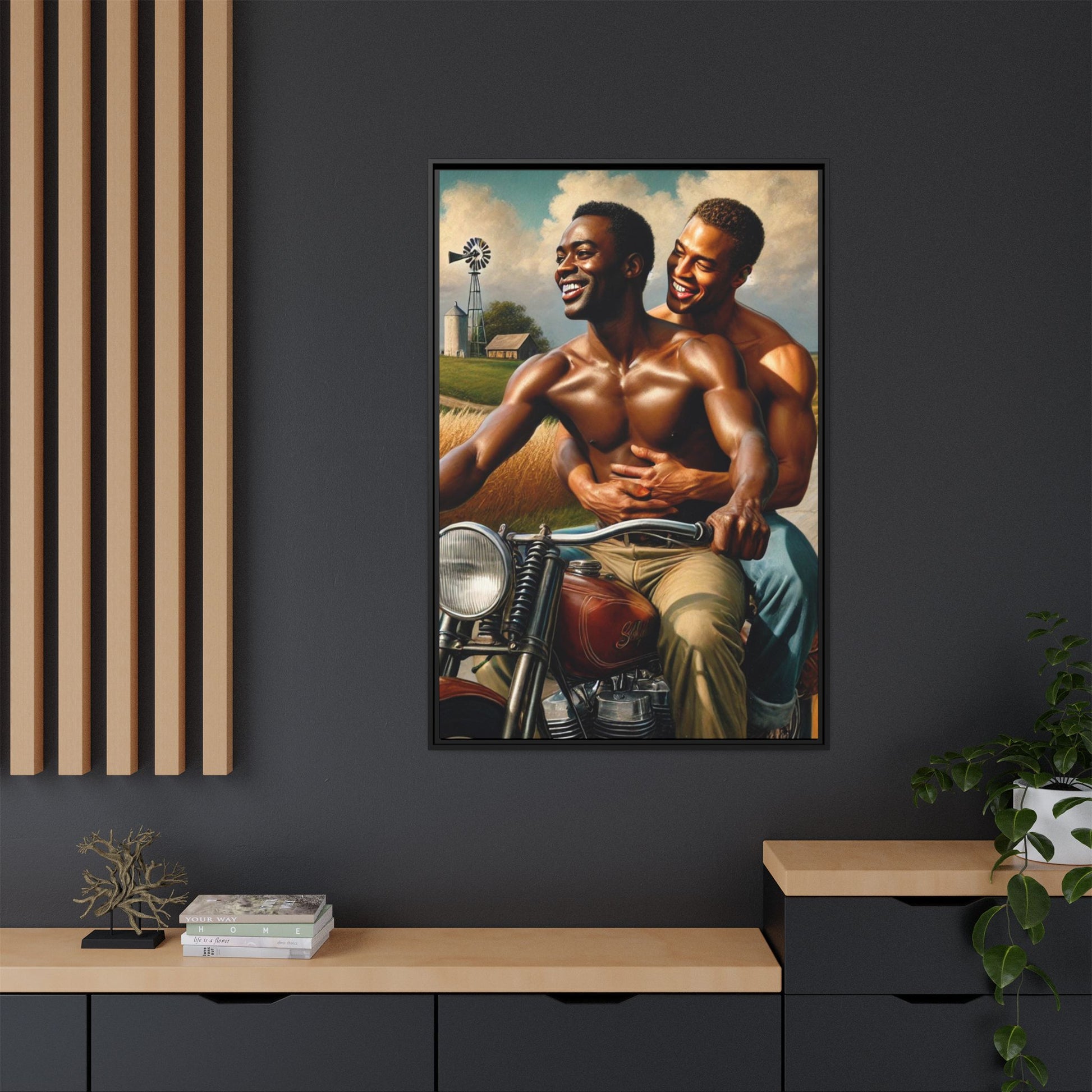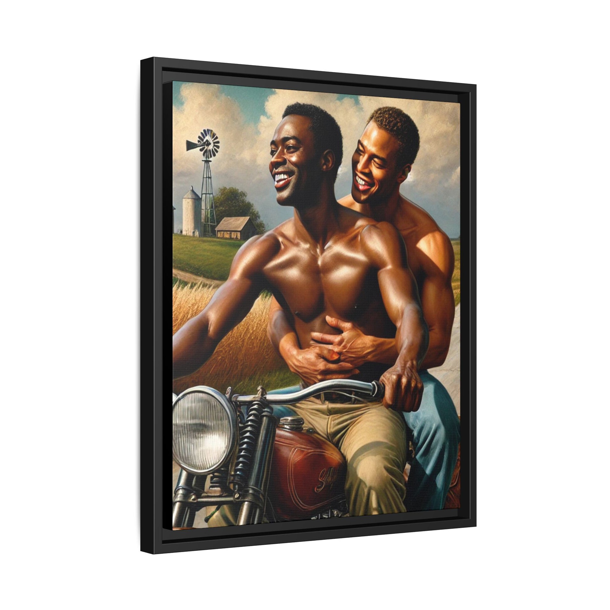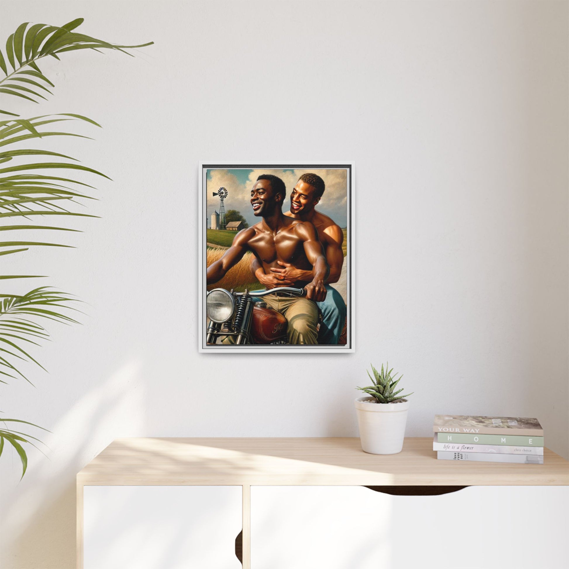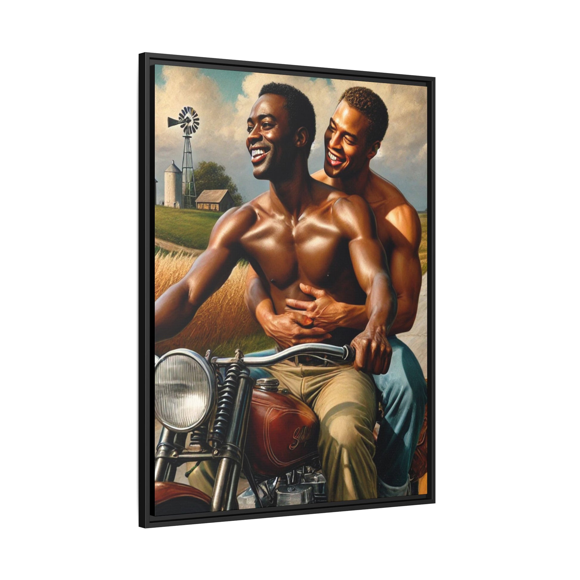 The framed artwork portrays an African-American gay couple sharing a tender moment on a porch at night under the light of a full moon. The setting, reminiscent of Grant Wood's Americana style, exudes rural charm and tranquility.