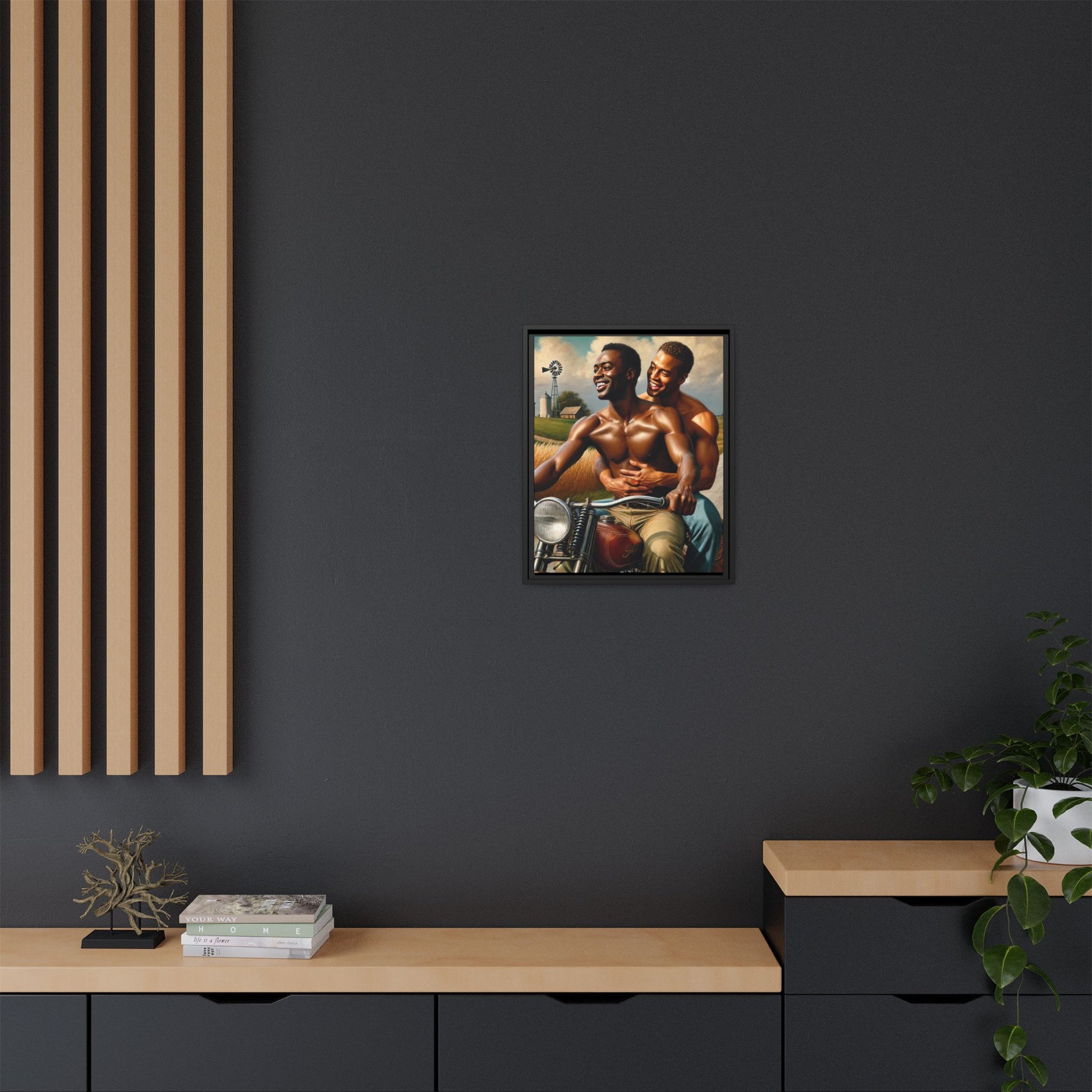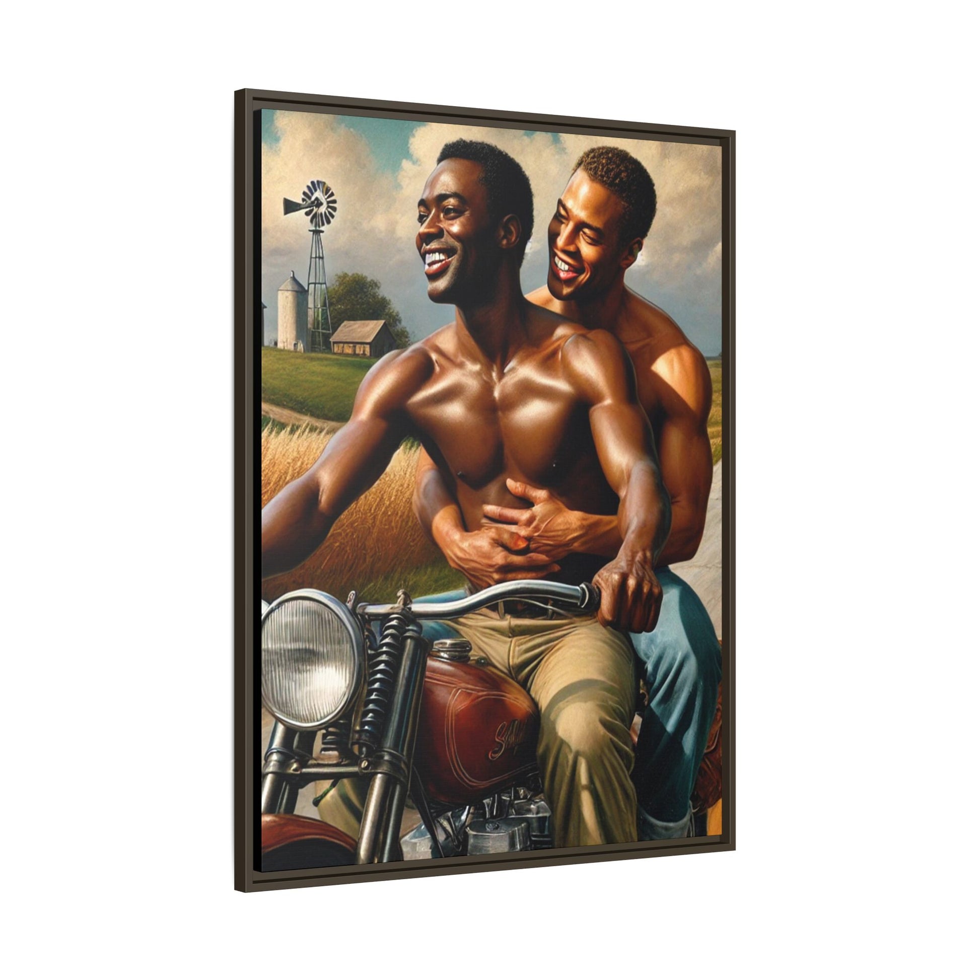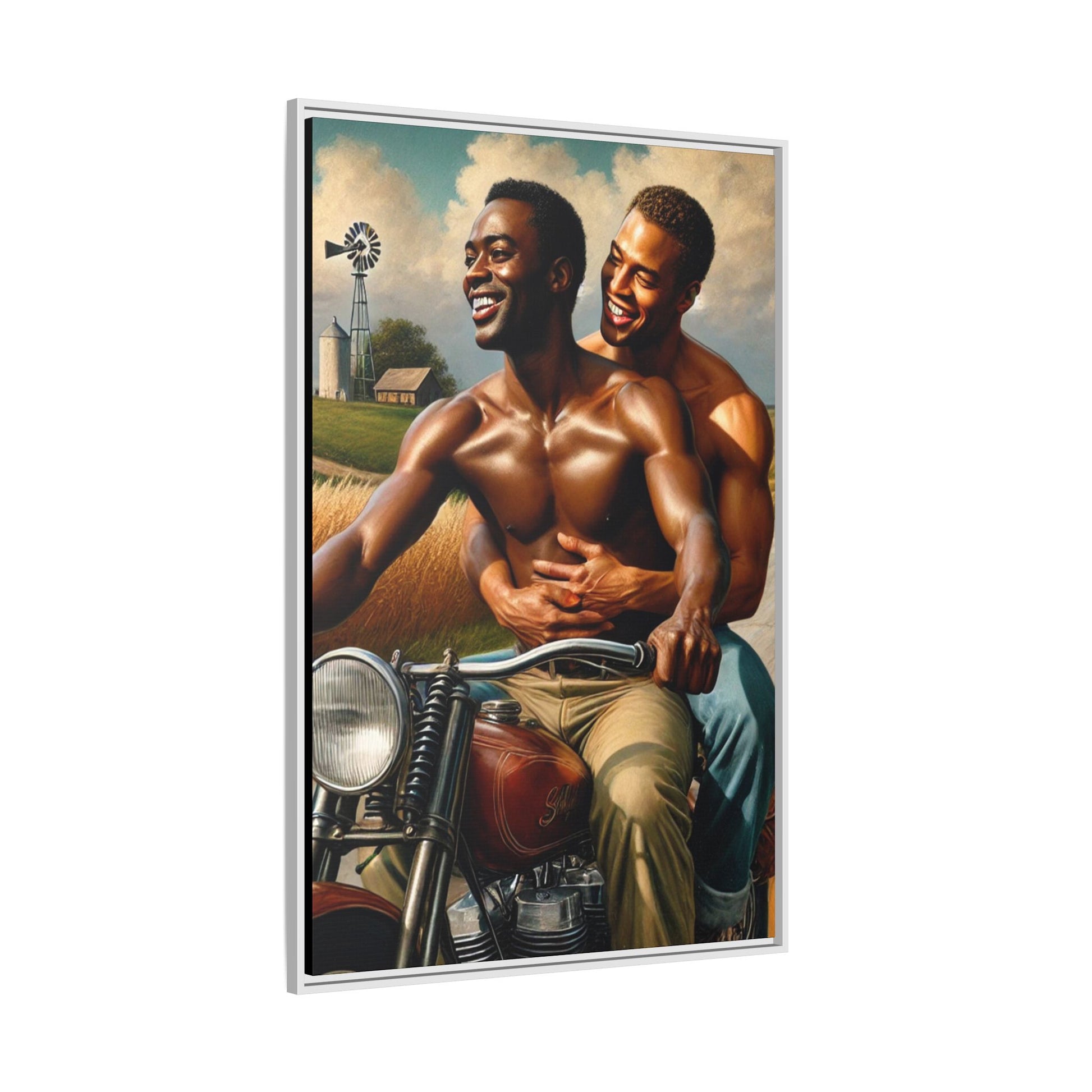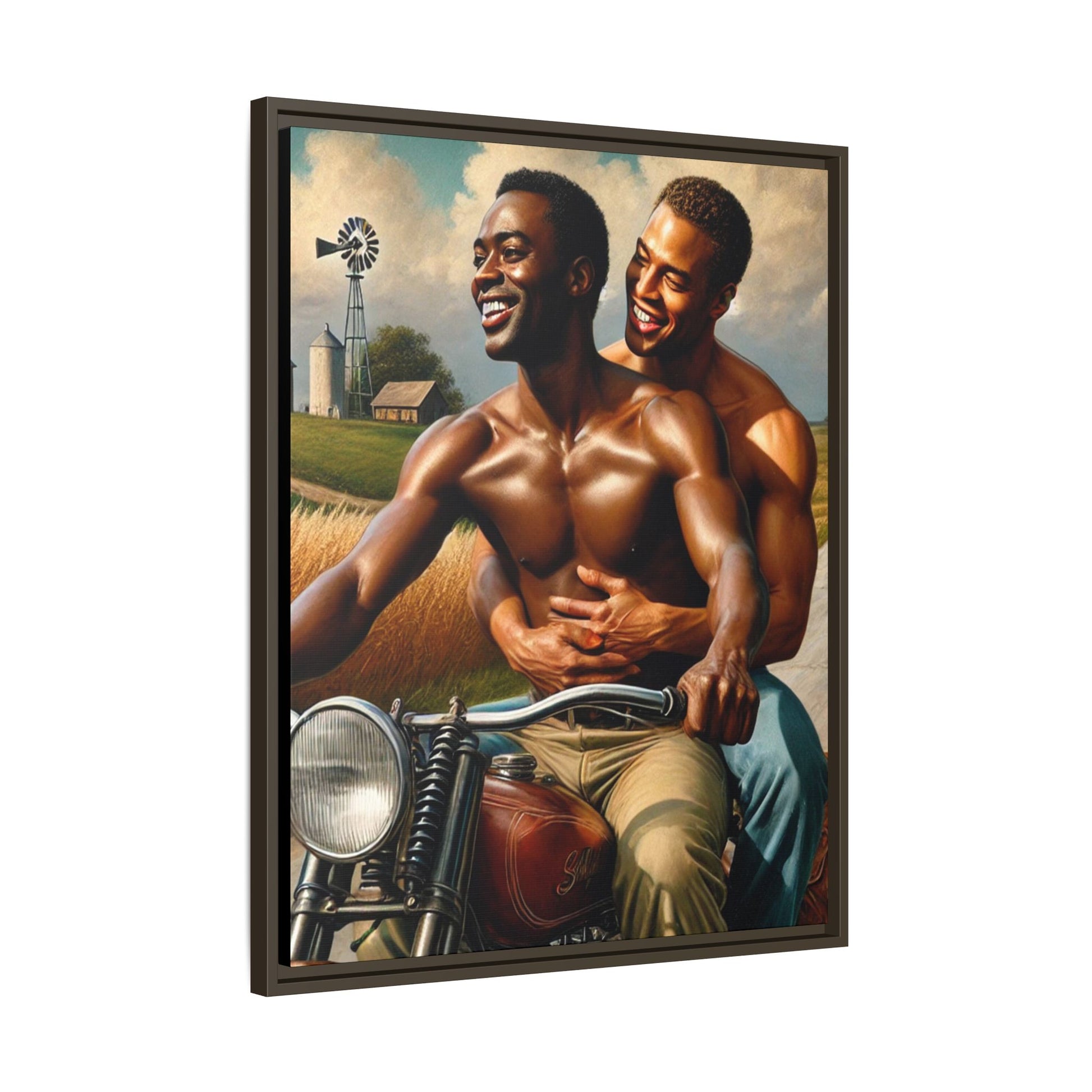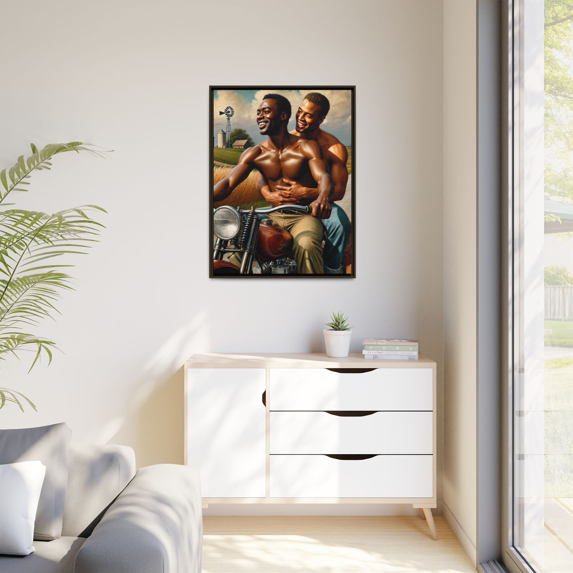 The framed artwork portrays an African-American gay couple sharing a tender moment on a porch at night under the light of a full moon. The setting, reminiscent of Grant Wood's Americana style, exudes rural charm and tranquility.