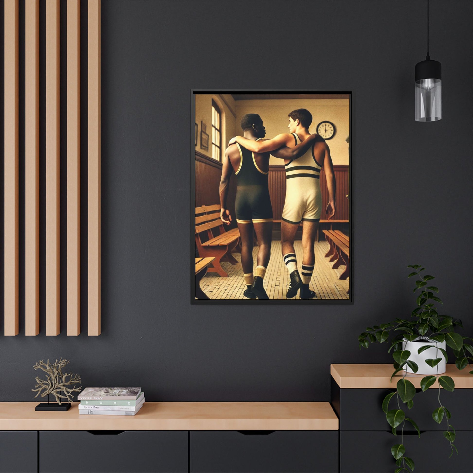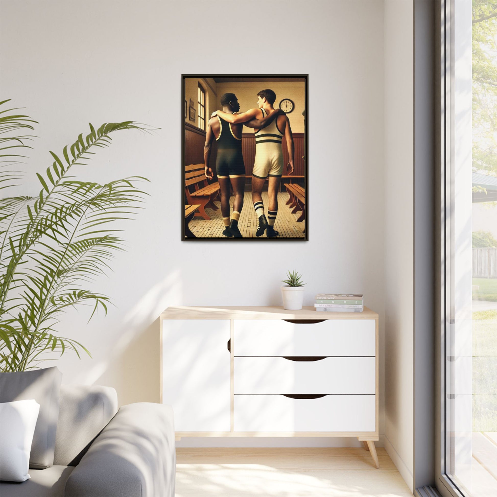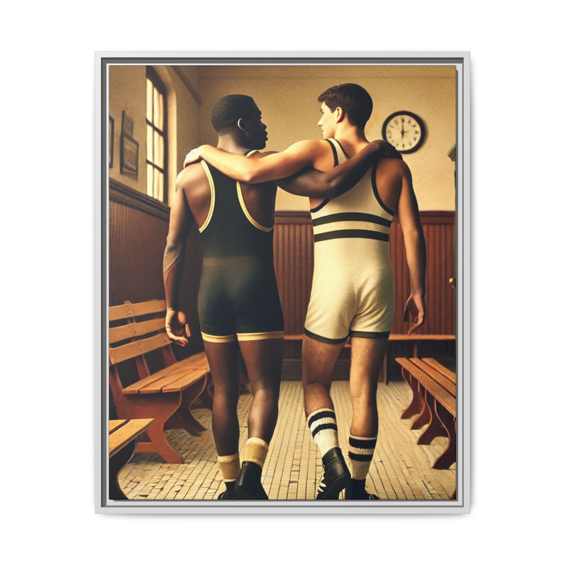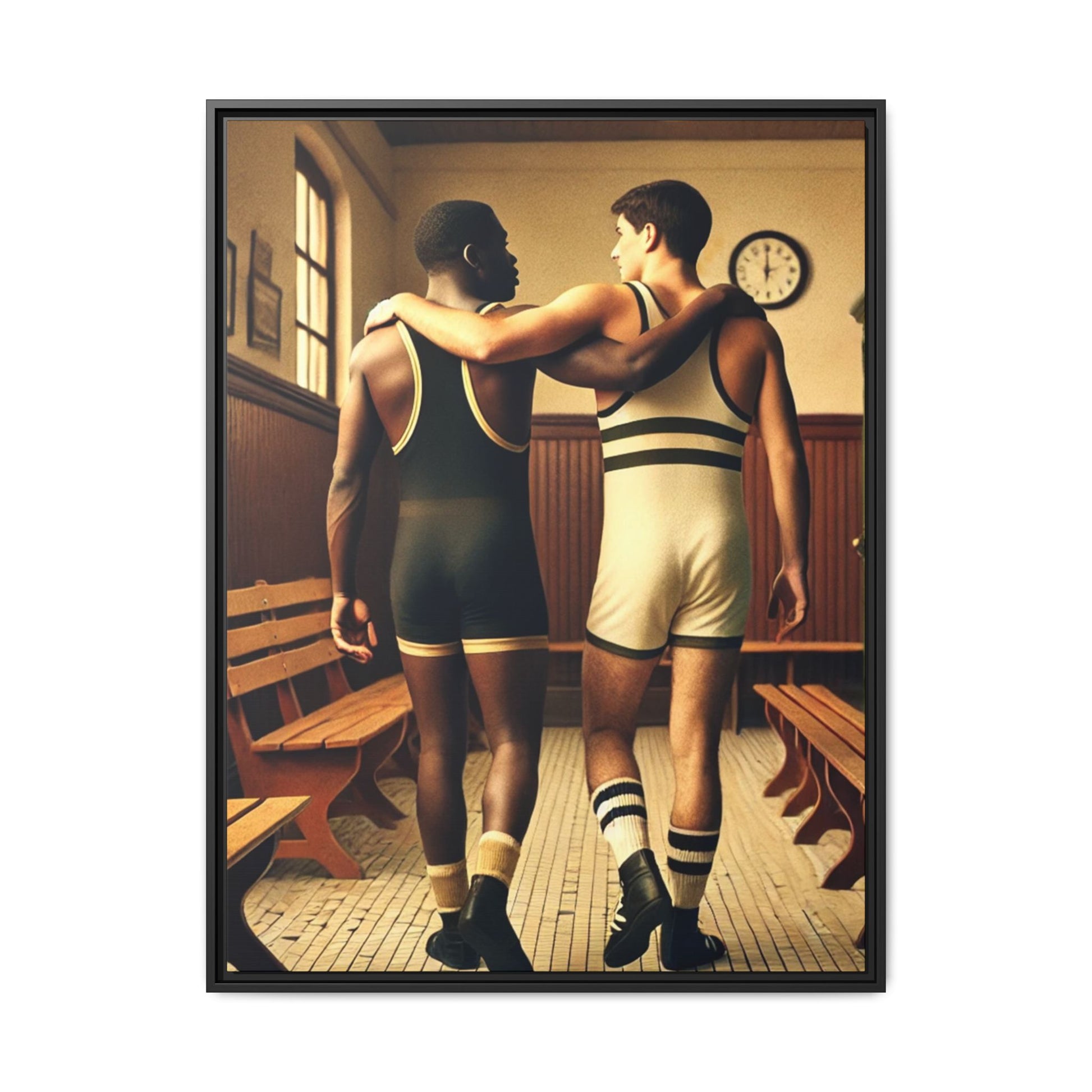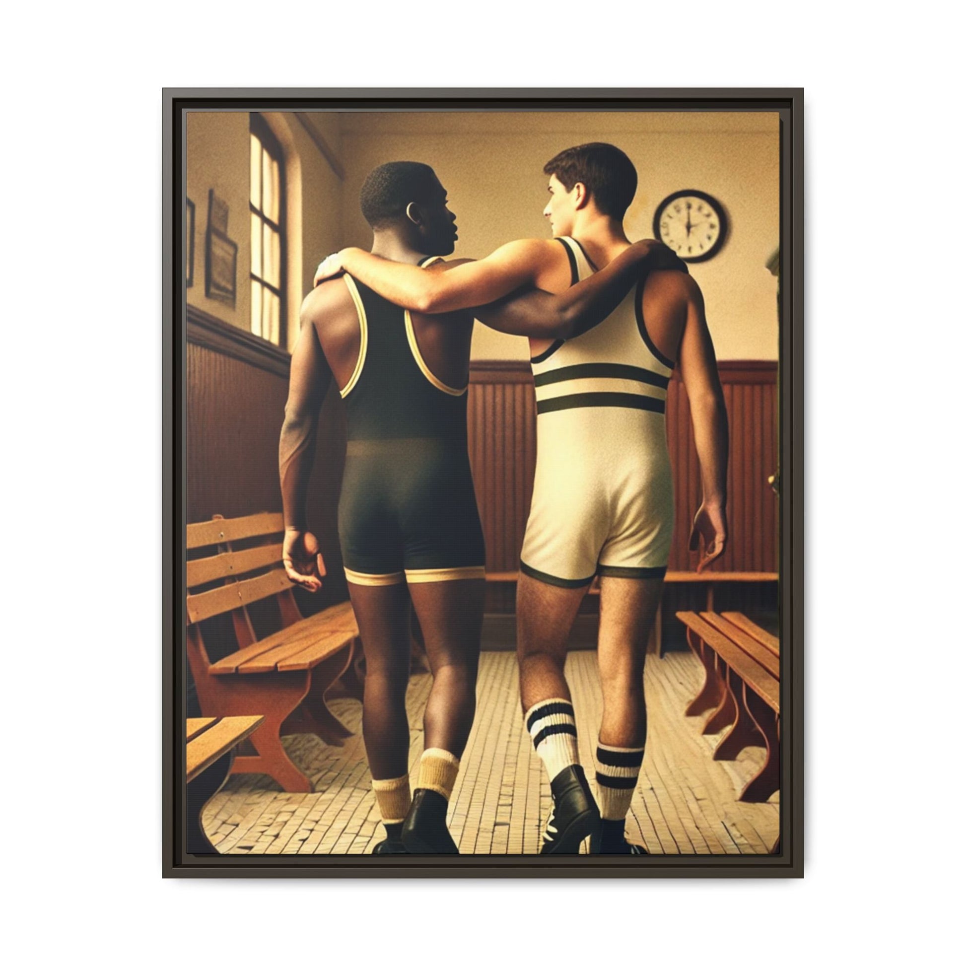 Celebrate diversity and camaraderie with this vintage-style framed artwork featuring an African American and a white wrestler in a classic 1920s locker room. Their supportive bond highlights themes of friendship, unity, and inclusion. With warm tones and intricate details, this piece captures the timeless spirit of diversity and athleticism. Perfect for adding a nostalgic and meaningful touch to your decor or as a thoughtful gift celebrating unity and history.