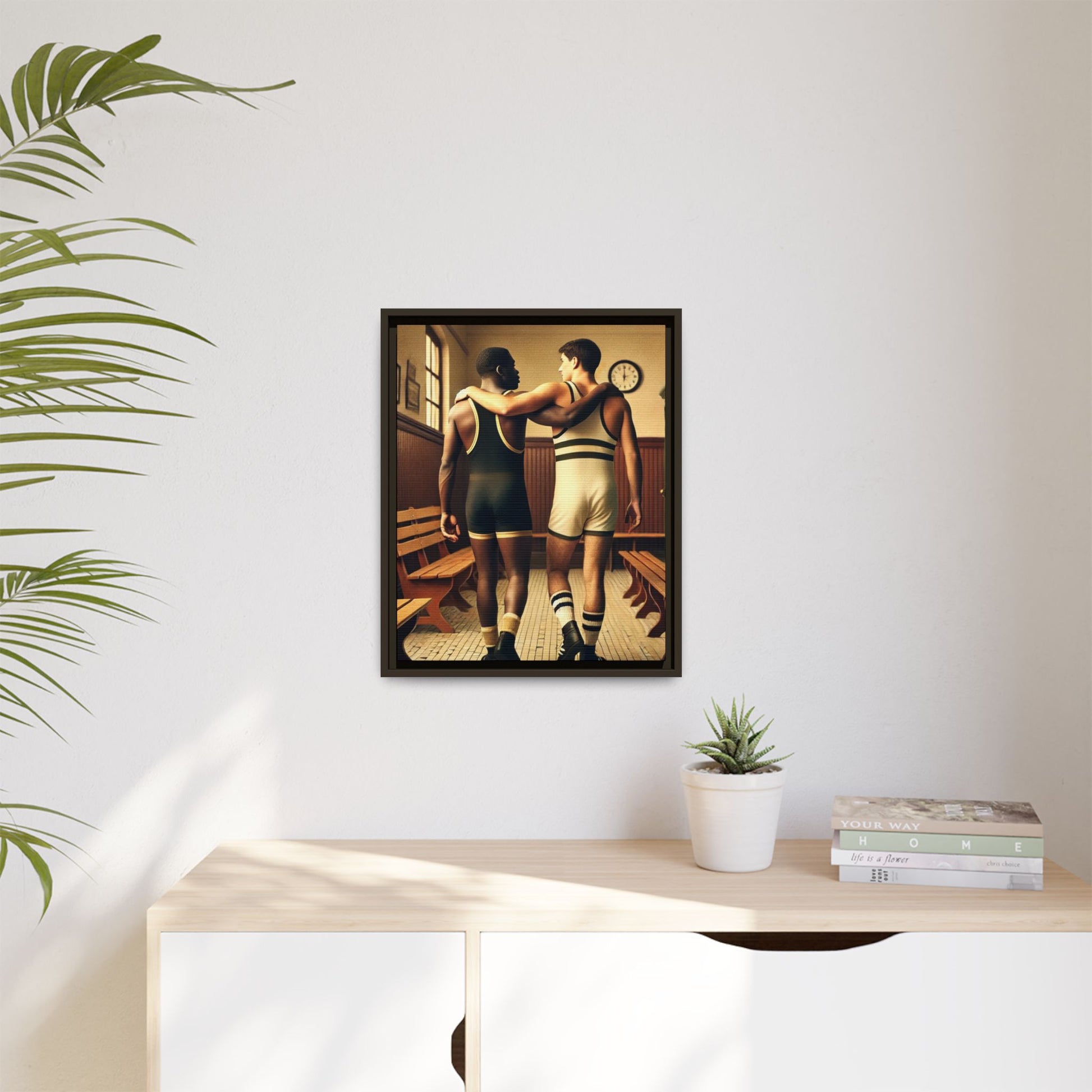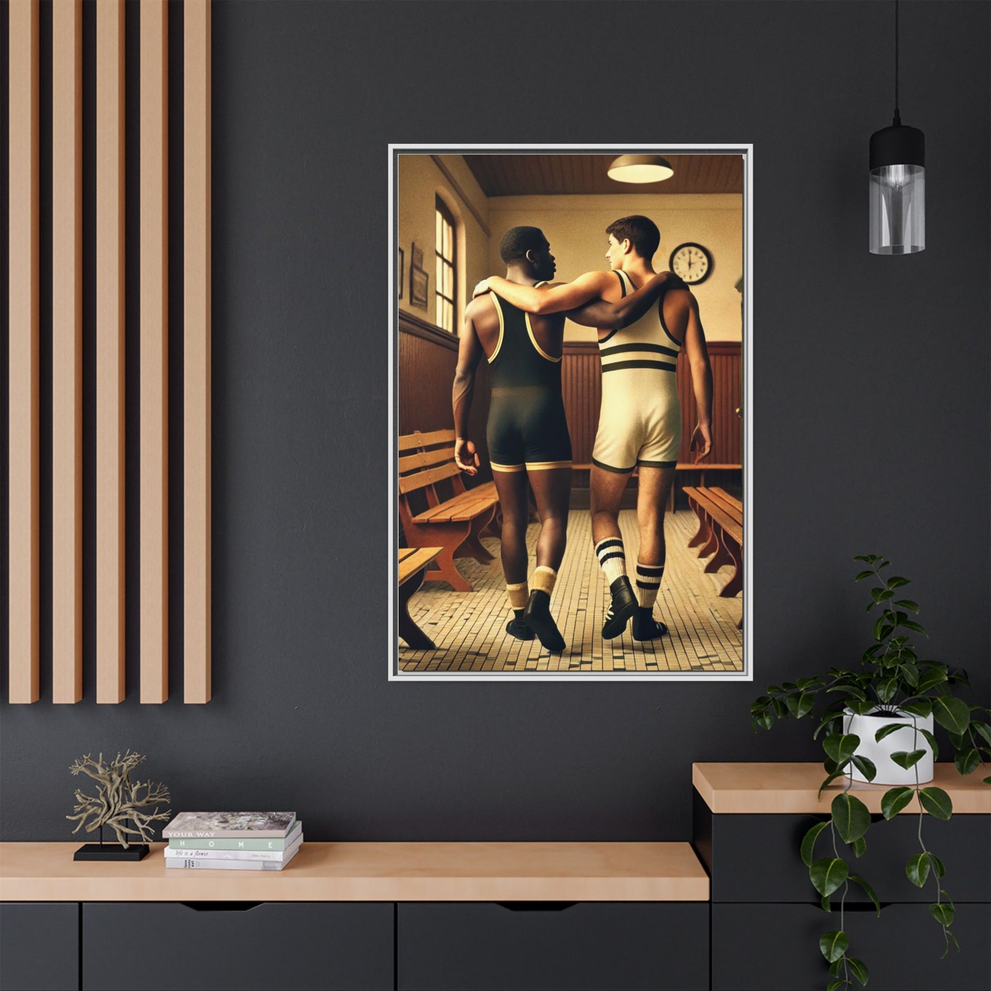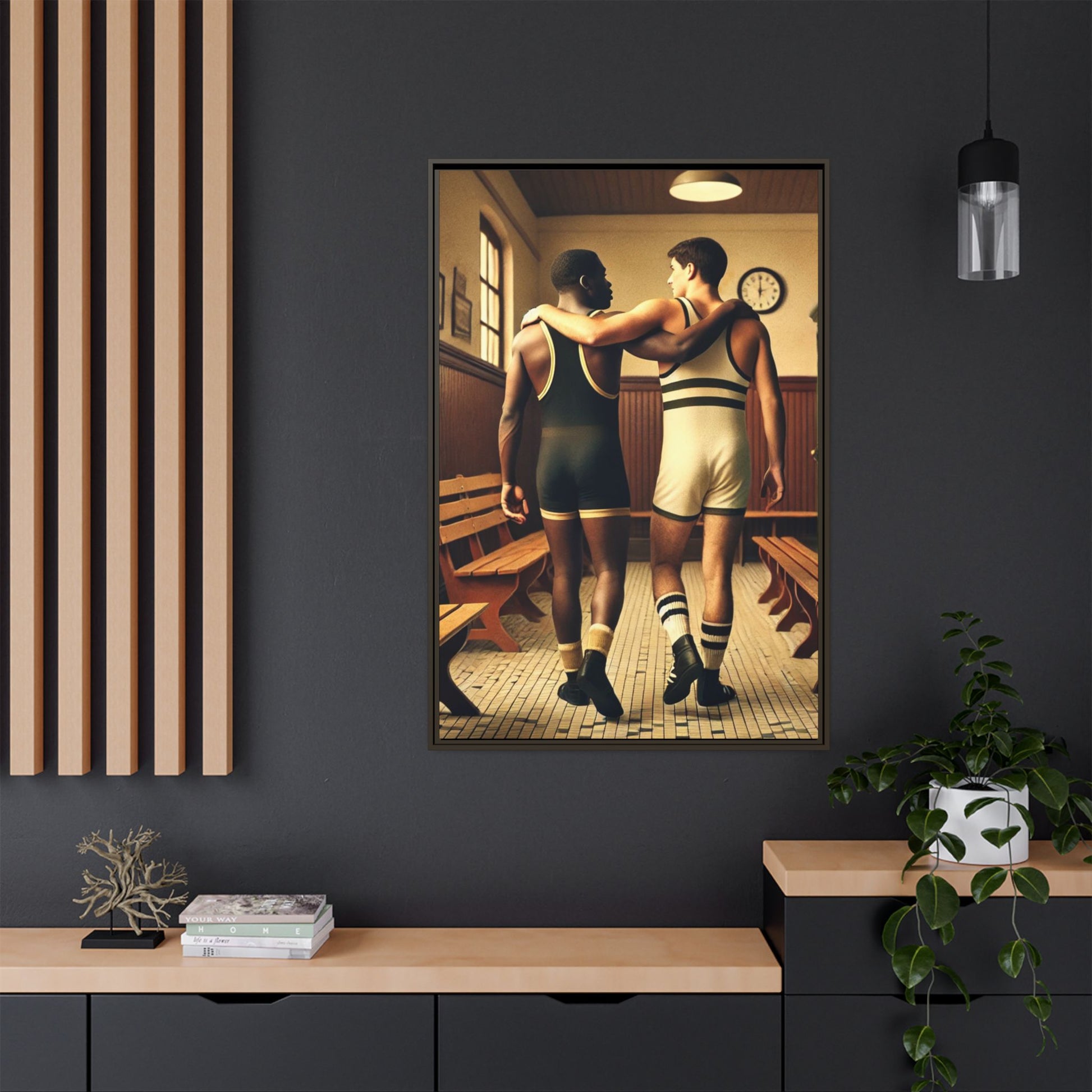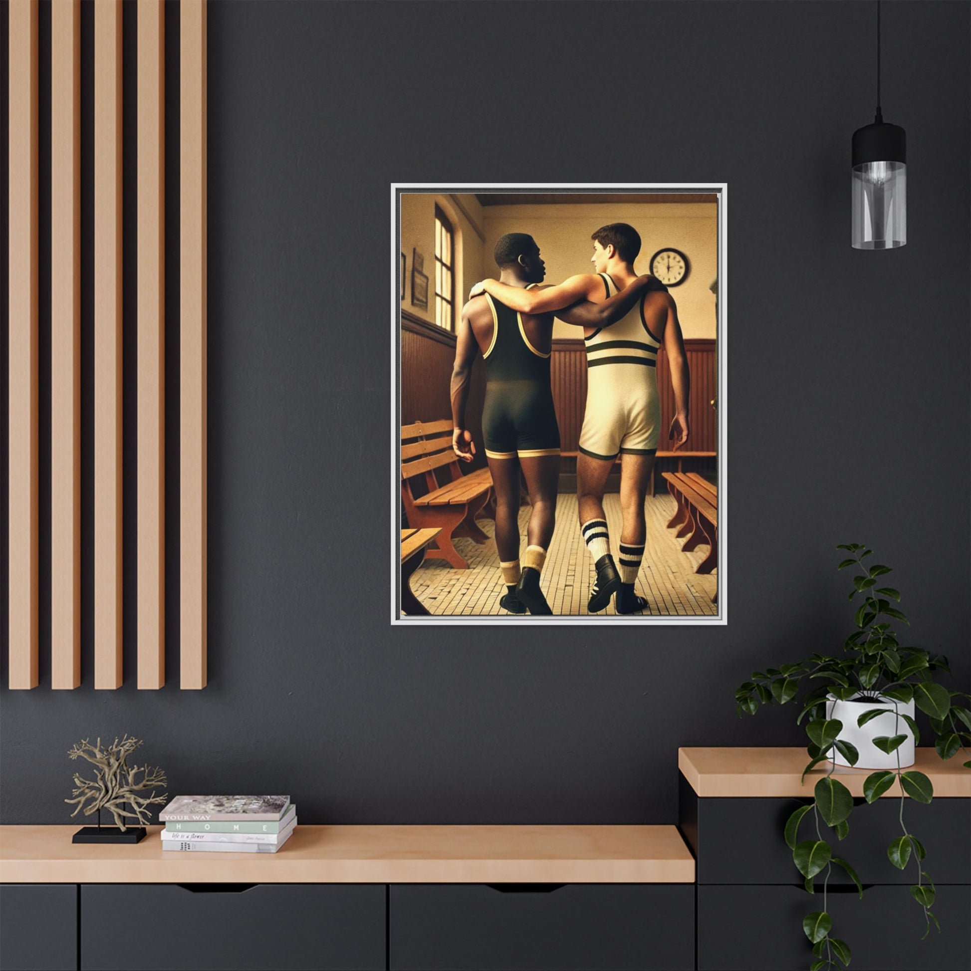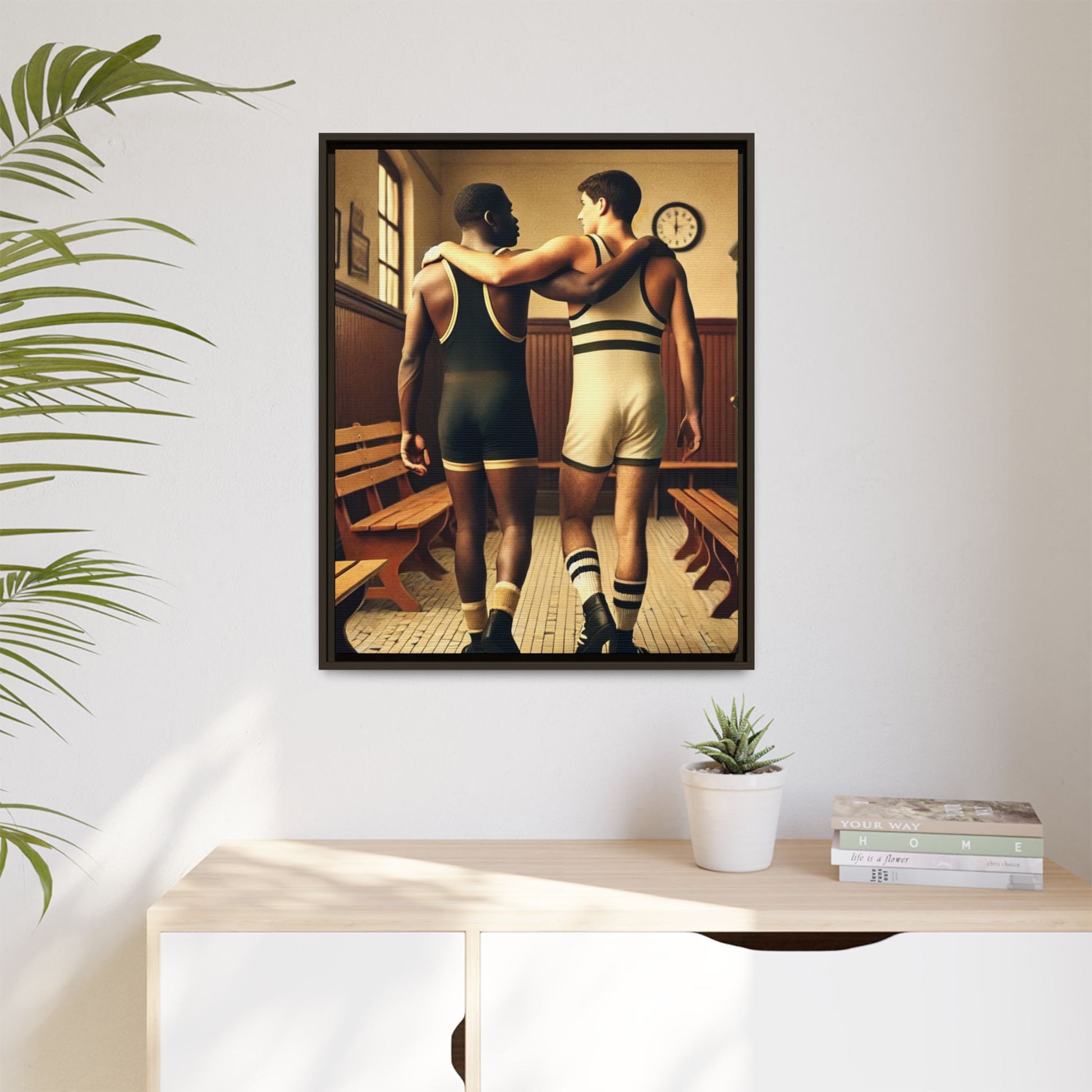 Celebrate diversity and camaraderie with this vintage-style framed artwork featuring an African American and a white wrestler in a classic 1920s locker room. Their supportive bond highlights themes of friendship, unity, and inclusion. With warm tones and intricate details, this piece captures the timeless spirit of diversity and athleticism. Perfect for adding a nostalgic and meaningful touch to your decor or as a thoughtful gift celebrating unity and history.