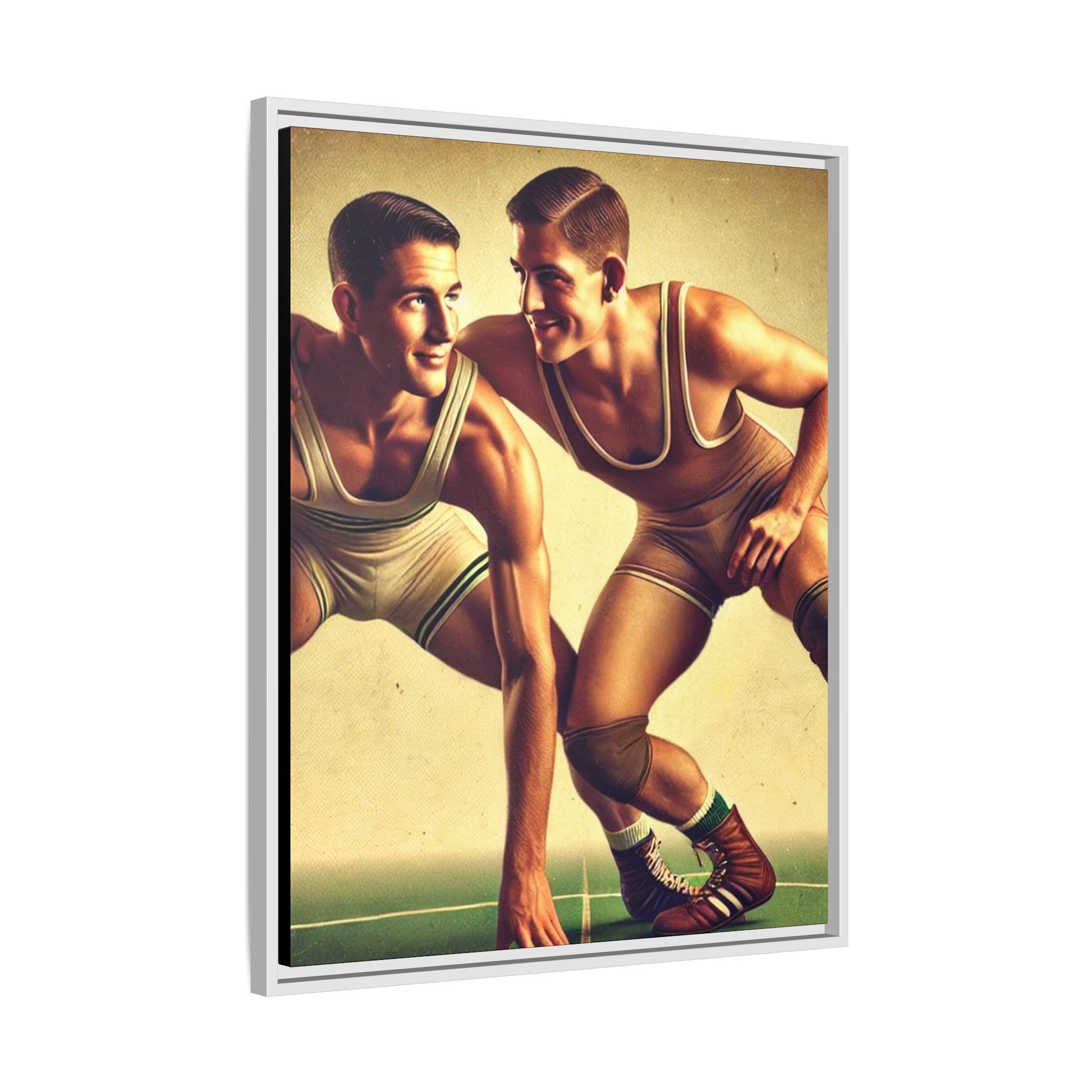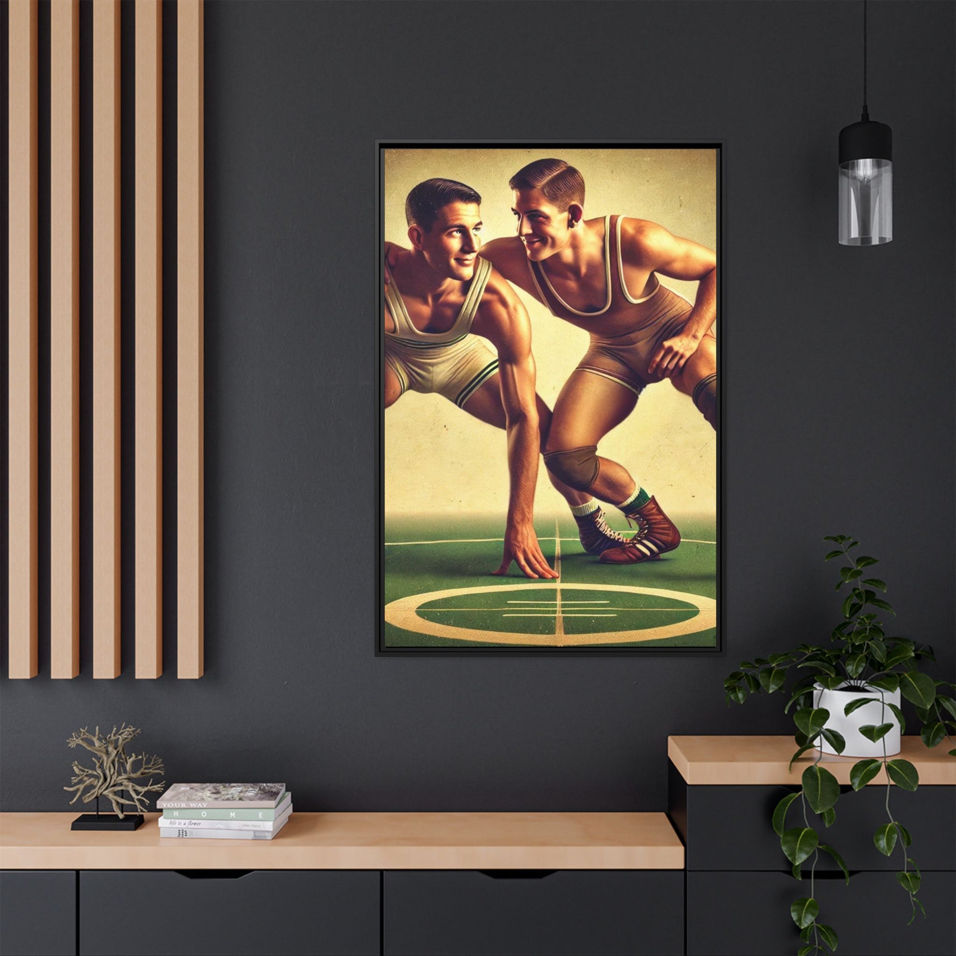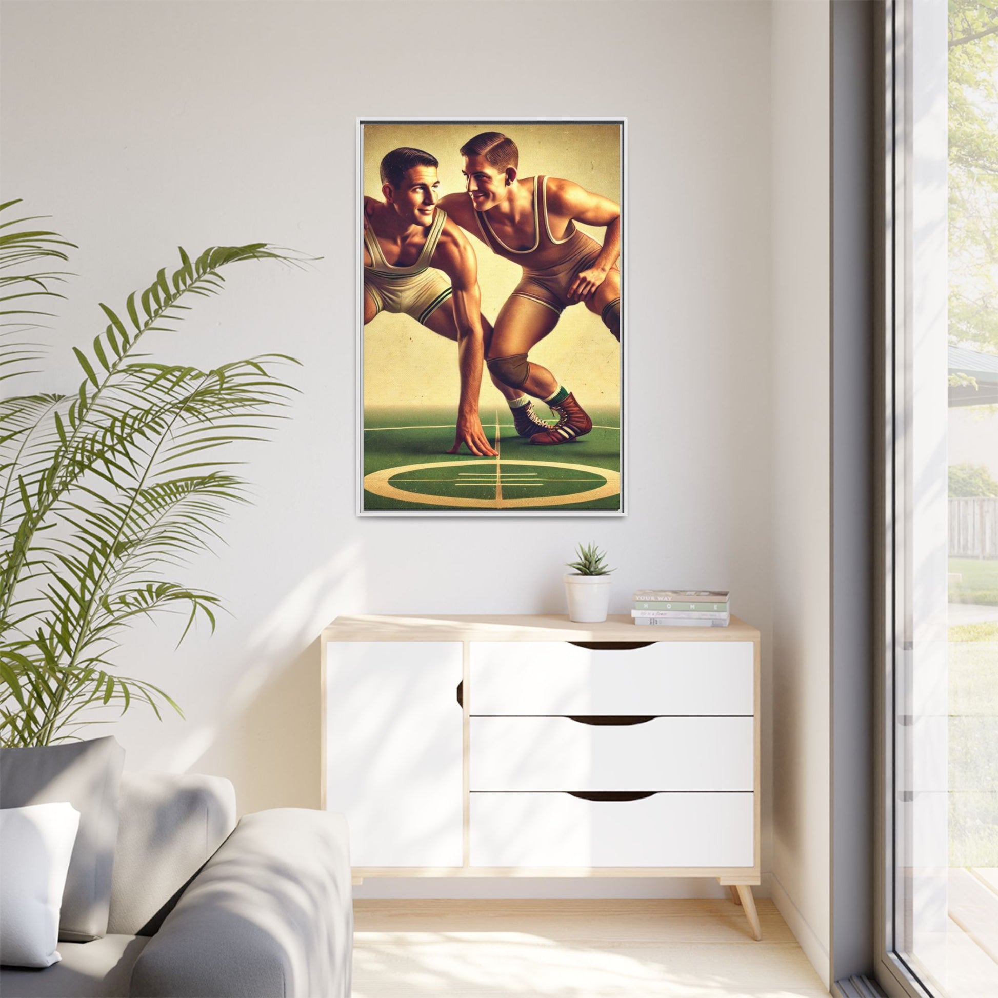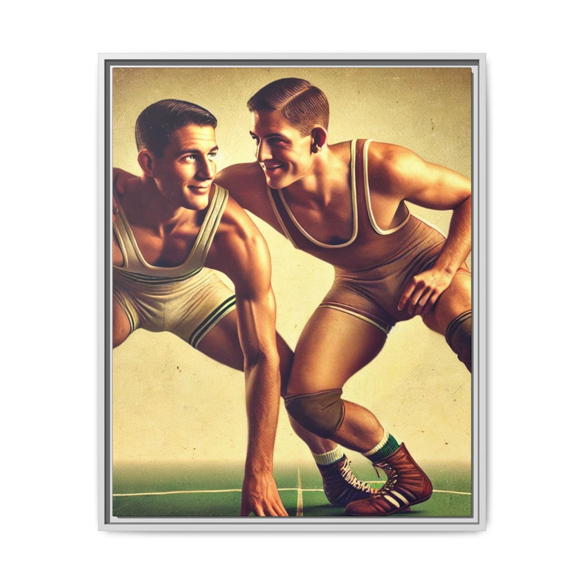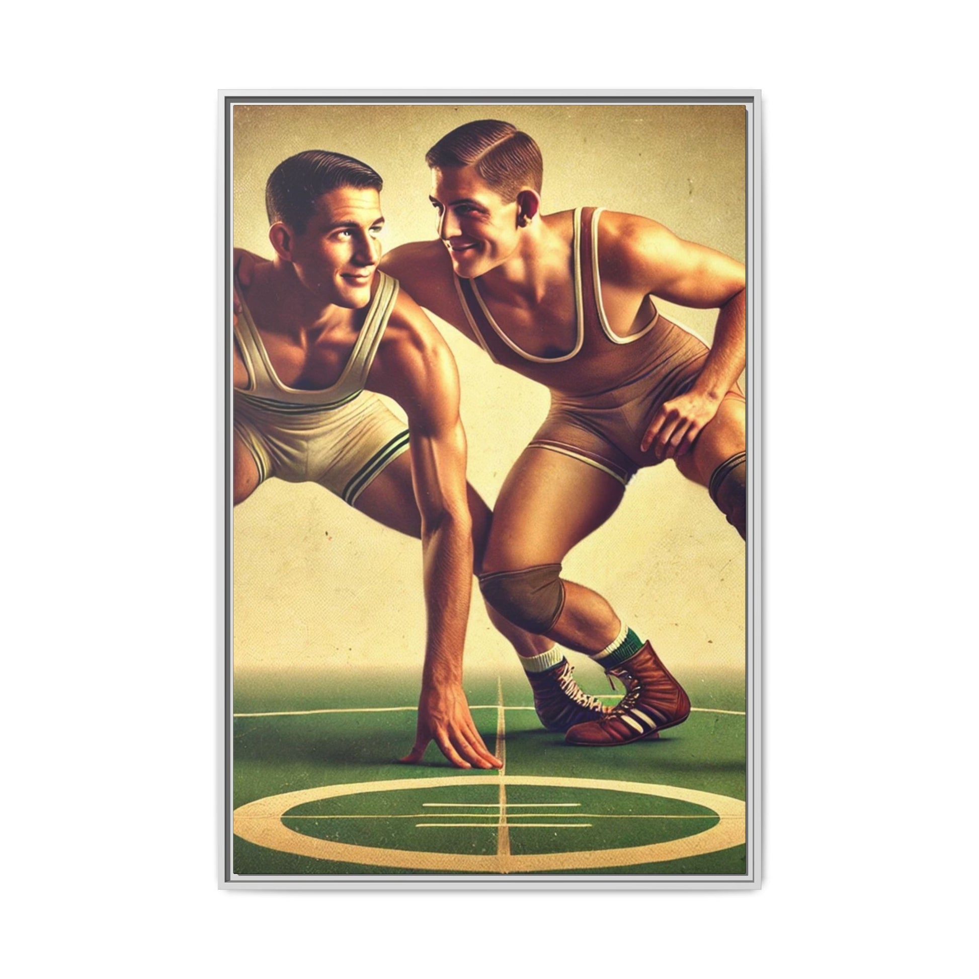 This framed artwork features two young wrestlers crouched in a ready position on a wrestling mat, captured in a moment of camaraderie and focus. They are dressed in classic singlets, one accented with green trim and the other with white, evoking a vintage, mid-20th-century aesthetic. The wrestlers are athletic and confident, with expressions that blend determination and a sense of partnership. The background is simple, drawing attention to the wrestlers and their poised stances.