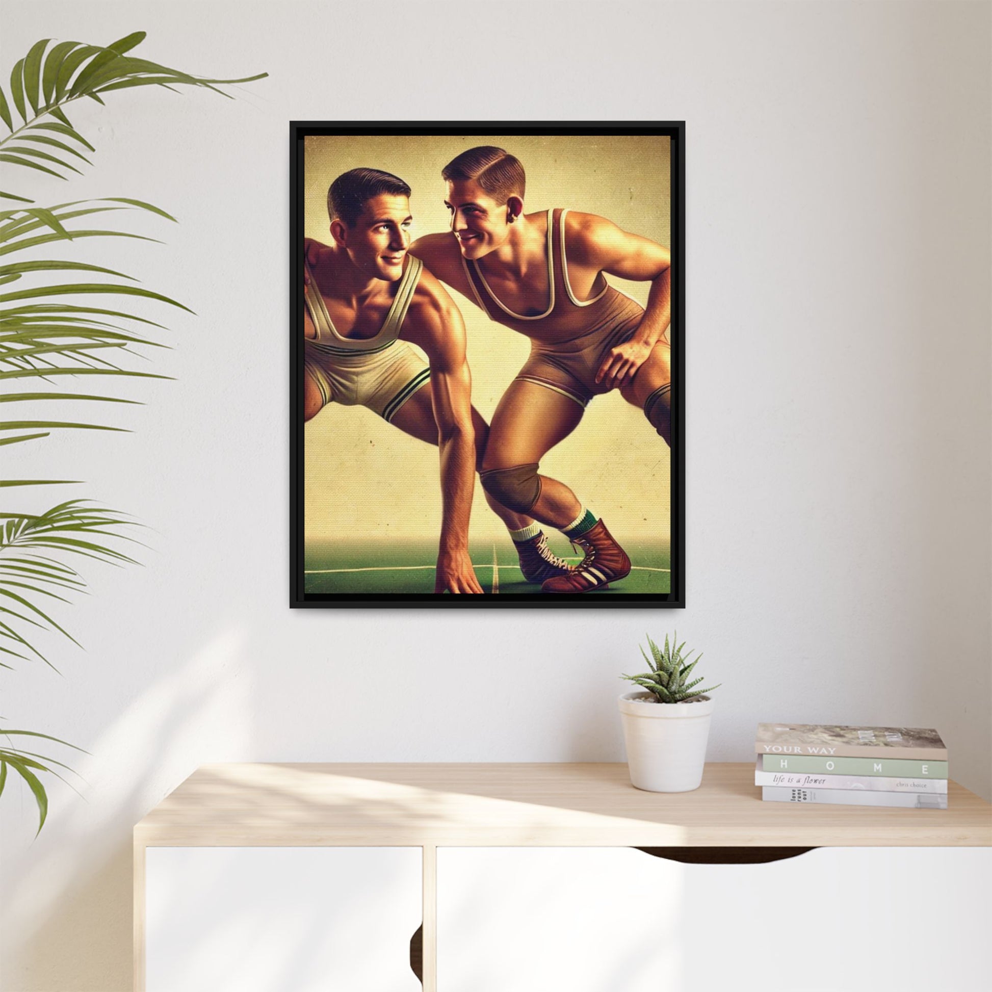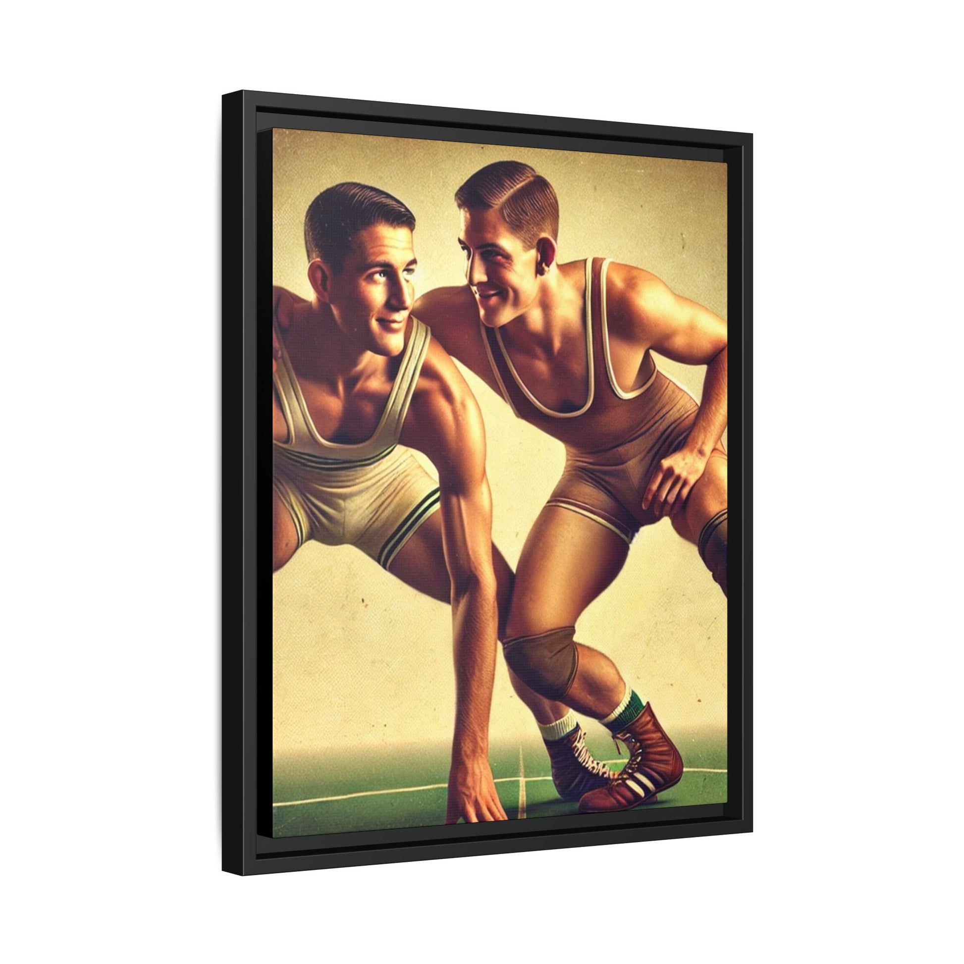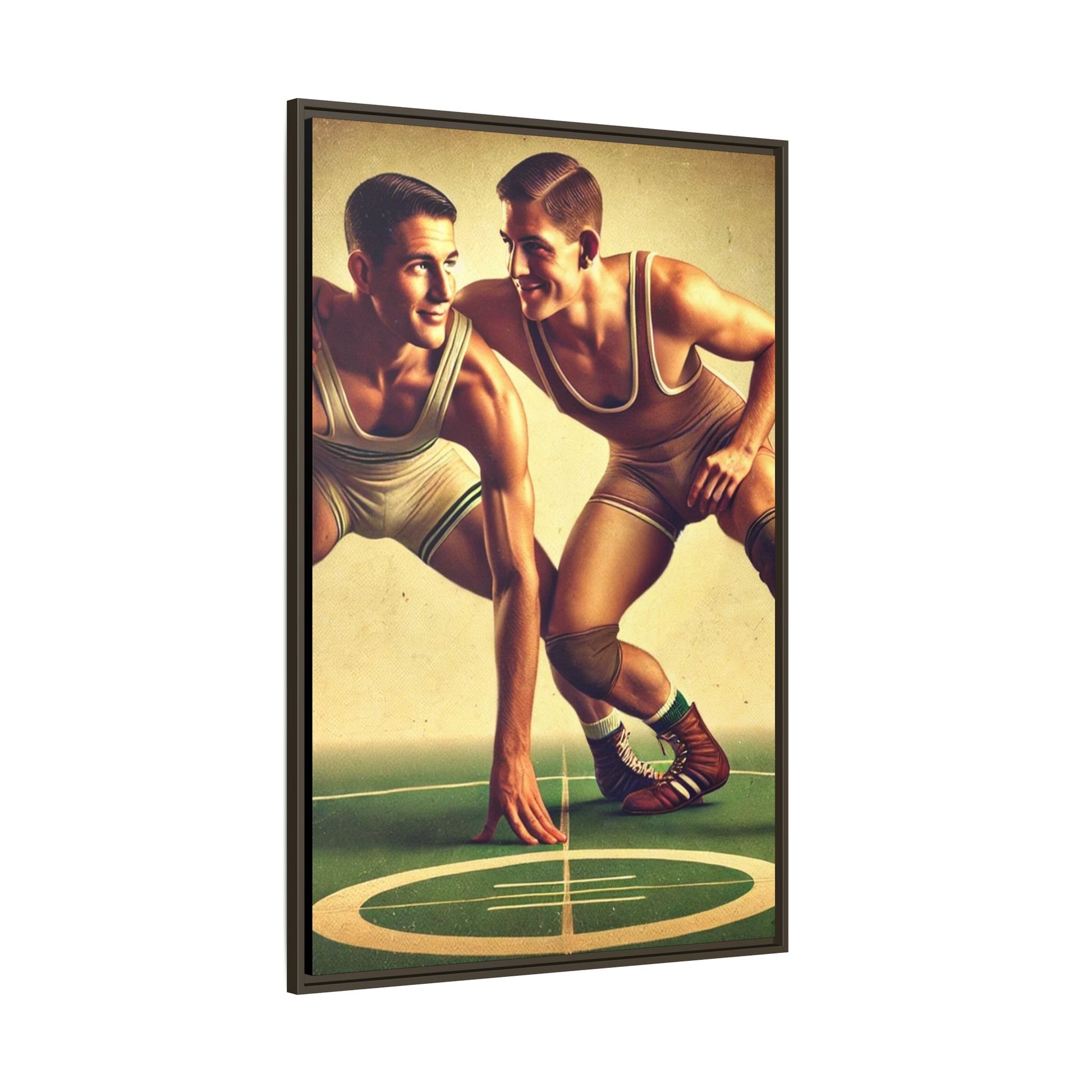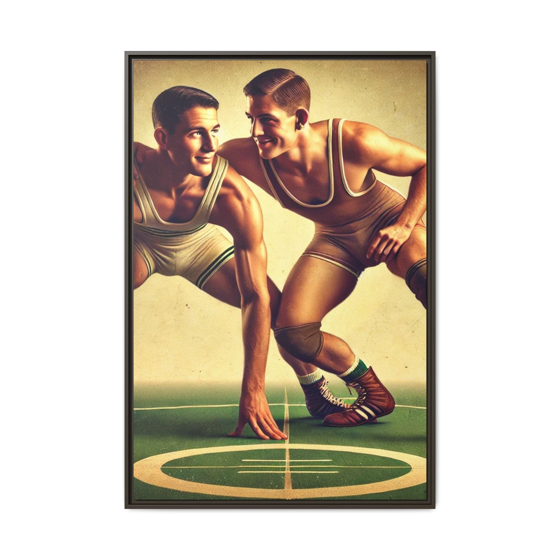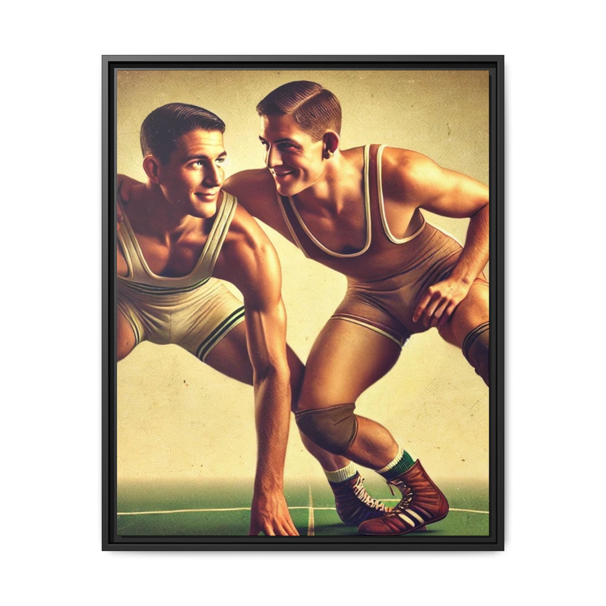 This framed artwork features two young wrestlers crouched in a ready position on a wrestling mat, captured in a moment of camaraderie and focus. They are dressed in classic singlets, one accented with green trim and the other with white, evoking a vintage, mid-20th-century aesthetic. The wrestlers are athletic and confident, with expressions that blend determination and a sense of partnership. The background is simple, drawing attention to the wrestlers and their poised stances.