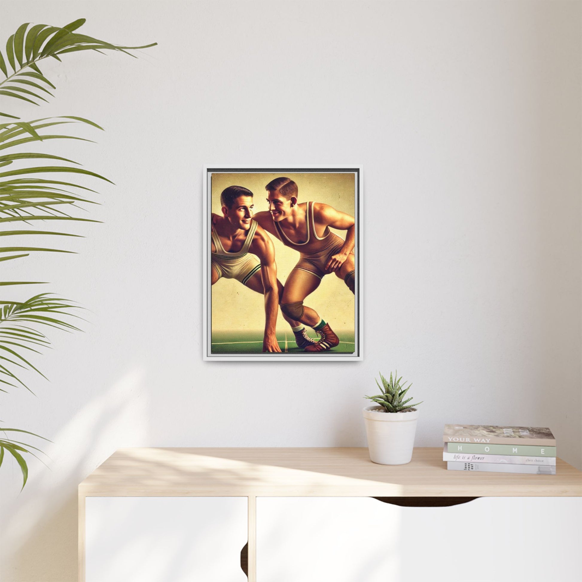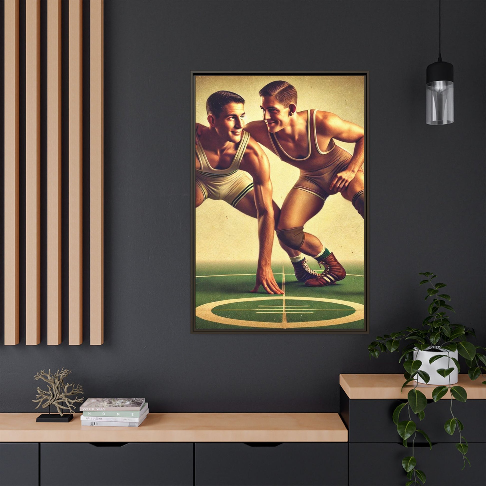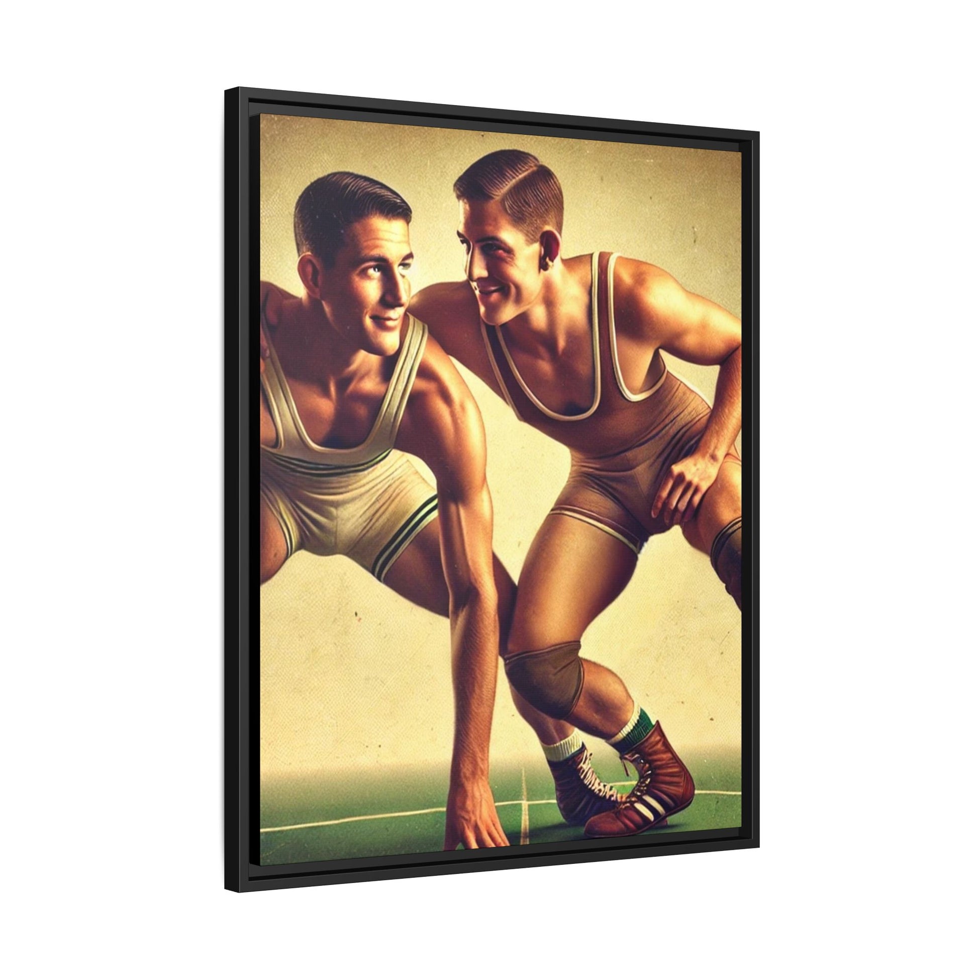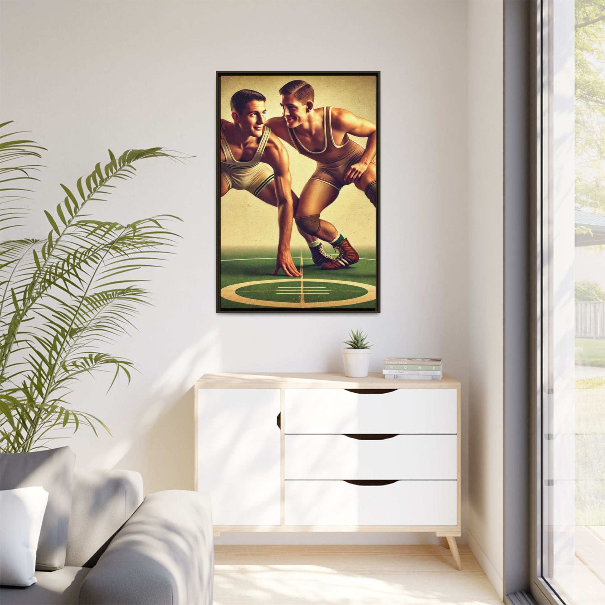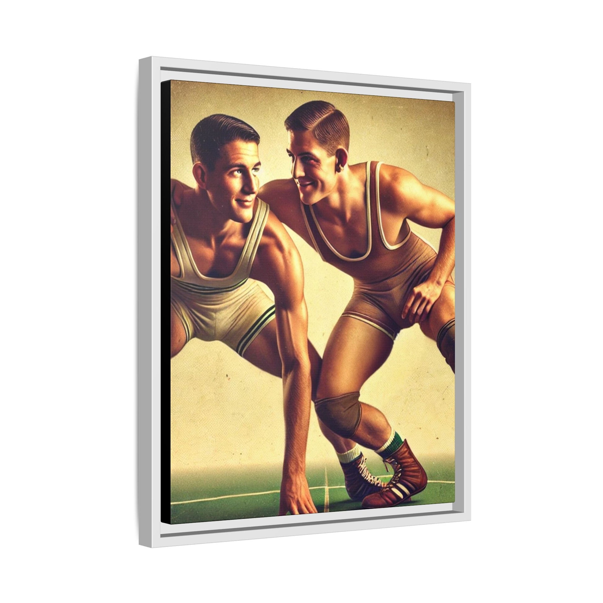 This framed artwork features two young wrestlers crouched in a ready position on a wrestling mat, captured in a moment of camaraderie and focus. They are dressed in classic singlets, one accented with green trim and the other with white, evoking a vintage, mid-20th-century aesthetic. The wrestlers are athletic and confident, with expressions that blend determination and a sense of partnership. The background is simple, drawing attention to the wrestlers and their poised stances.