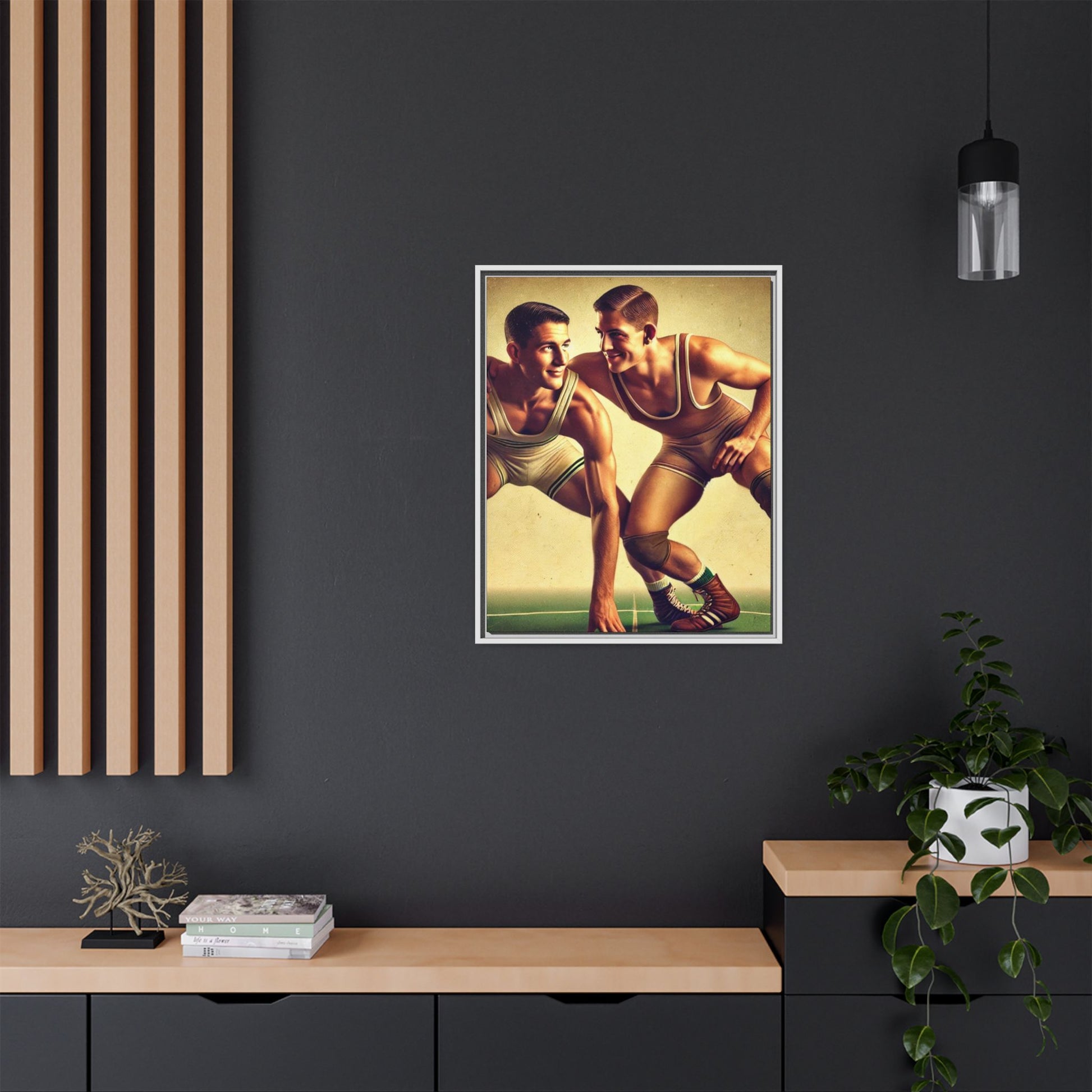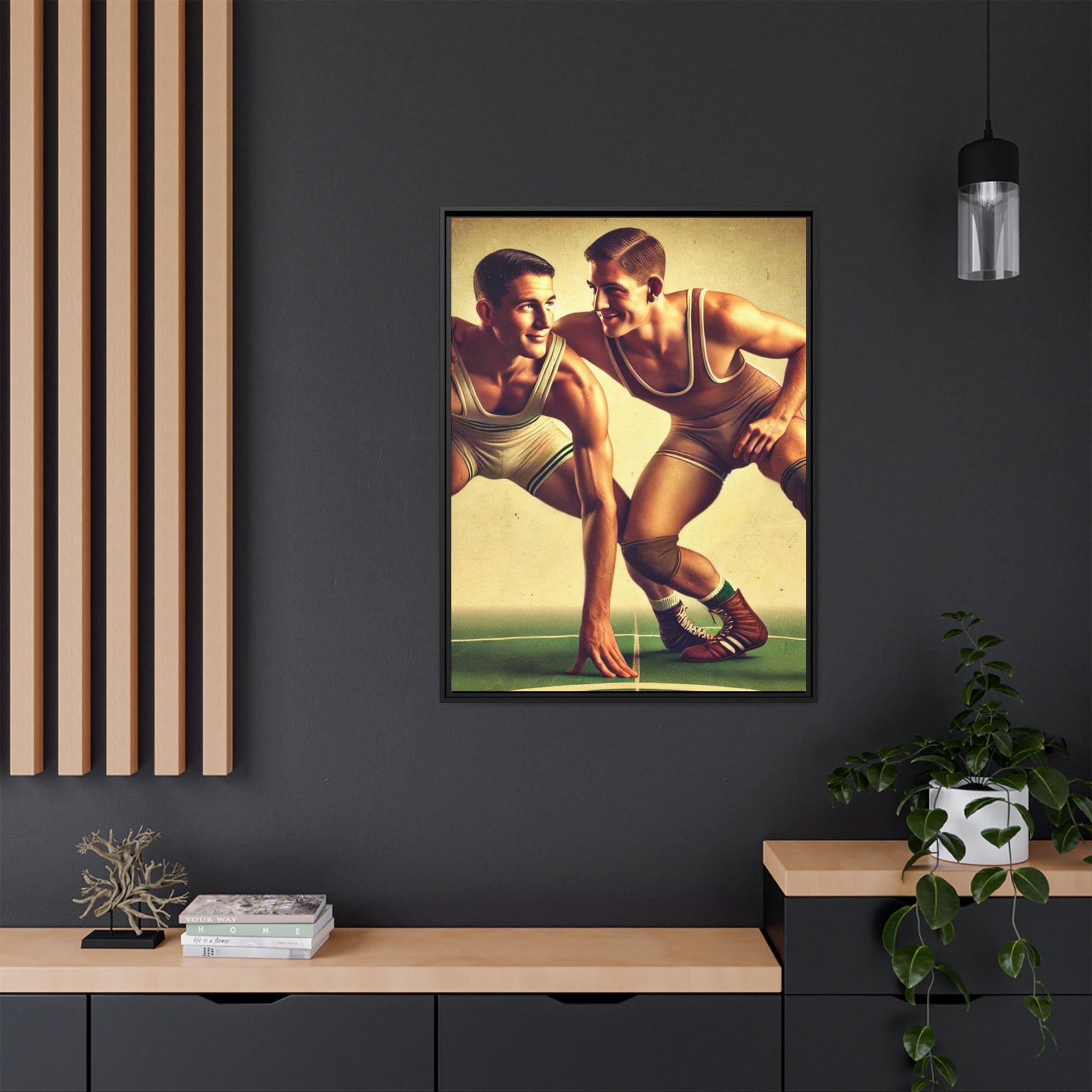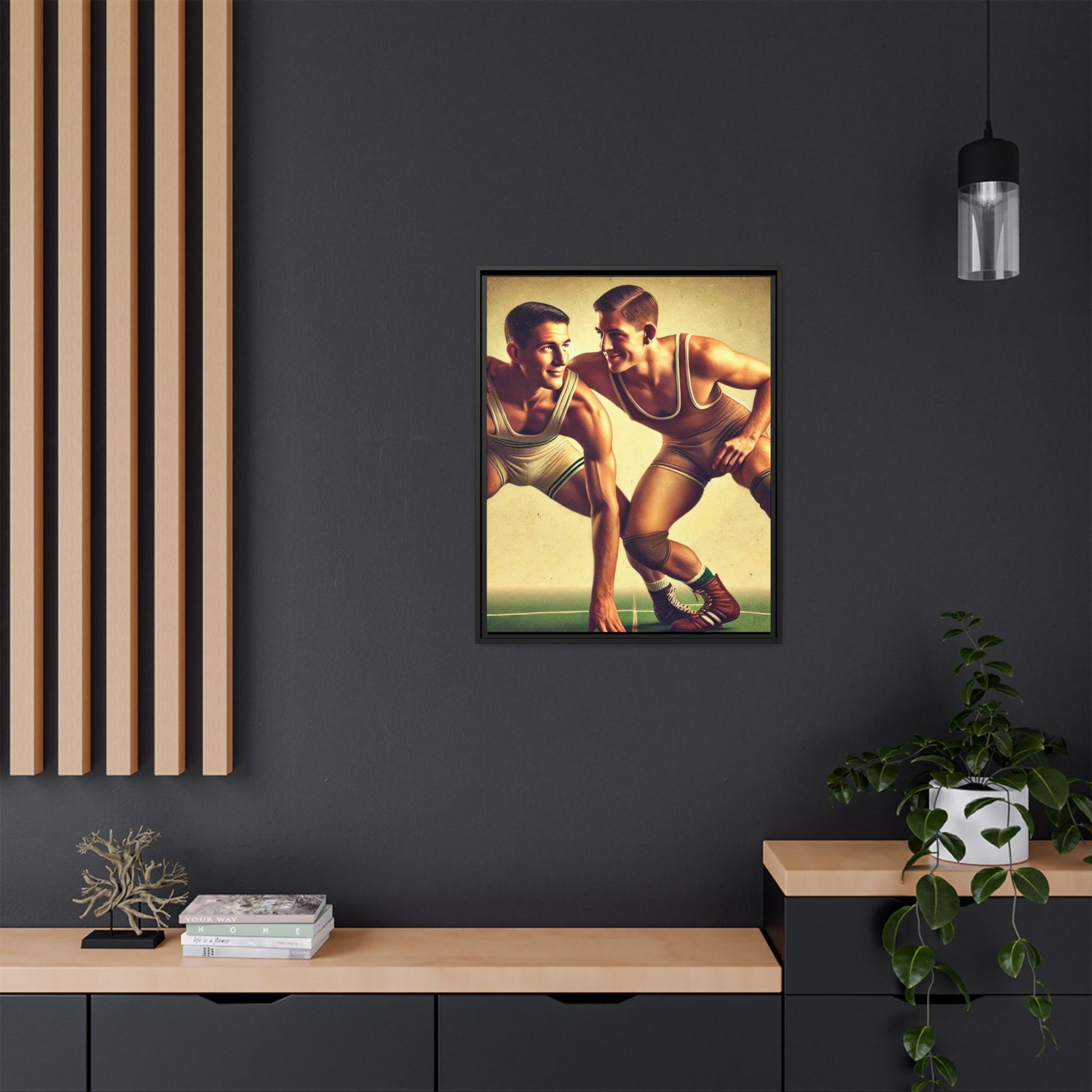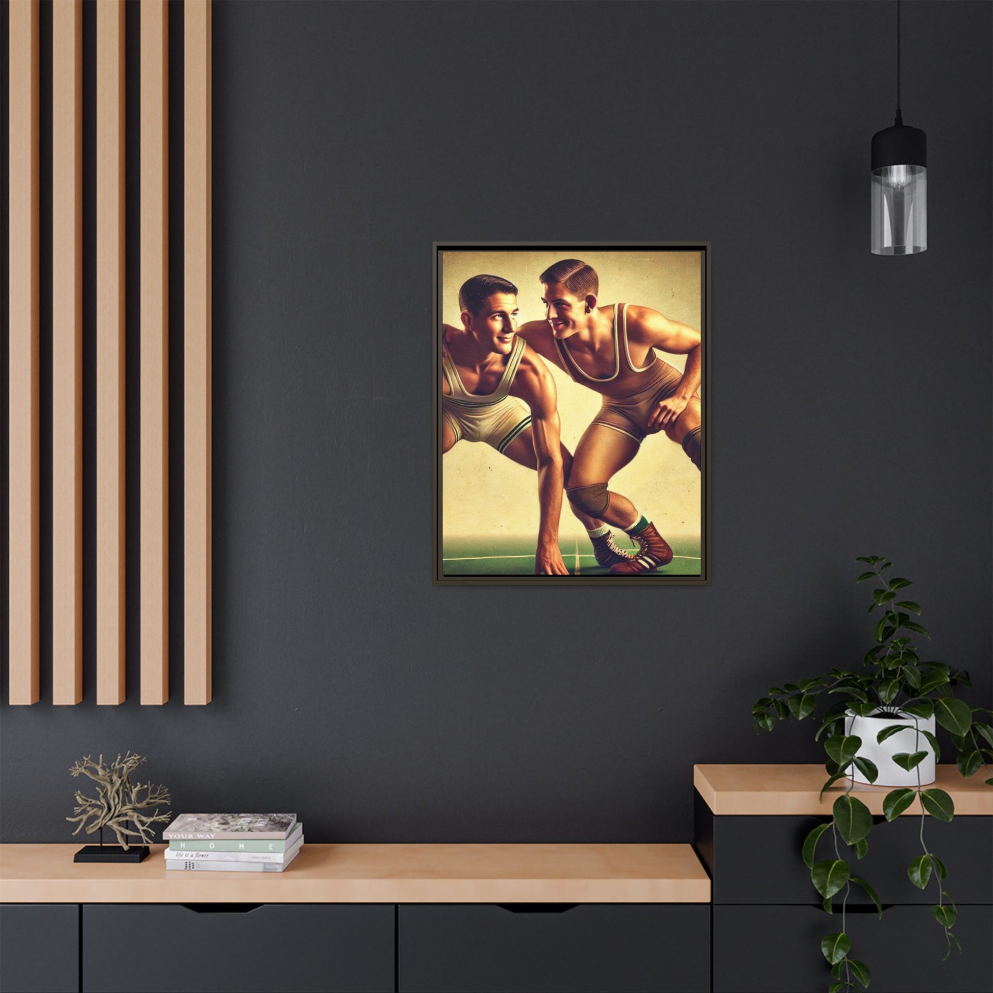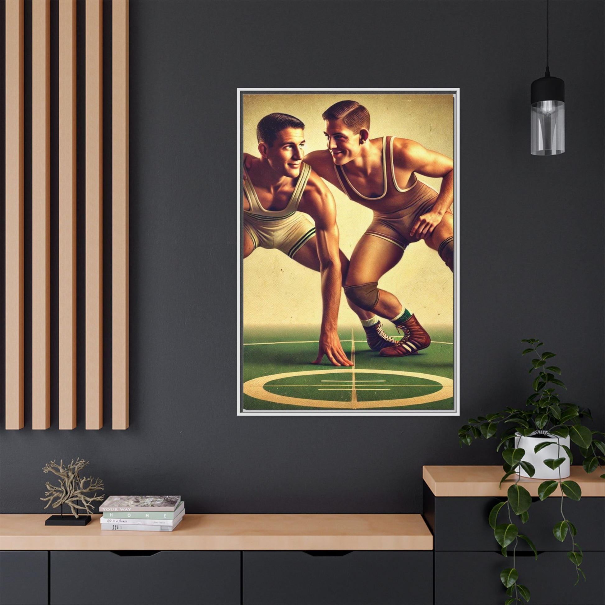 This framed artwork features two young wrestlers crouched in a ready position on a wrestling mat, captured in a moment of camaraderie and focus. They are dressed in classic singlets, one accented with green trim and the other with white, evoking a vintage, mid-20th-century aesthetic. The wrestlers are athletic and confident, with expressions that blend determination and a sense of partnership. The background is simple, drawing attention to the wrestlers and their poised stances.