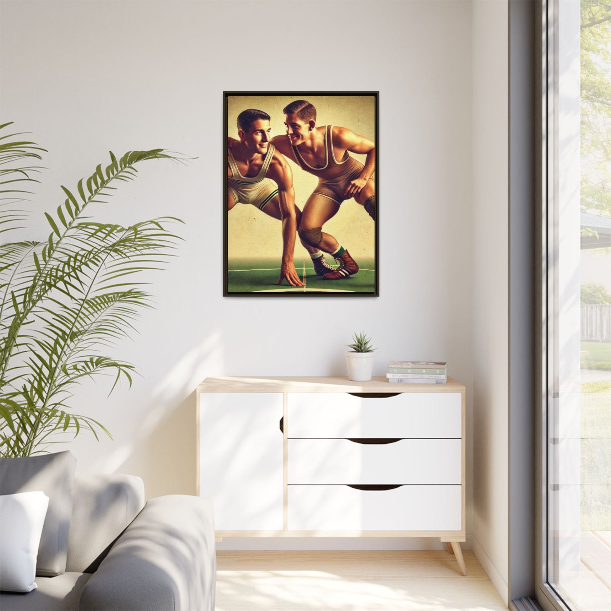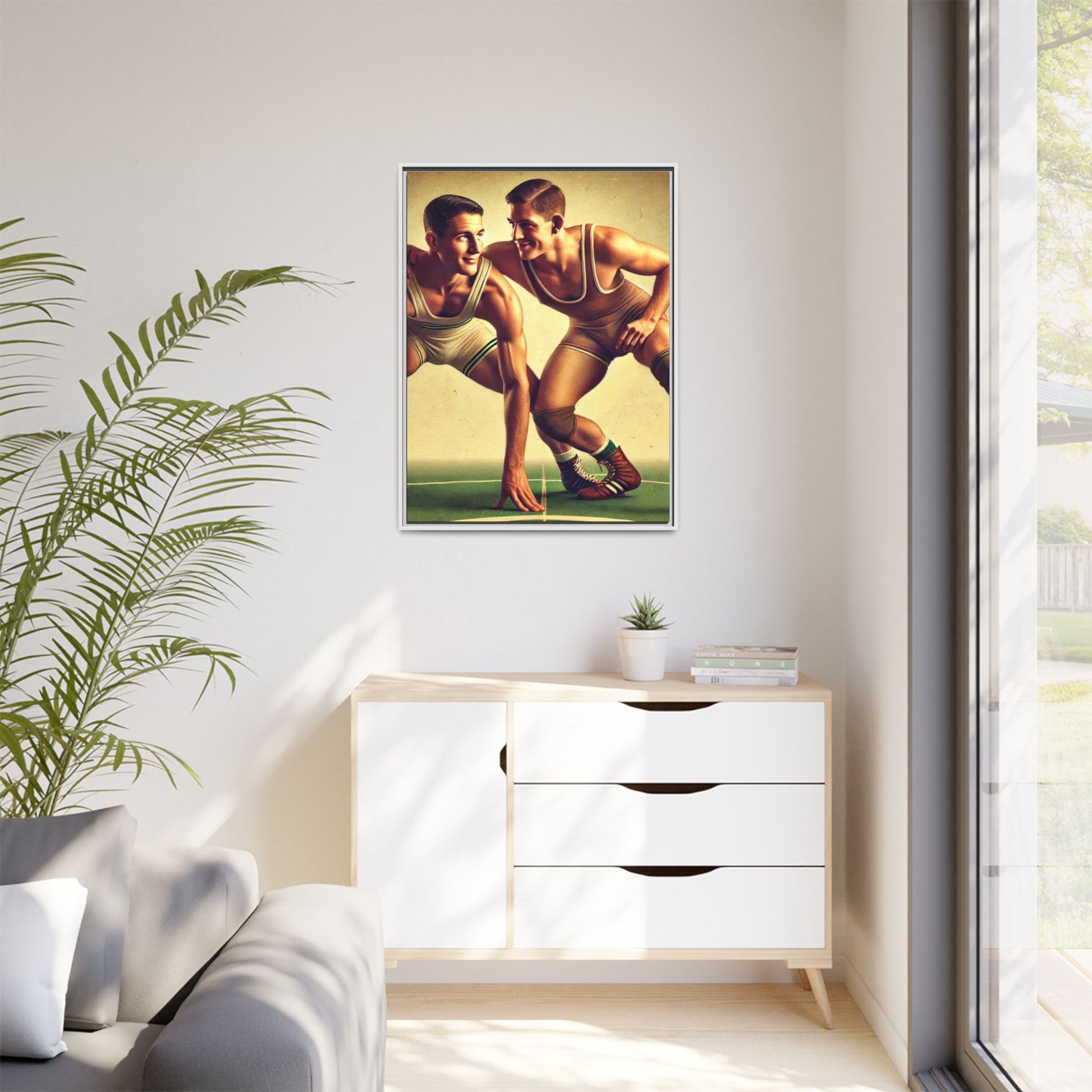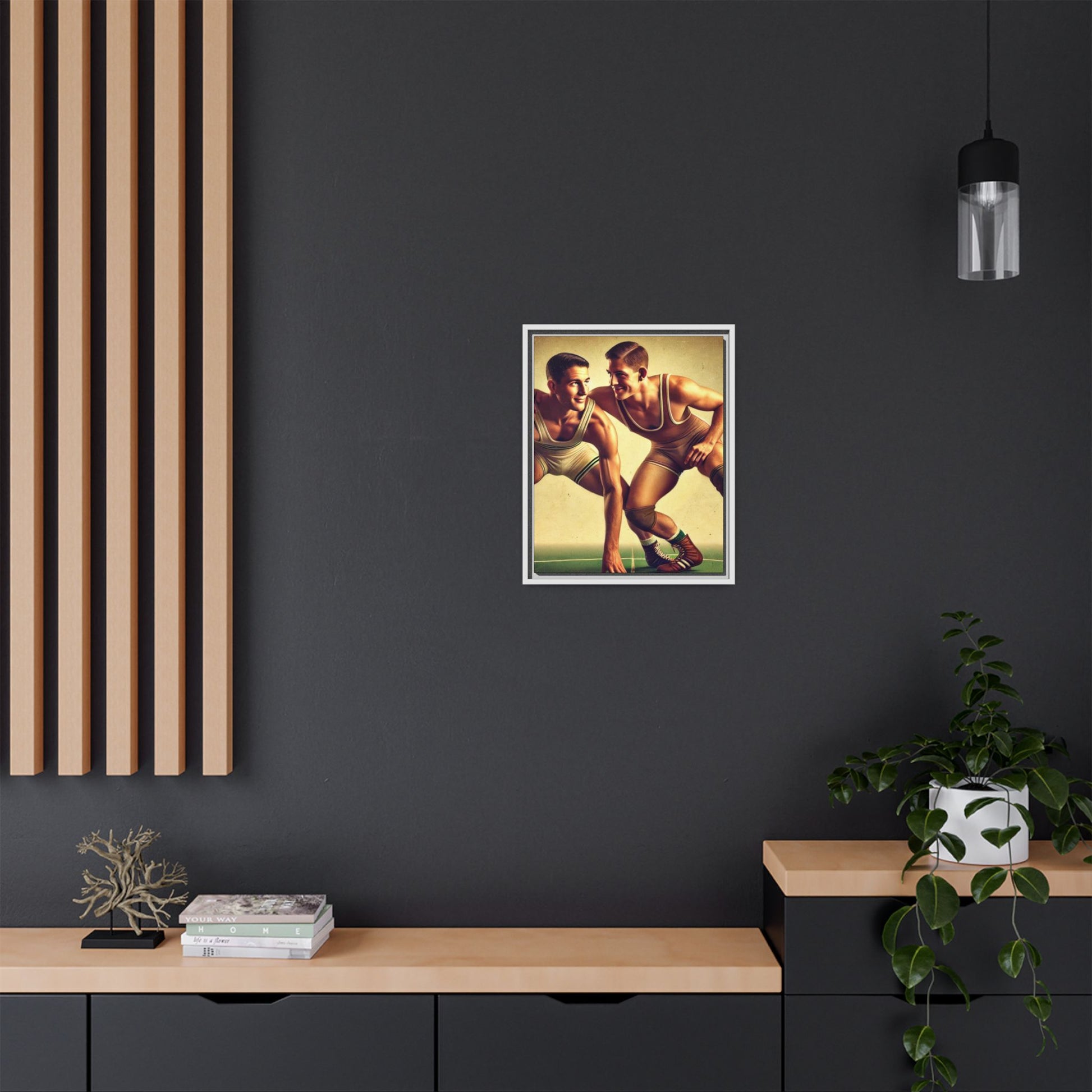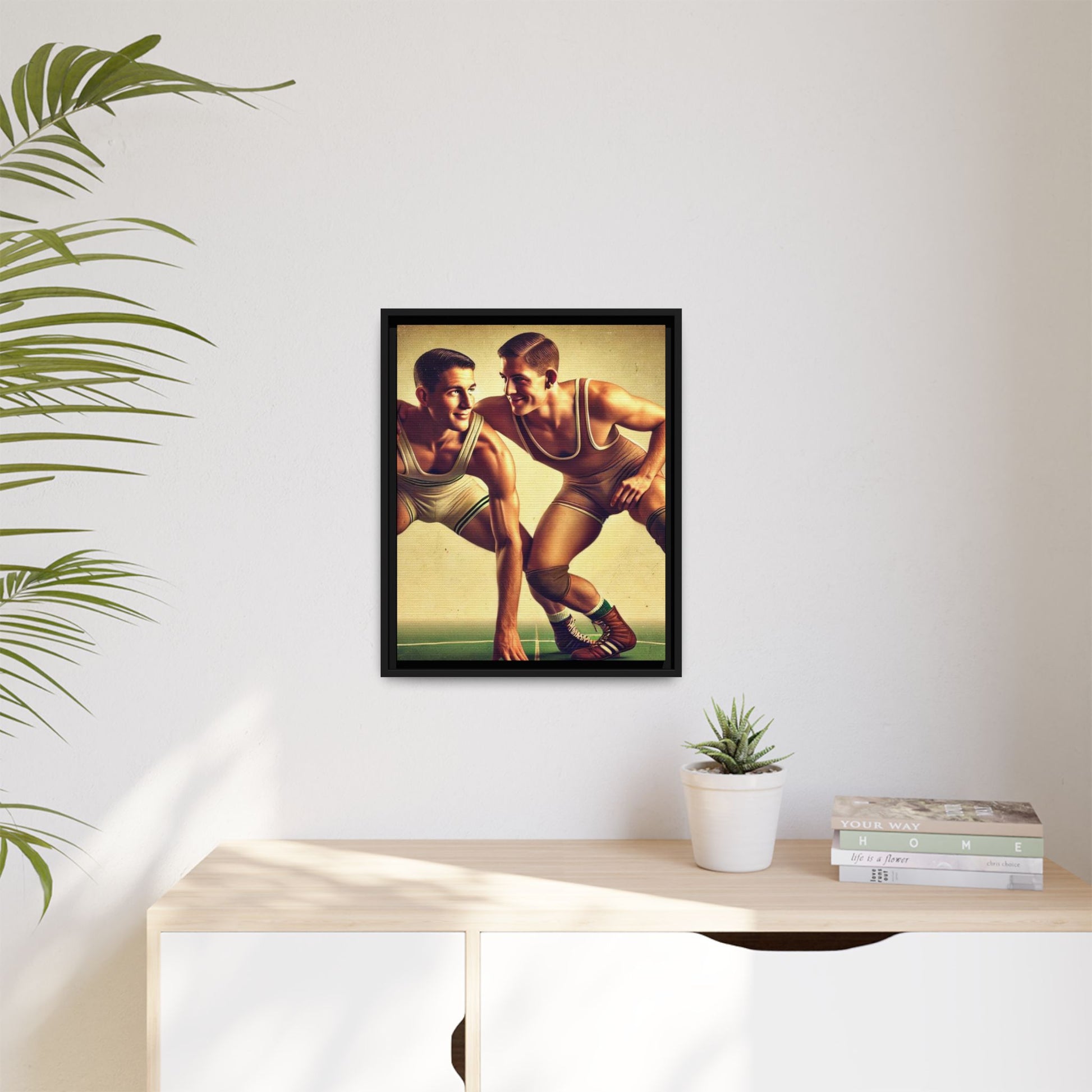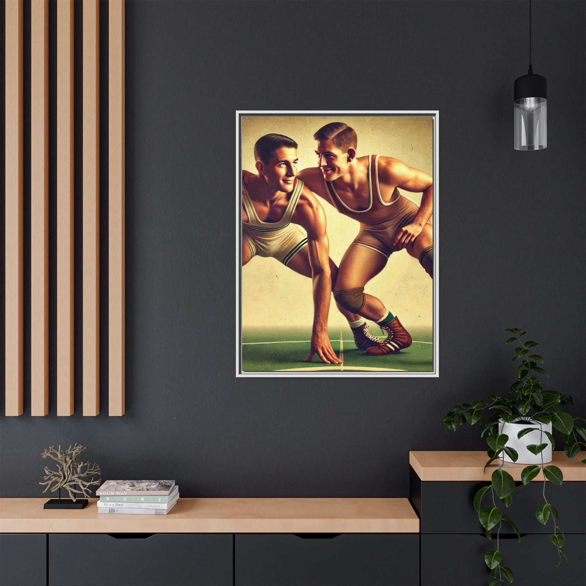 This framed artwork features two young wrestlers crouched in a ready position on a wrestling mat, captured in a moment of camaraderie and focus. They are dressed in classic singlets, one accented with green trim and the other with white, evoking a vintage, mid-20th-century aesthetic. The wrestlers are athletic and confident, with expressions that blend determination and a sense of partnership. The background is simple, drawing attention to the wrestlers and their poised stances.