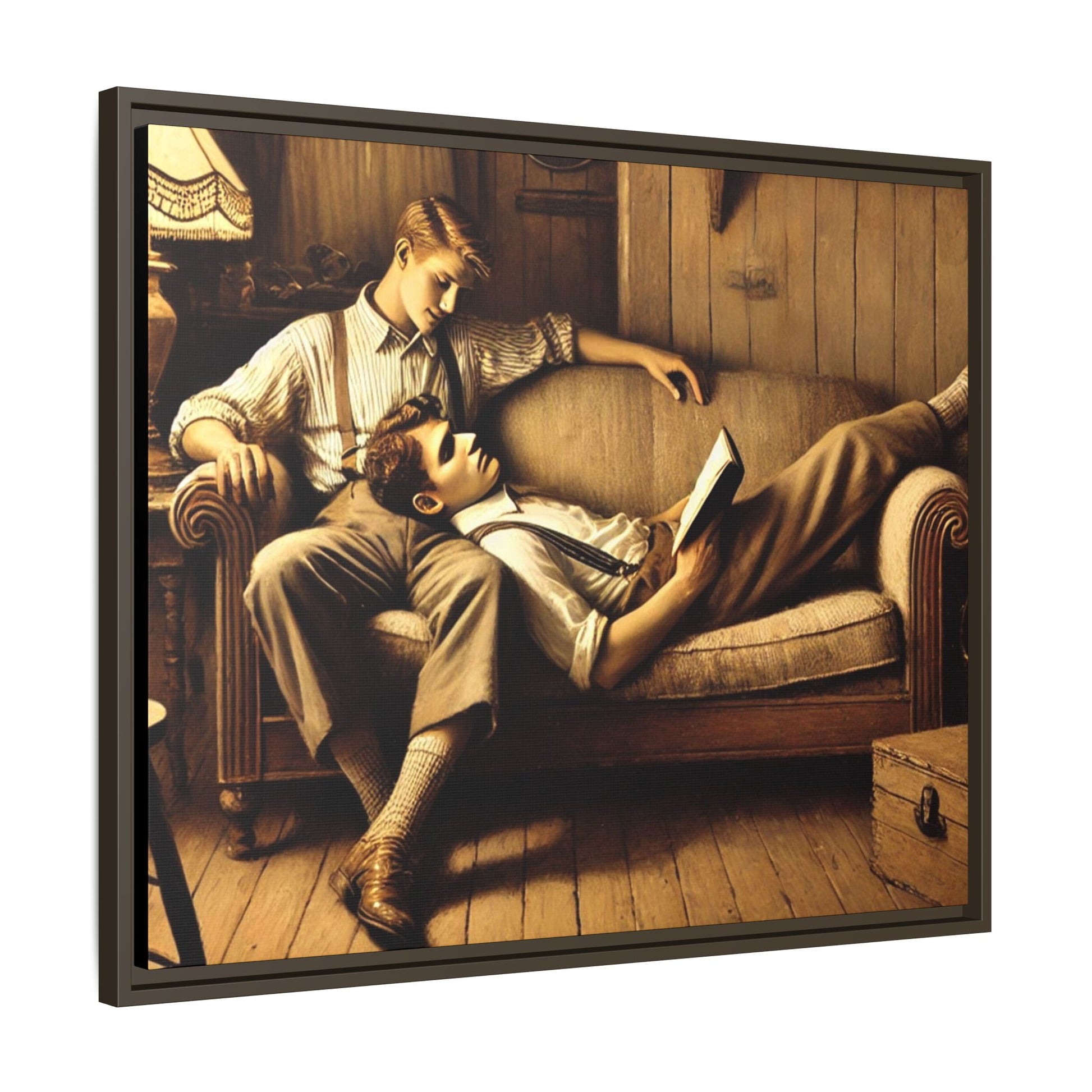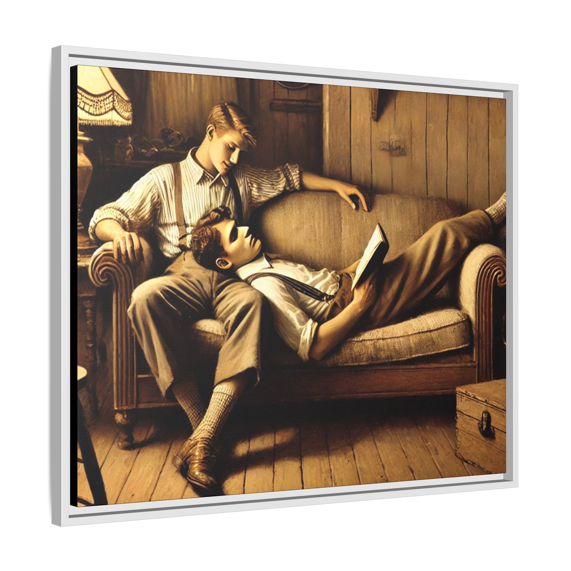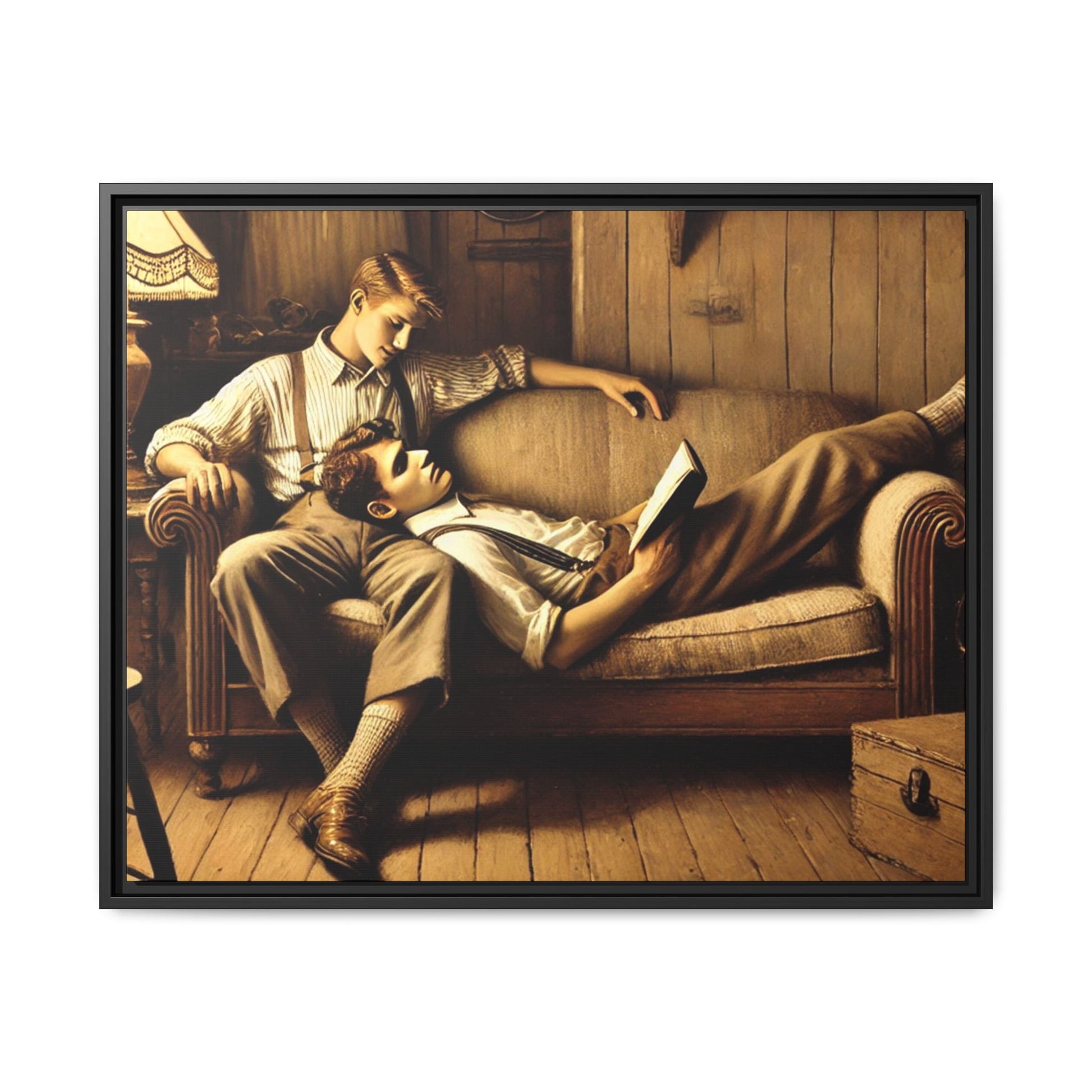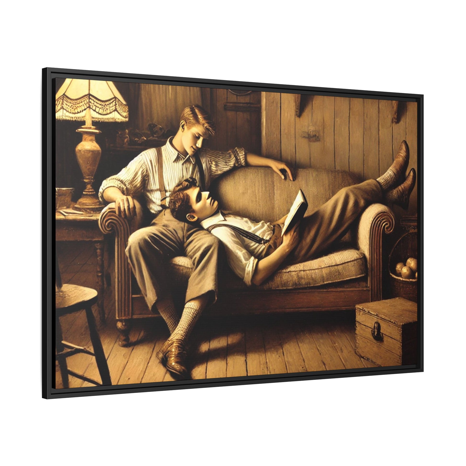 The other man sits upright, his arm draped over the back of the sofa, gazing down at his partner with affection. He wears a striped shirt with rolled-up sleeves, suspenders, and similar vintage-style trousers. His posture and expression radiate care and a quiet intimacy, highlighting the emotional connection between the two.