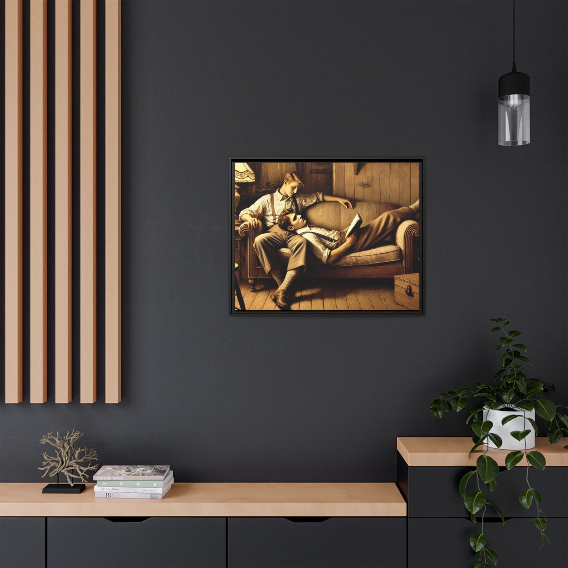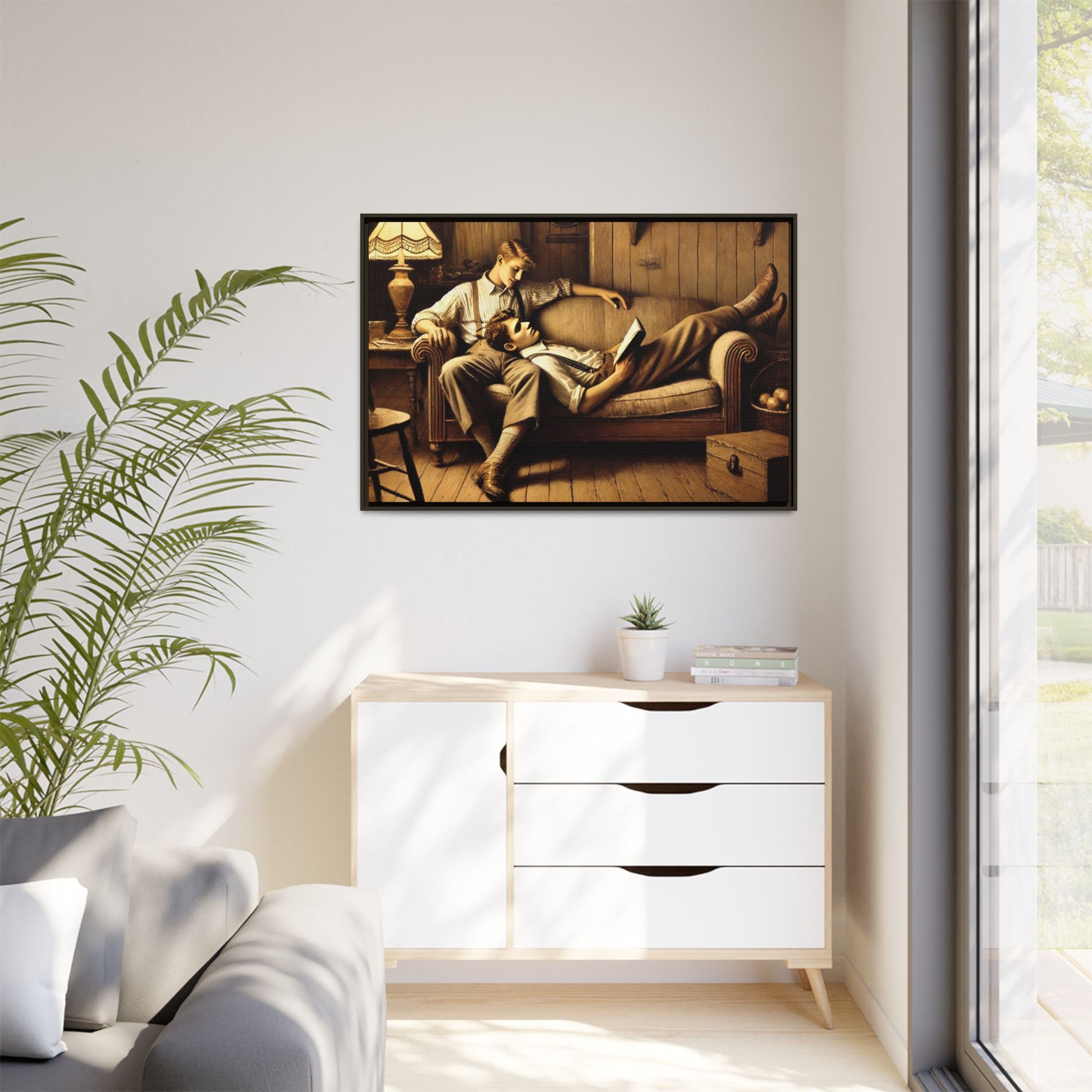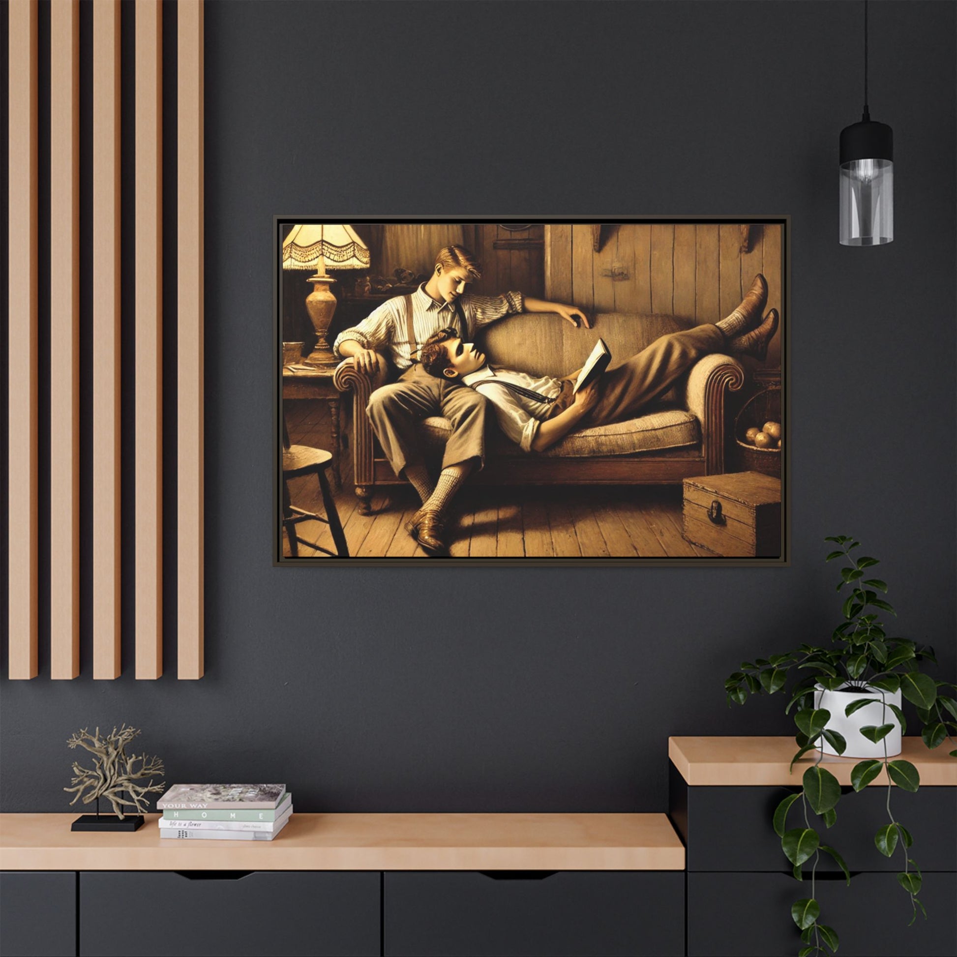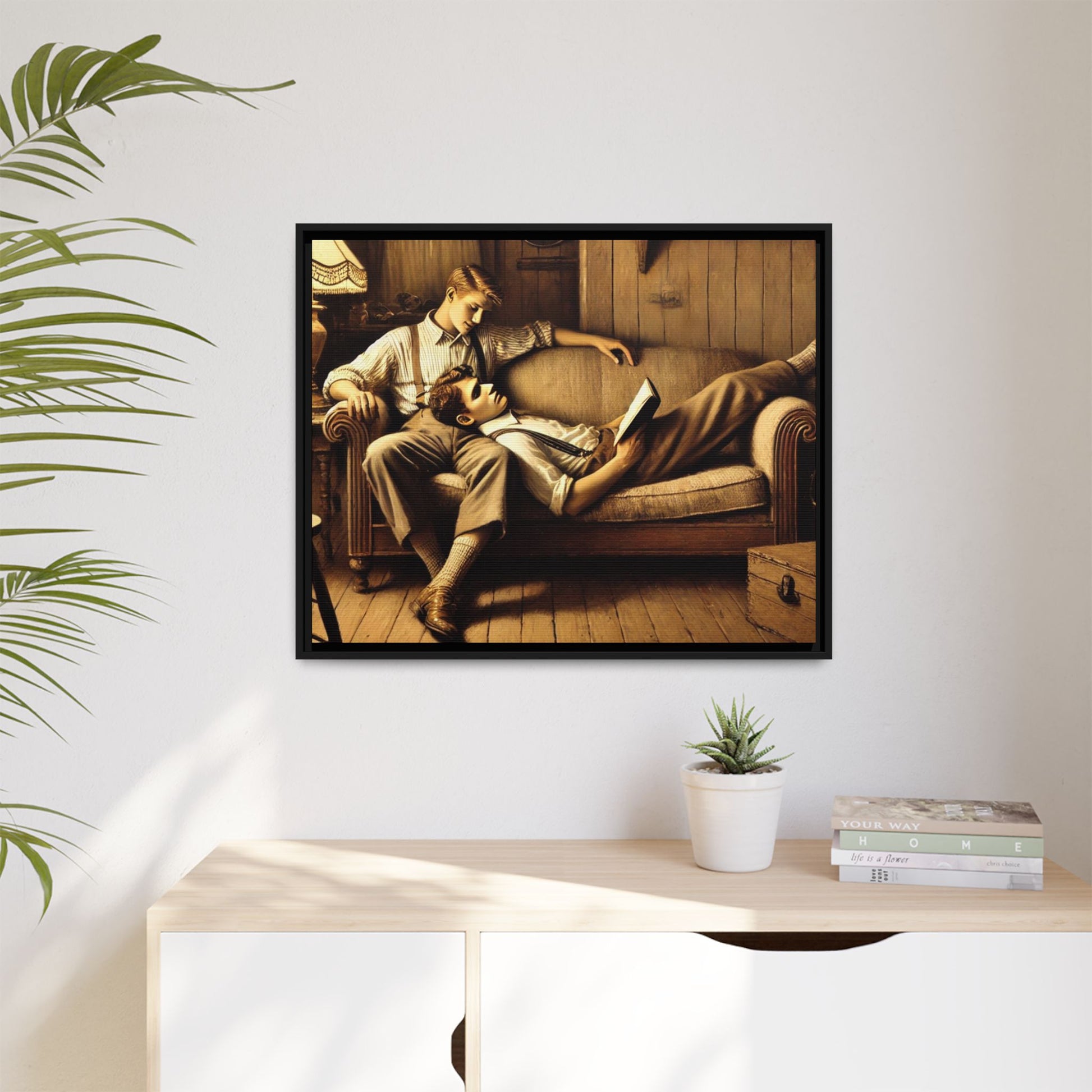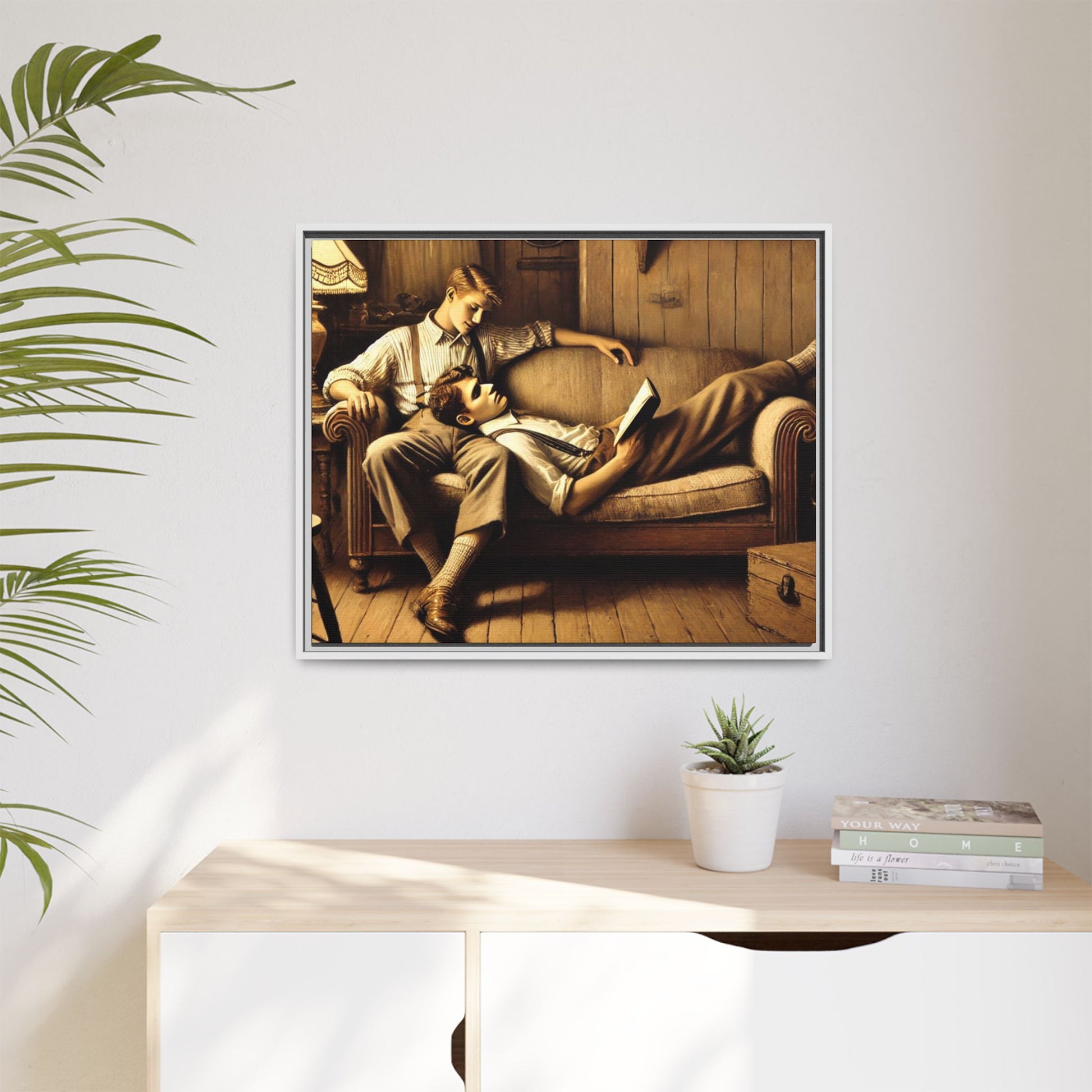 The other man sits upright, his arm draped over the back of the sofa, gazing down at his partner with affection. He wears a striped shirt with rolled-up sleeves, suspenders, and similar vintage-style trousers. His posture and expression radiate care and a quiet intimacy, highlighting the emotional connection between the two.