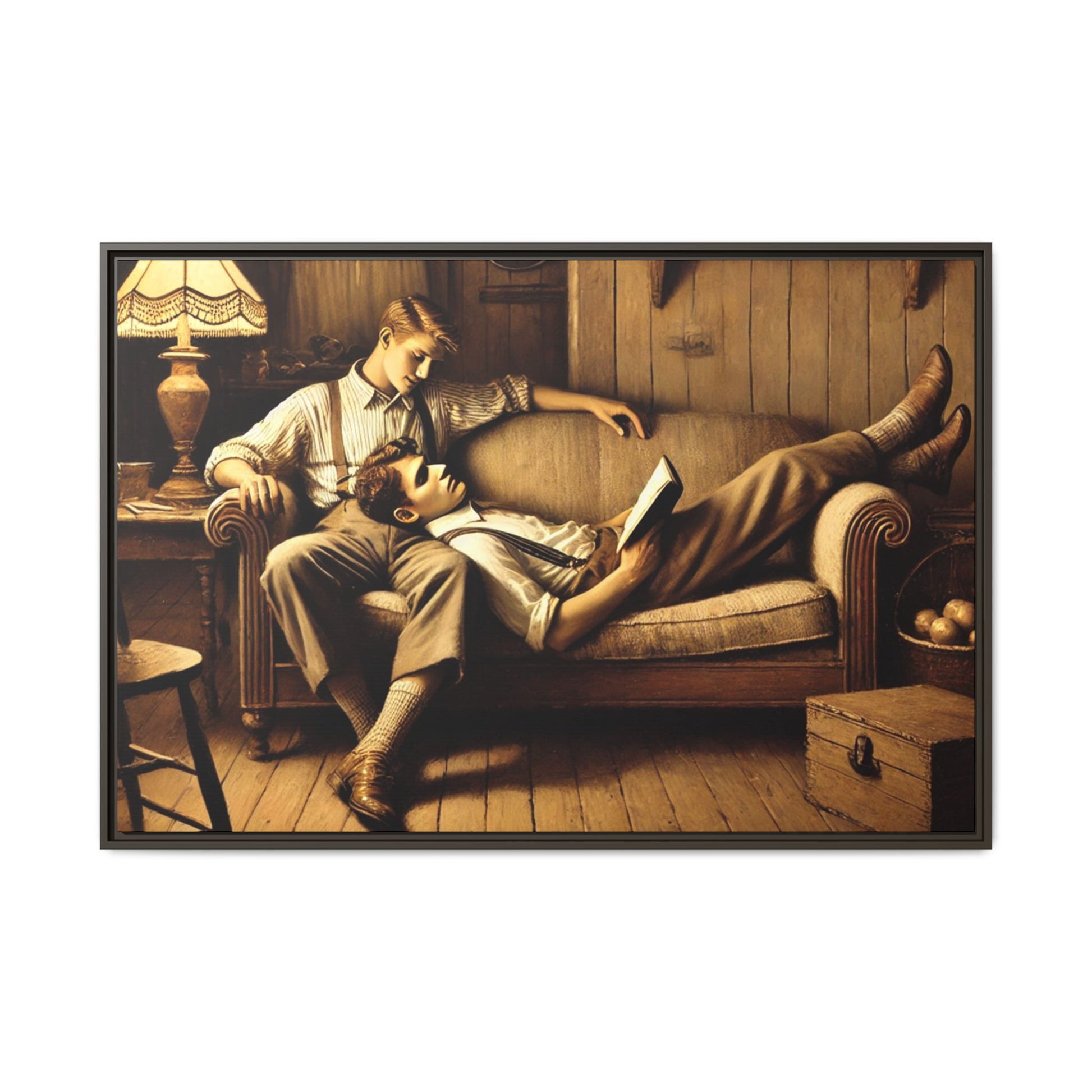 The image showcases a gay couple sharing a peaceful and intimate moment on a cozy sofa after a long day, with a warm and rustic ambiance that pays tribute to Grant Wood's Americana style. The setting and lighting emphasize a timeless, serene rural life while celebrating love and connection.