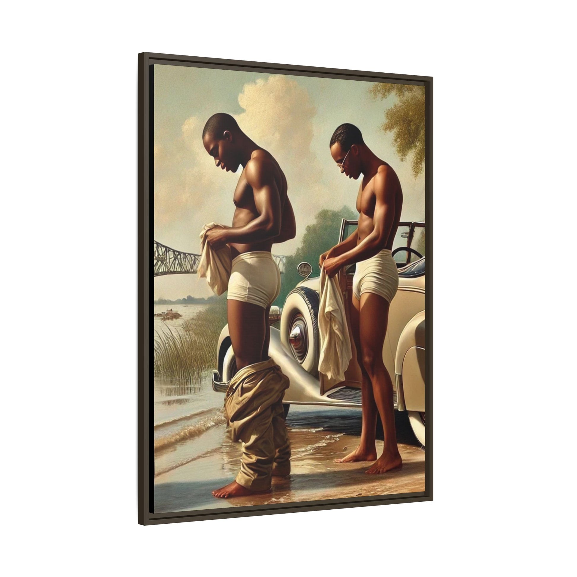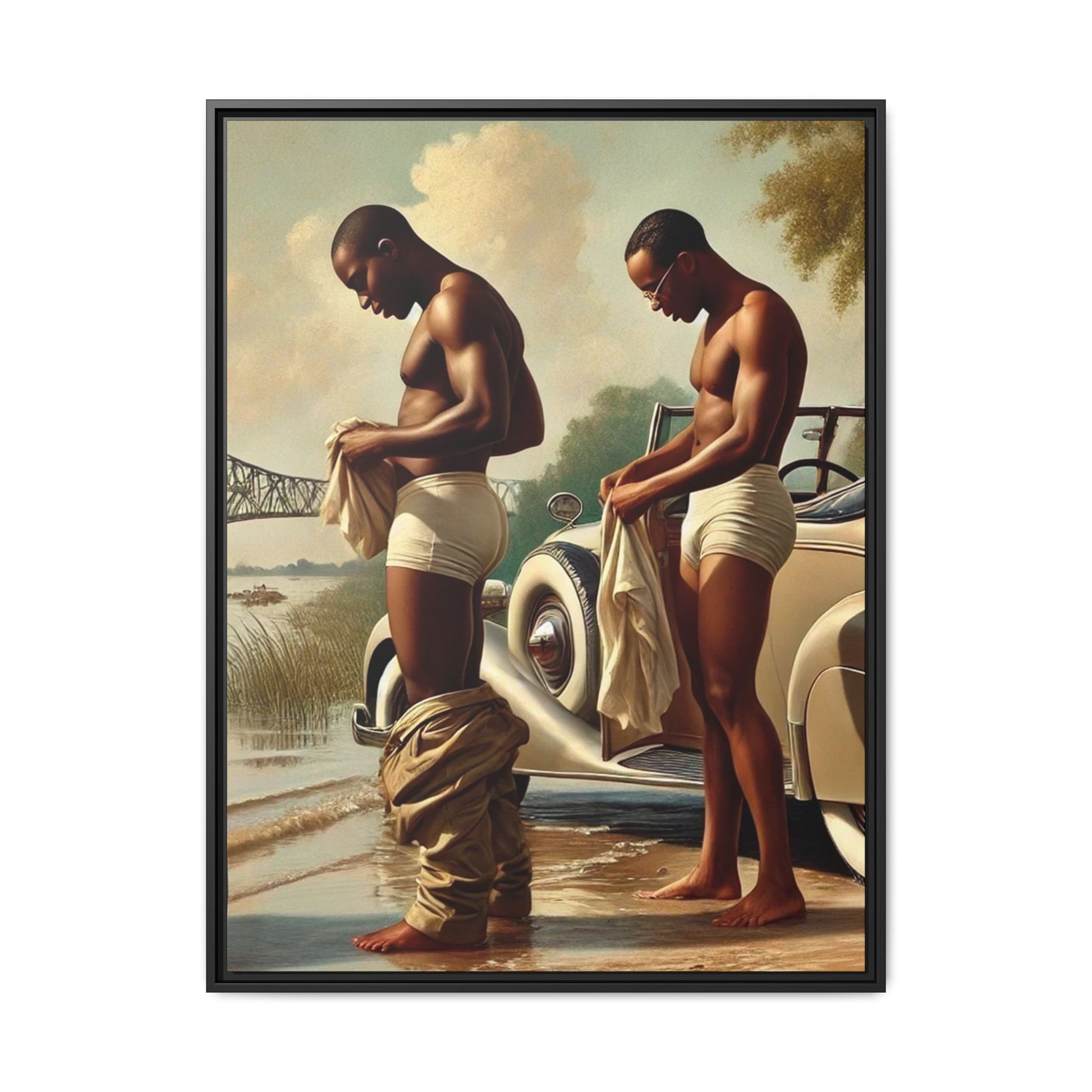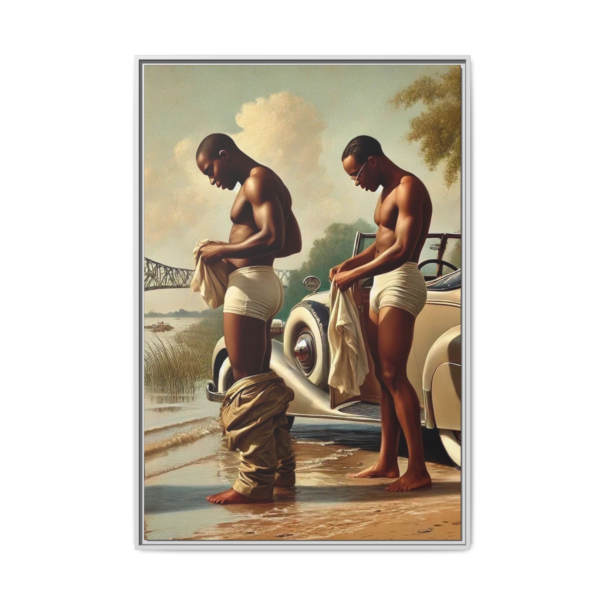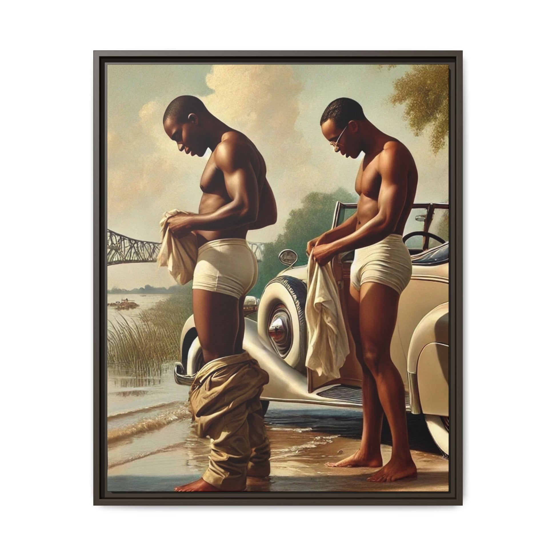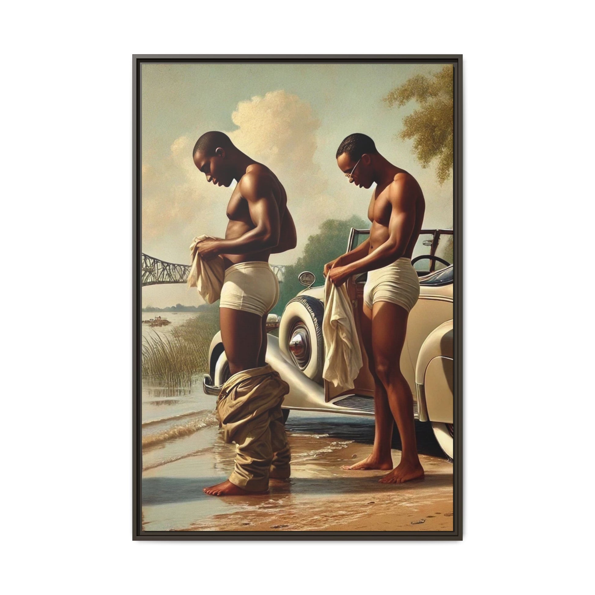 This artwork celebrates not only African-American heritage but also the enduring love and resilience of LGBTQ+ relationships throughout history. The Mississippi River, with its rich cultural significance, grounds the scene in a powerful narrative of identity, freedom, and romance. Perfect for collectors and admirers of vintage art, this piece captures the elegance of early 20th-century design while honoring the stories and voices of its time.