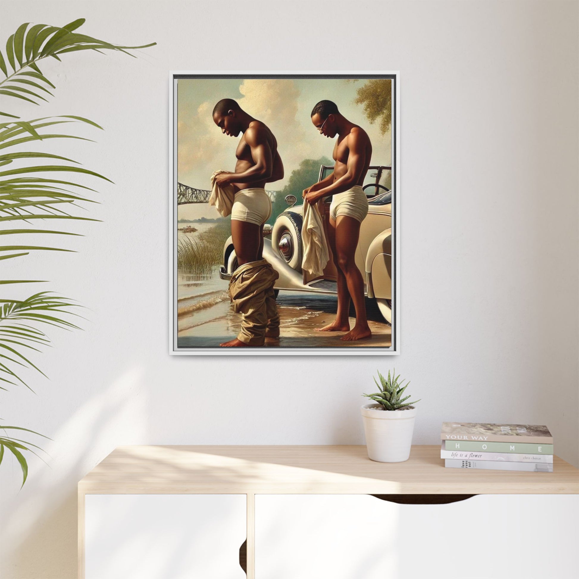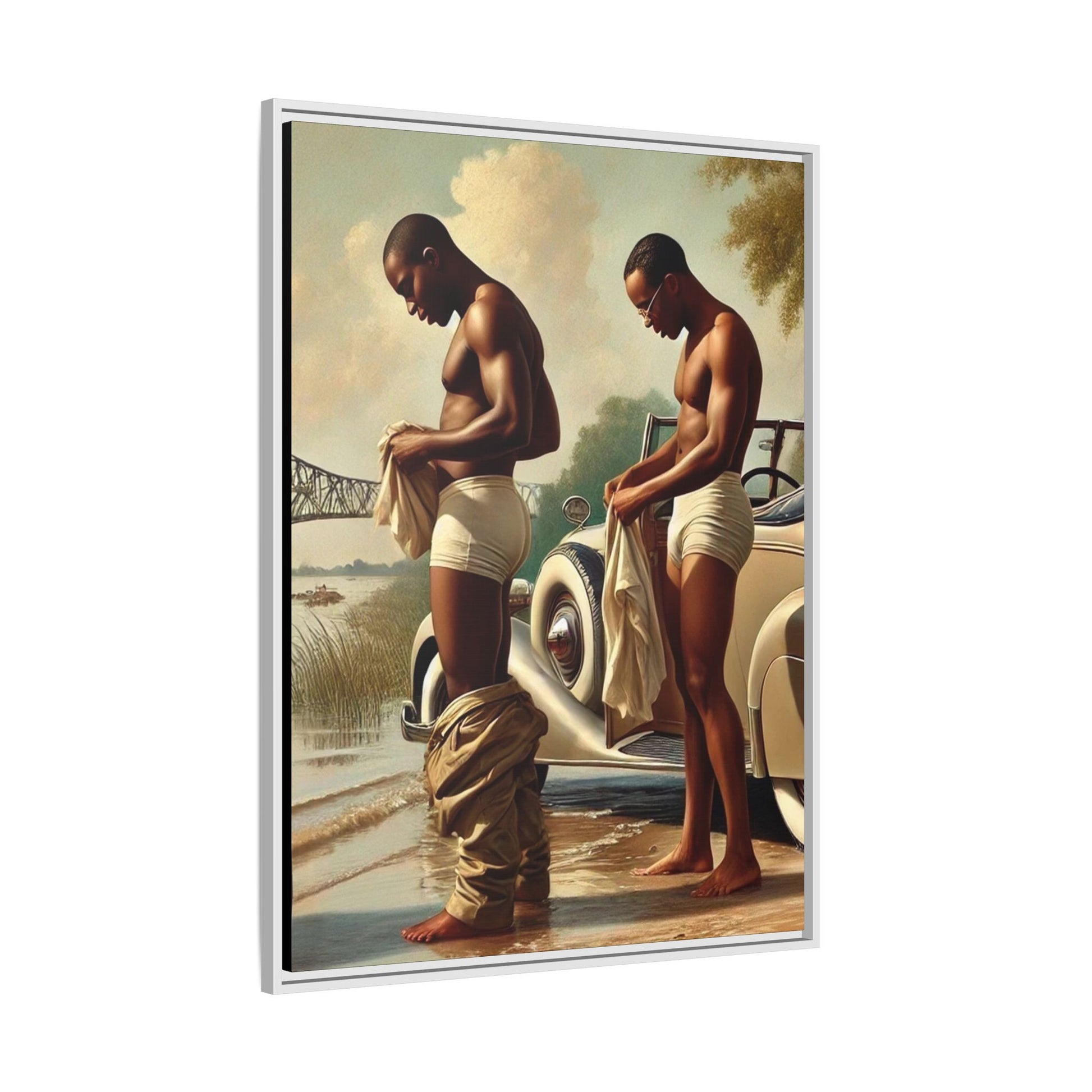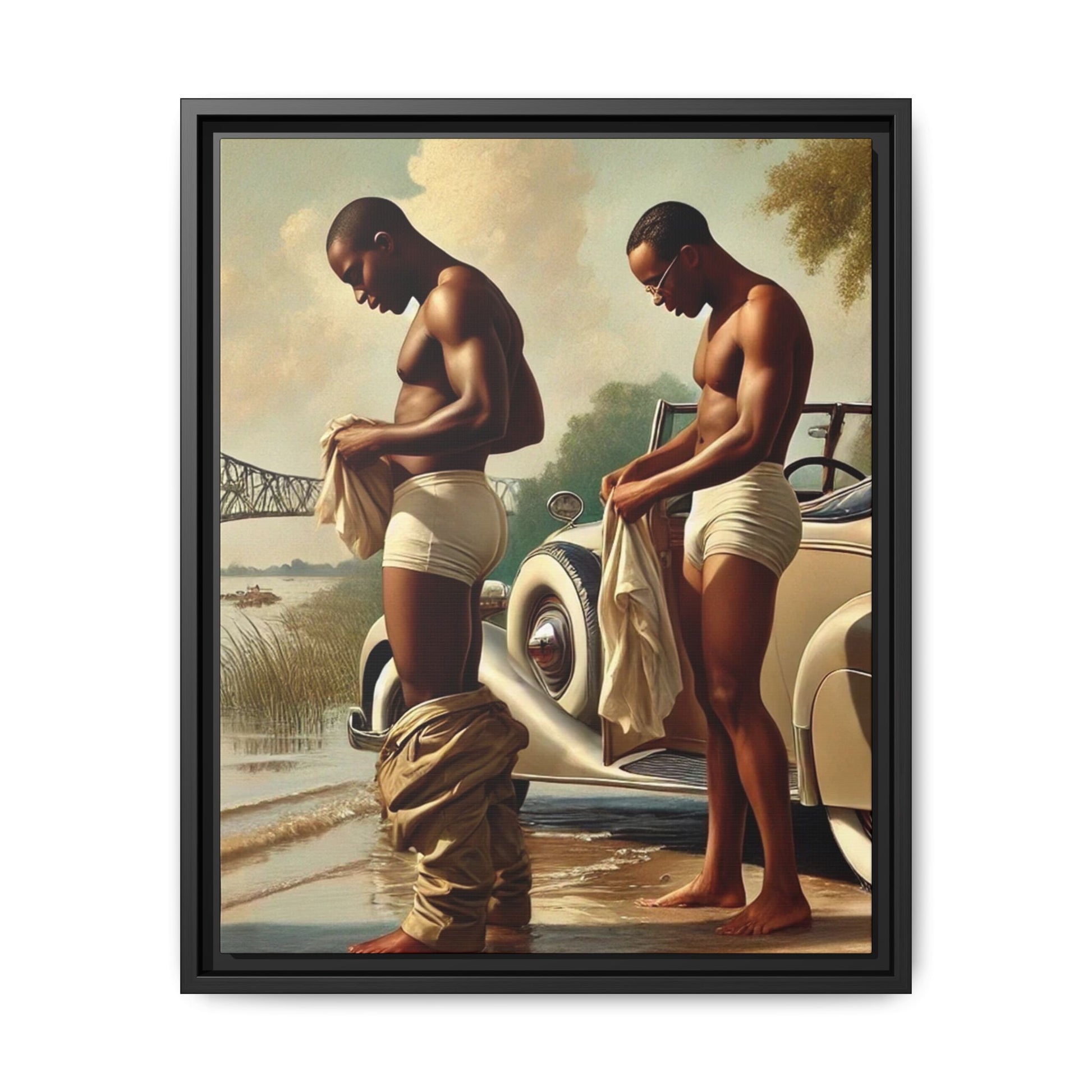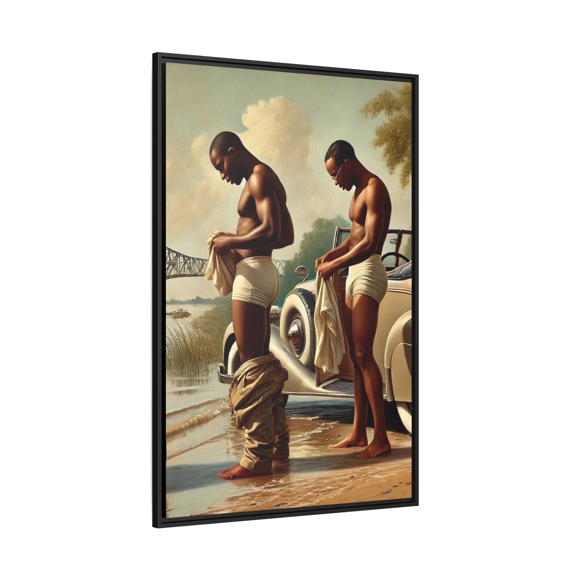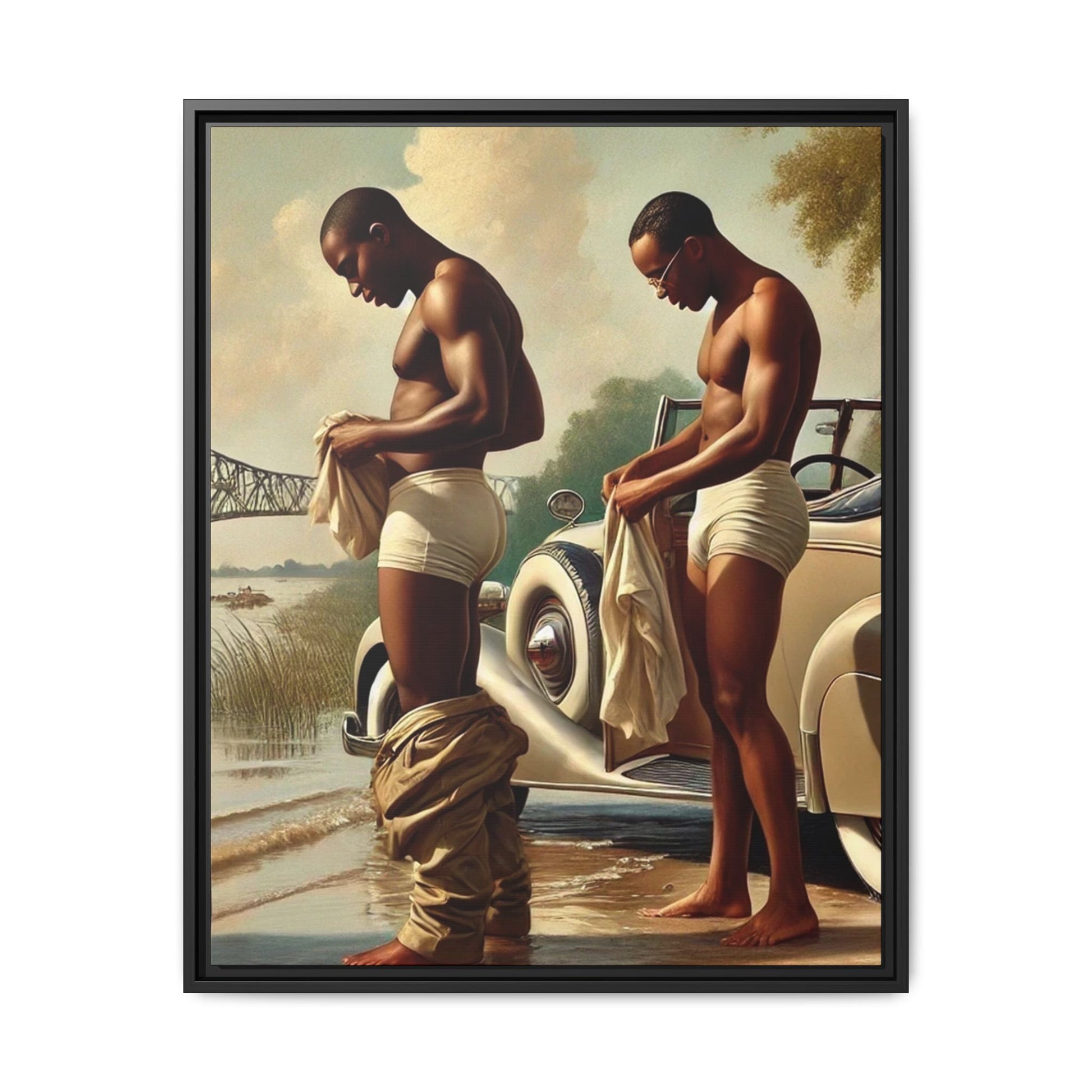 This artwork celebrates not only African-American heritage but also the enduring love and resilience of LGBTQ+ relationships throughout history. The Mississippi River, with its rich cultural significance, grounds the scene in a powerful narrative of identity, freedom, and romance. Perfect for collectors and admirers of vintage art, this piece captures the elegance of early 20th-century design while honoring the stories and voices of its time.