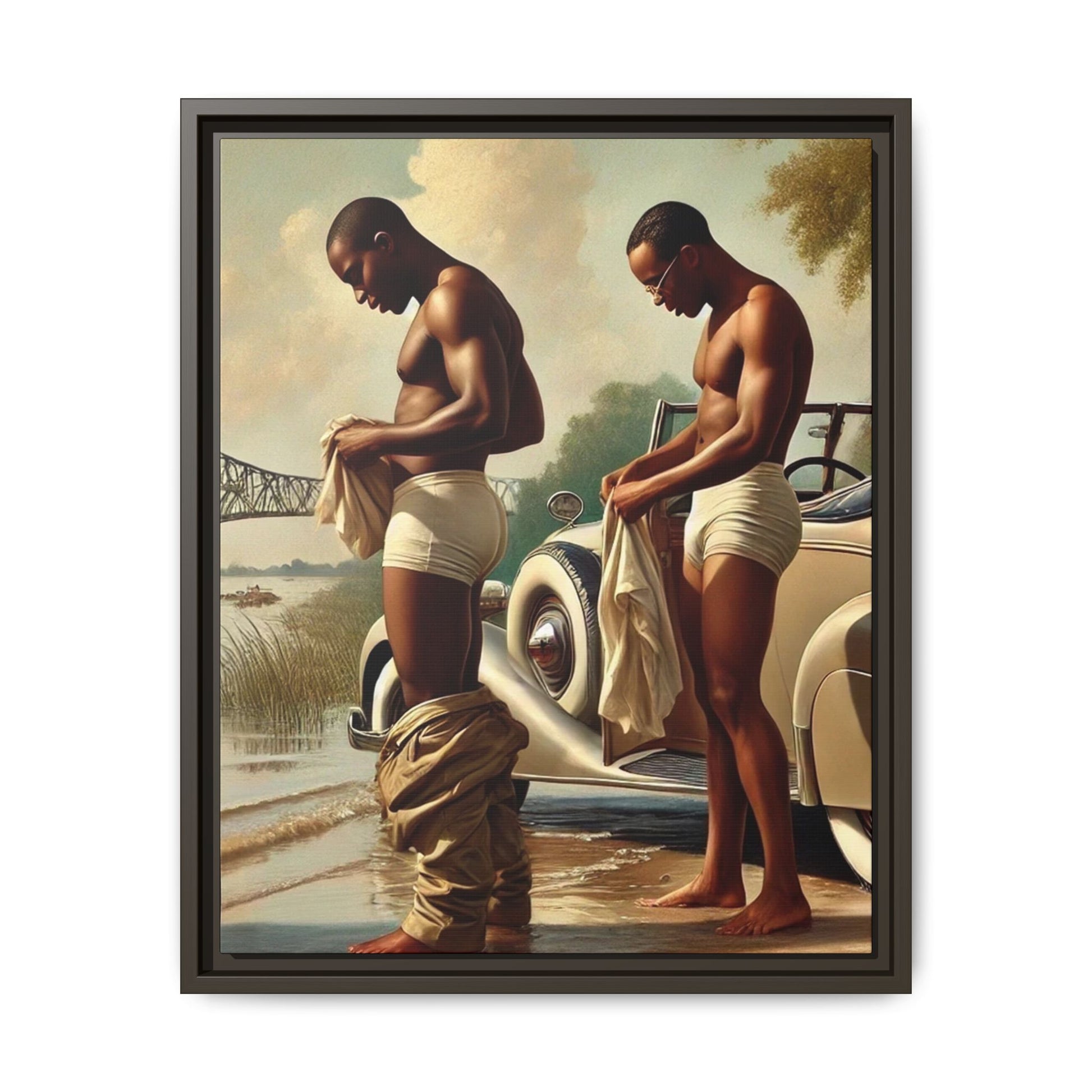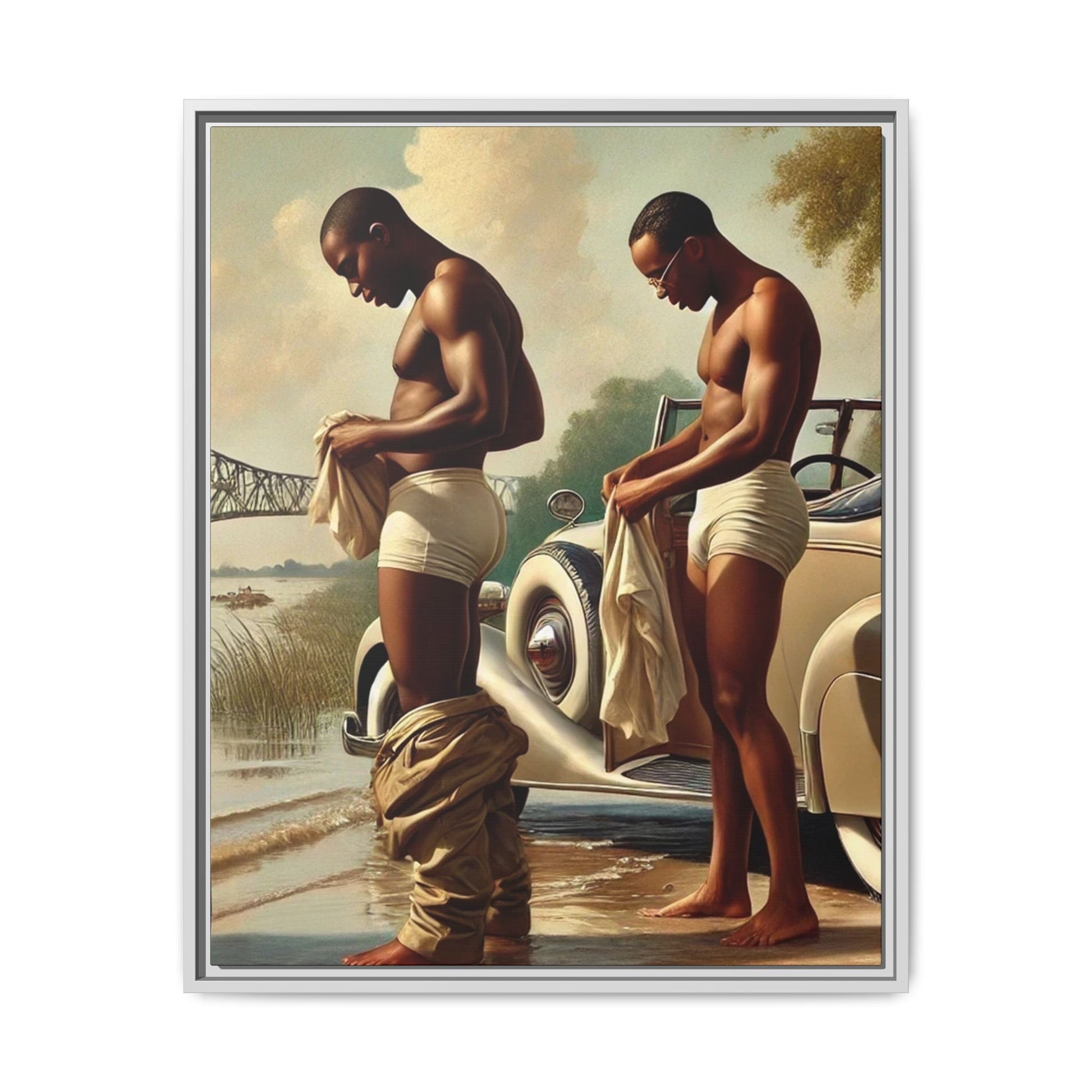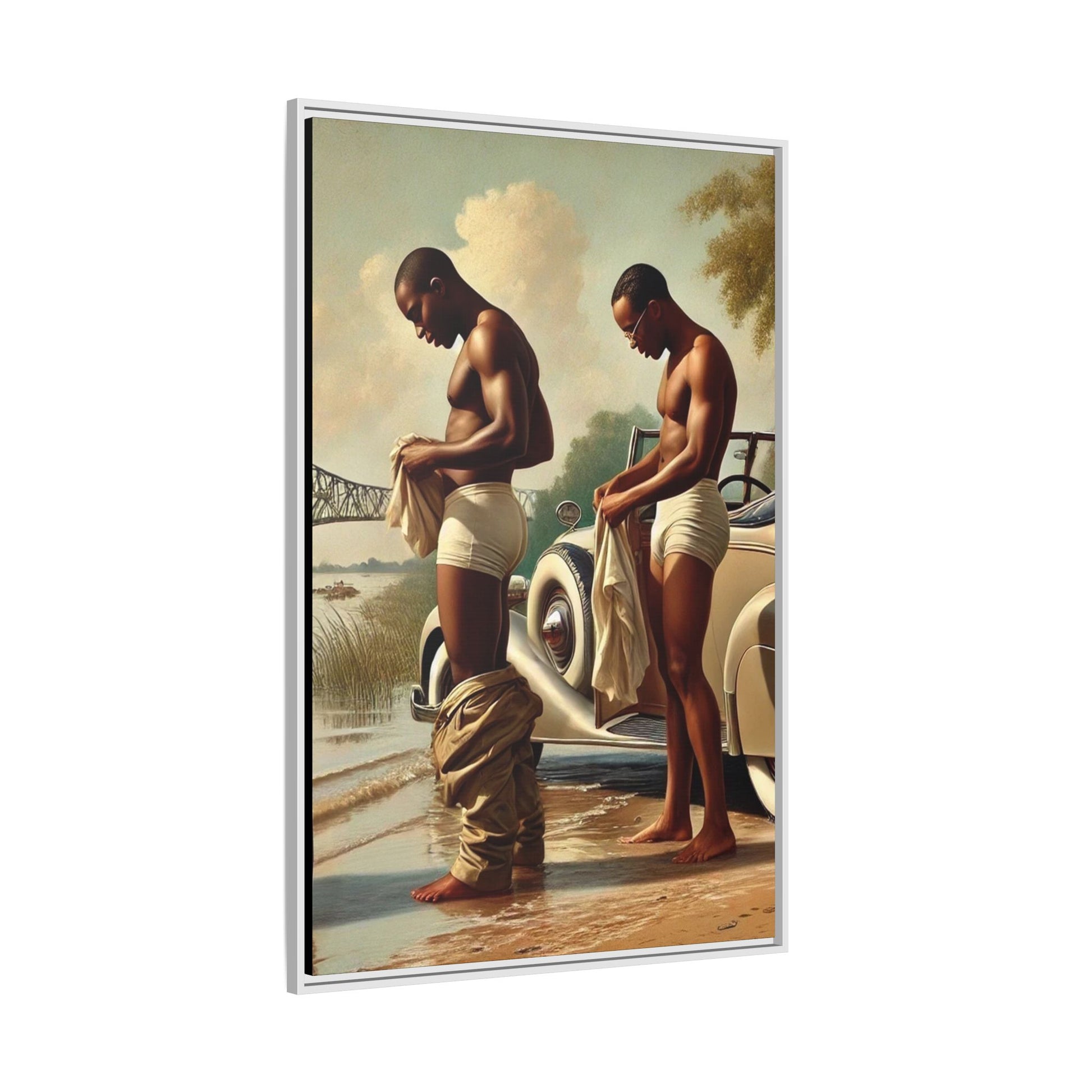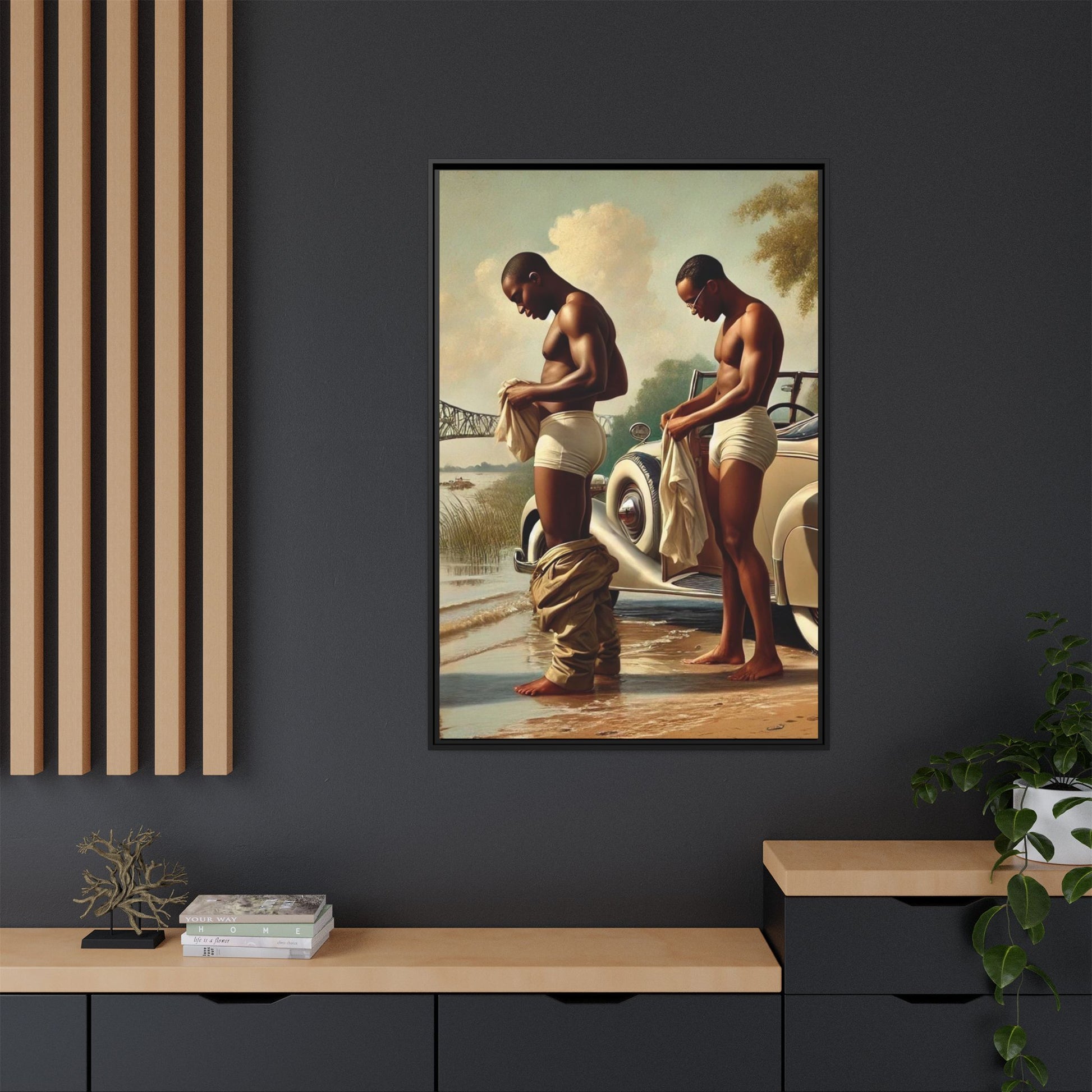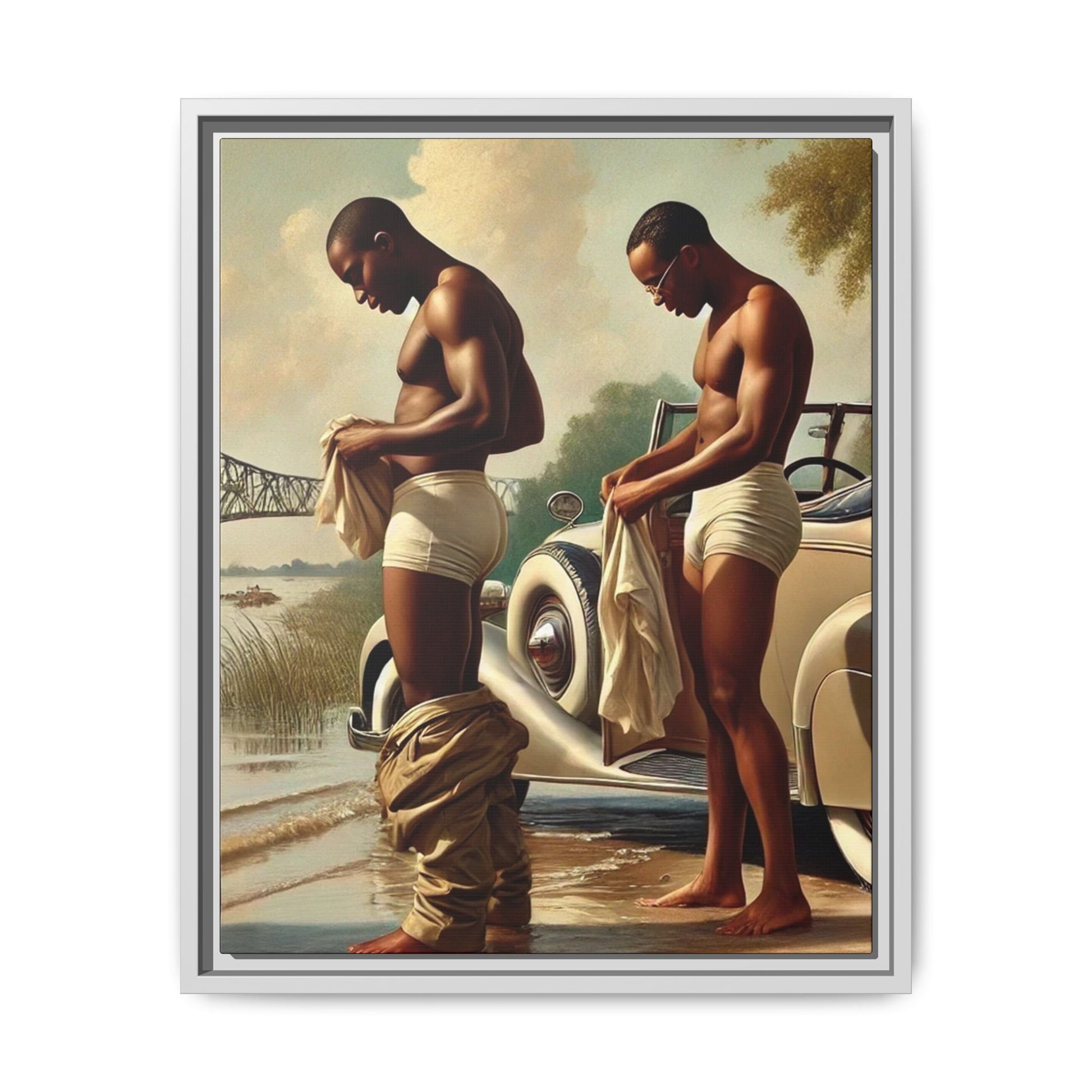 This artwork celebrates not only African-American heritage but also the enduring love and resilience of LGBTQ+ relationships throughout history. The Mississippi River, with its rich cultural significance, grounds the scene in a powerful narrative of identity, freedom, and romance. Perfect for collectors and admirers of vintage art, this piece captures the elegance of early 20th-century design while honoring the stories and voices of its time.