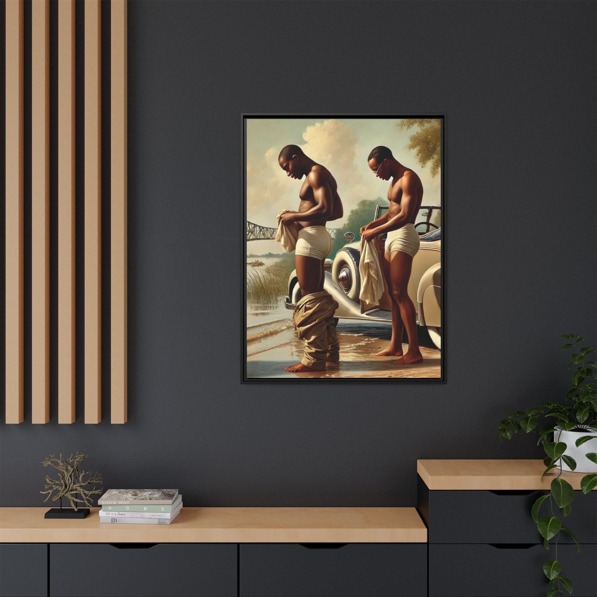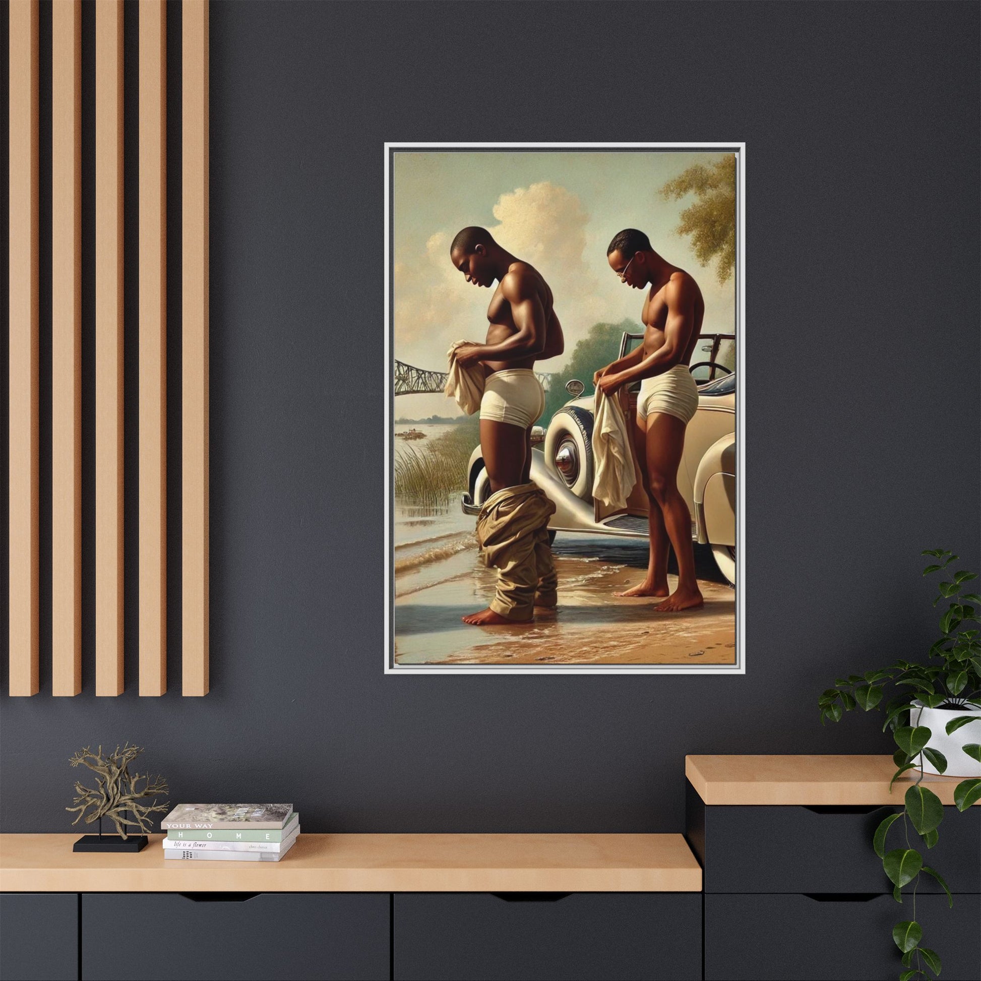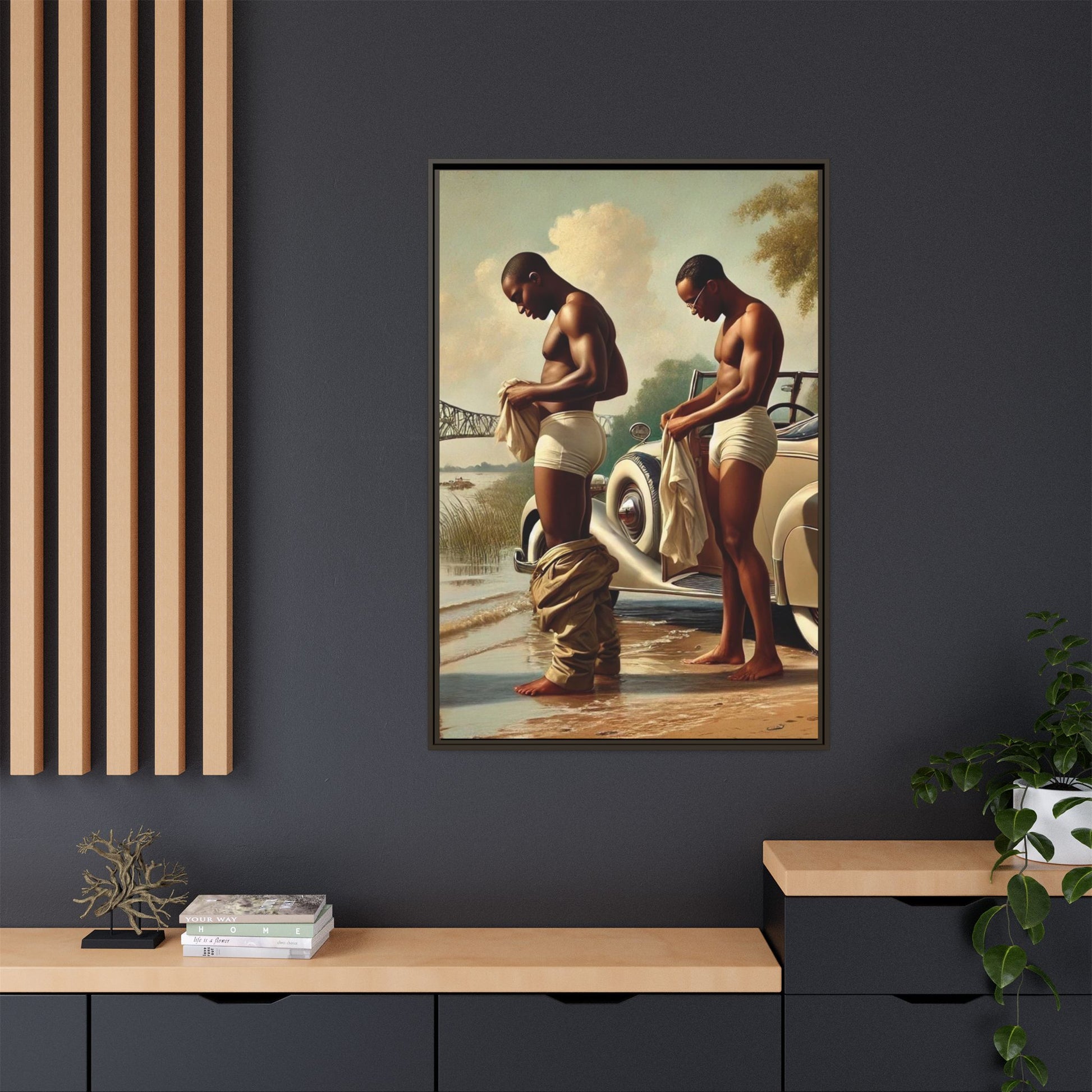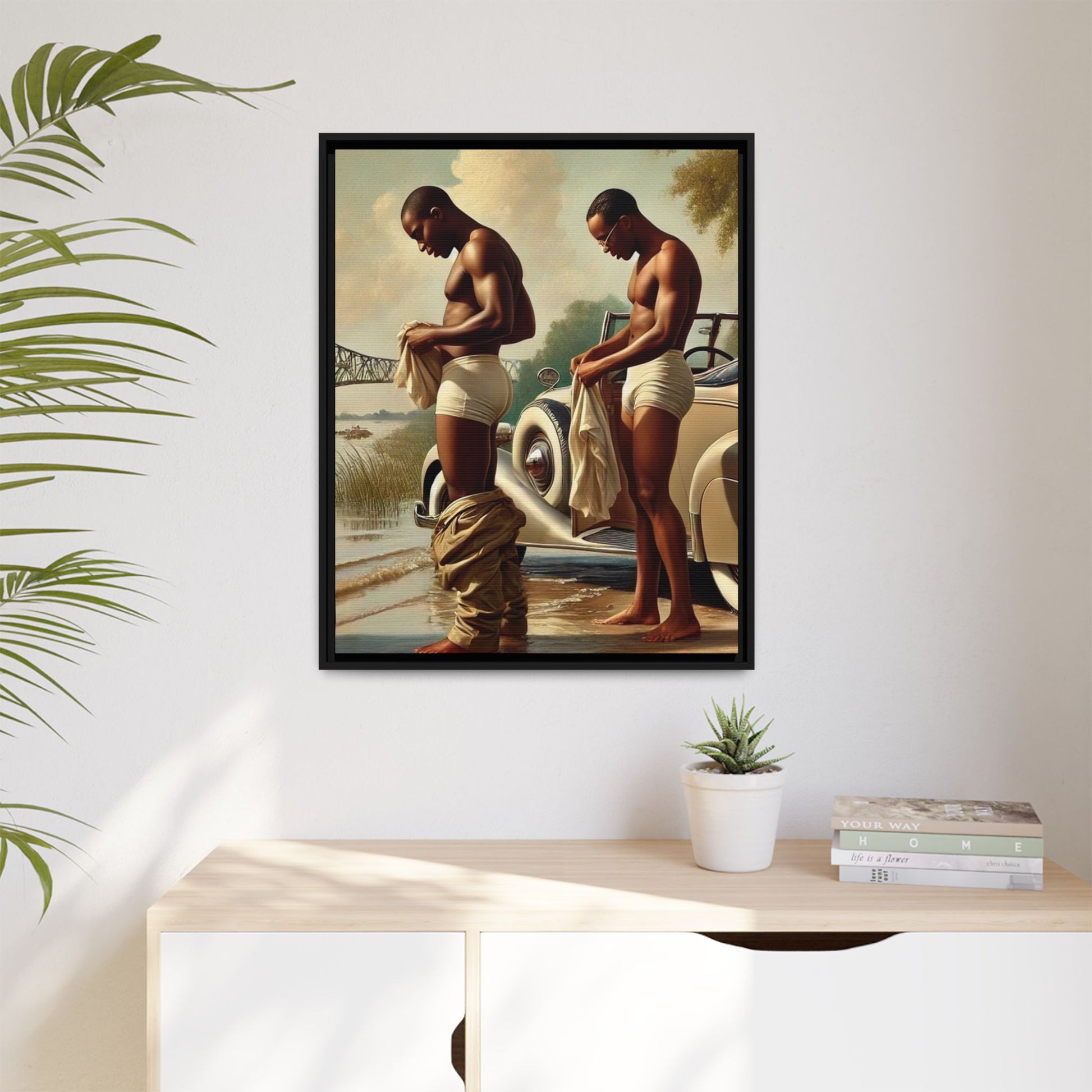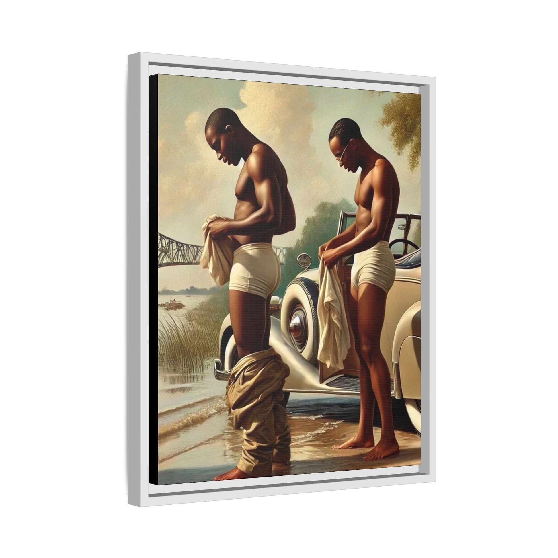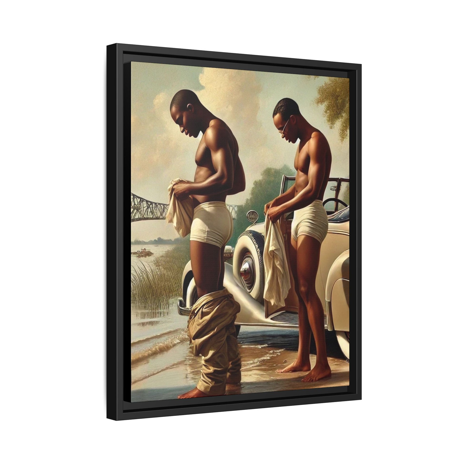 This artwork celebrates not only African-American heritage but also the enduring love and resilience of LGBTQ+ relationships throughout history. The Mississippi River, with its rich cultural significance, grounds the scene in a powerful narrative of identity, freedom, and romance. Perfect for collectors and admirers of vintage art, this piece captures the elegance of early 20th-century design while honoring the stories and voices of its time.