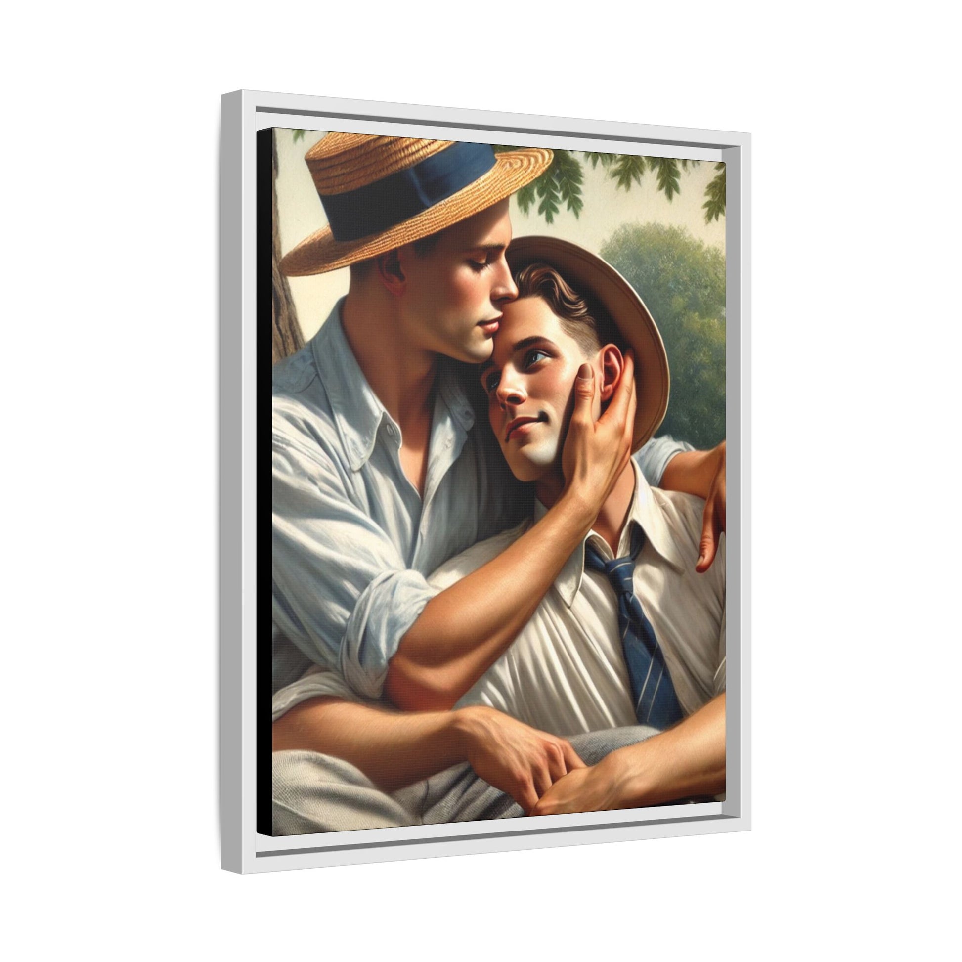 This stunning vintage-style artwork beautifully portrays a tender moment between a gay couple, set in a serene, sunlit meadow. The hyper-realistic artistry highlights their deep connection, as one man gently cradles his partner's face, leaning in for an affectionate forehead kiss. Their attire—a straw boater hat, crisp button-down shirts, and a classic tie—evokes a timeless 1930s aesthetic, blending elegance and simplicity. A picnic basket at their side and the dappled shade of a large tree add to the tranquil, romantic ambiance, symbolizing a moment of love and serenity in a simpler time.