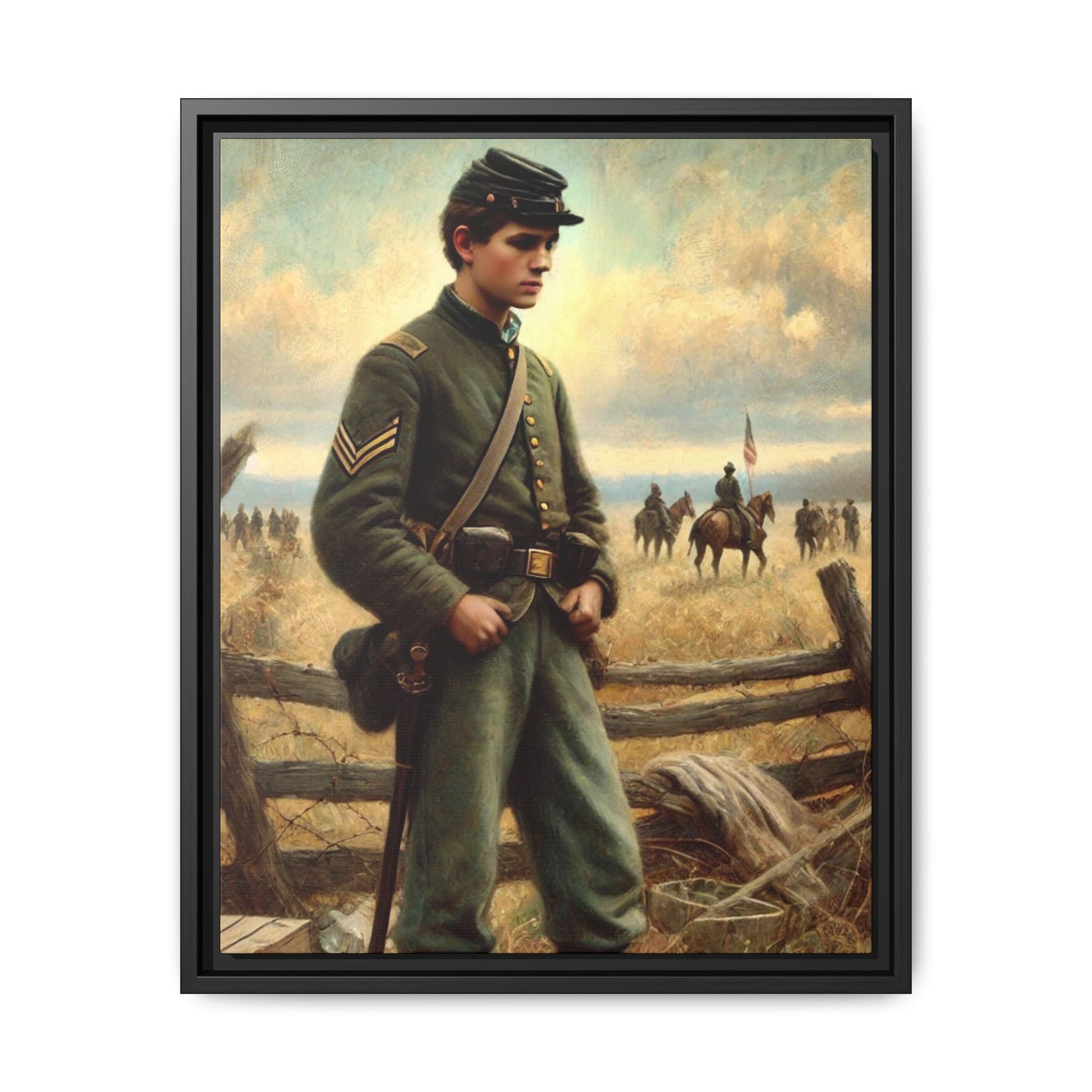 This framed artwork reflects the essence of The Soldier, a character immortalized in Walt Whitman's Drum-Taps poems from Leaves of Grass. Created during and after the American Civil War, Whitman's words honor the soldiers he encountered as a nurse, embodying a poignant mix of admiration, youth, and the tragedy of war. The soldier, standing amidst a battlefield, exudes strength, earnestness, and a vulnerability that captures the harsh realities of 19th-century conflict. Dressed in period-accurate Civil War-era attire — kepi, wool coat, and boots — this striking piece mirrors Whitman's themes of sacrifice, humanity, and the enduring cost of war.