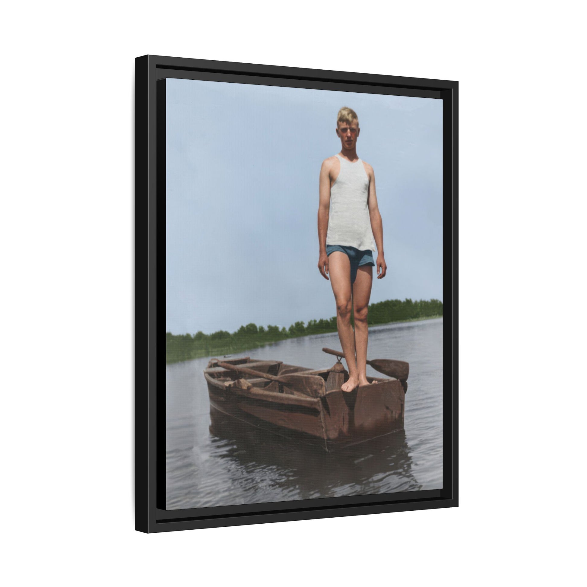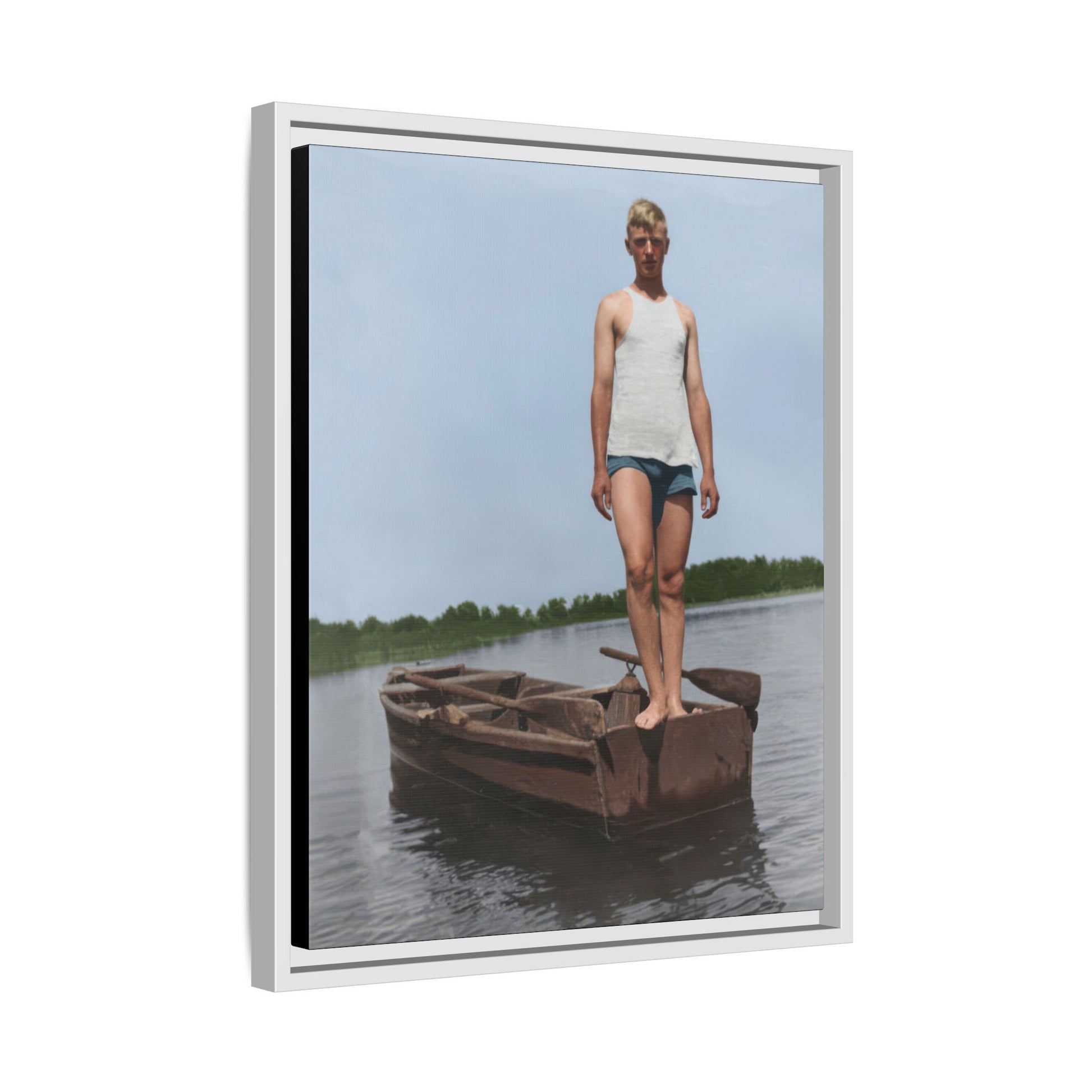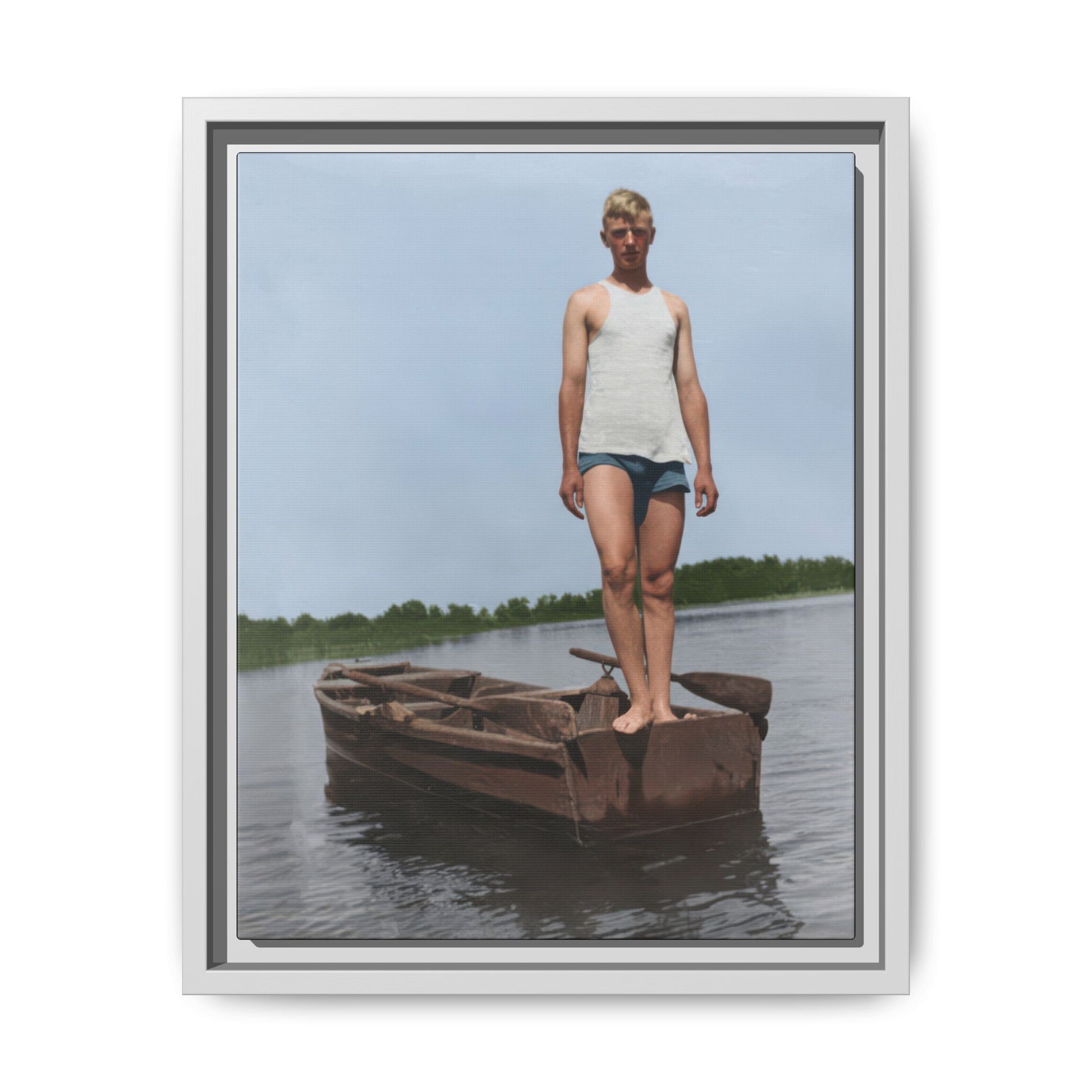 Title: Young Man Standing on Stern of Rowboat in Calm Water