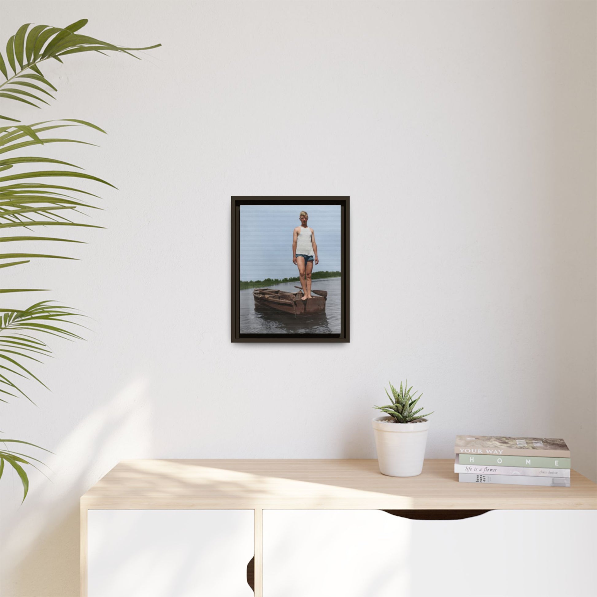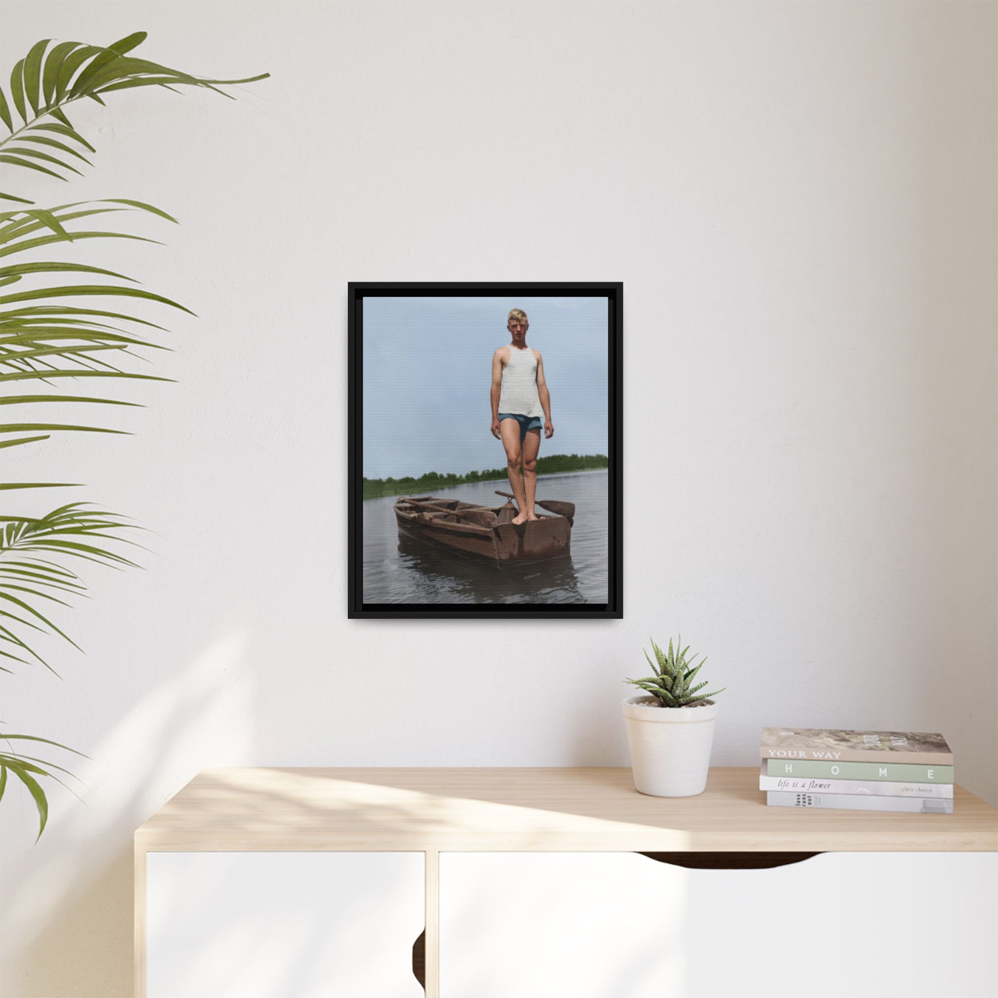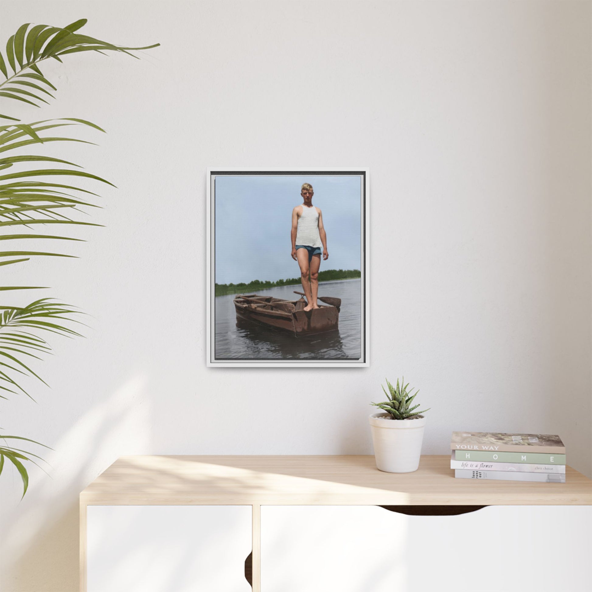 Title: Young Man Standing on Stern of Rowboat in Calm Water