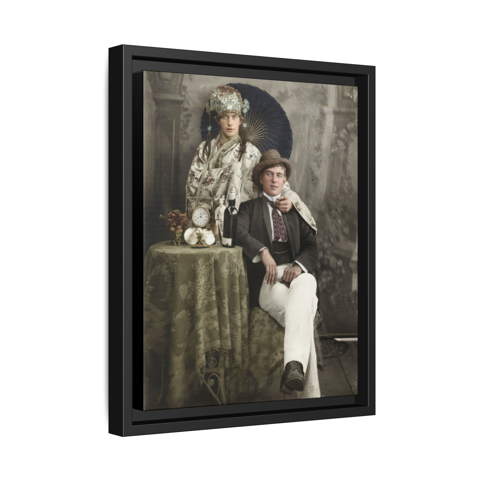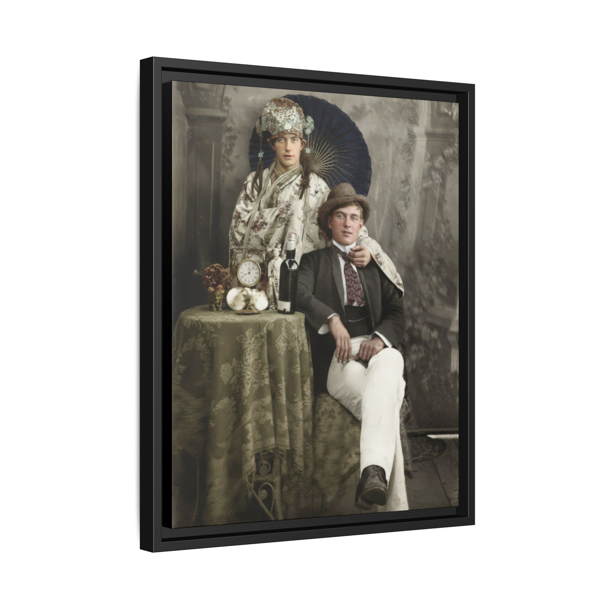 This artwork presents a restored vintage photograph reproduced as framed canvas wall art, transforming a historical portrait into museum-style décor for contemporary interiors. The image originates from an early twentieth-century studio photograph and is reproduced on museum-quality matte canvas using archival inks that preserve the tonal character of the original print. As a historical portrait reproduction, the artwork allows viewers to experience the visual language of early photographic portraiture while displaying it as refined wall décor.