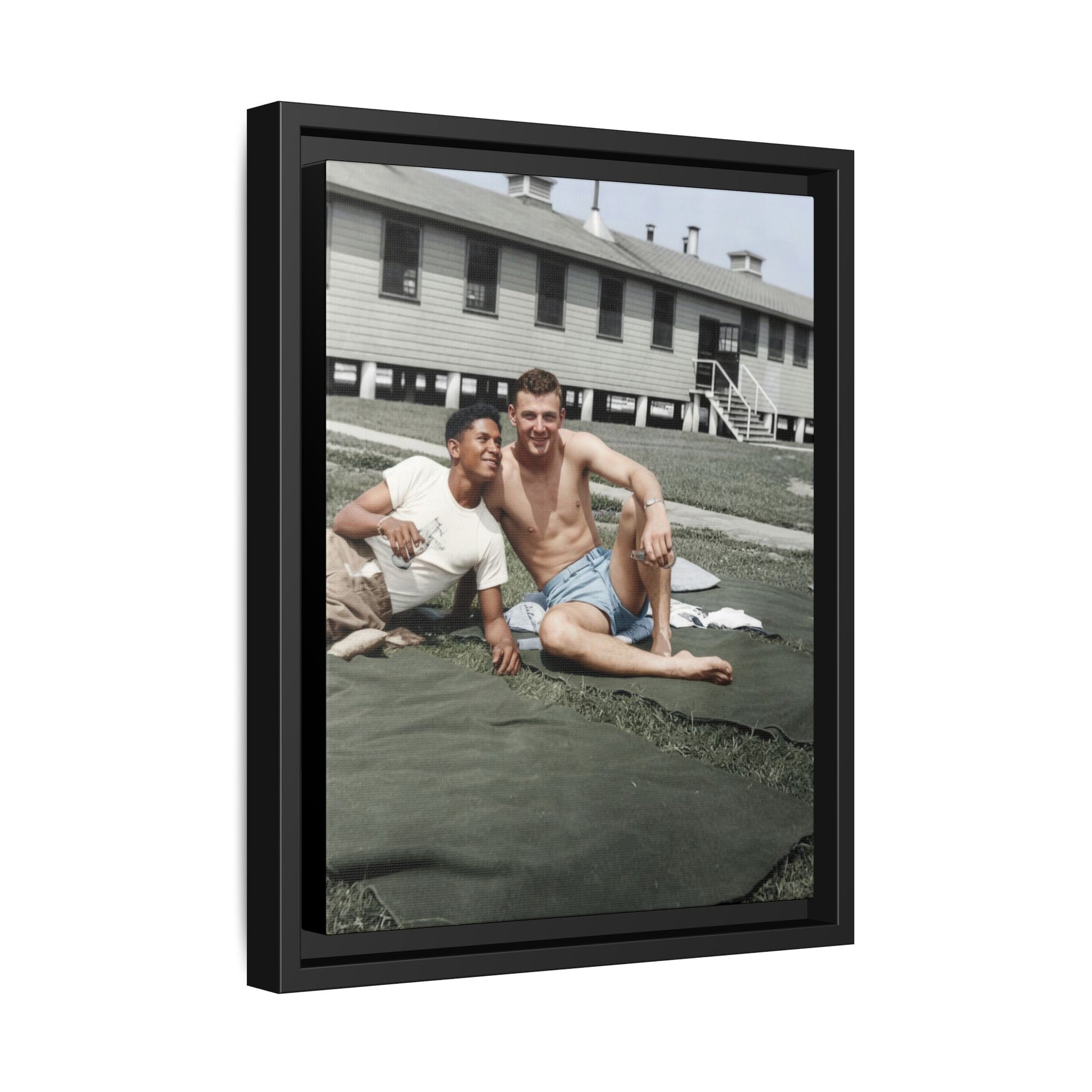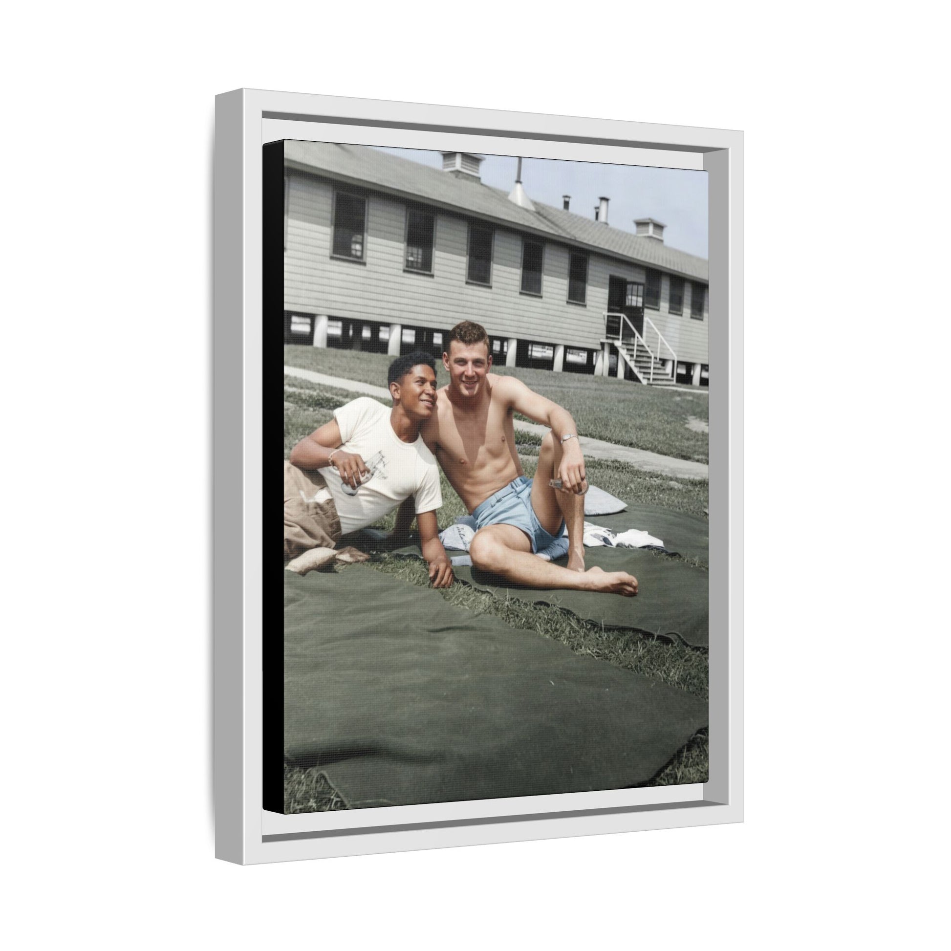 Title: Two Men Reclining on Blankets before Barracks Building