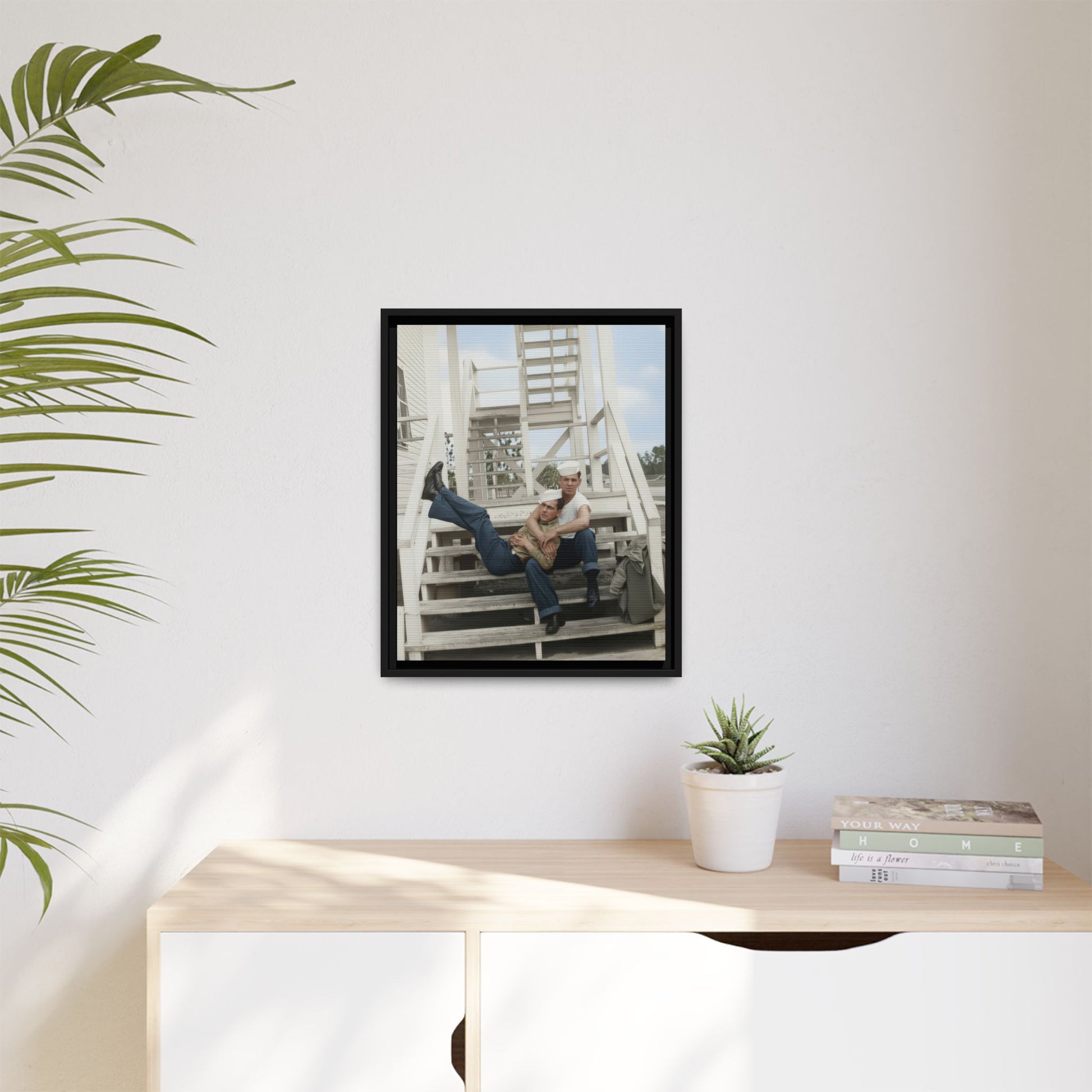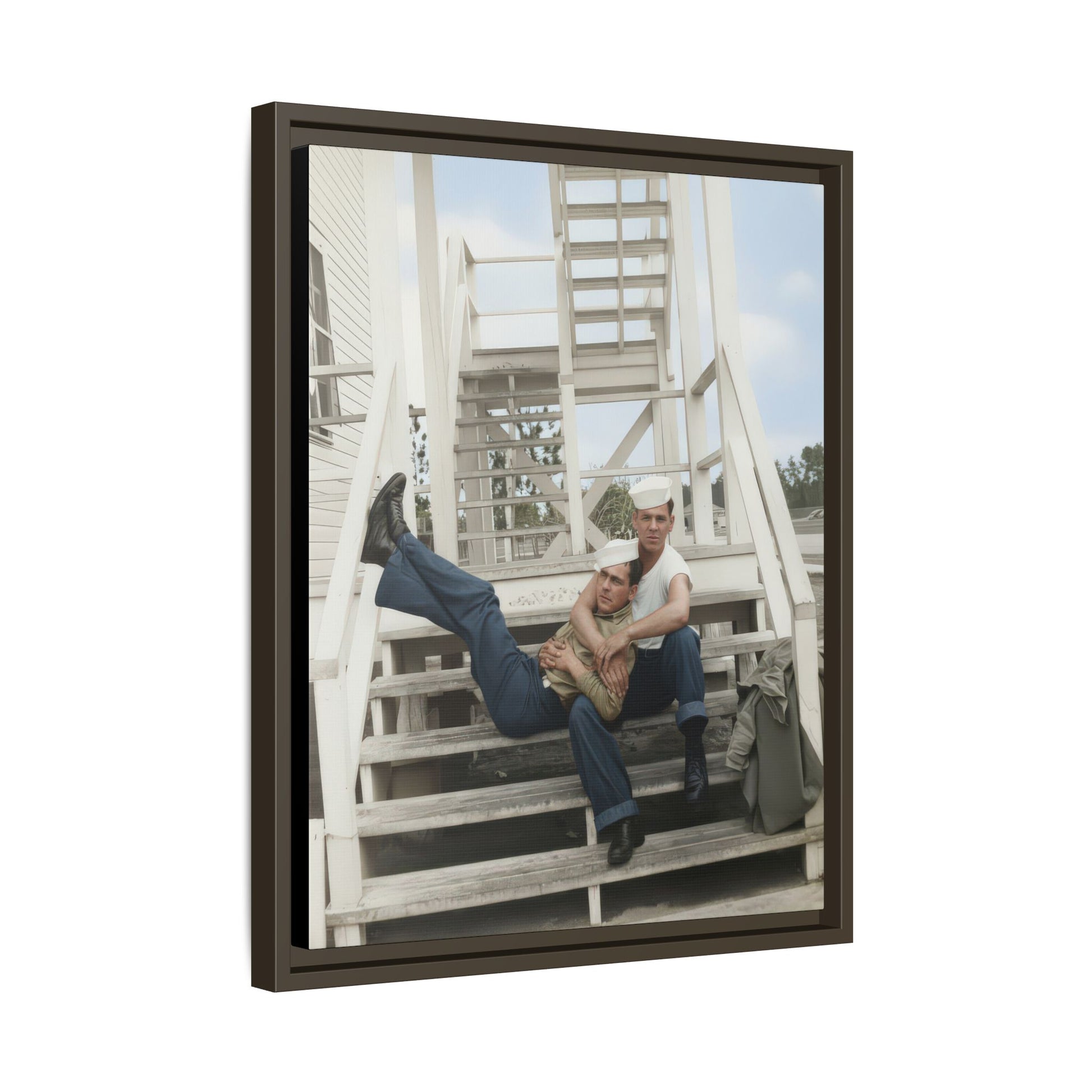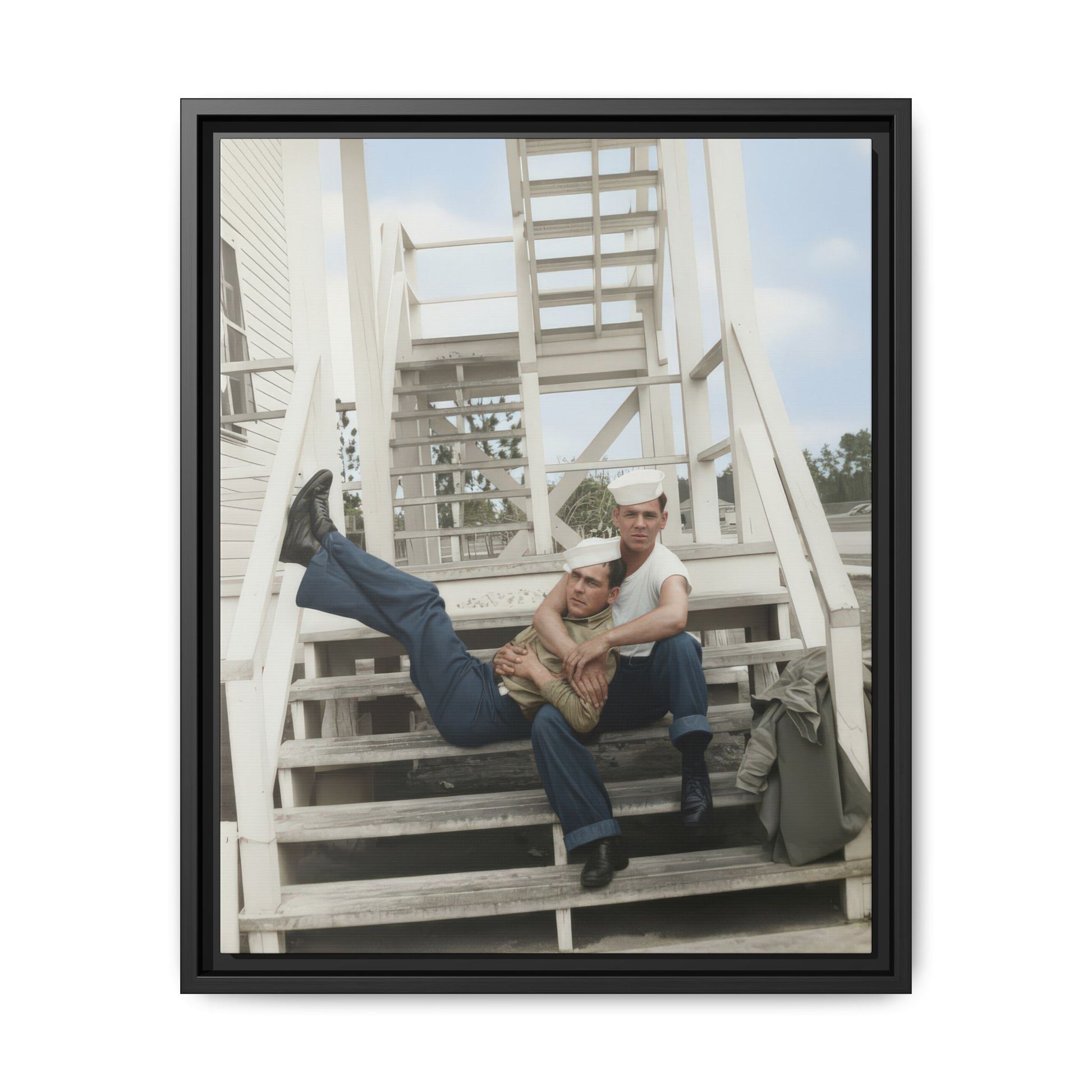Title: Two Sailors Seated on Wooden Stairway at Barracks