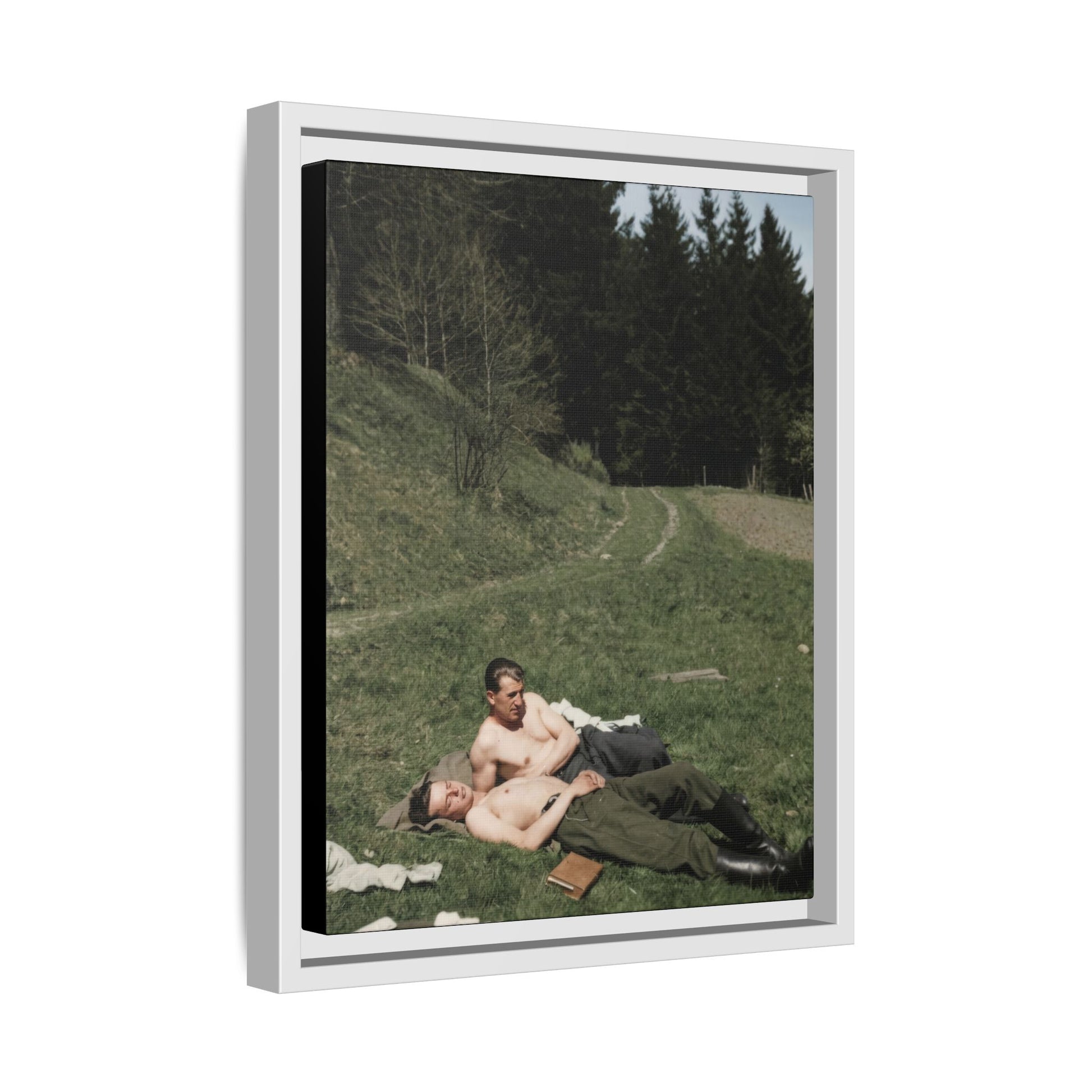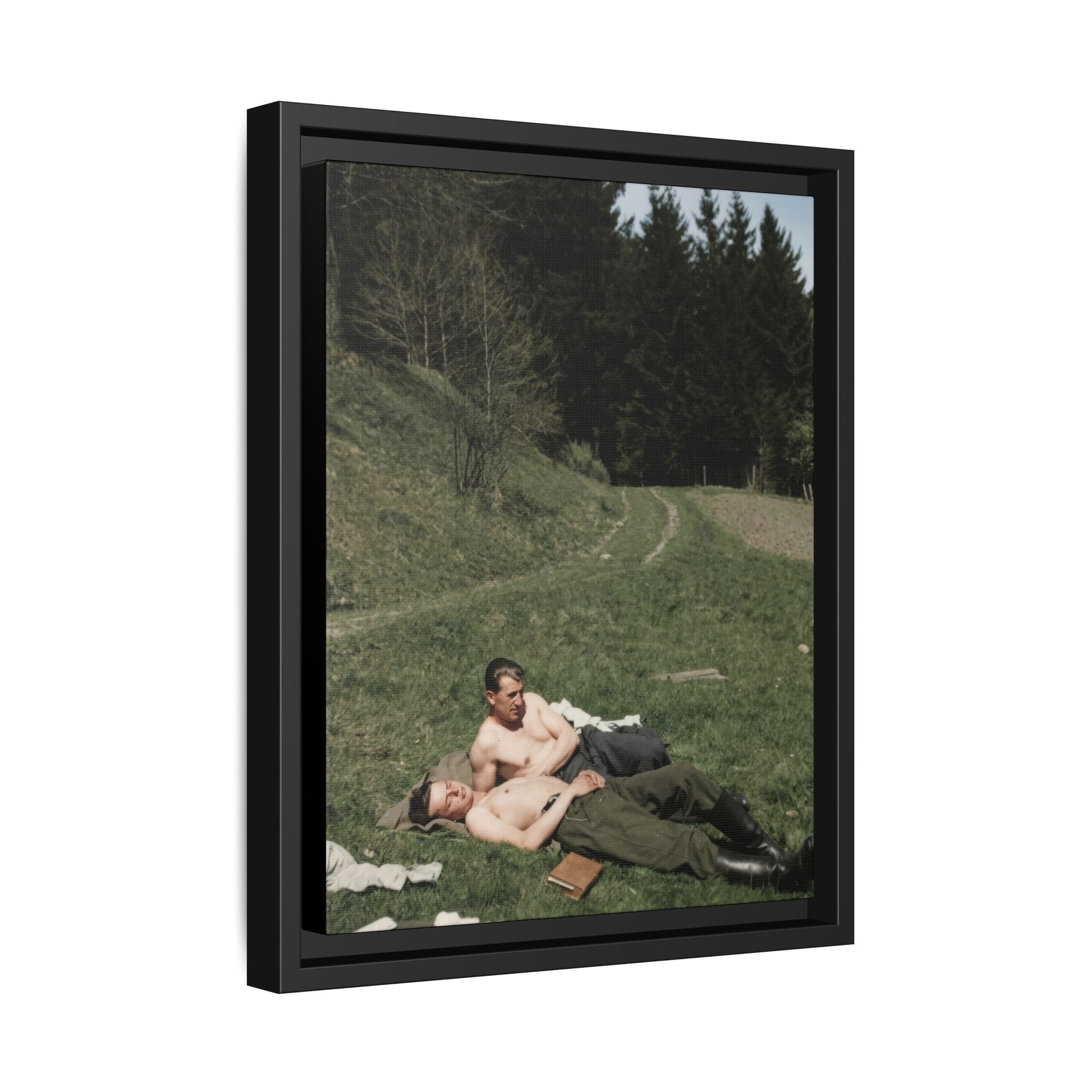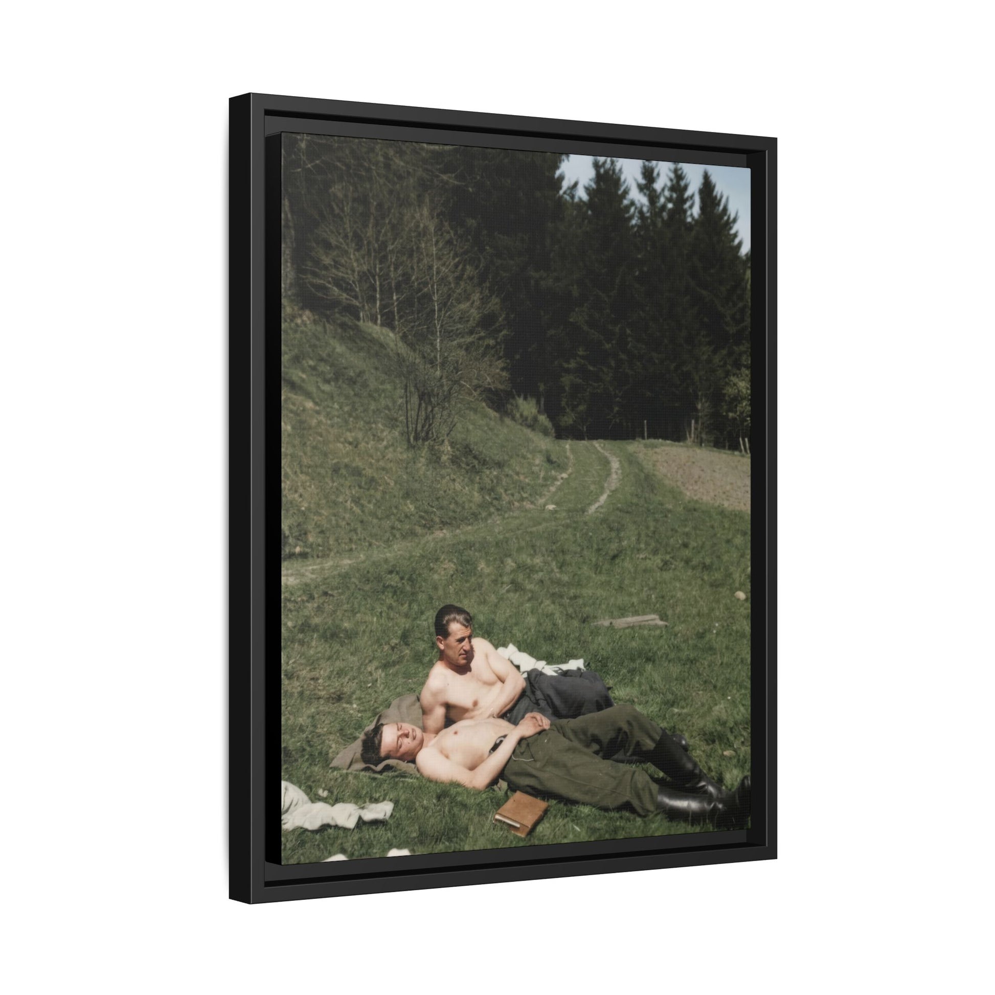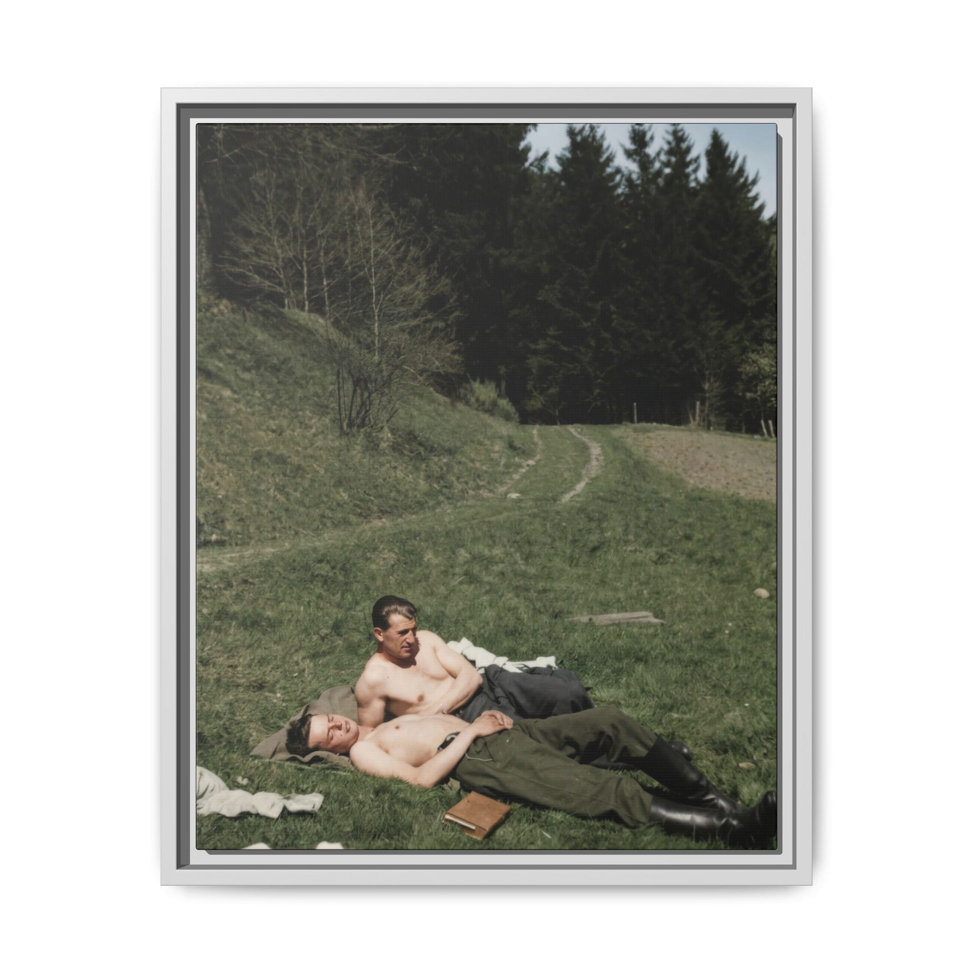 Title: Two Shirtless Men Reclining on Grass Near Forest Path