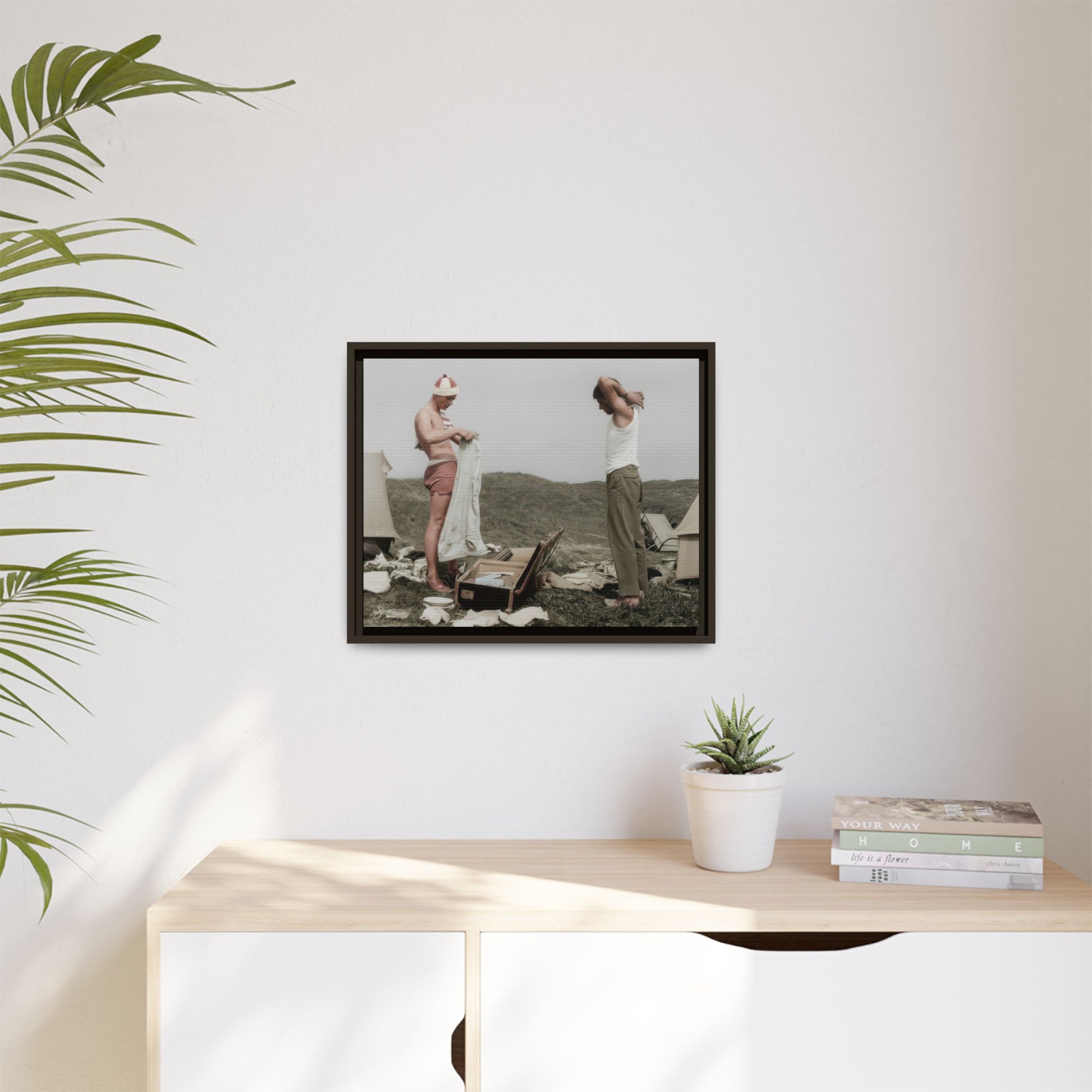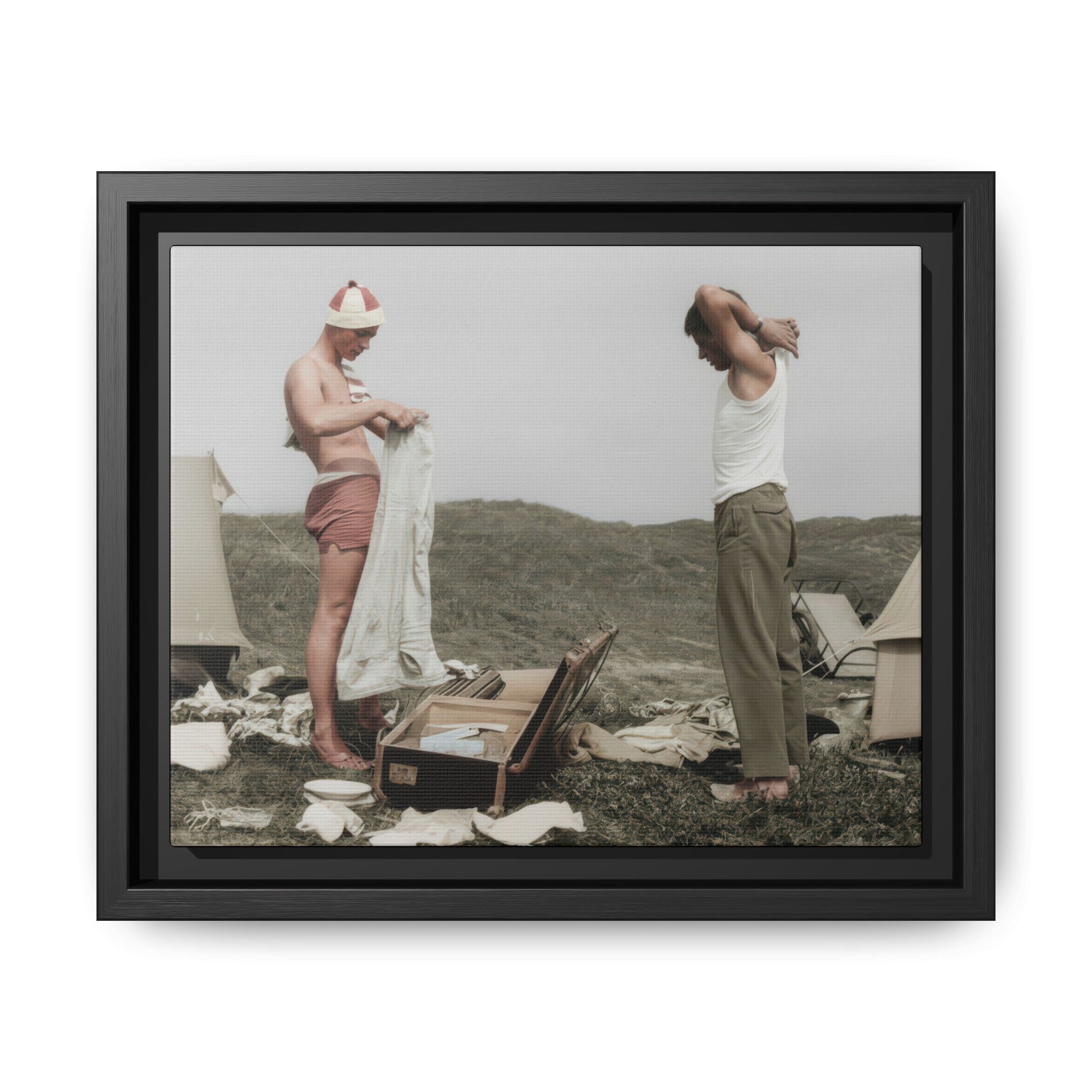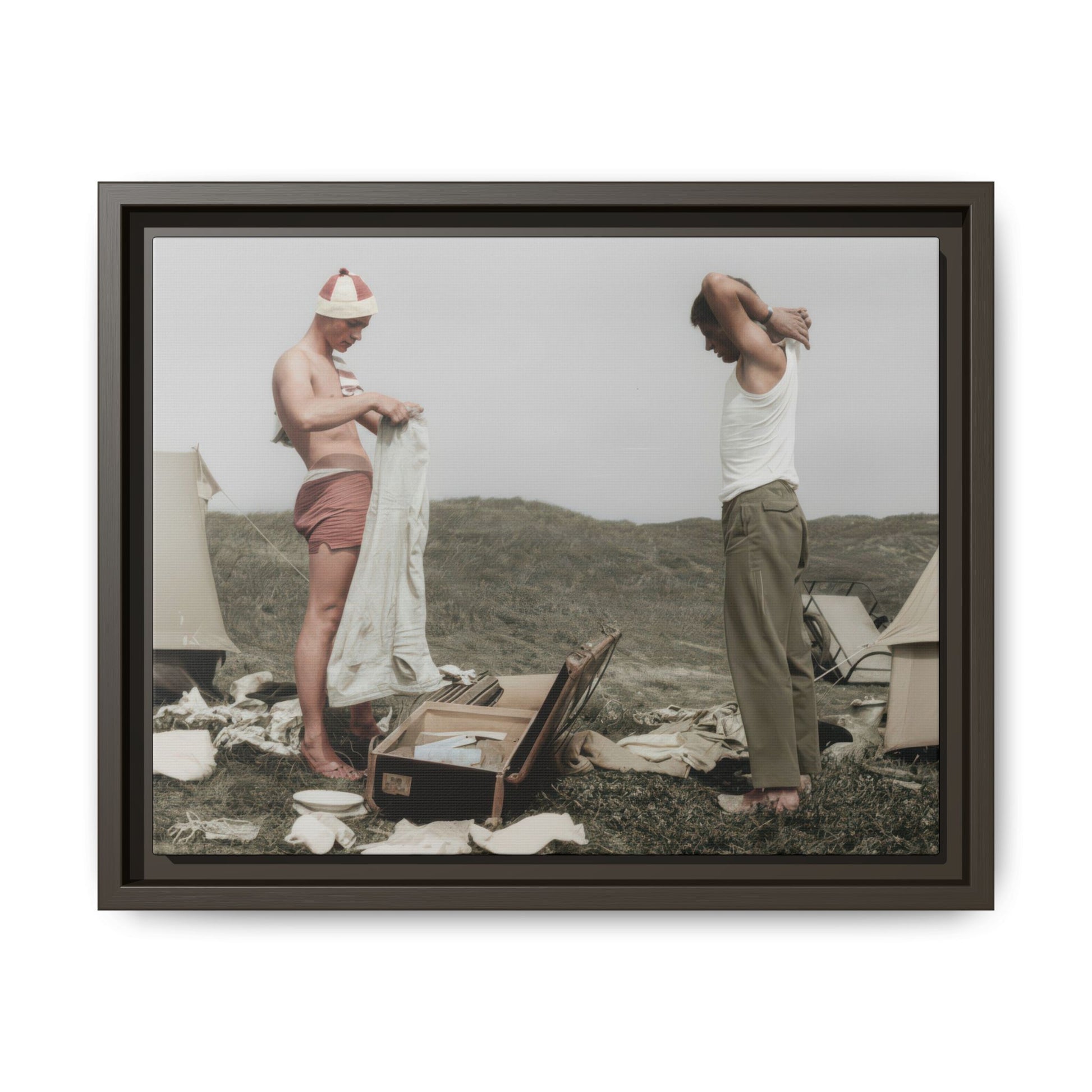 Title: Two Men Changing Clothing Beside Tents with an Open Suitcase