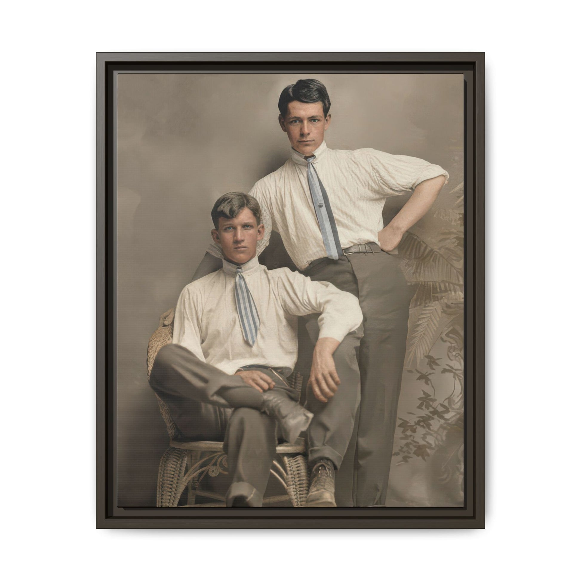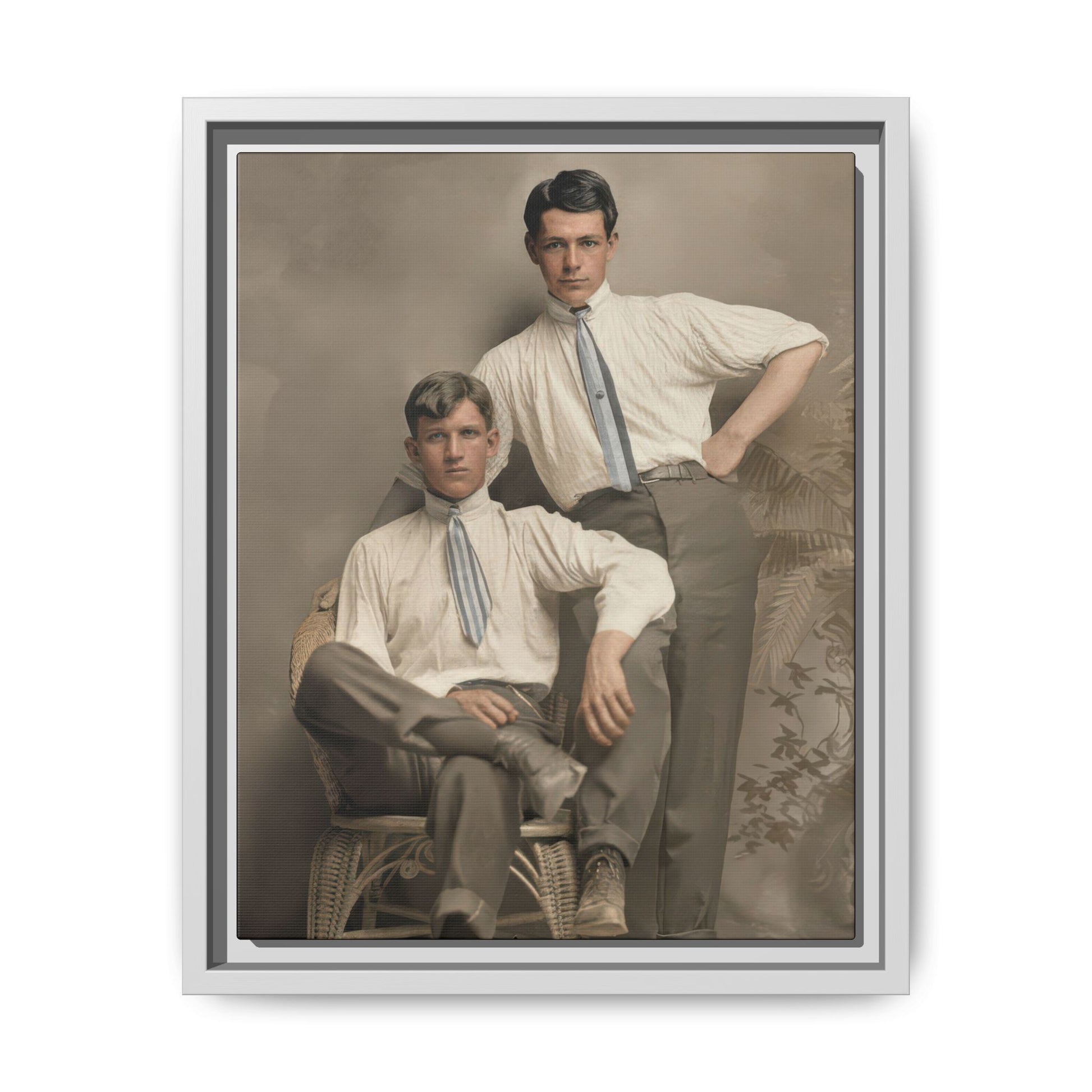 Clothing provides the strongest dating evidence. Both subjects wear high-collared shirts with narrow, loosely tied neckwear and trousers with a straight, moderately narrow cut. Hairstyles are short and neatly parted, consistent with early 20th-century fashion. The wicker chair and painted studio backdrop align with common commercial portrait studio practices during the first two decades of the 1900s.