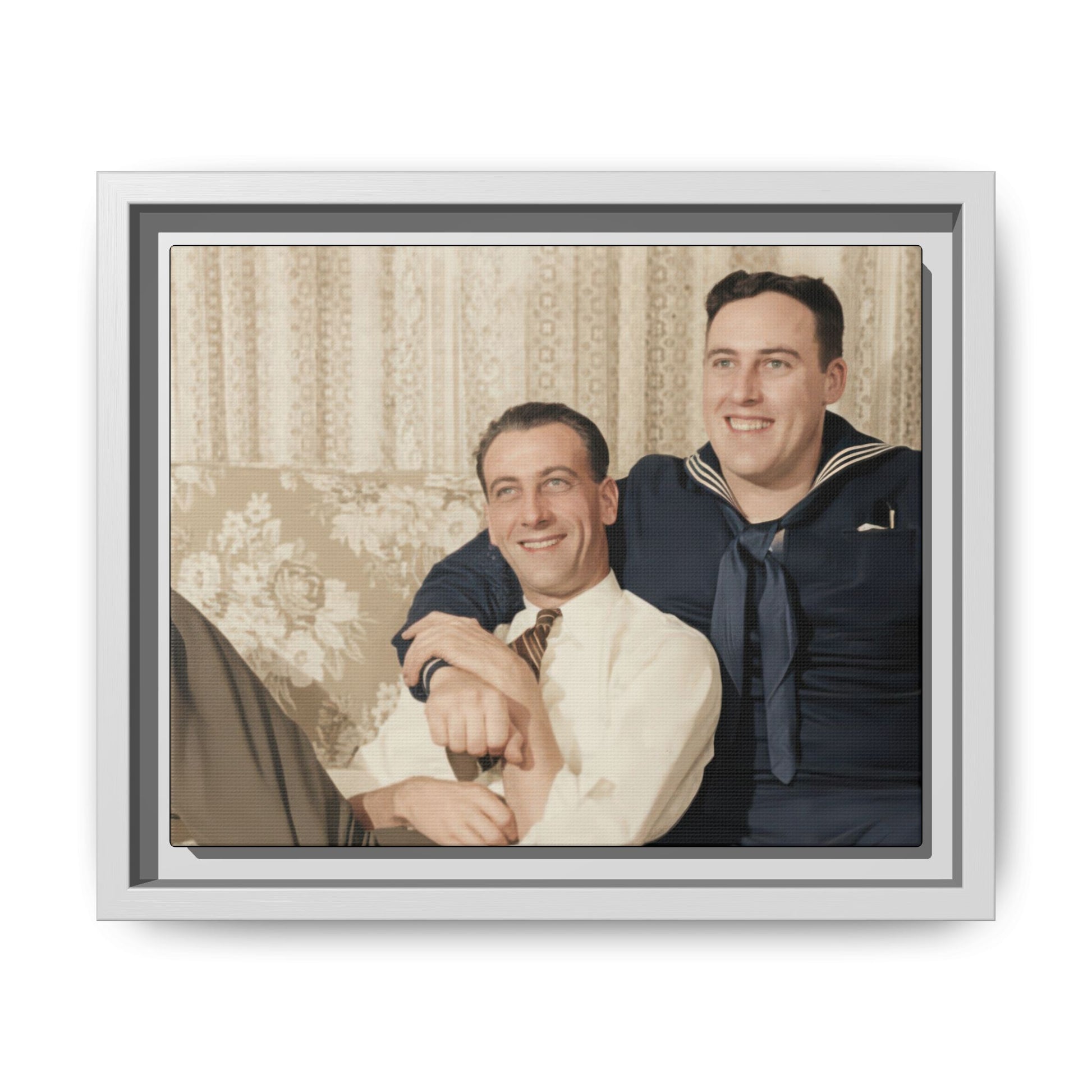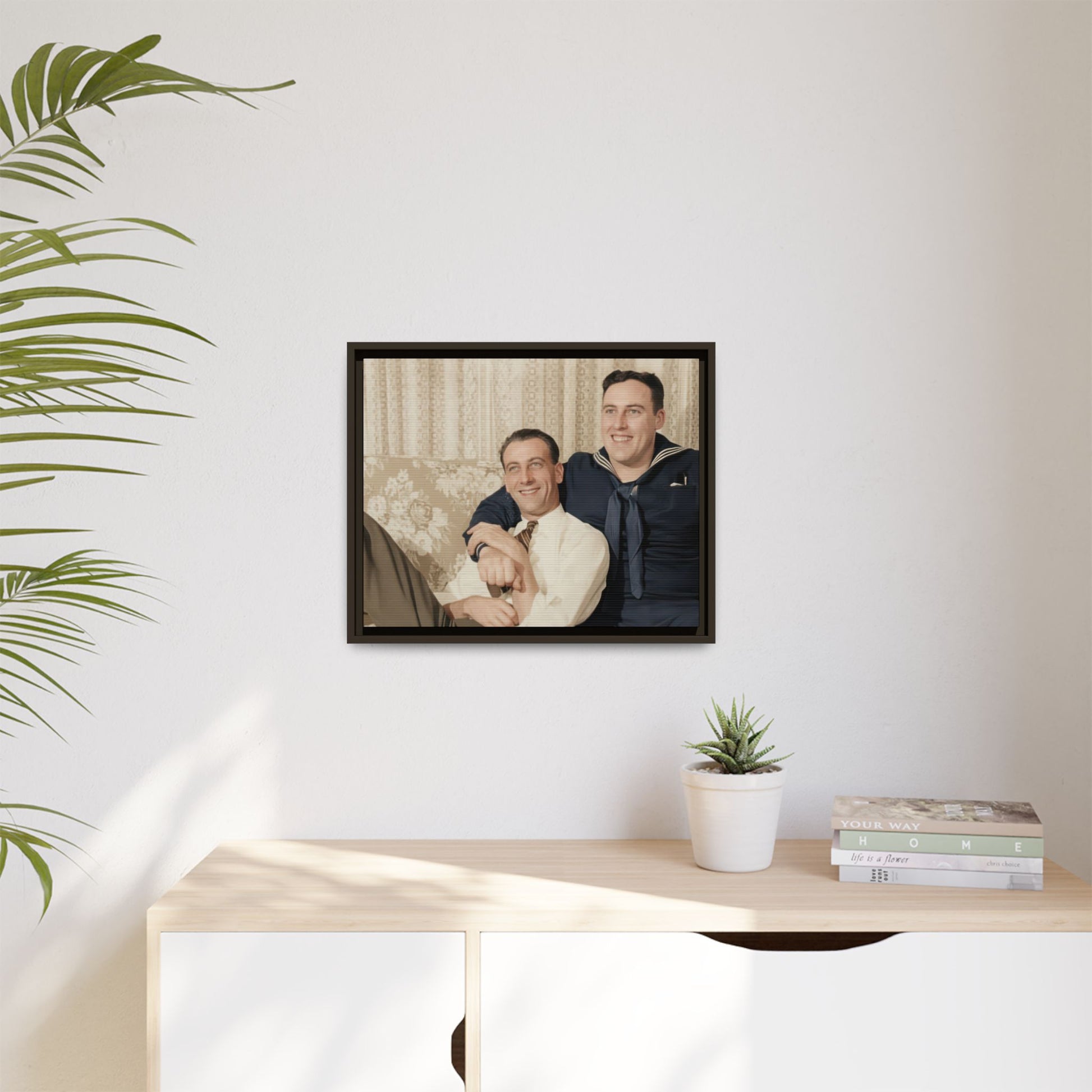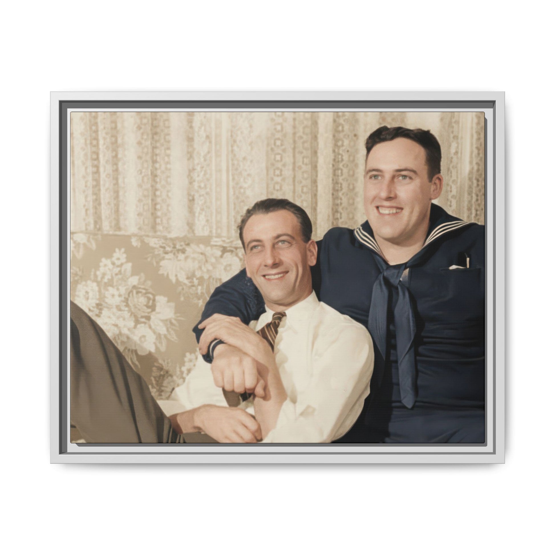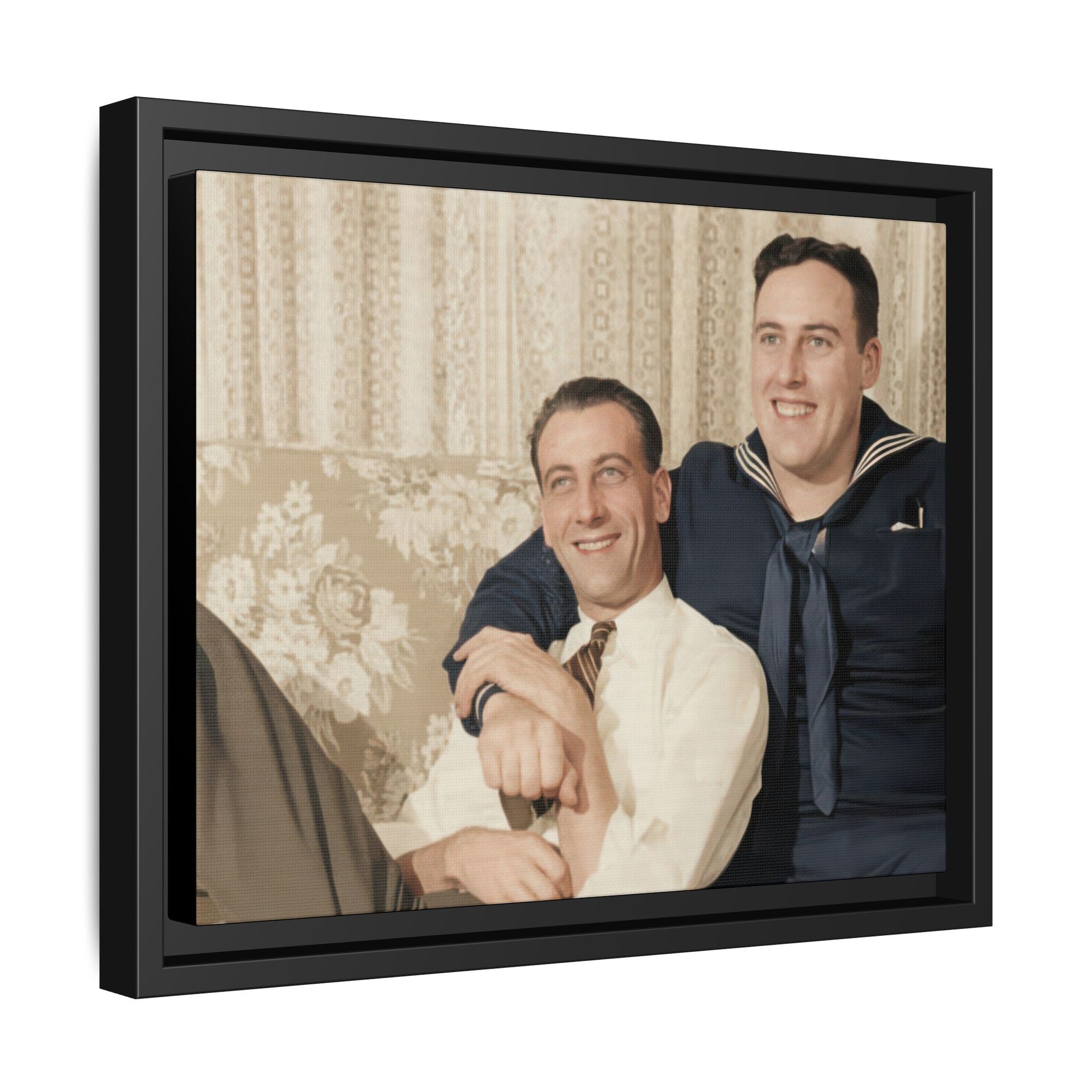 Circa 1938–1945 gelatin silver snapshot depicting two men seated on a domestic sofa, one in a U.S. Navy uniform; mild surface wear and stable tonal range representative of mid-20th-century amateur interior portrait photography.