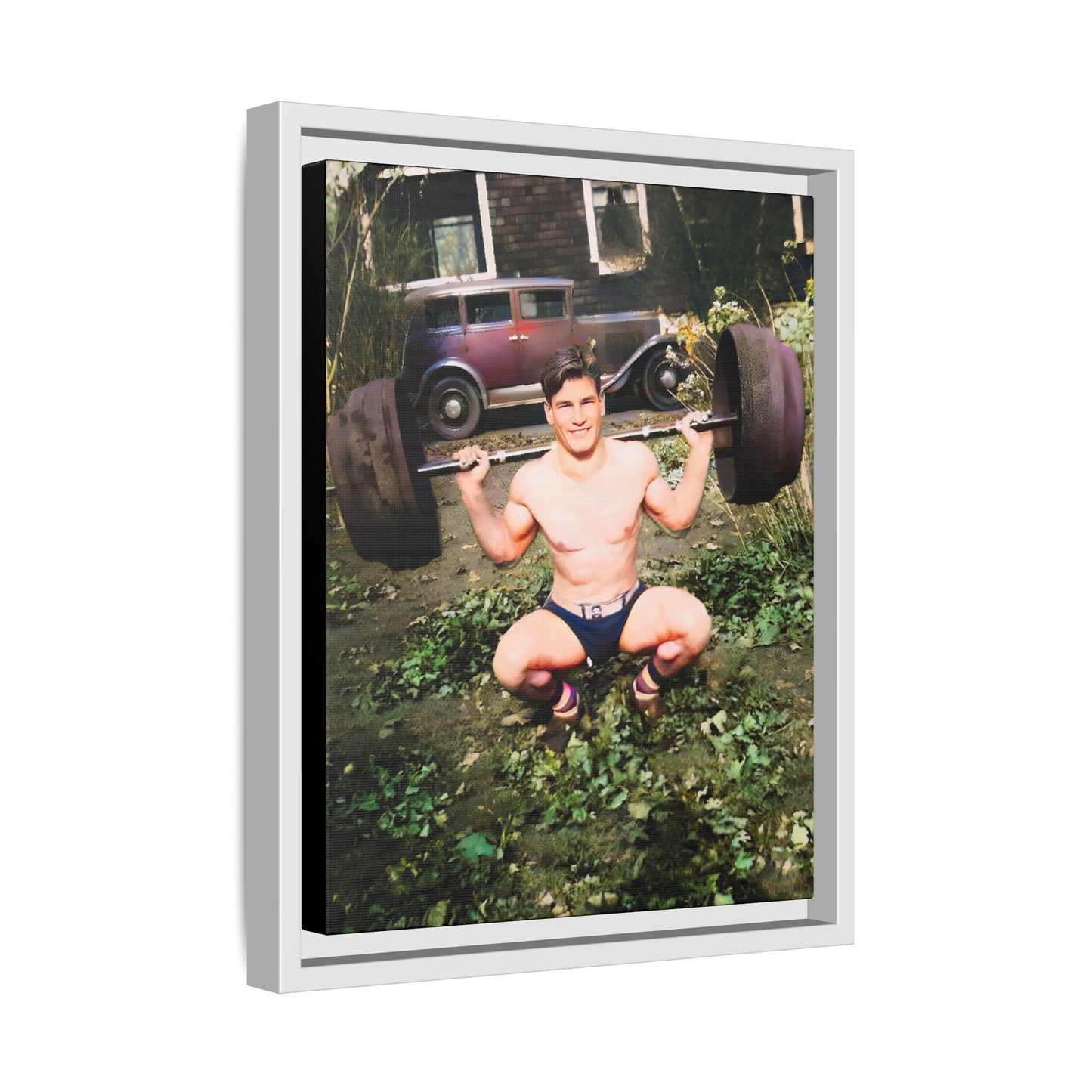 Introducing Un Homme Célibataire 018, featuring Wayne in the heart of Lake Forest, Illinois, circa 1934. This captivating image captures a moment of strength and charm, as Wayne confidently lifts a barbell in a picturesque backyard, framed by lush greenery and a vintage automobile. His smile radiates vitality, embodying the timeless appeal of resilience and determination.