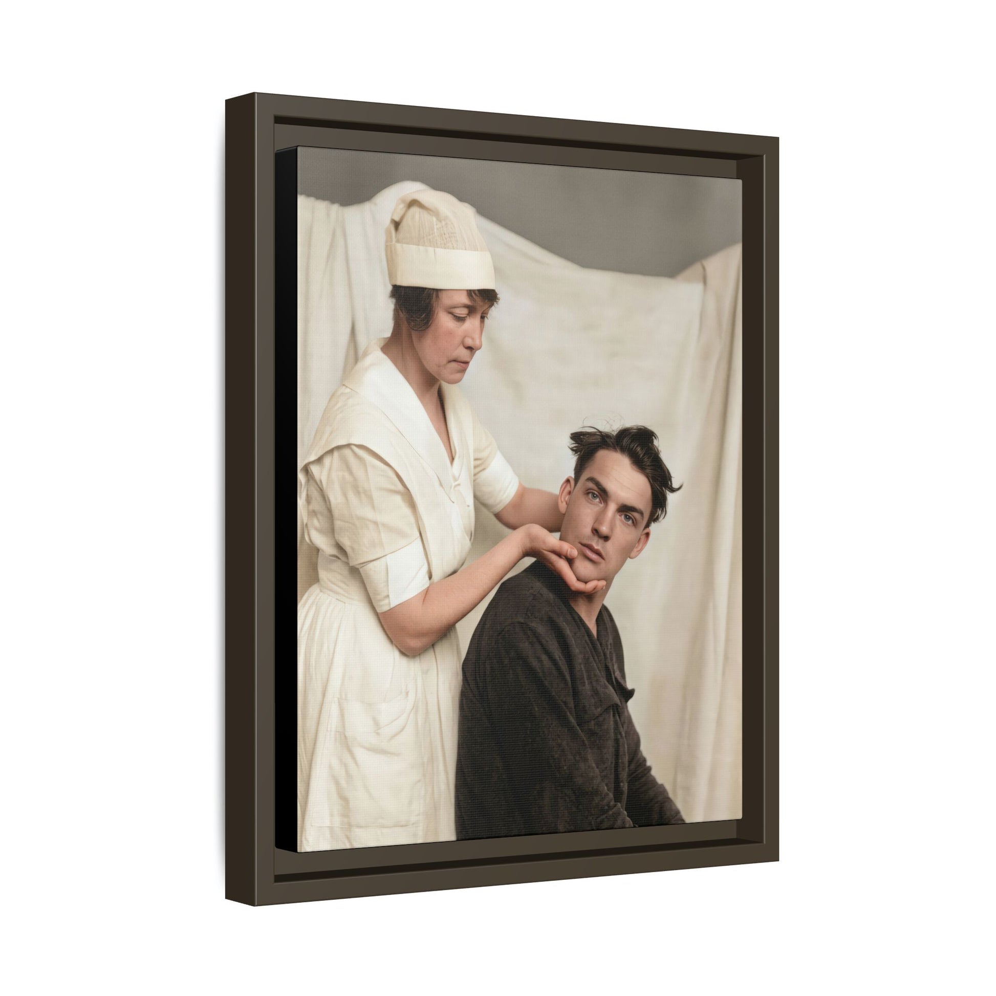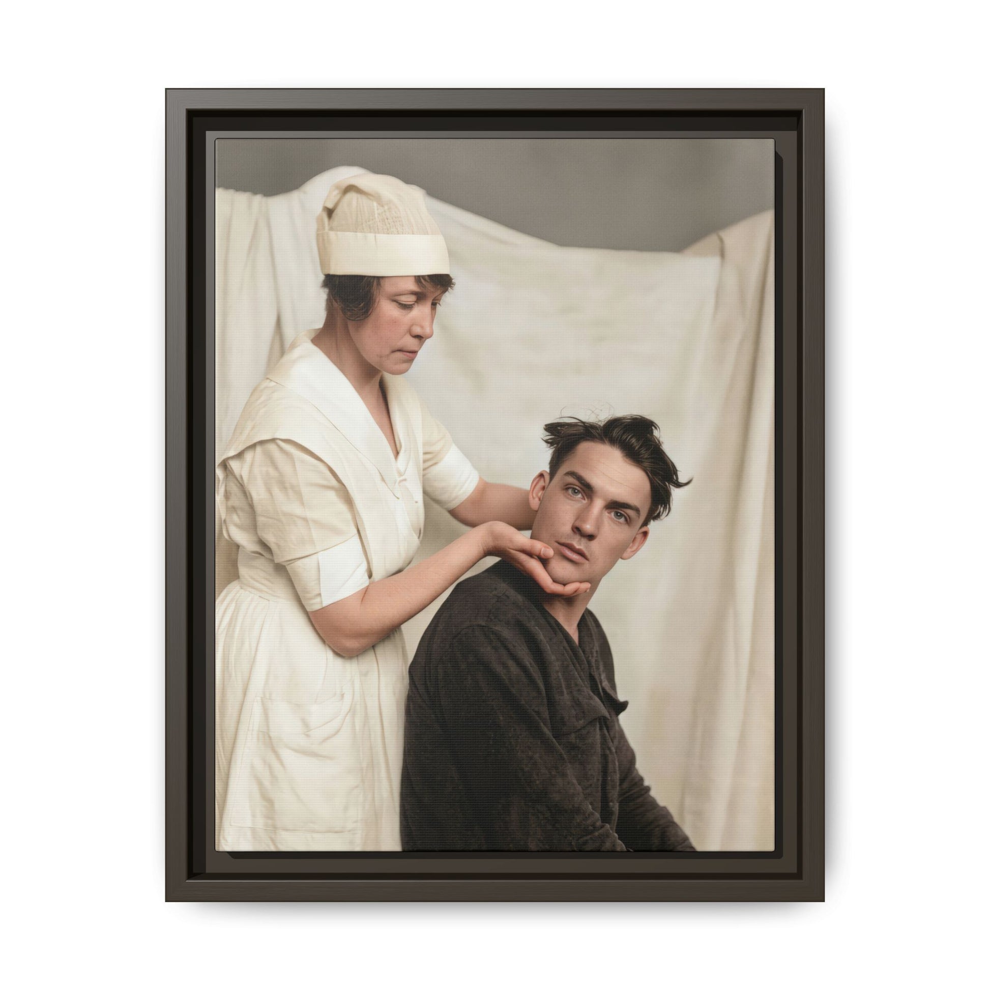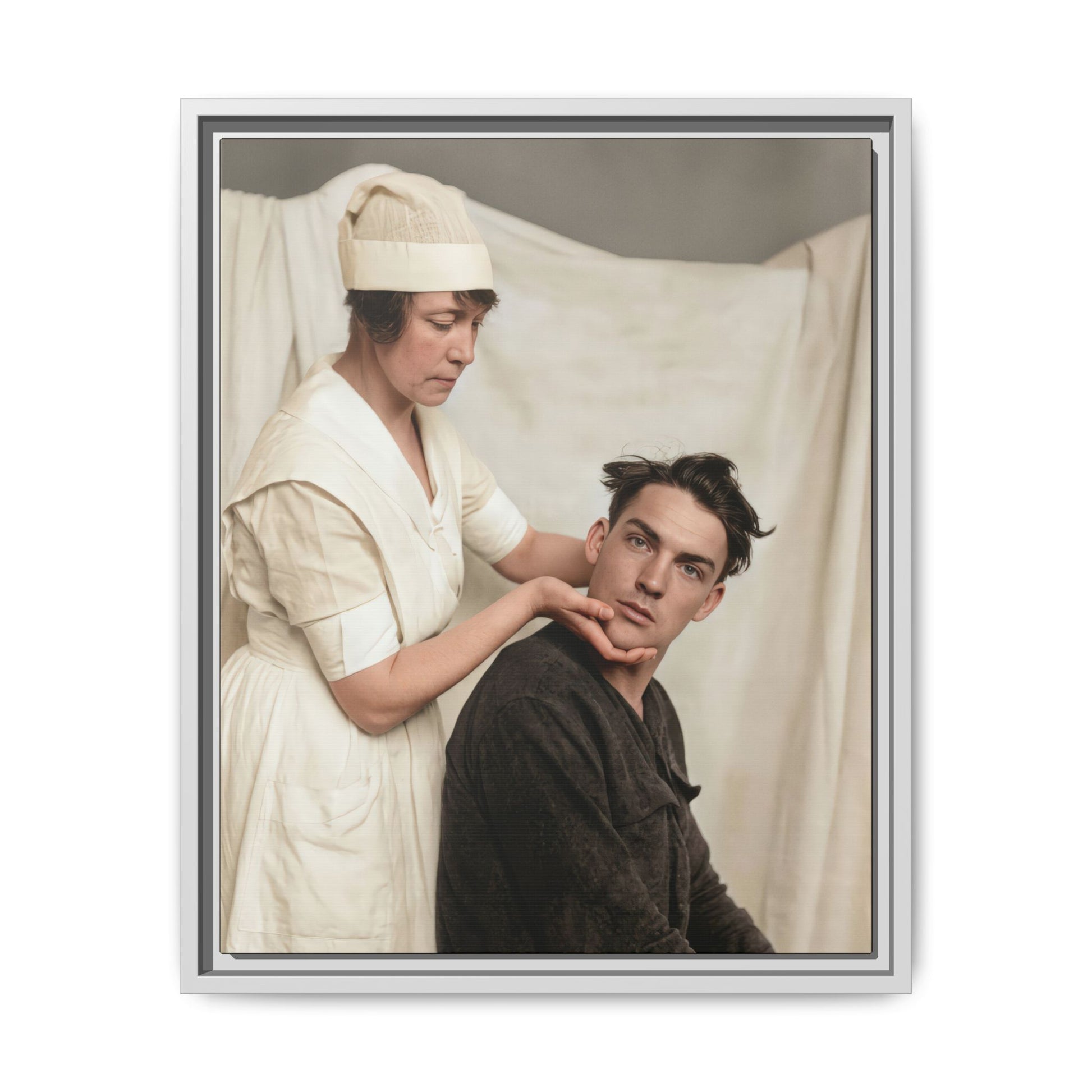 The estimated date is based on the style of the nurse’s uniform, including the structured dress, short sleeves, and cap form commonly associated with early 20th-century professional nursing attire. The seated man’s clothing and hairstyle are consistent with the late 1910s to early 1920s. The photographic tonal range and studio-like backdrop further align with gelatin silver prints widely used during this period.