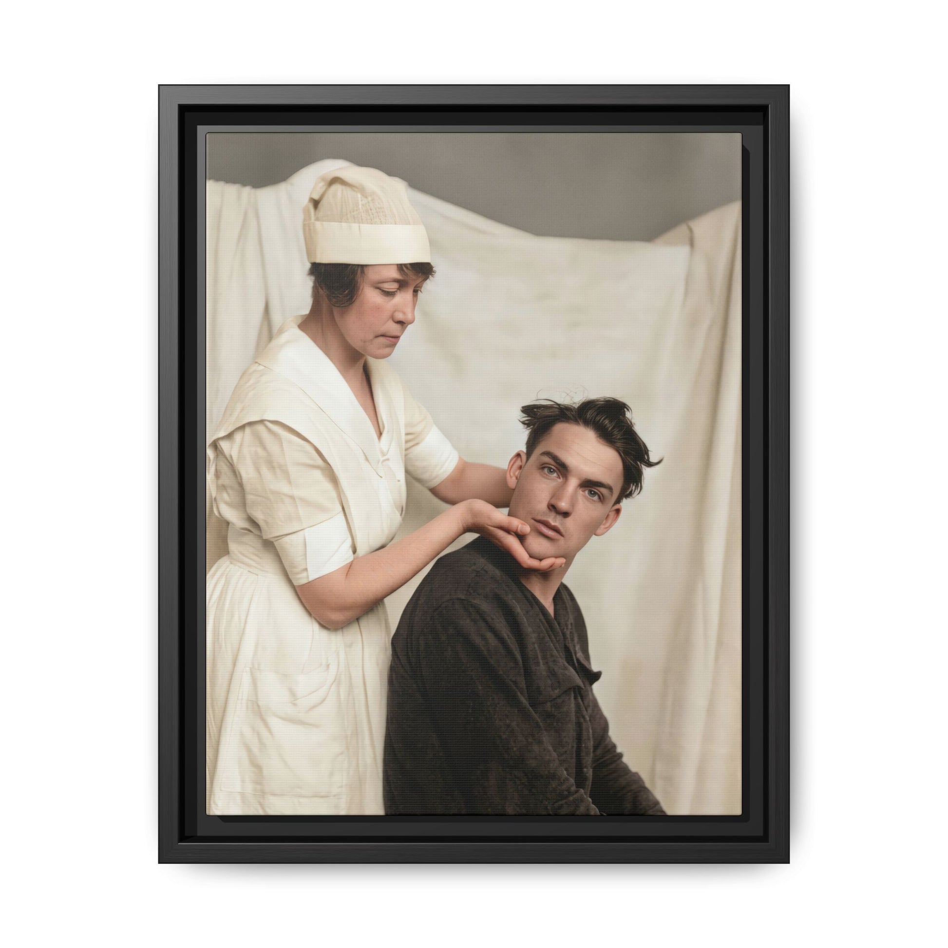 The print exhibits moderate surface wear, including visible creases and small tears along the lower edge. Minor abrasions and speckling are present throughout the image, consistent with handling and age-related deterioration. Slight tonal fading is observable in the highlights of the nurse’s uniform and the background, resulting in limited detail separation in lighter areas. The darker garment of the seated subject retains stronger tonal definition but shows mild compression in shadow regions. Edge wear is visible, particularly at the lower margin, where paper loss appears to have occurred. These condition issues moderately affect overall legibility and structural stability. Conservation measures such as flattening, edge stabilization, and archival housing would help prevent further deterioration and preserve image clarity.