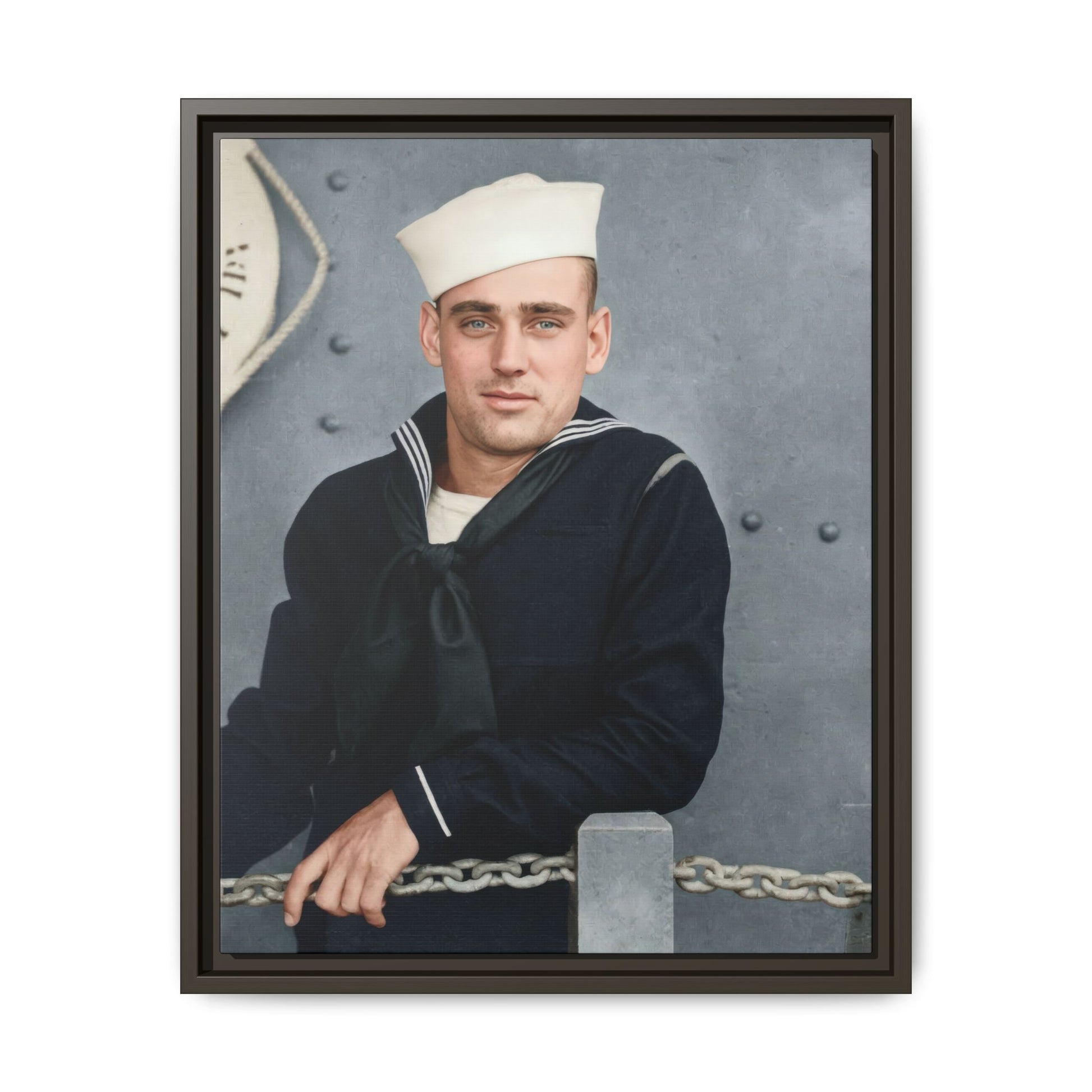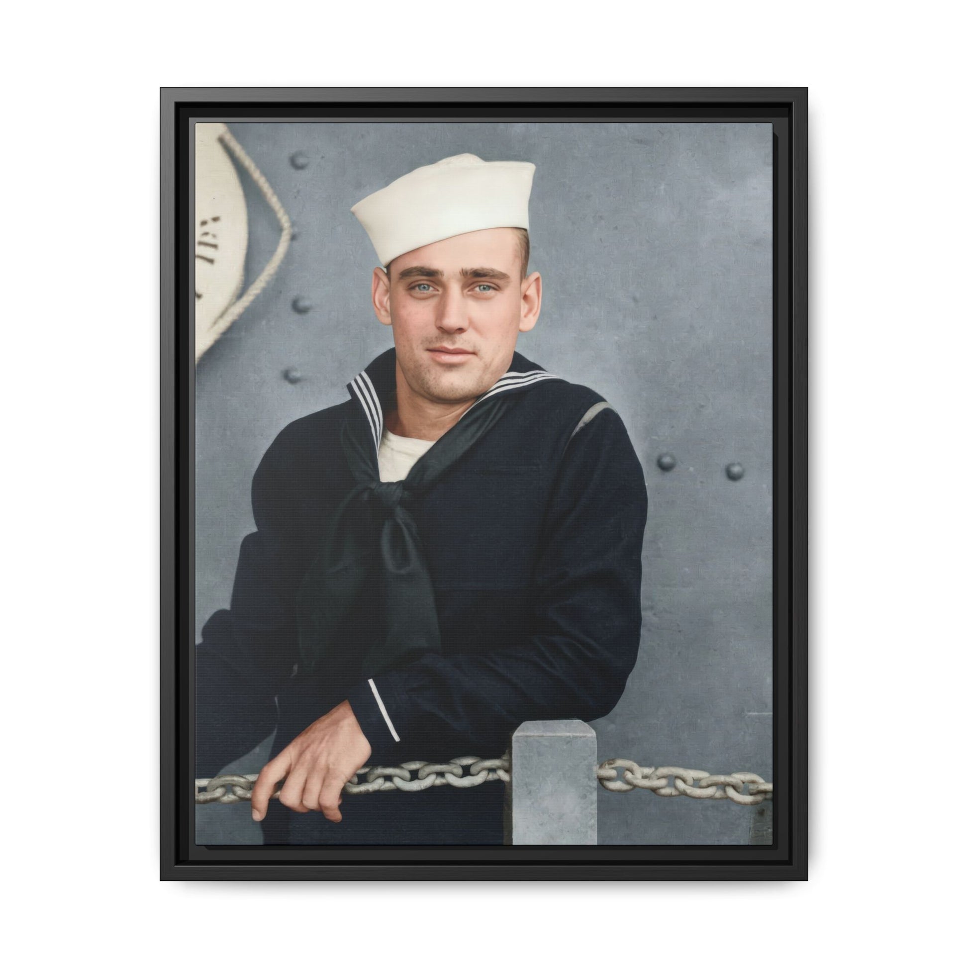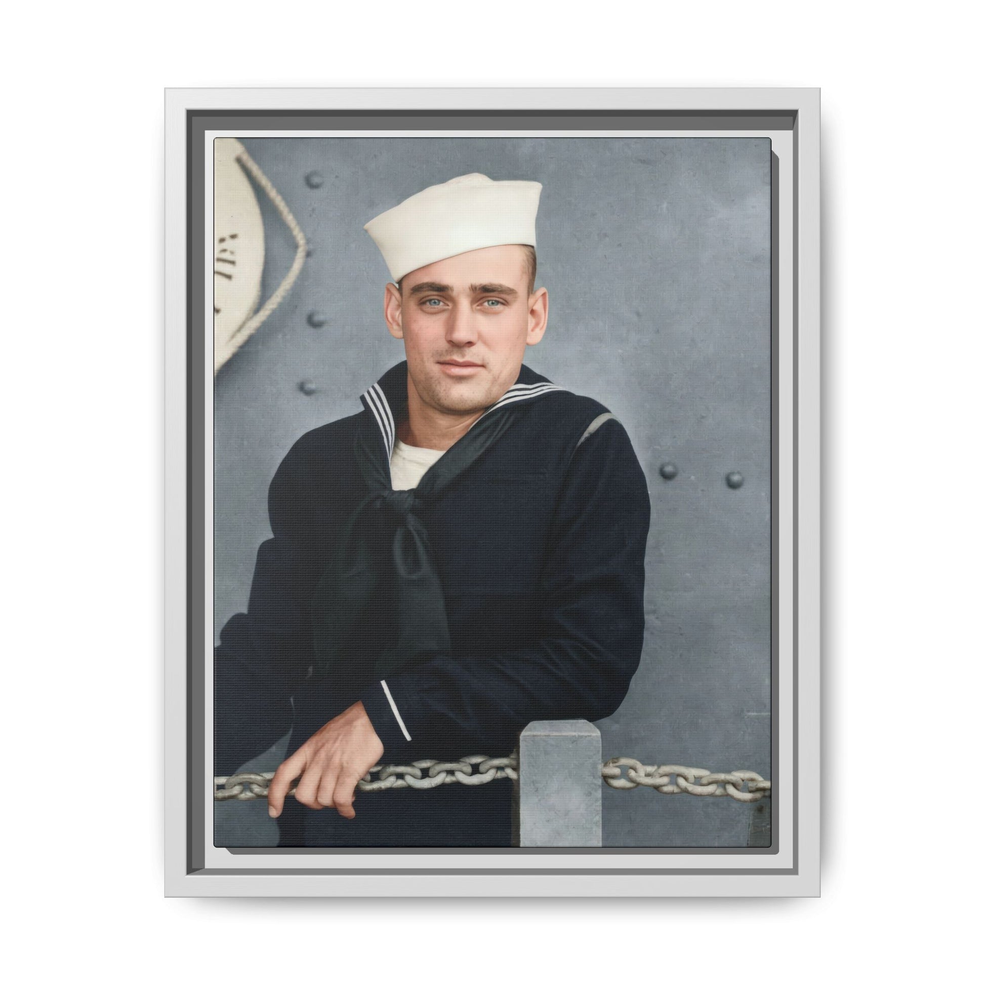The neutral grayscale tonal range, matte surface appearance, and moderate contrast structure indicate a gelatin silver developing-out paper print, the dominant black-and-white photographic process from the late 1890s through the early 20th century. The formal pose and maritime-themed backdrop suggest a commercial or semi-commercial portrait context, possibly produced for personal commemoration during naval service. During the 1910s, military portraiture became widespread due to increased enlistments and the accessibility of studio photography. The absence of studio imprints or inscriptions limits precise attribution. Research is constrained by missing provenance and contextual documentation.
