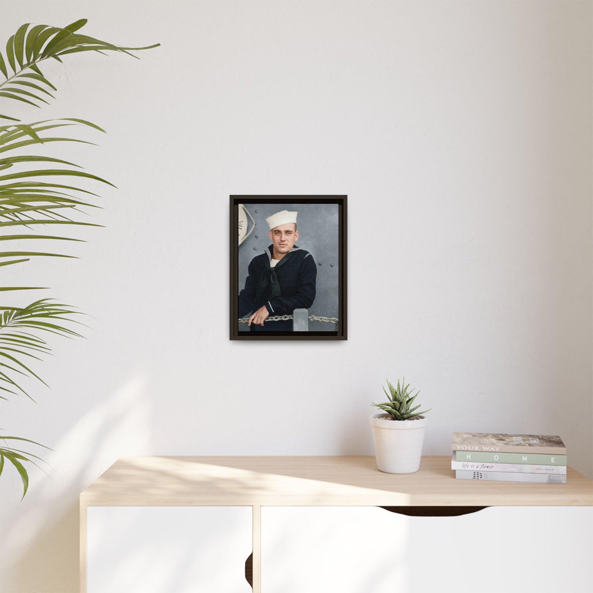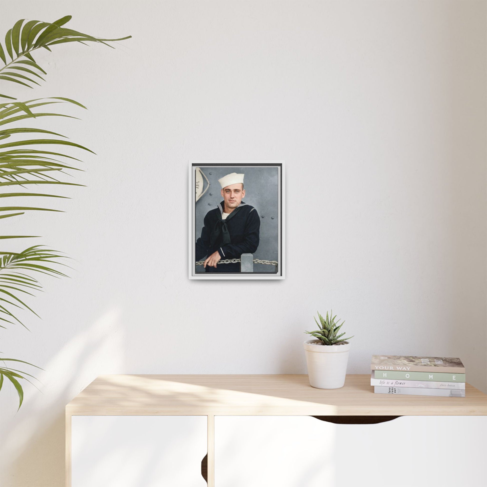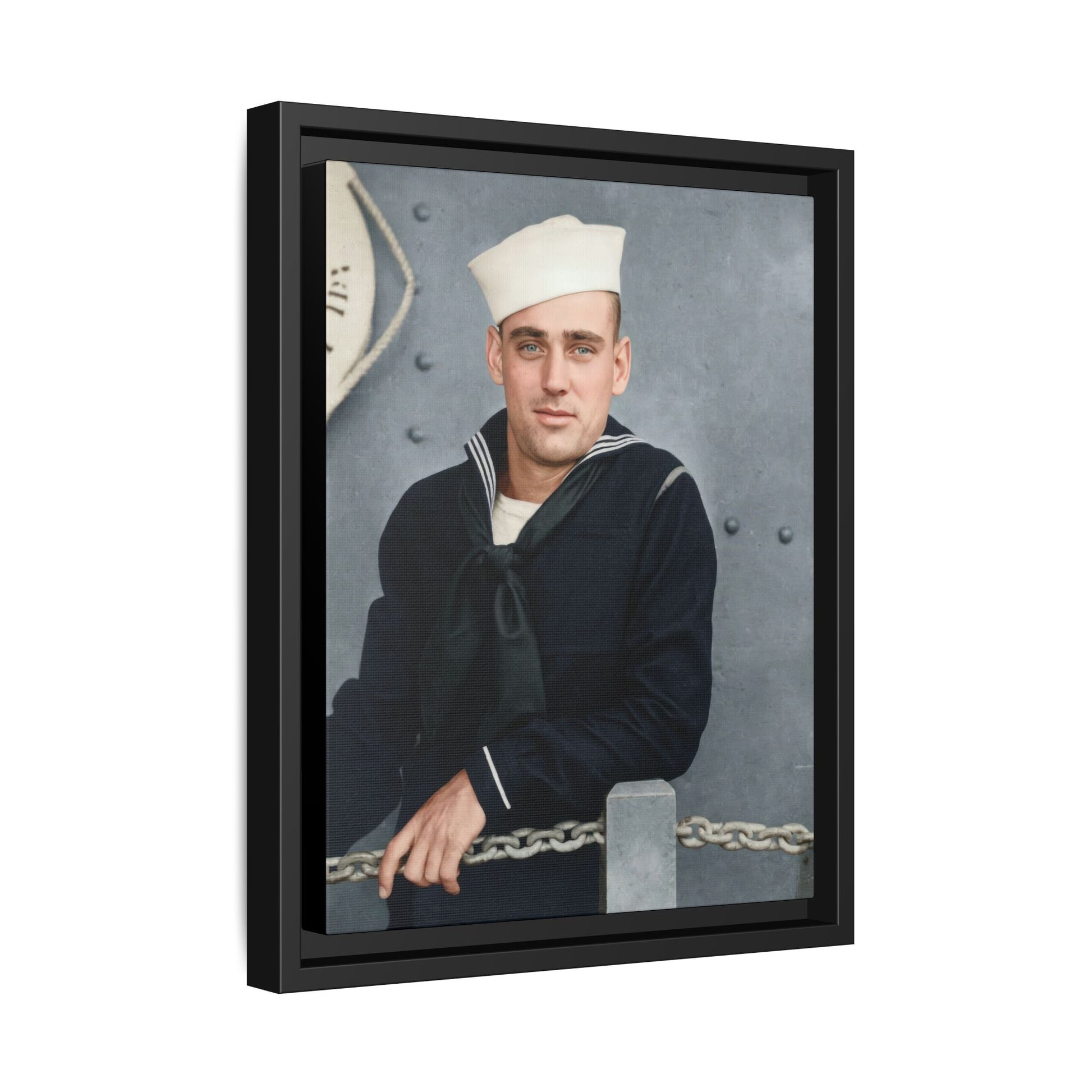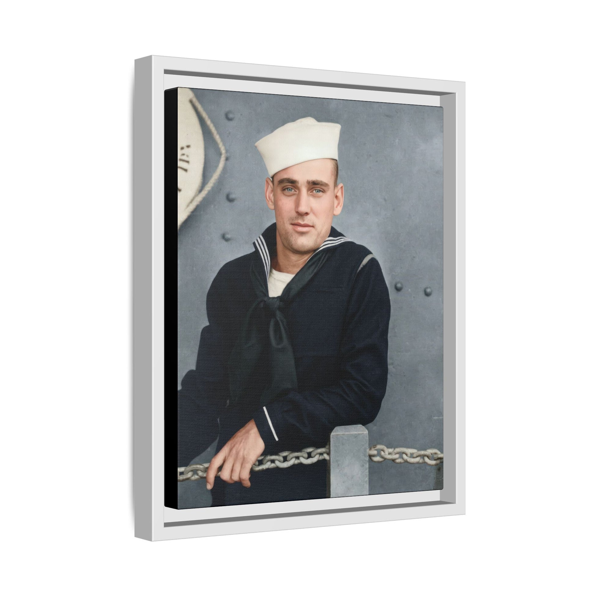 The neutral grayscale tonal range, matte surface appearance, and moderate contrast structure indicate a gelatin silver developing-out paper print, the dominant black-and-white photographic process from the late 1890s through the early 20th century. The formal pose and maritime-themed backdrop suggest a commercial or semi-commercial portrait context, possibly produced for personal commemoration during naval service. During the 1910s, military portraiture became widespread due to increased enlistments and the accessibility of studio photography. The absence of studio imprints or inscriptions limits precise attribution. Research is constrained by missing provenance and contextual documentation.
