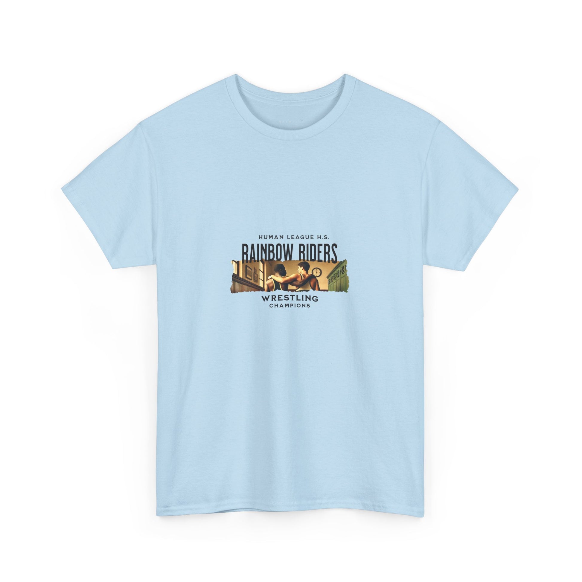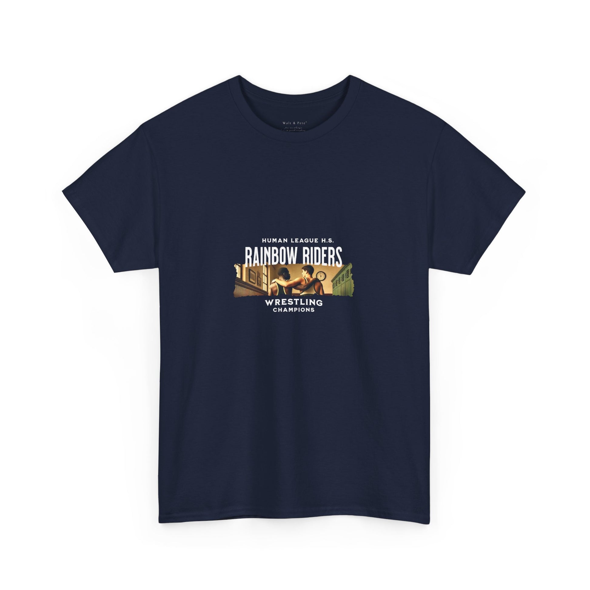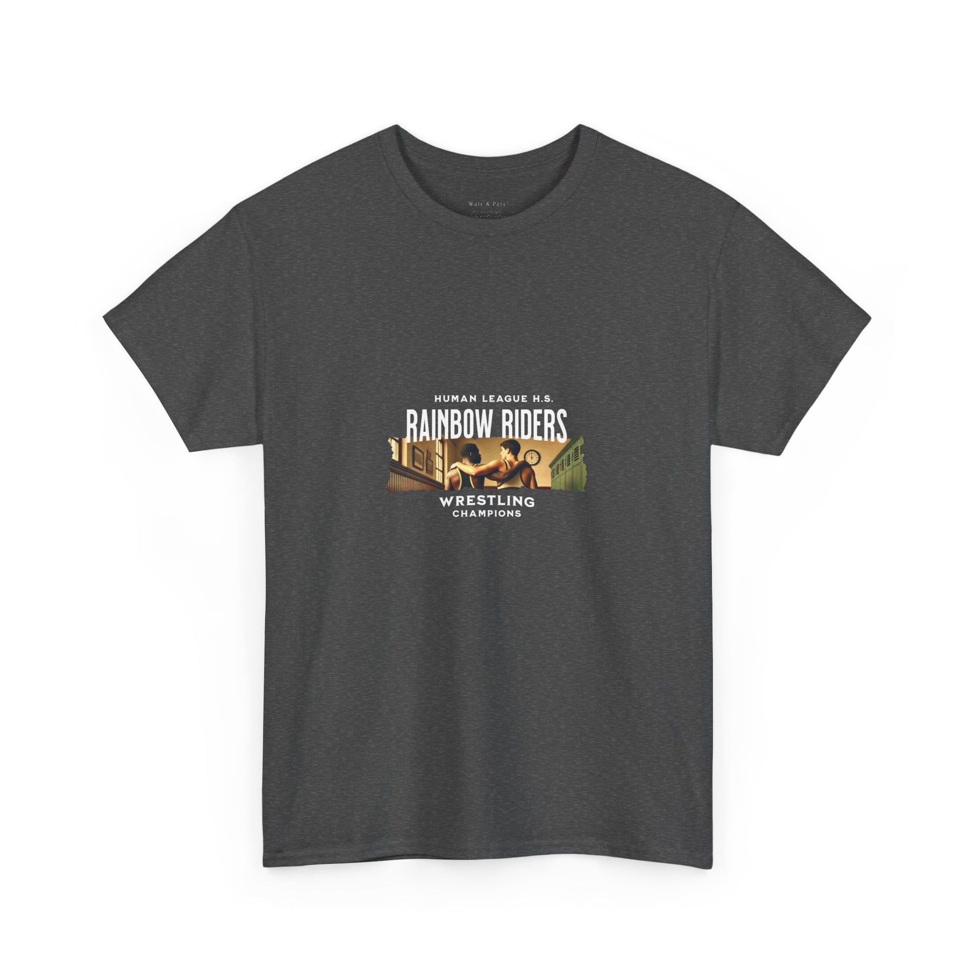 Celebrate pride and inclusion with this Rainbow Riders | Wrestling Champions - 001 Pride T-Shirt. Featuring a striking vintage-inspired design, this shirt showcases two athletes on a wrestling mat with the bold text "Human League H.S. Rainbow Riders Wrestling Champions." Crafted from 100% cotton, the shirt offers a soft, breathable feel with a medium-weight fabric (5.3 oz/yd² / 180 g/m²) that’s durable yet comfortable. The classic unisex fit ensures it suits all body types, and the tear-away label adds to the clean, versatile style.