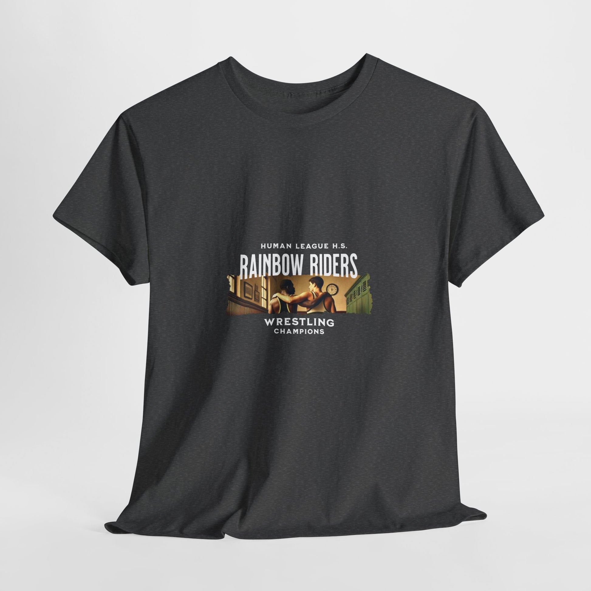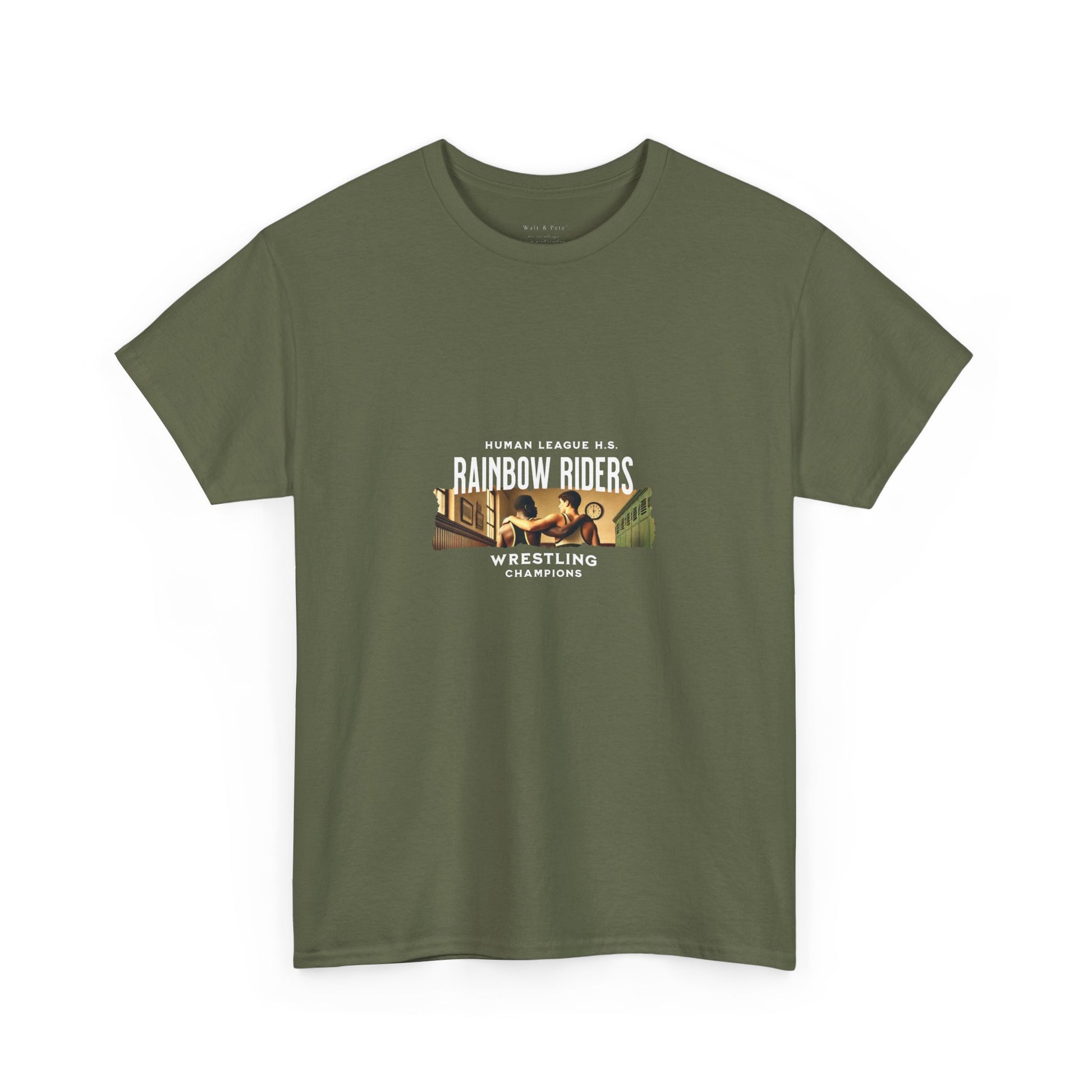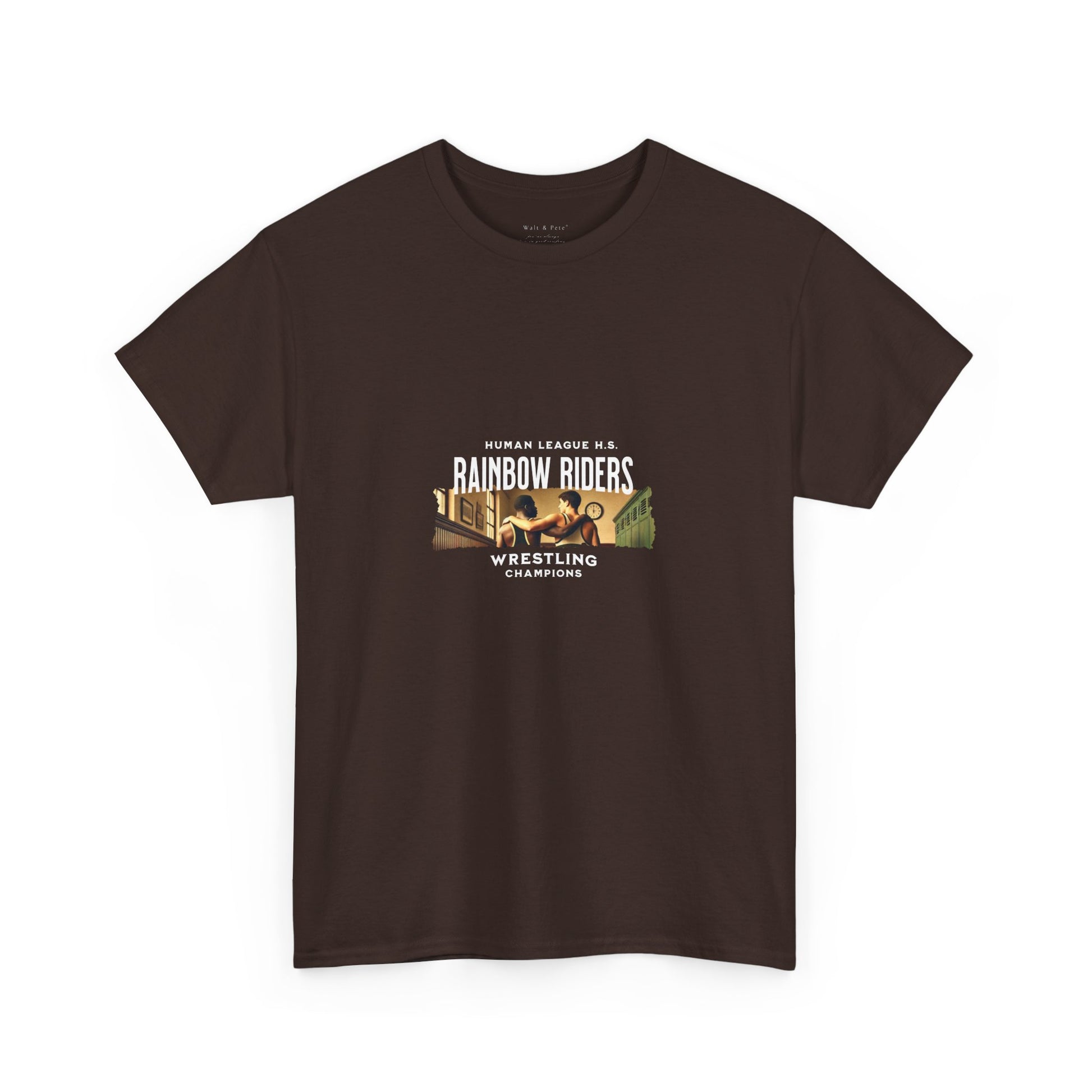 Celebrate pride and inclusion with this Rainbow Riders | Wrestling Champions - 001 Pride T-Shirt. Featuring a striking vintage-inspired design, this shirt showcases two athletes on a wrestling mat with the bold text "Human League H.S. Rainbow Riders Wrestling Champions." Crafted from 100% cotton, the shirt offers a soft, breathable feel with a medium-weight fabric (5.3 oz/yd² / 180 g/m²) that’s durable yet comfortable. The classic unisex fit ensures it suits all body types, and the tear-away label adds to the clean, versatile style.