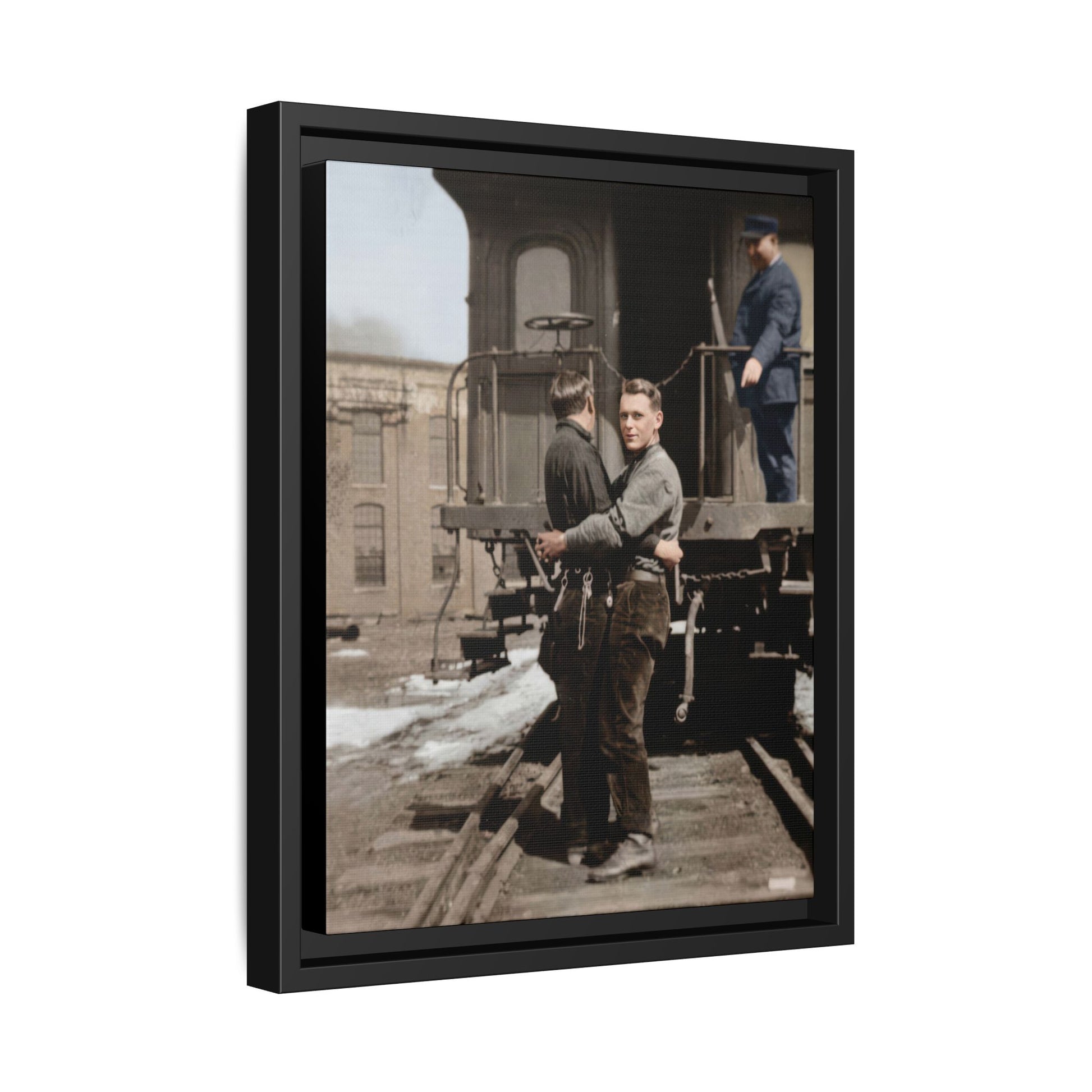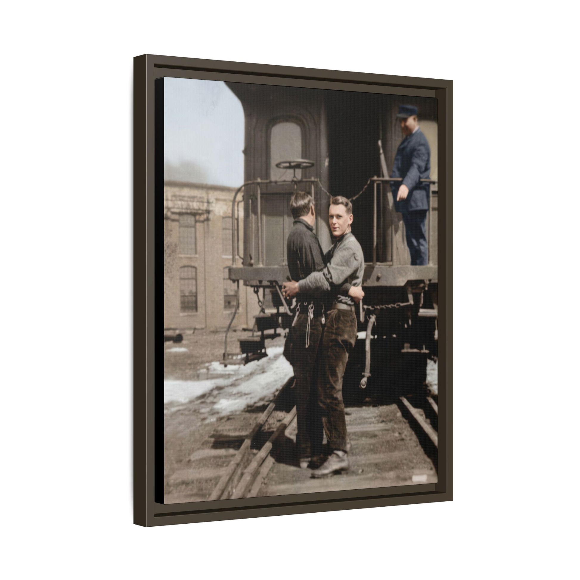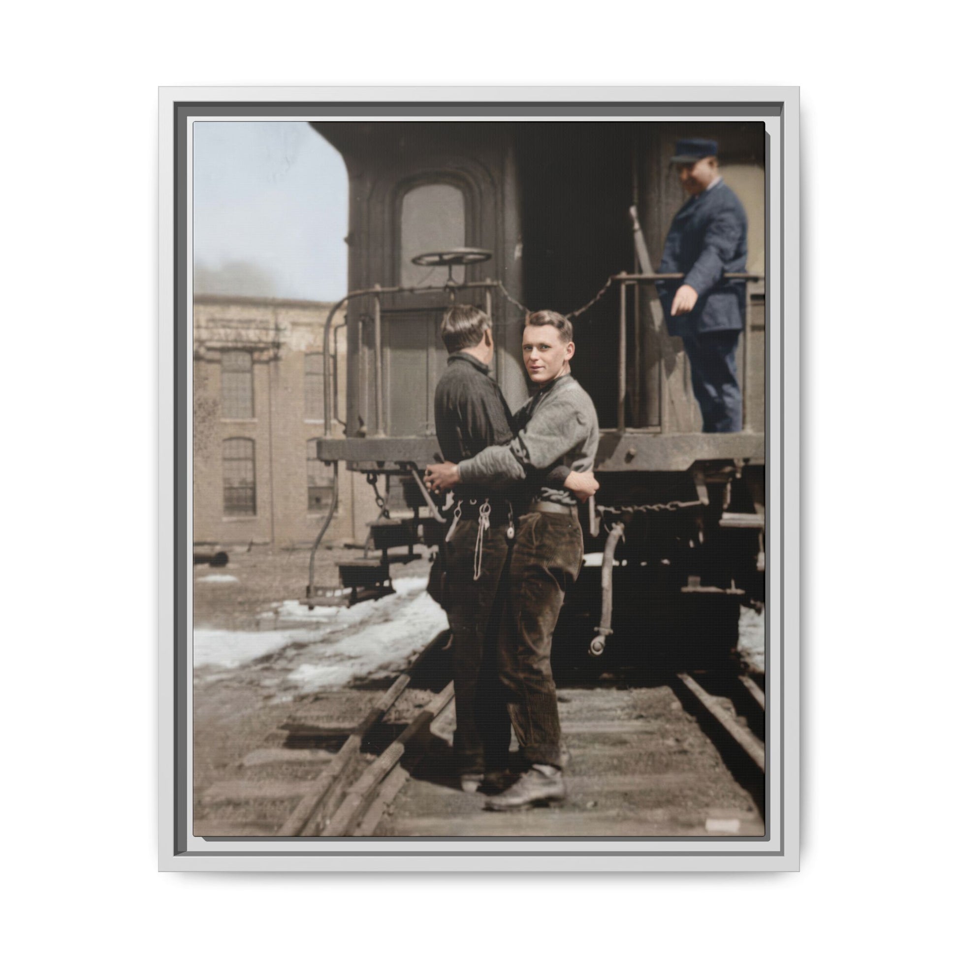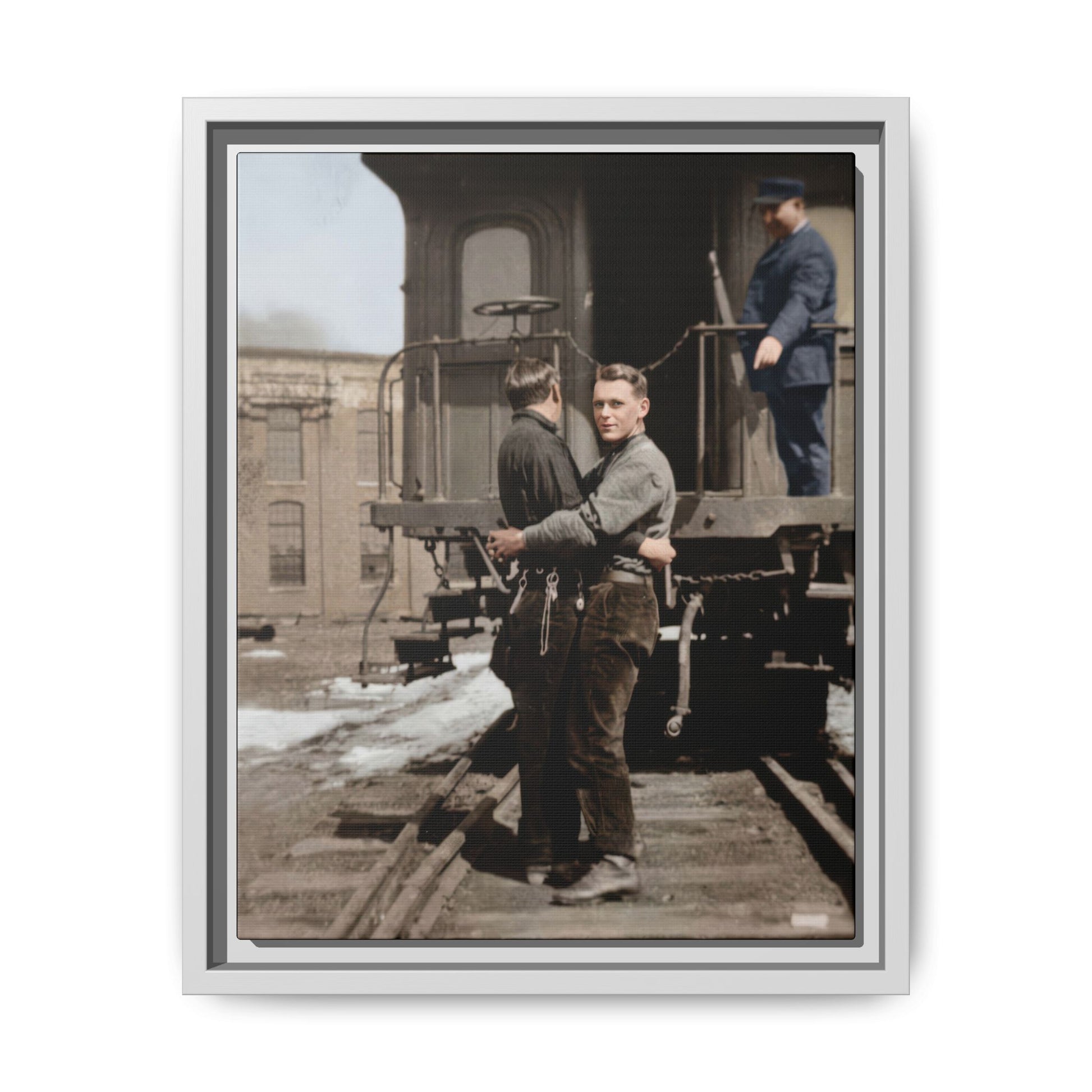 Title: Two Railroad Workers Embracing on Track Before Railcar