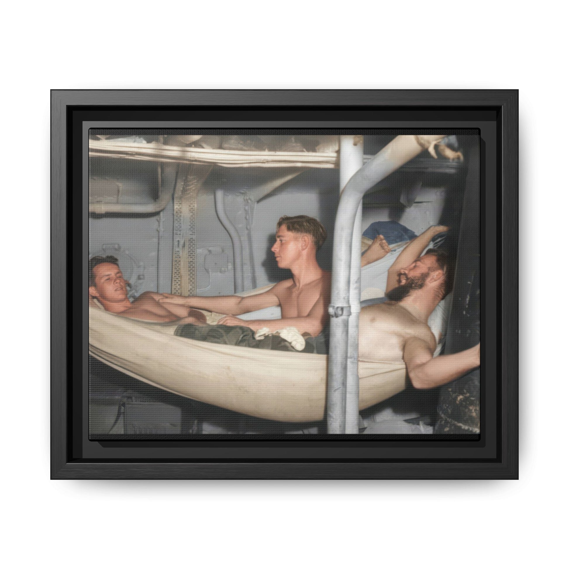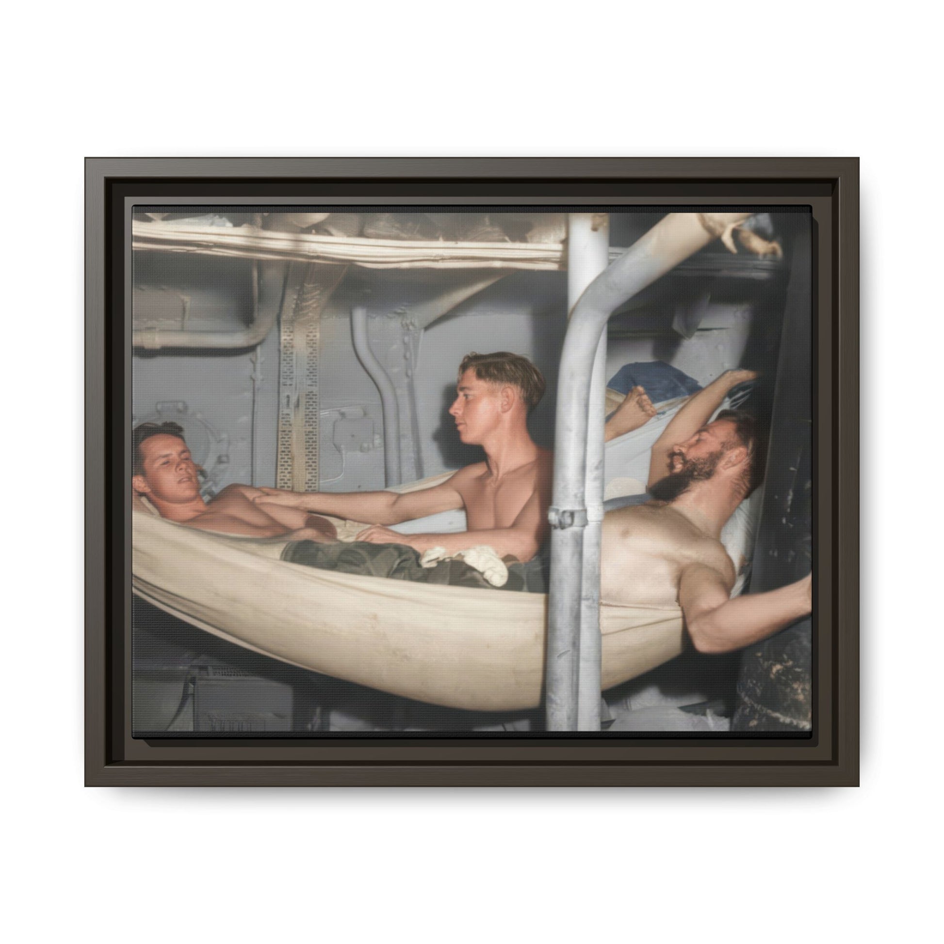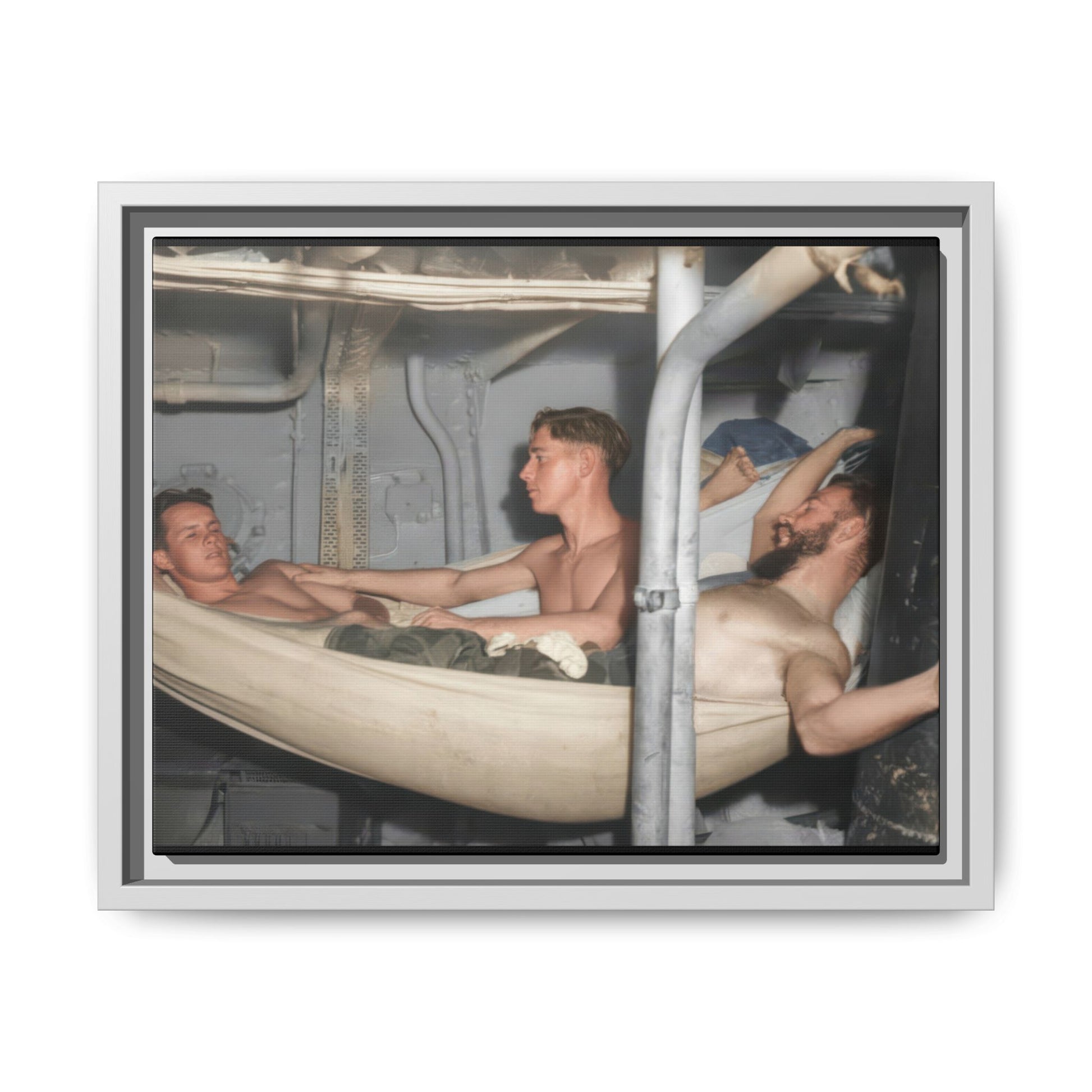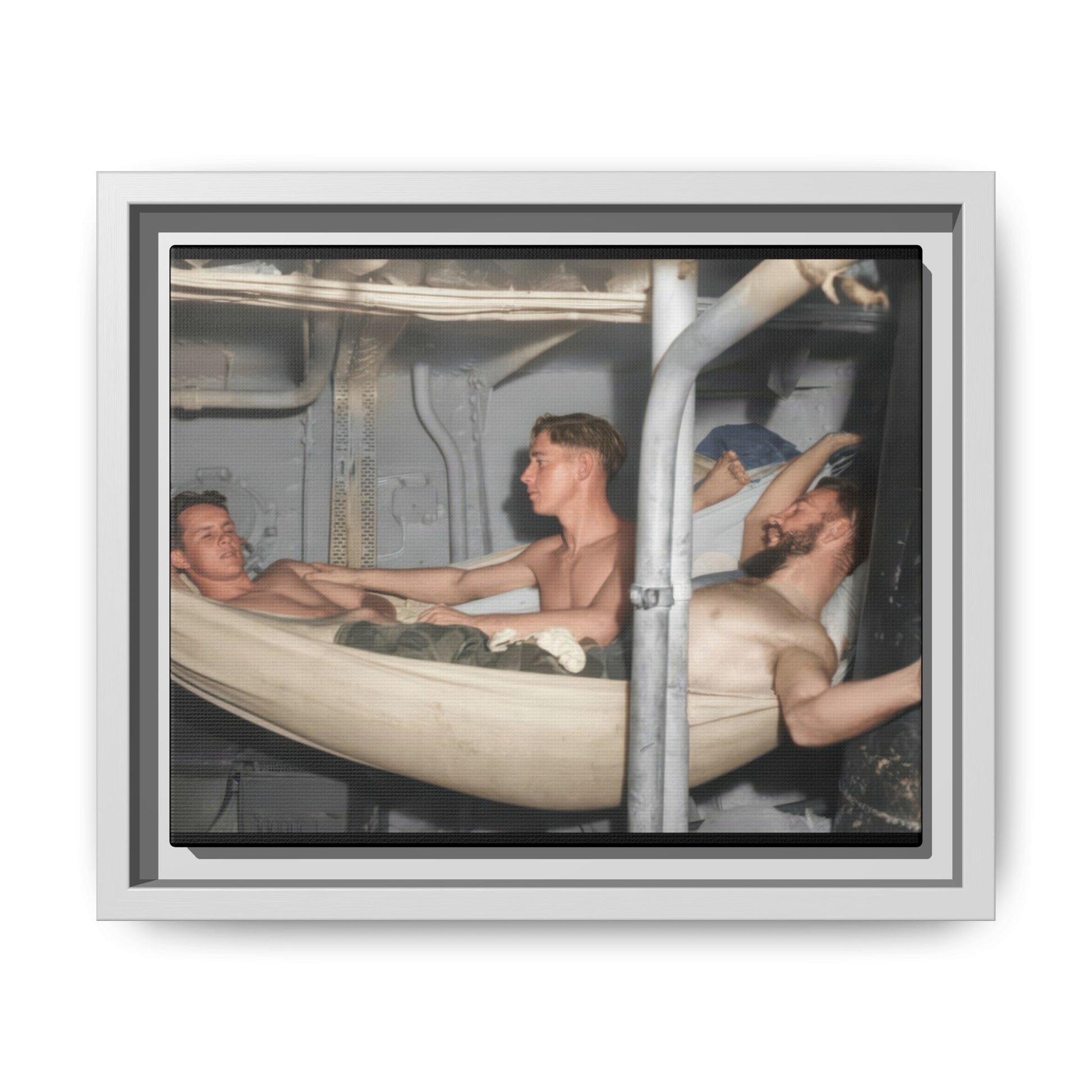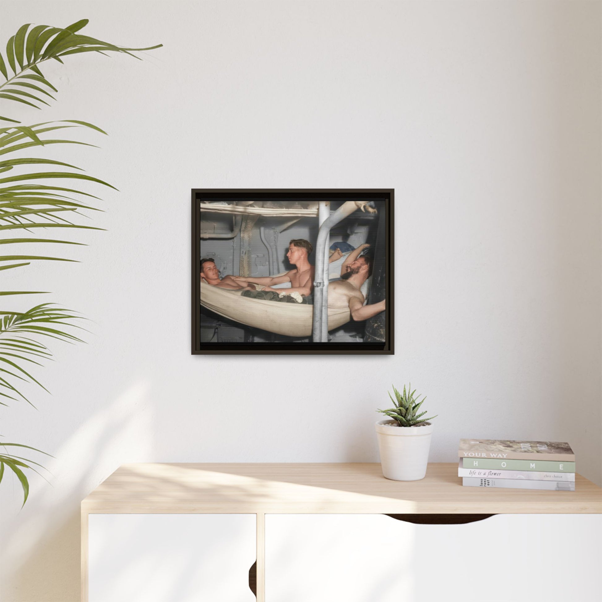 Title: Three Men Resting in Canvas Hammock within Ship Interior