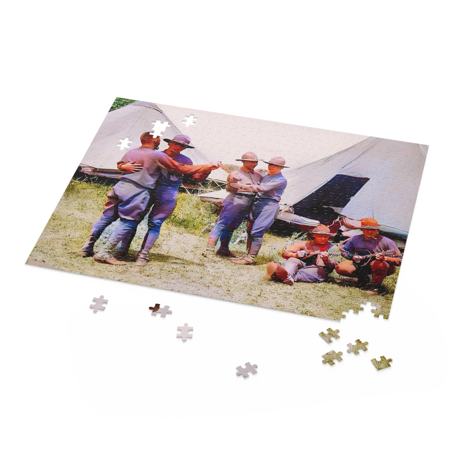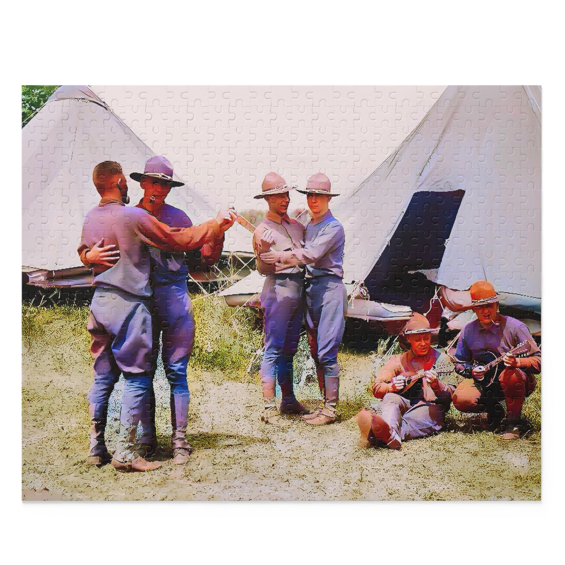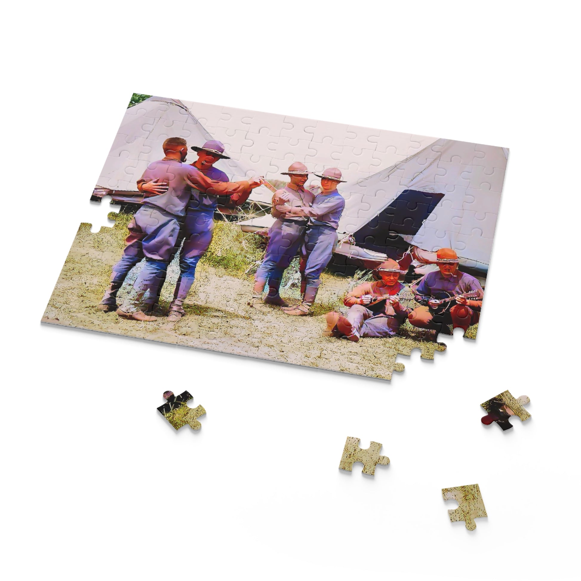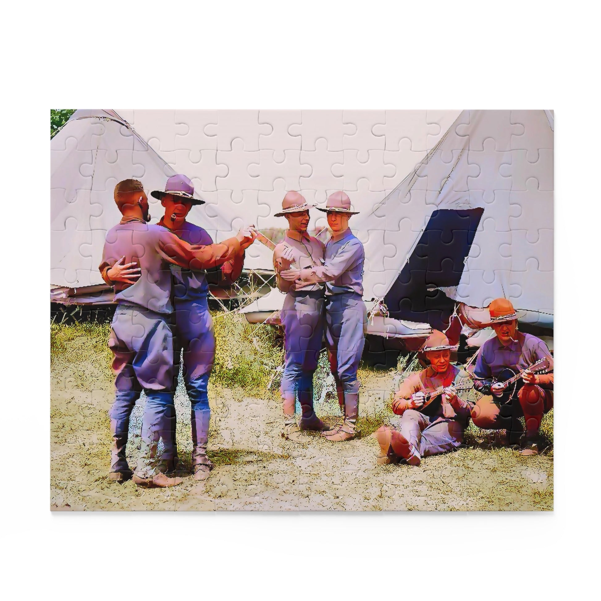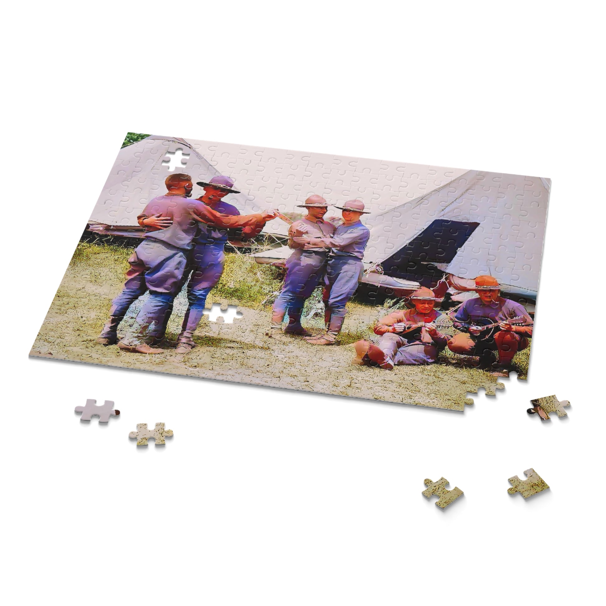 Step back in time to 1918 with this nostalgic jigsaw puzzle. It features a heartwarming scene of soldiers enjoying a moment of camaraderie at the Marine Corps Recruit Depot in Parris Island. In the foreground, musicians play lively tunes while soldiers dance with one another, their joy evident against the backdrop of military tents. This puzzle beautifully captures the spirit of brotherhood and the simple pleasures found amidst the challenges of wartime.