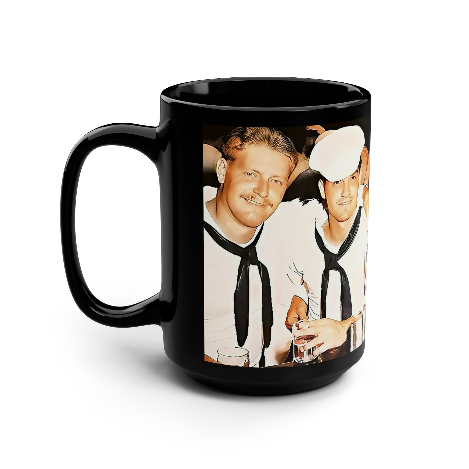 These black mugs come in one size – 15oz (0.44l) – plenty for morning caffeine boosts and hot cups of tea on a rainy day. They're easy to grip and feel sturdy thanks to the C-shaped handle. They are printed on black ceramic material in picture-perfect quality with a glossy finish.