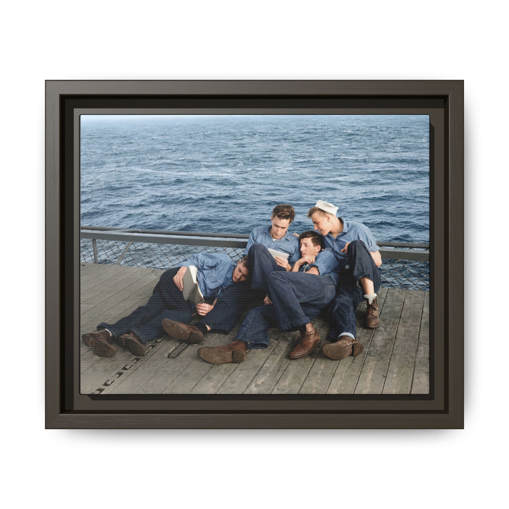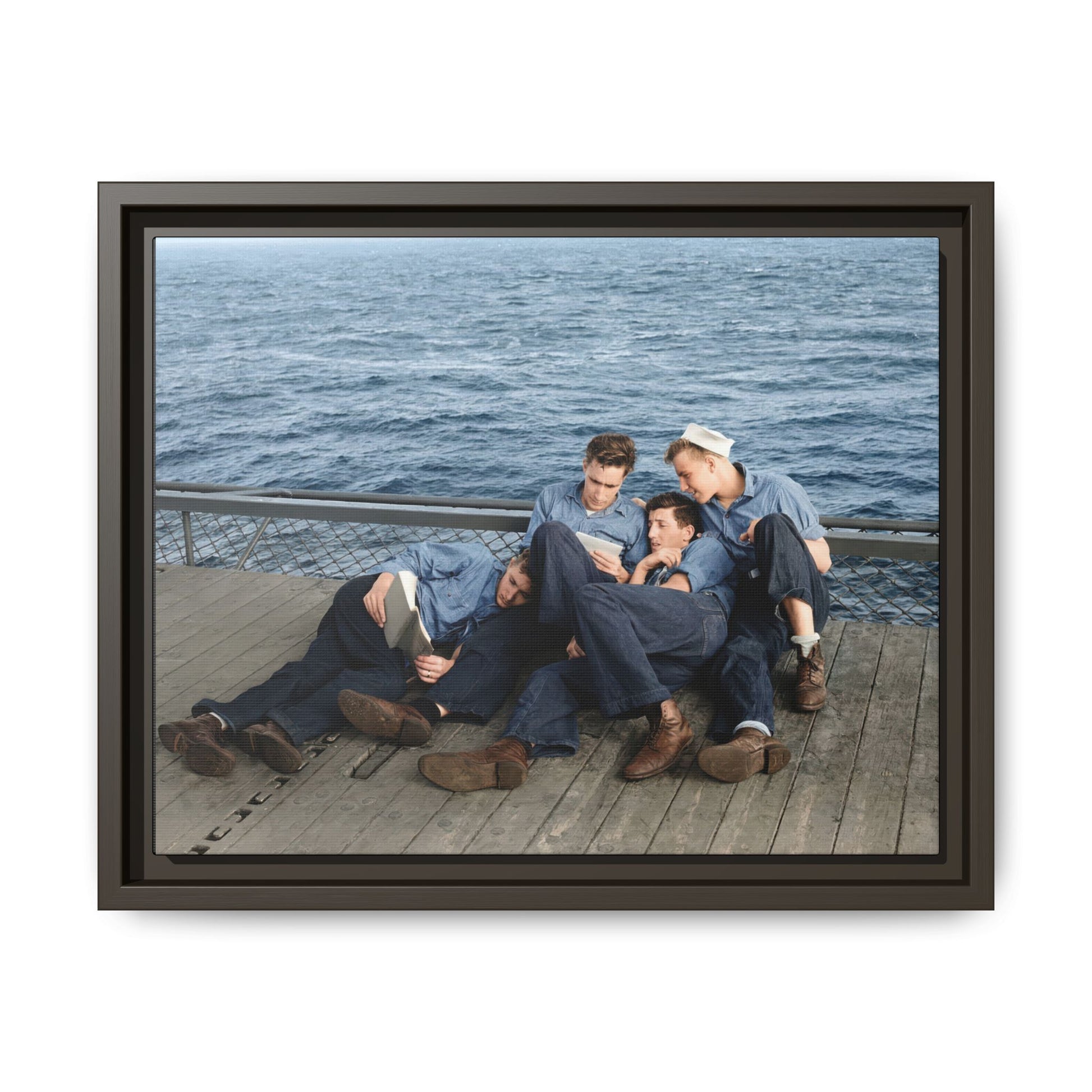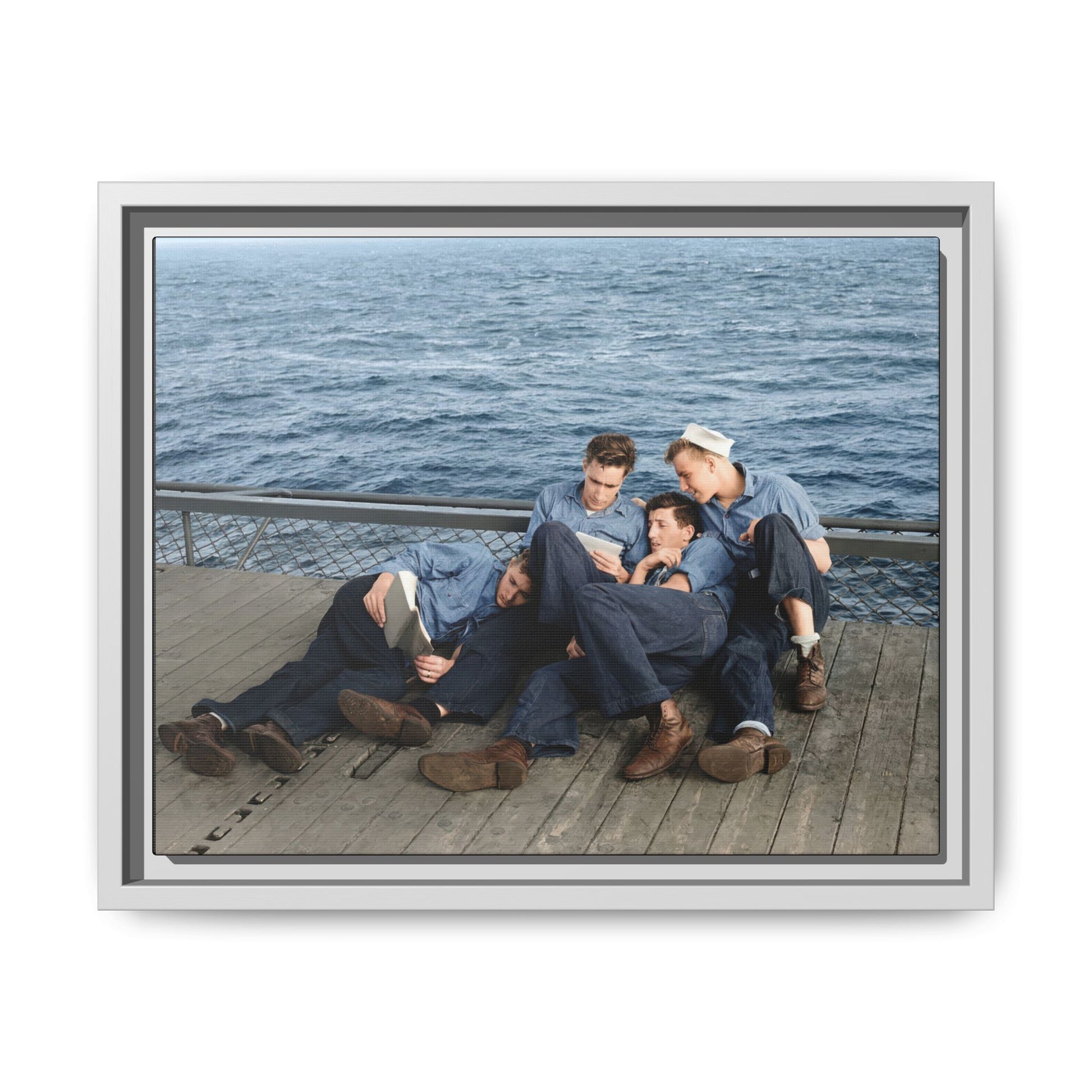 c. 1942–1946 gelatin silver snapshot depicting four men reclining on a ship deck with books; moderate tonal compression and minor surface wear consistent with mid-twentieth-century vernacular maritime photography.