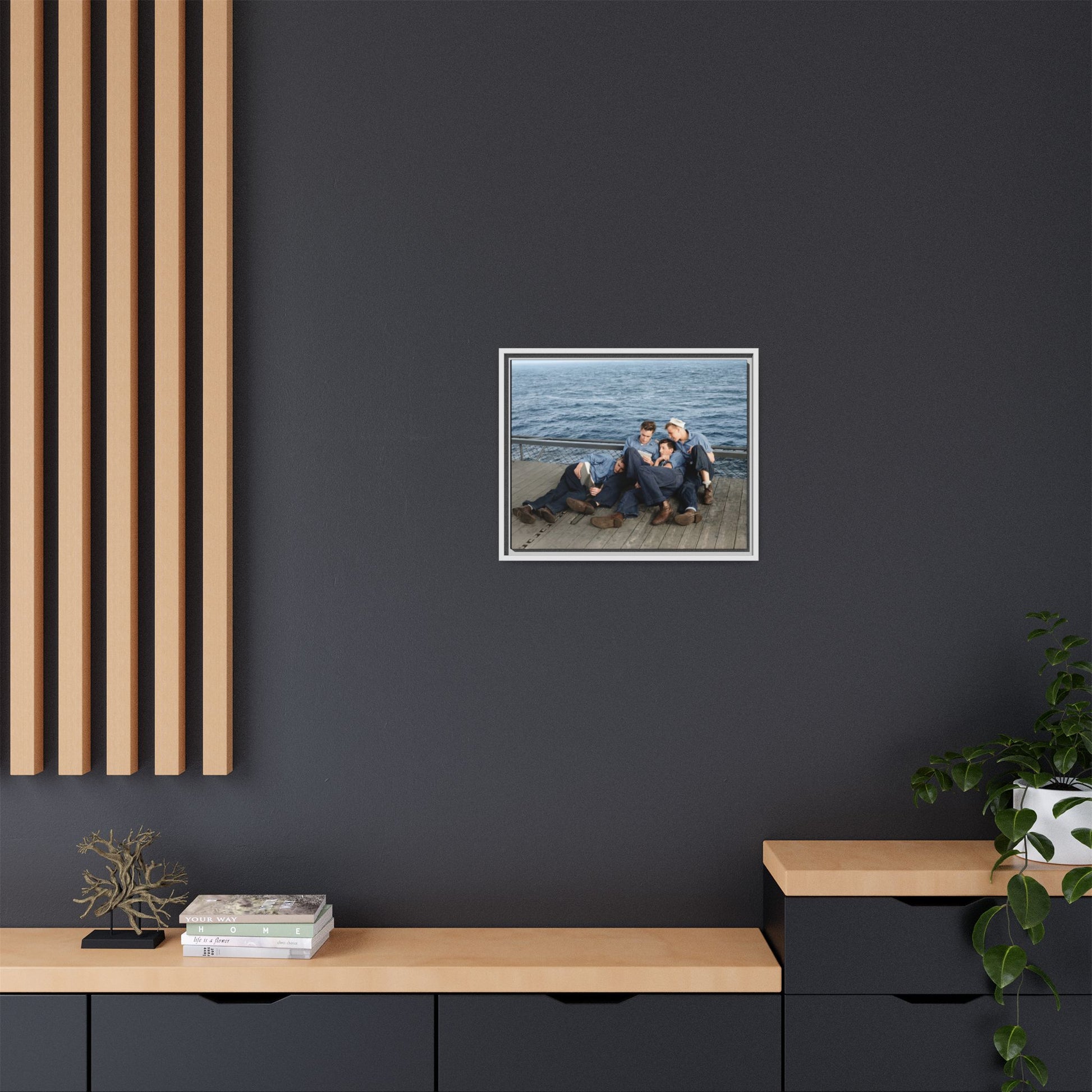 The print demonstrates moderate tonal compression in shadowed areas, particularly within darker trousers and the ship’s deck planking, resulting in some reduction of fine detail. Highlights in the sky and water remain legible but exhibit slight flattening. Minor surface abrasions and faint handling marks are visible across midtone areas. The overall tonal balance appears stable, though there may be slight age-related fading typical of gelatin silver prints. No major tears, creases, or significant losses are visible within the image field. These condition characteristics modestly affect micro-detail but do not impair general legibility. Preservation through controlled storage and digitization is advisable to prevent further tonal shift.