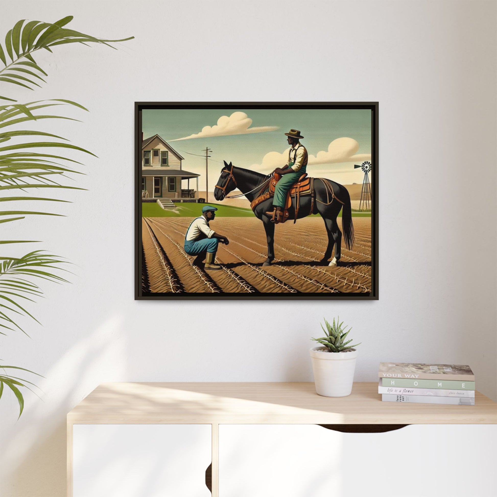 "Set in a serene, vintage-inspired rural landscape, this image beautifully captures a moment between two African American men working their farm together. One man is perched confidently on horseback, looking down at his partner with a warm, thoughtful gaze, while the other man kneels in the freshly plowed soil, examining the earth with a careful eye. Their connection is evident through their shared focus and unspoken bond, a testament to their partnership in both love and labor. The farmhouse and outbuildings in the background add depth to the scene, symbolizing their life together and the hard work they invest daily. With rows of planted crops stretching across the foreground and a soft, expansive sky above, this image highlights the quiet resilience and companionship of this queer couple as they nurture both their land and each other."